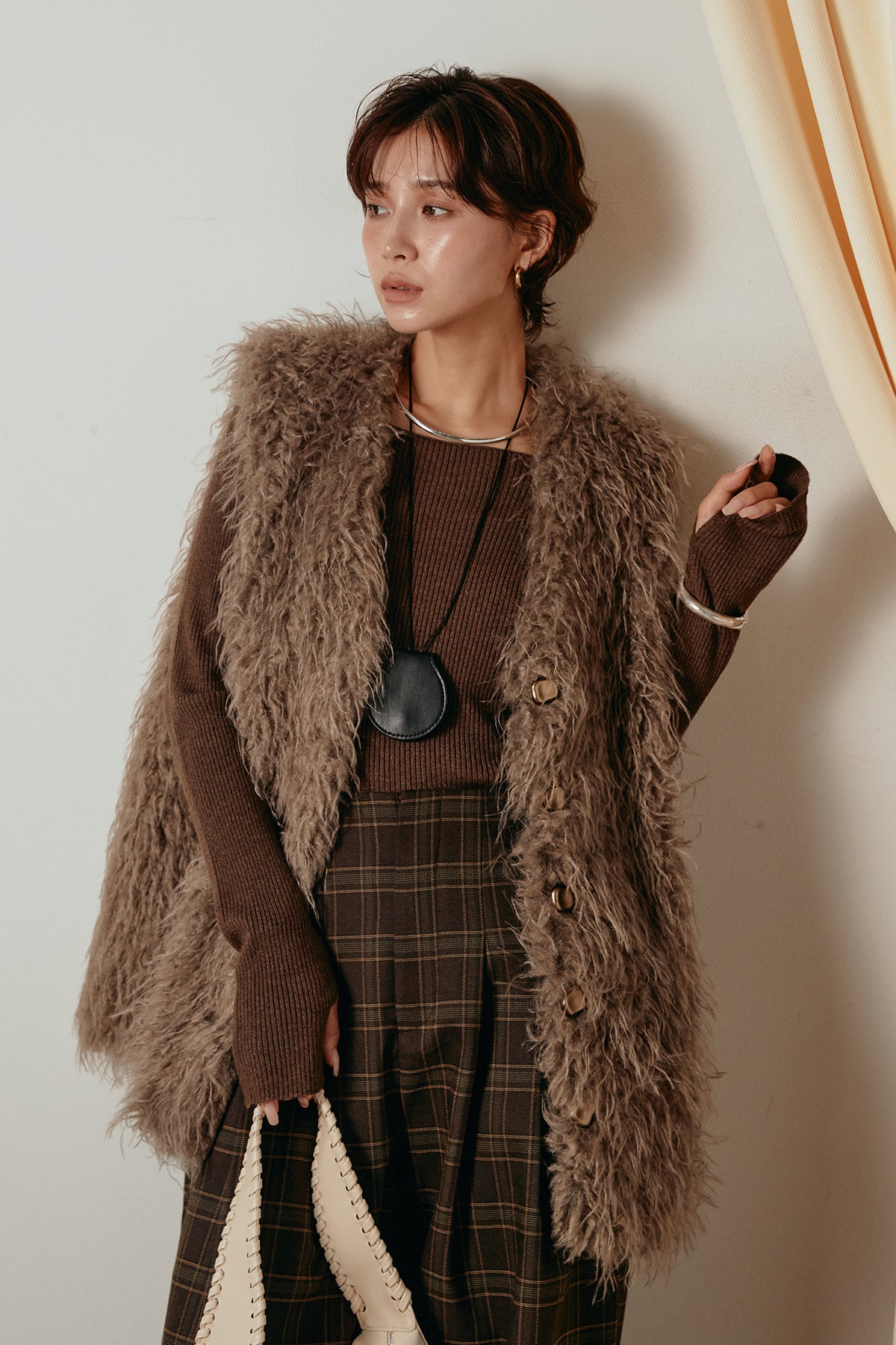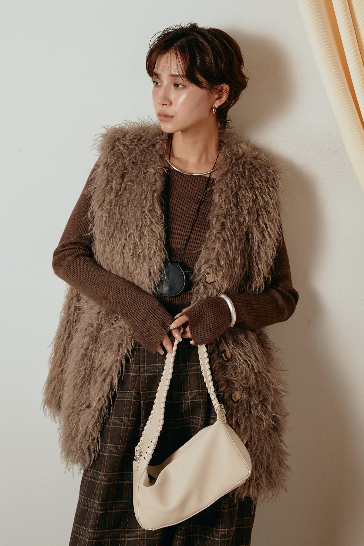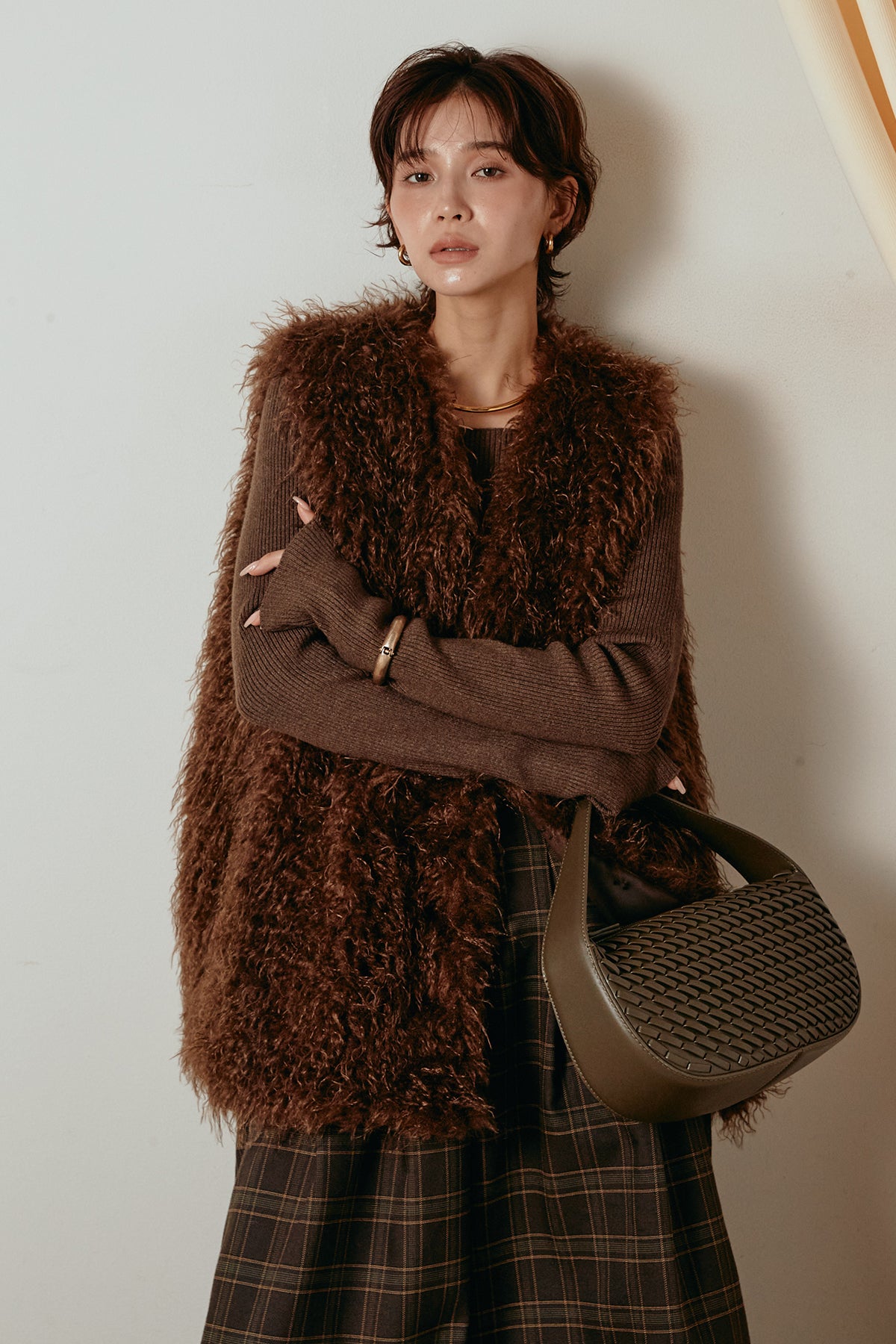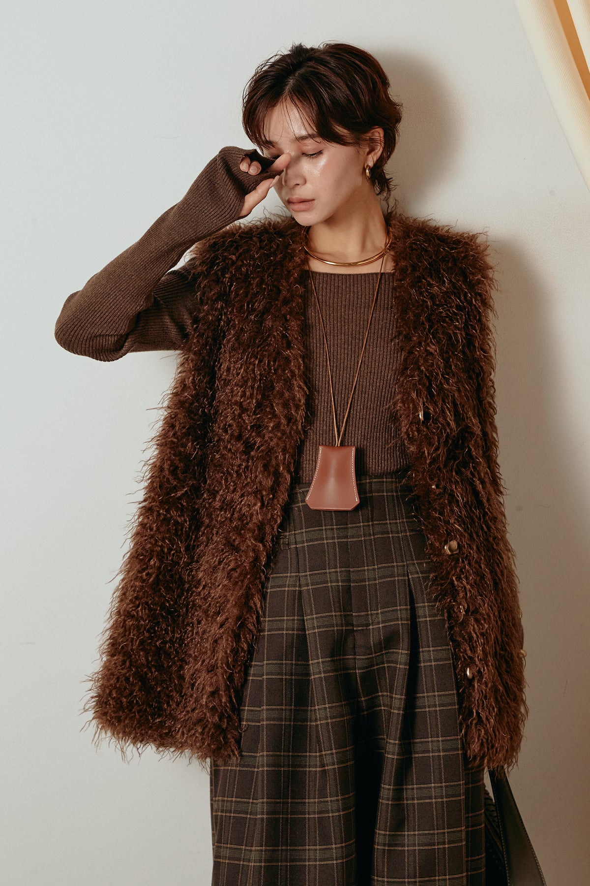 ふんわりとしたシャギーファーがシーズンムードを高めるボタン付きベスト。柔らかな質感と程よいボリュームが存在感を放ち、羽織るだけでスタイリングをアップデート。中はすっきりとした裏地仕様で着心地も快適。ニットやシャツに重ねて、秋冬らしいレイヤードを楽しめる一枚です。