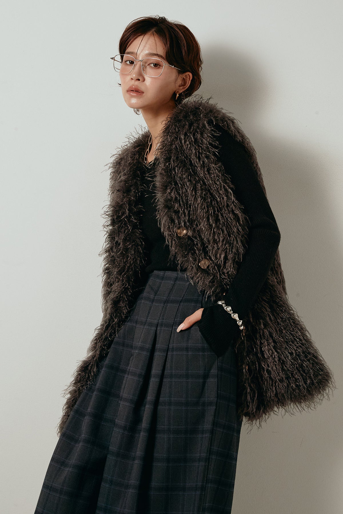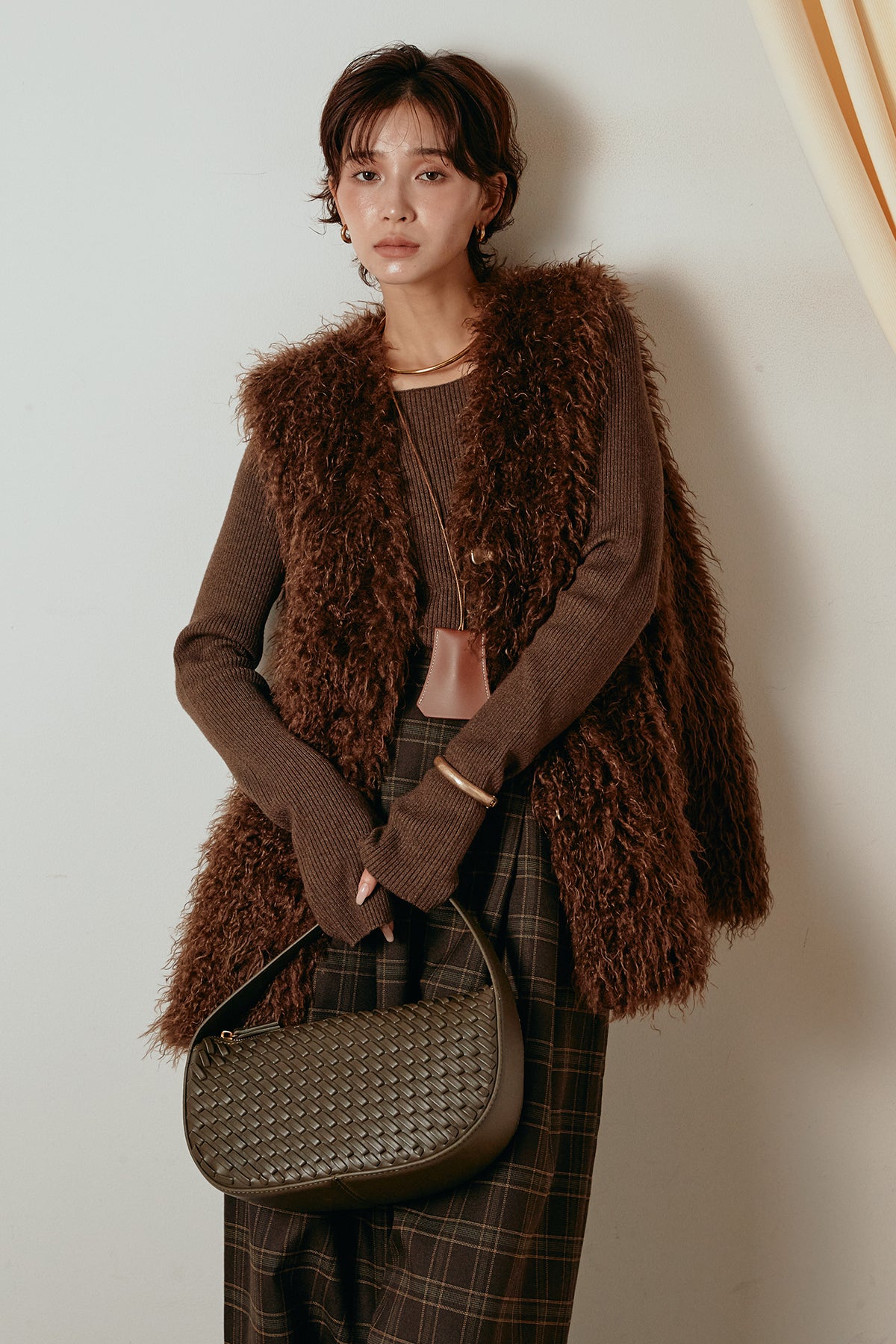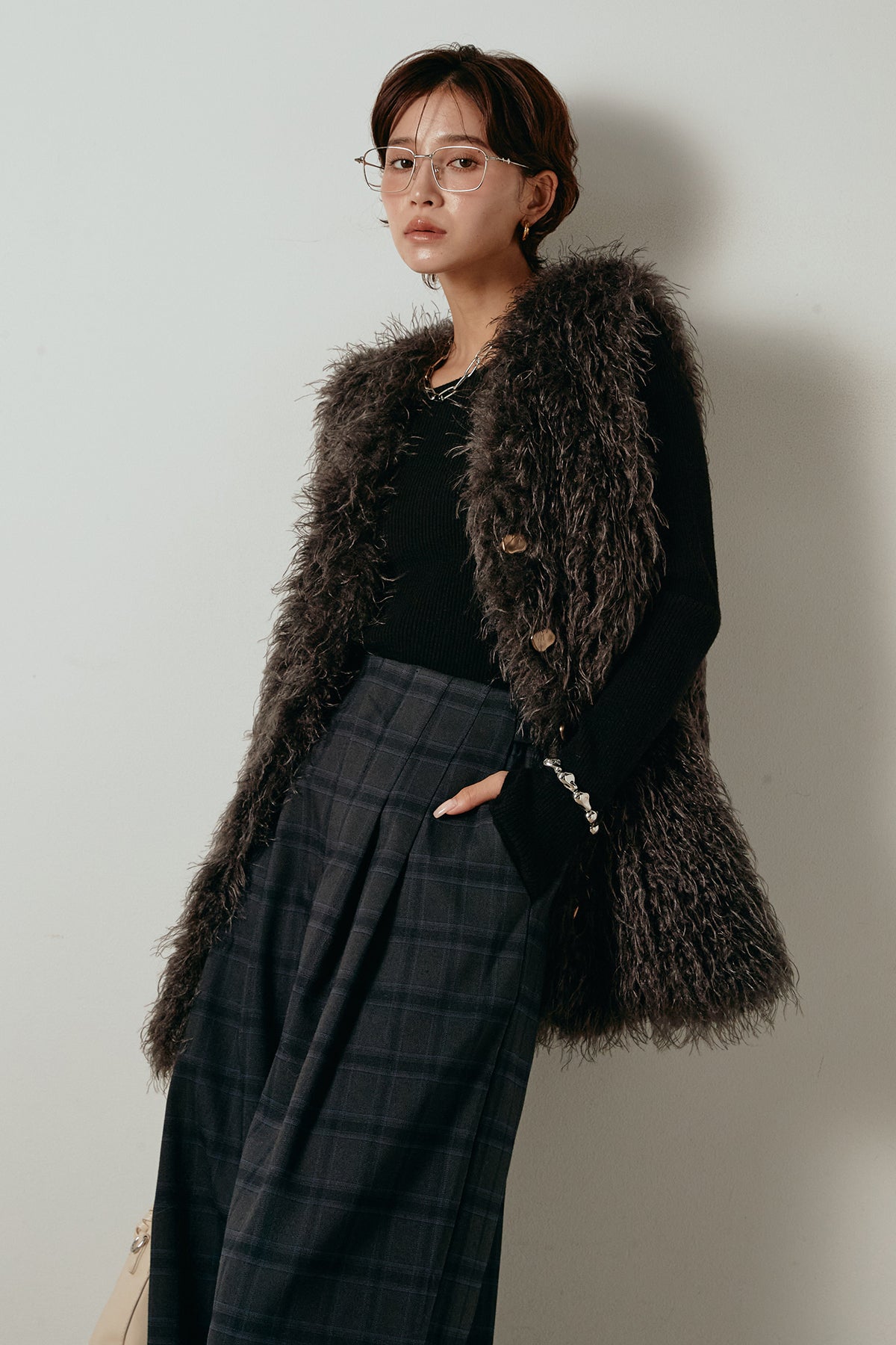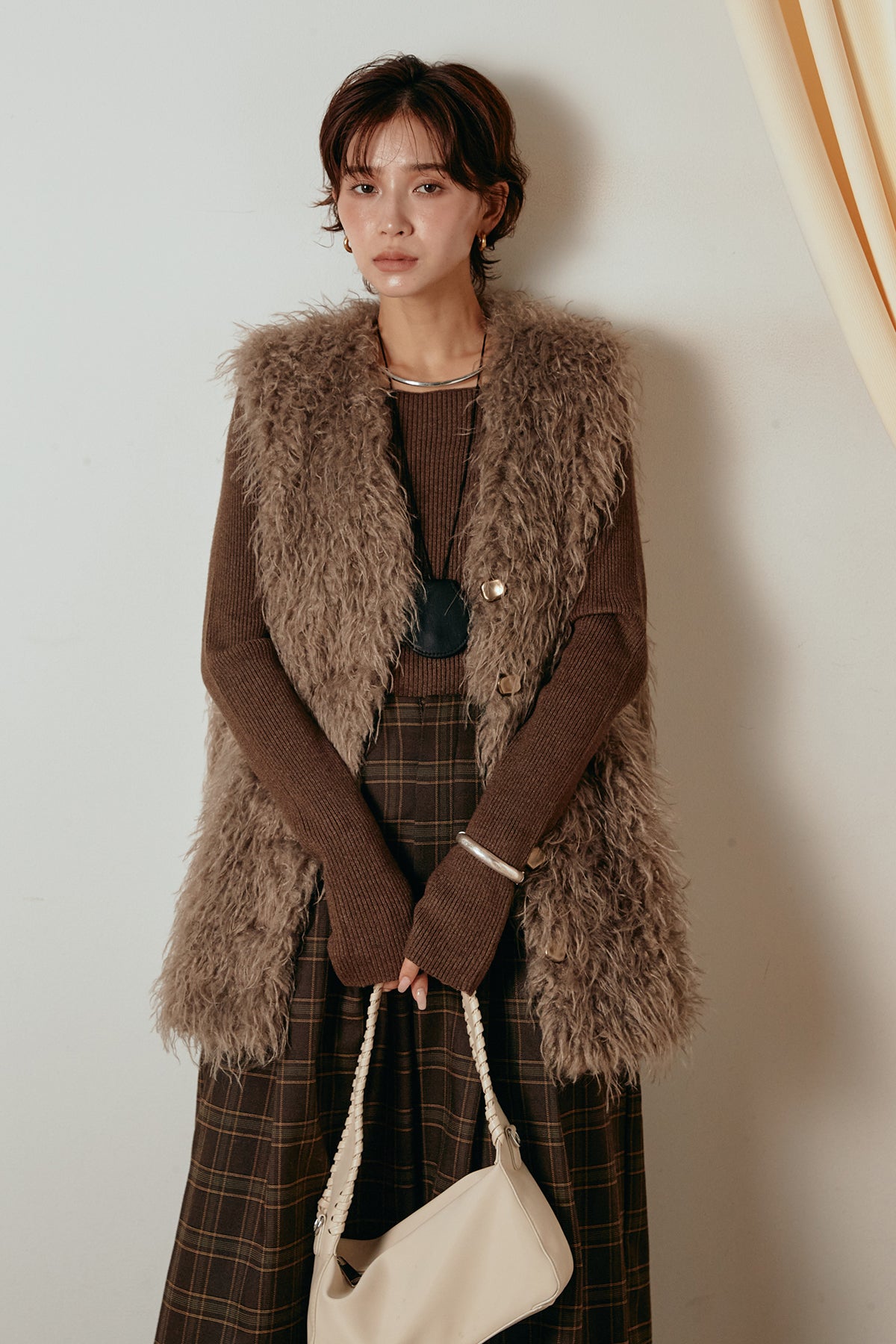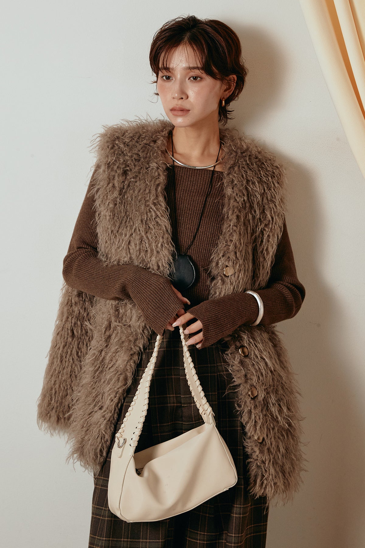 ふんわりとしたシャギーファーがシーズンムードを高めるボタン付きベスト。柔らかな質感と程よいボリュームが存在感を放ち、羽織るだけでスタイリングをアップデート。中はすっきりとした裏地仕様で着心地も快適。ニットやシャツに重ねて、秋冬らしいレイヤードを楽しめる一枚です。