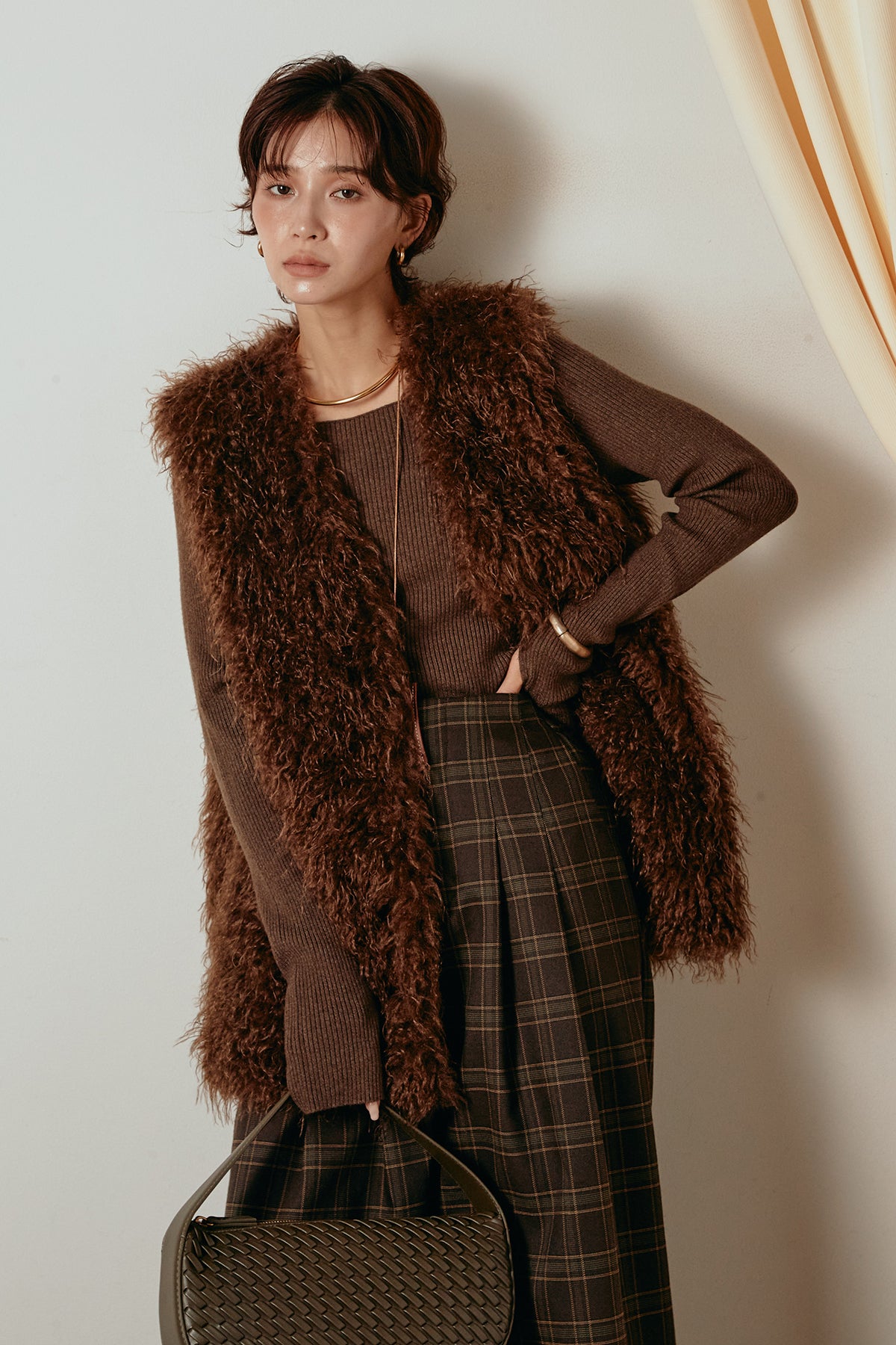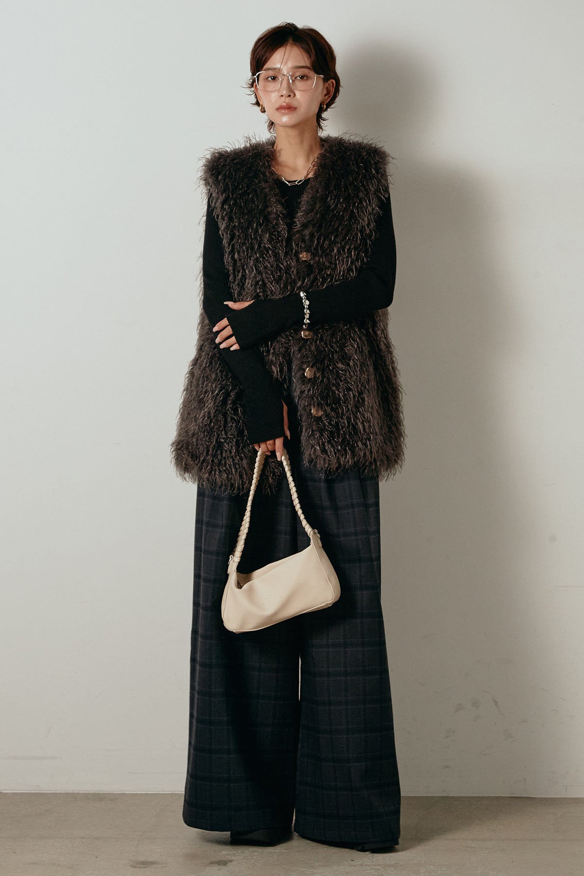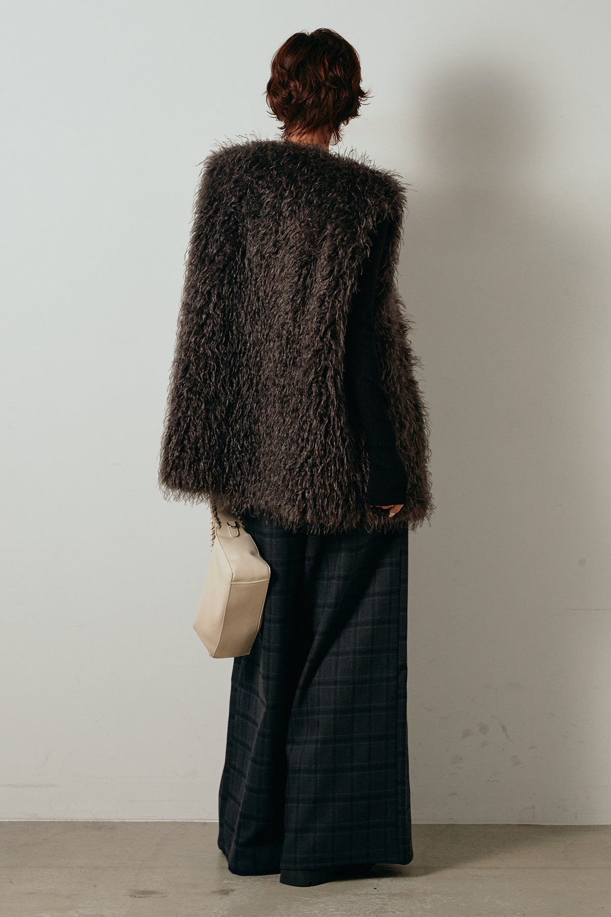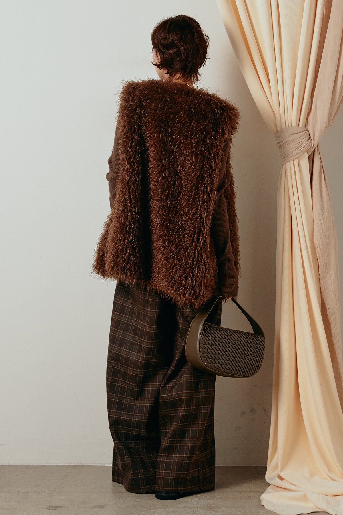 ふんわりとしたシャギーファーがシーズンムードを高めるボタン付きベスト。柔らかな質感と程よいボリュームが存在感を放ち、羽織るだけでスタイリングをアップデート。中はすっきりとした裏地仕様で着心地も快適。ニットやシャツに重ねて、秋冬らしいレイヤードを楽しめる一枚です。