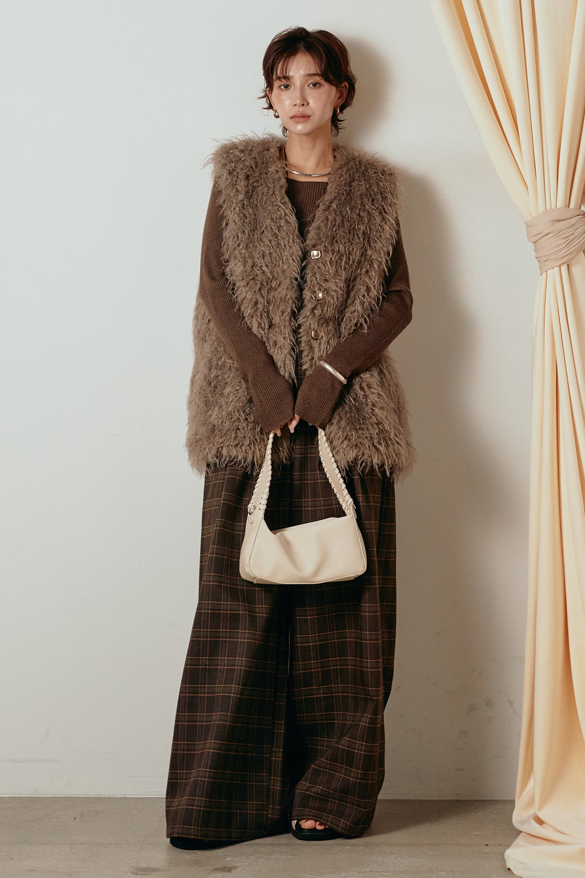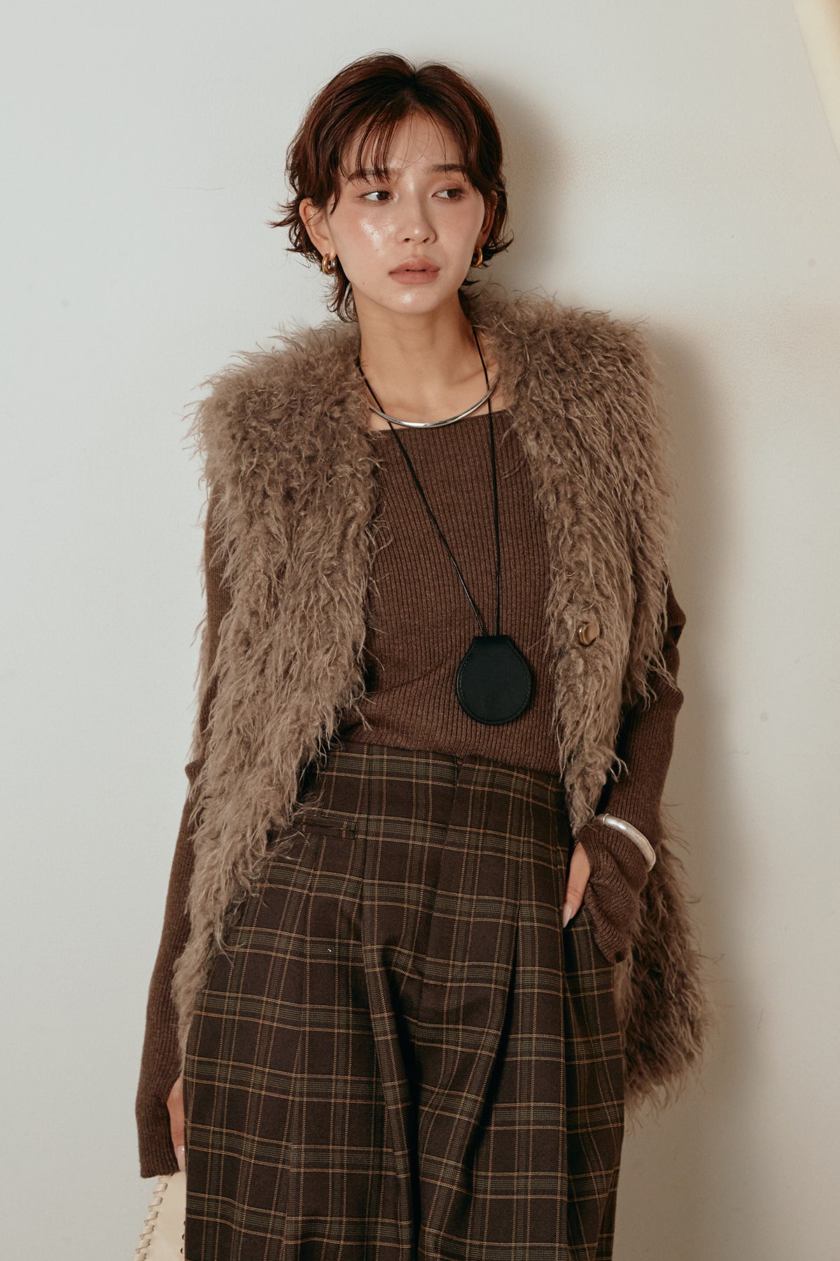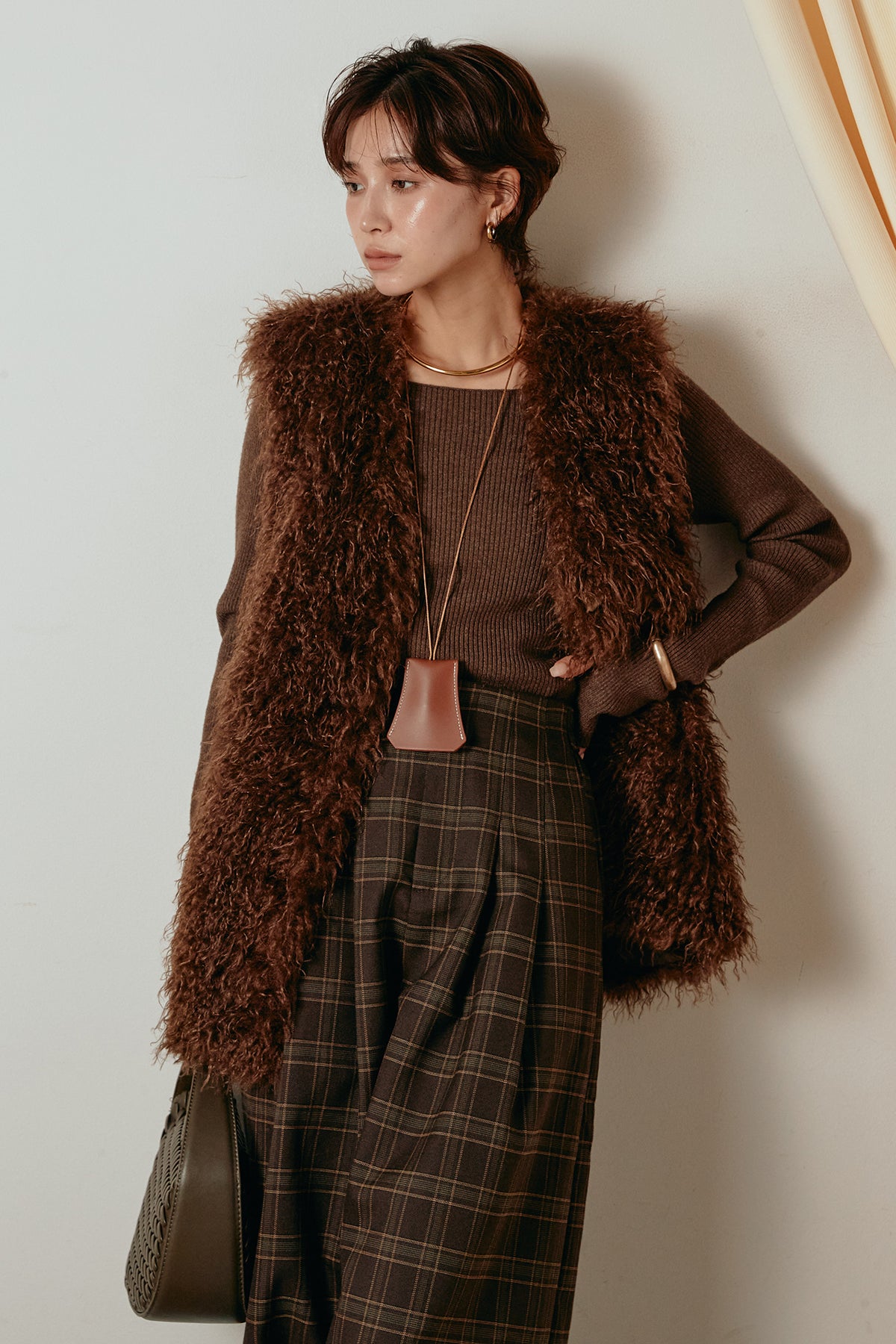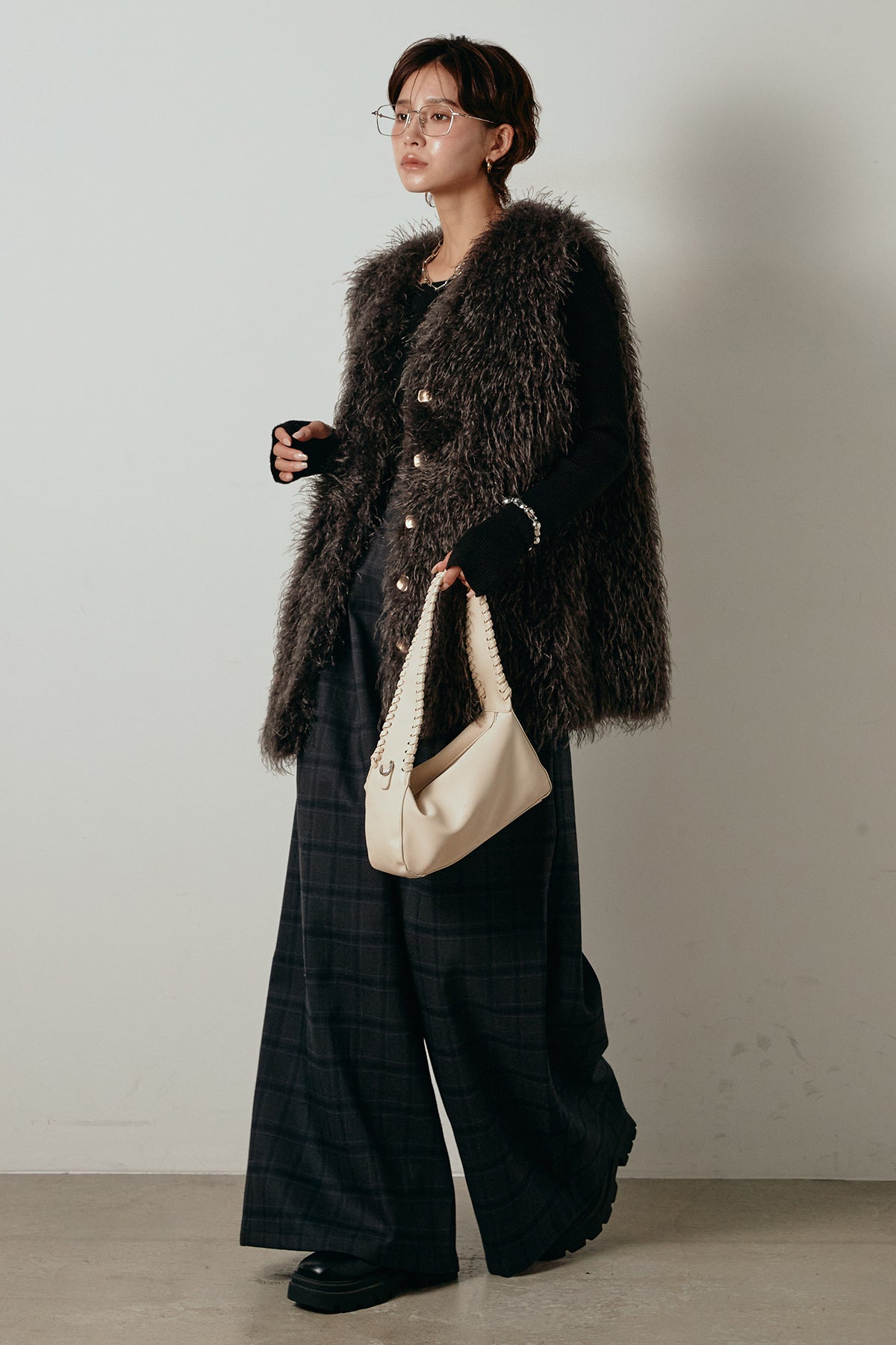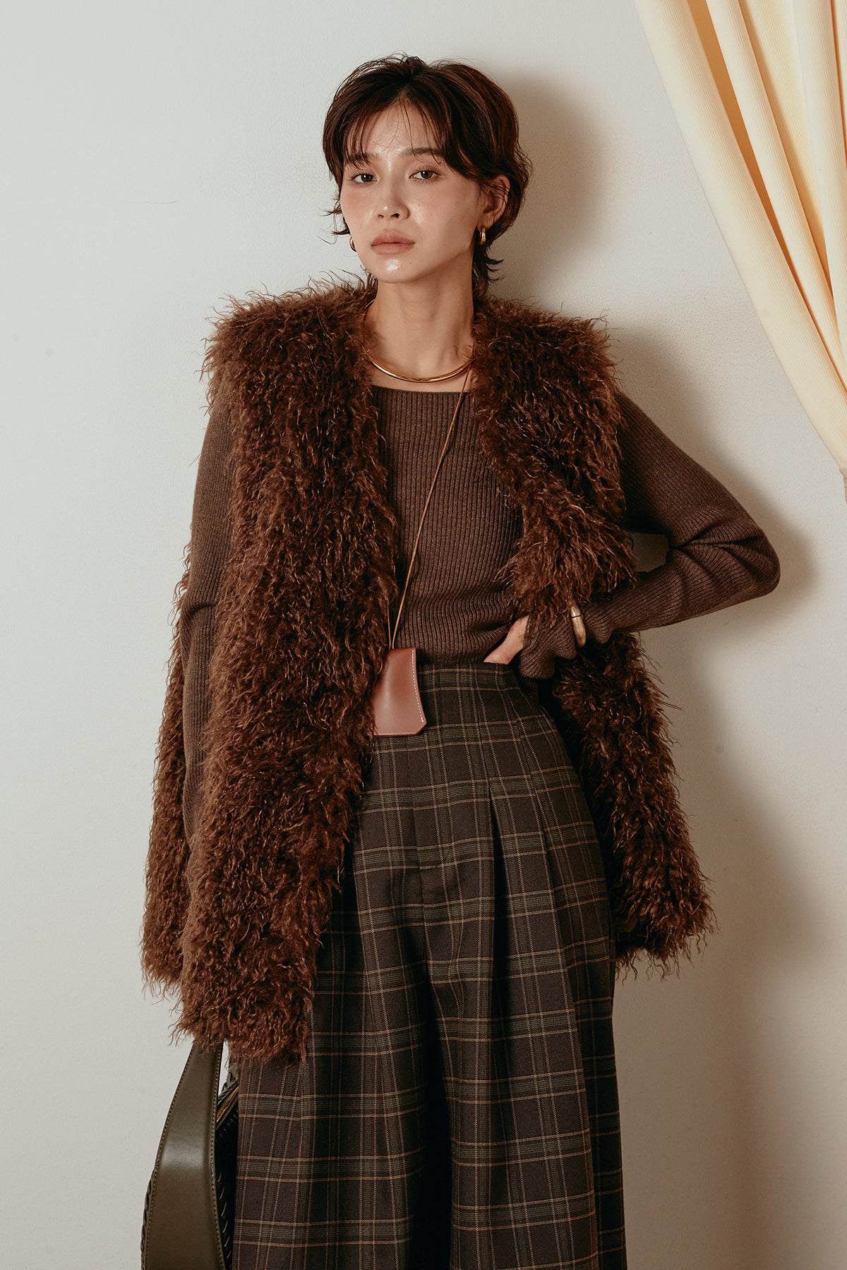 ふんわりとしたシャギーファーがシーズンムードを高めるボタン付きベスト。柔らかな質感と程よいボリュームが存在感を放ち、羽織るだけでスタイリングをアップデート。中はすっきりとした裏地仕様で着心地も快適。ニットやシャツに重ねて、秋冬らしいレイヤードを楽しめる一枚です。