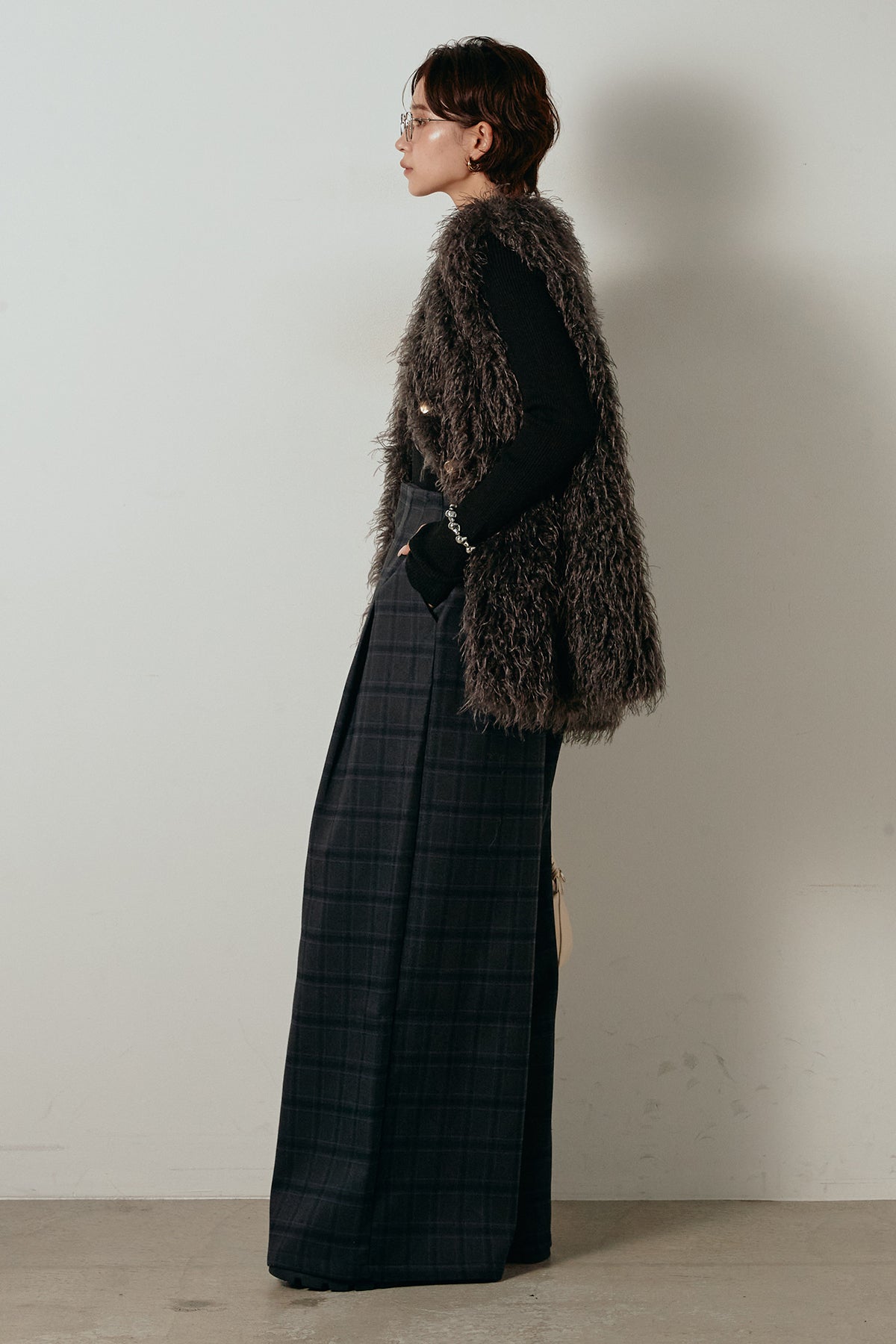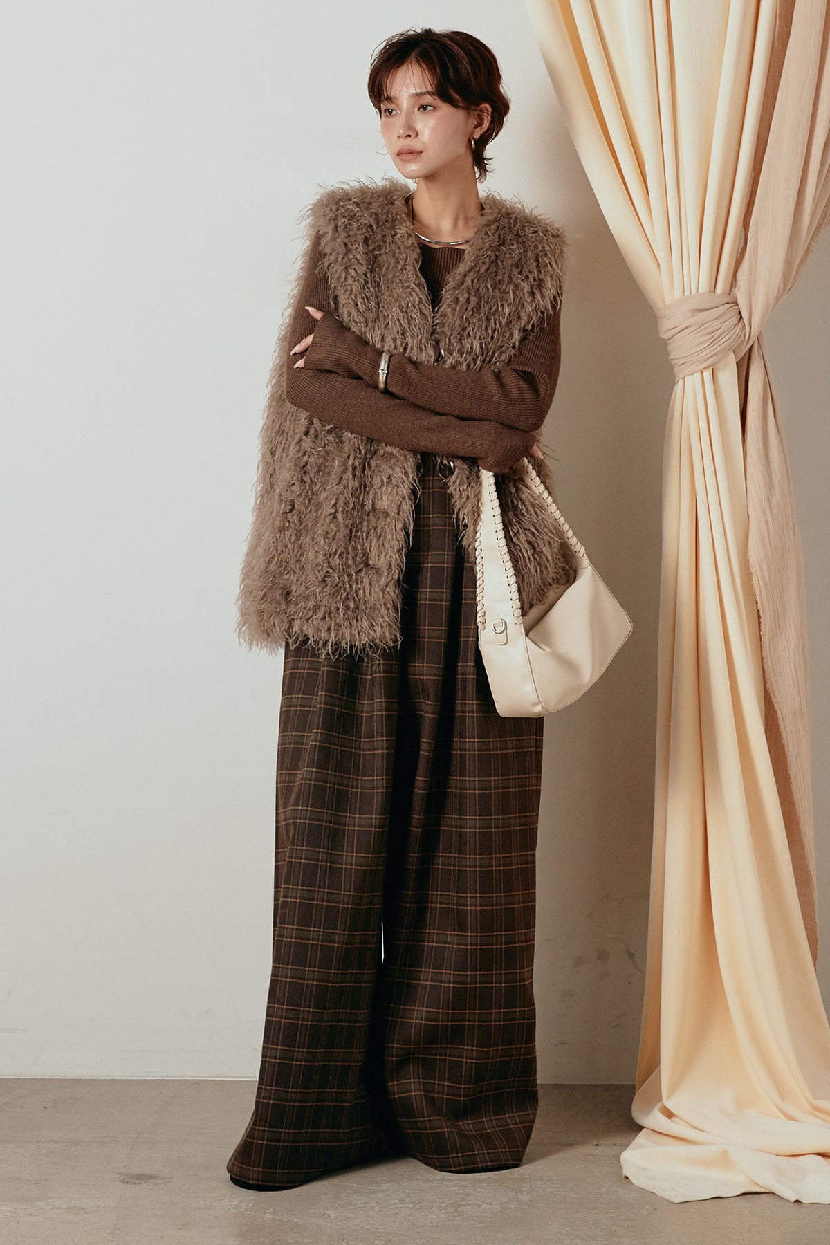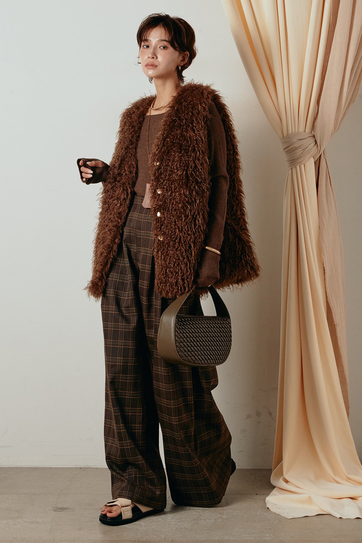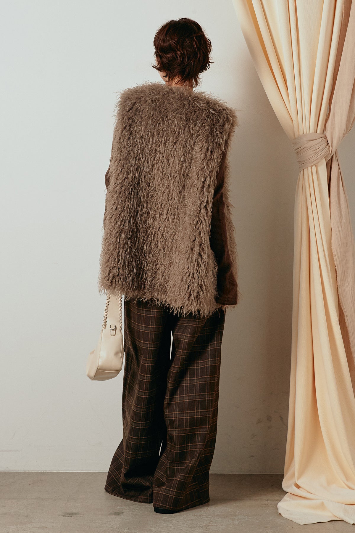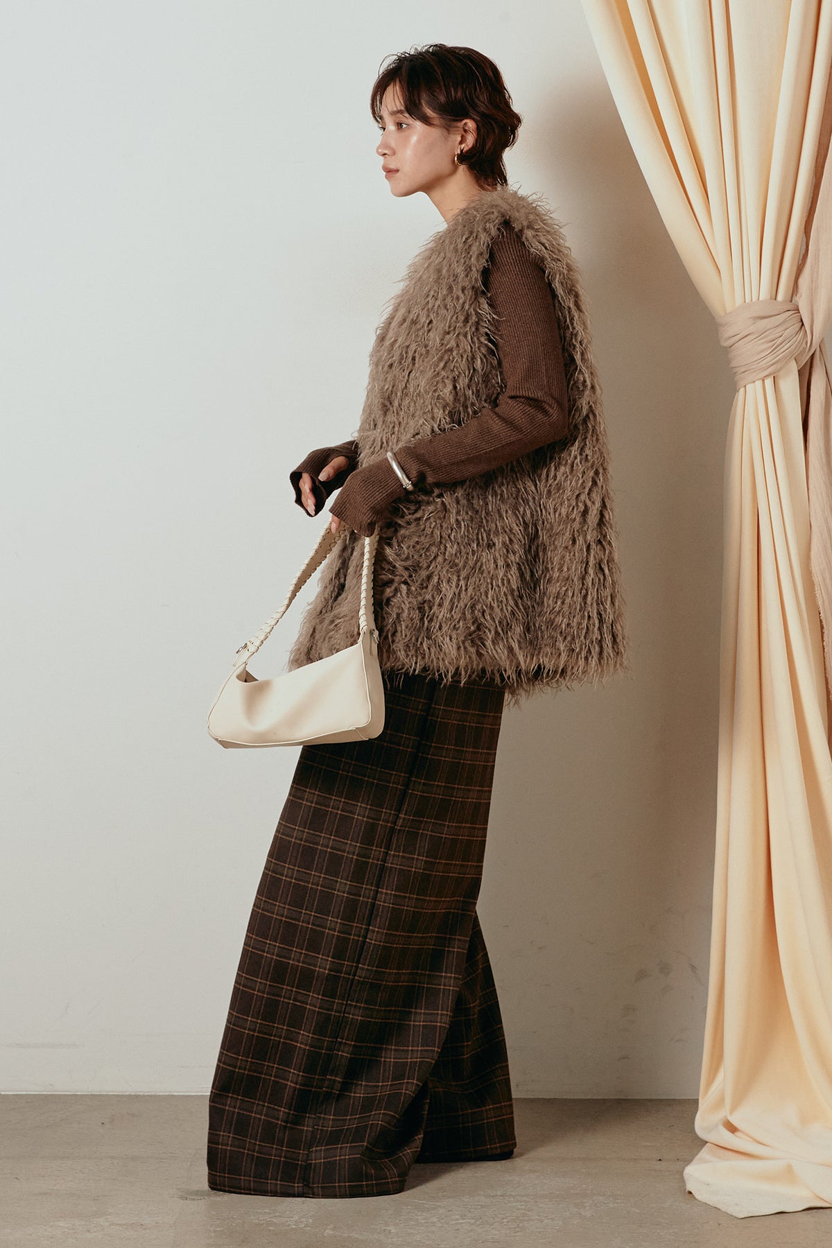 ふんわりとしたシャギーファーがシーズンムードを高めるボタン付きベスト。柔らかな質感と程よいボリュームが存在感を放ち、羽織るだけでスタイリングをアップデート。中はすっきりとした裏地仕様で着心地も快適。ニットやシャツに重ねて、秋冬らしいレイヤードを楽しめる一枚です。