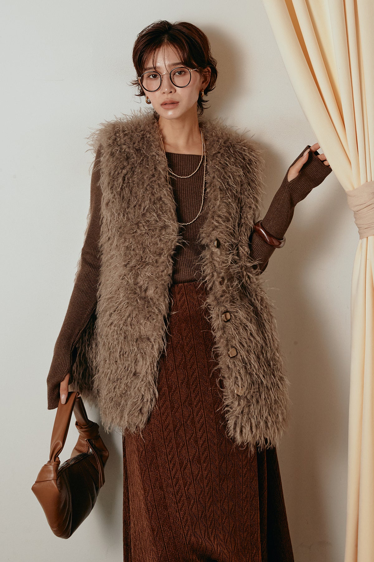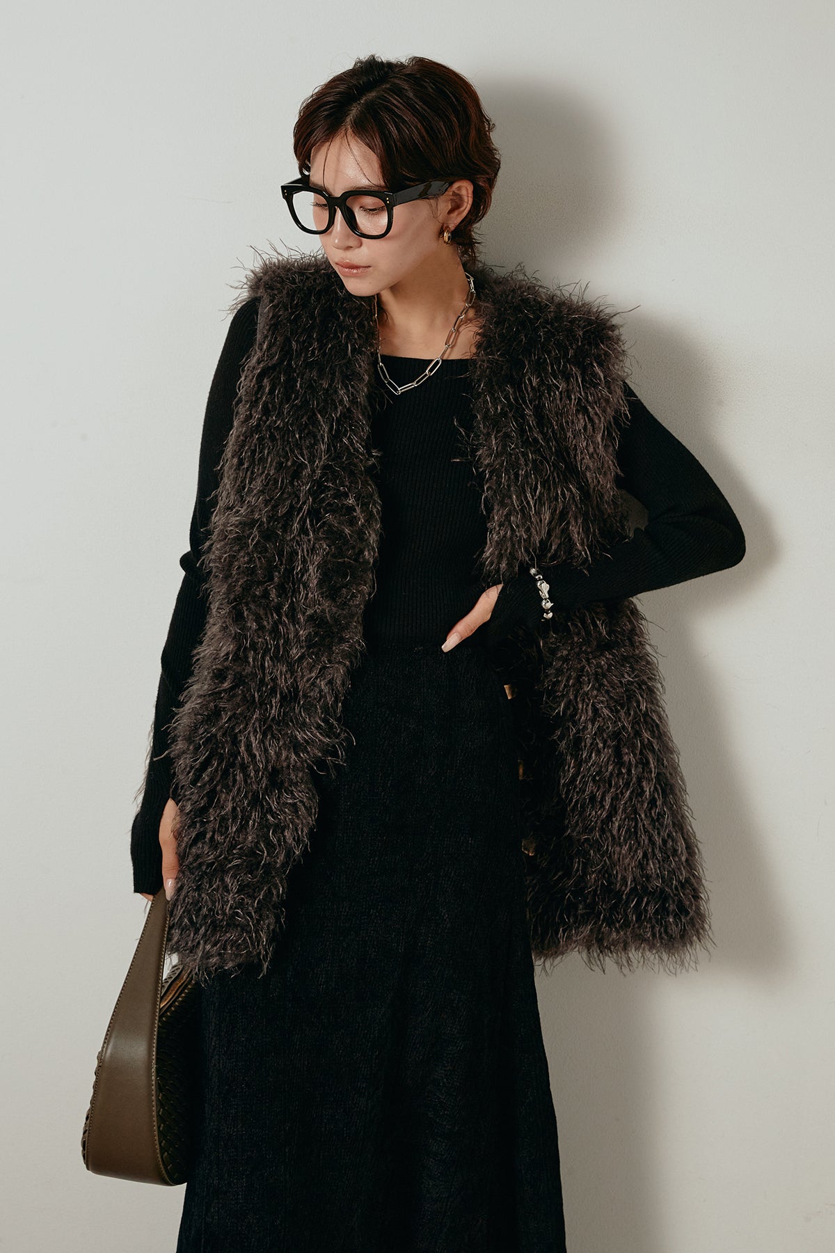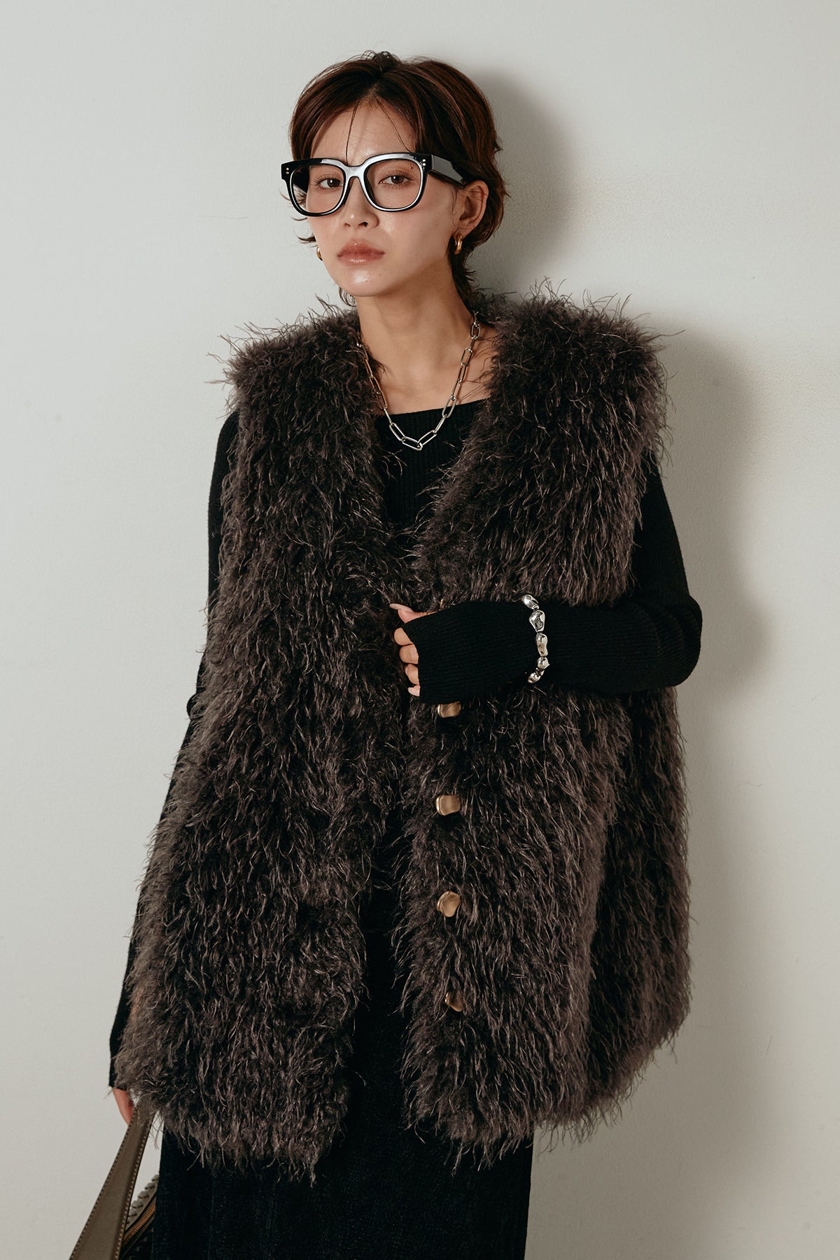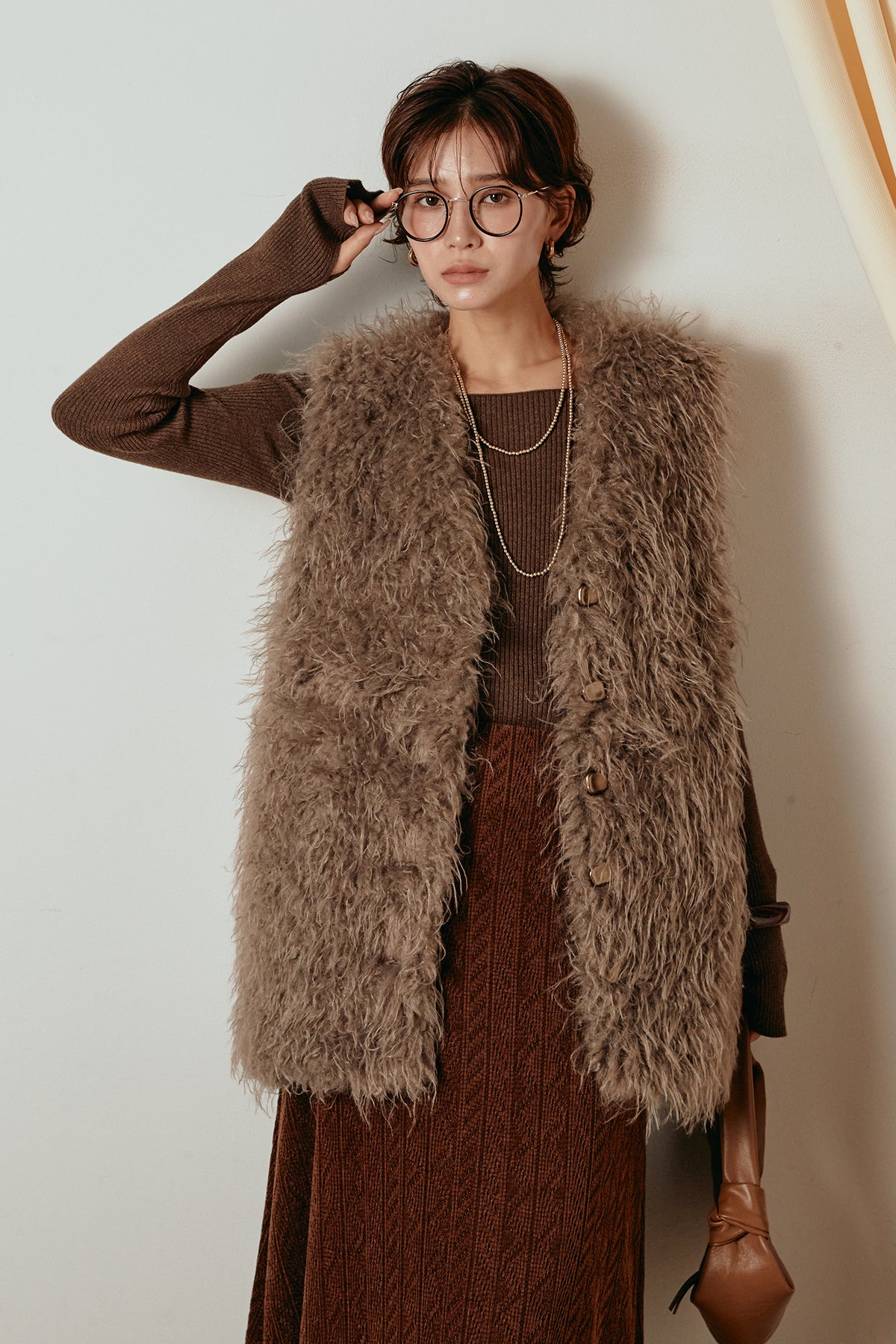ふんわりとしたシャギーファーがシーズンムードを高めるボタン付きベスト。柔らかな質感と程よいボリュームが存在感を放ち、羽織るだけでスタイリングをアップデート。中はすっきりとした裏地仕様で着心地も快適。ニットやシャツに重ねて、秋冬らしいレイヤードを楽しめる一枚です。