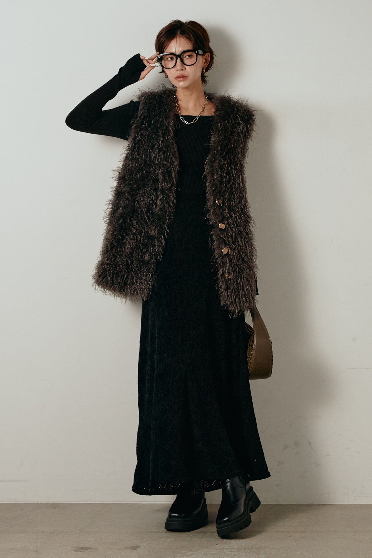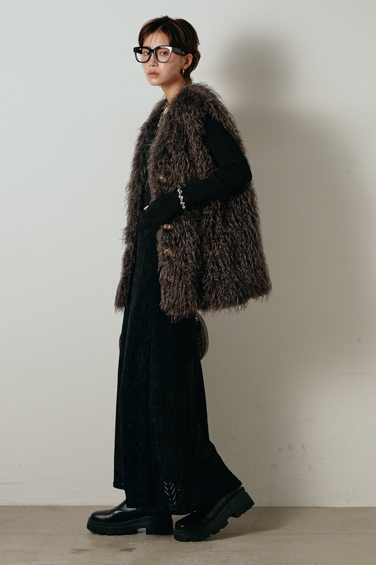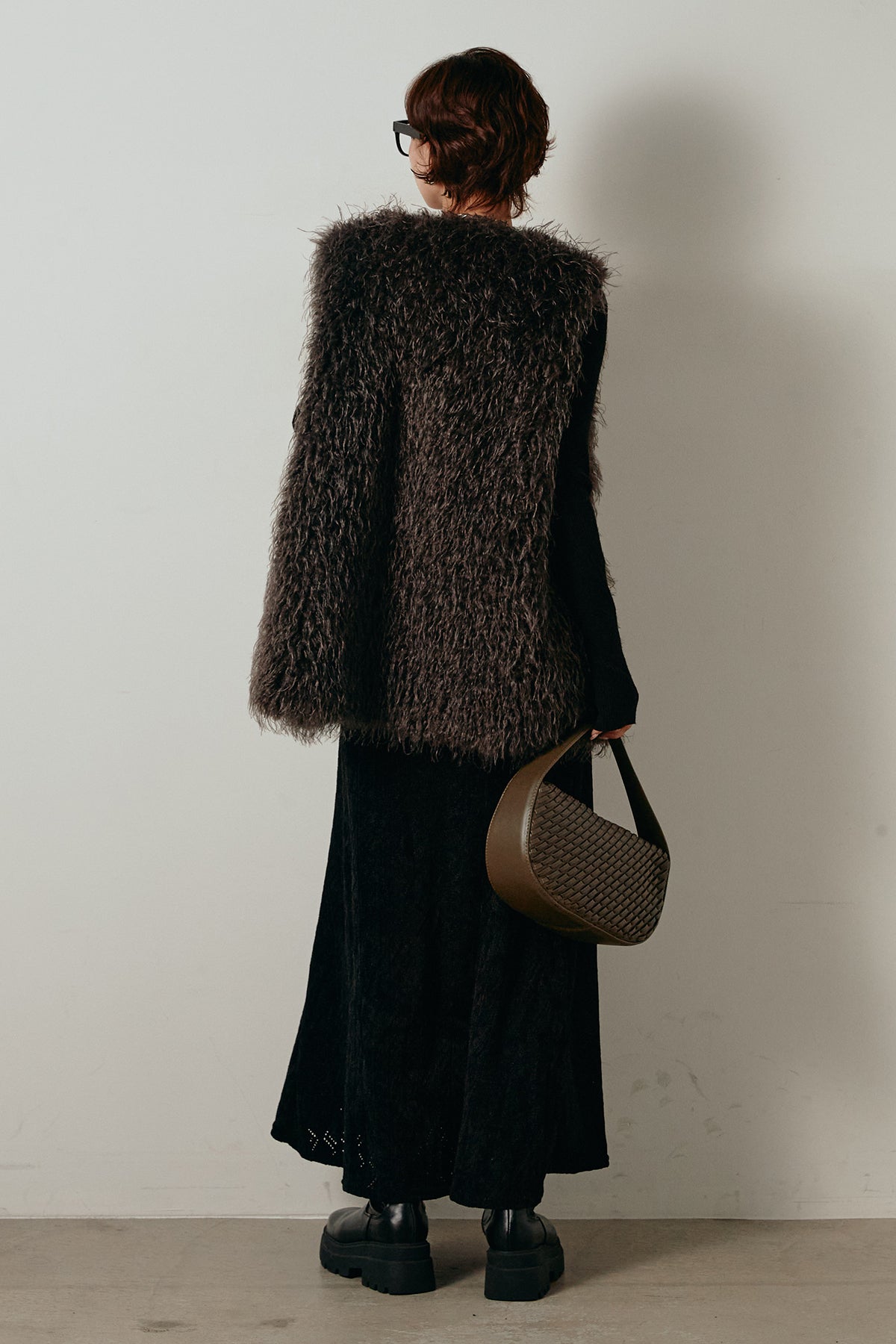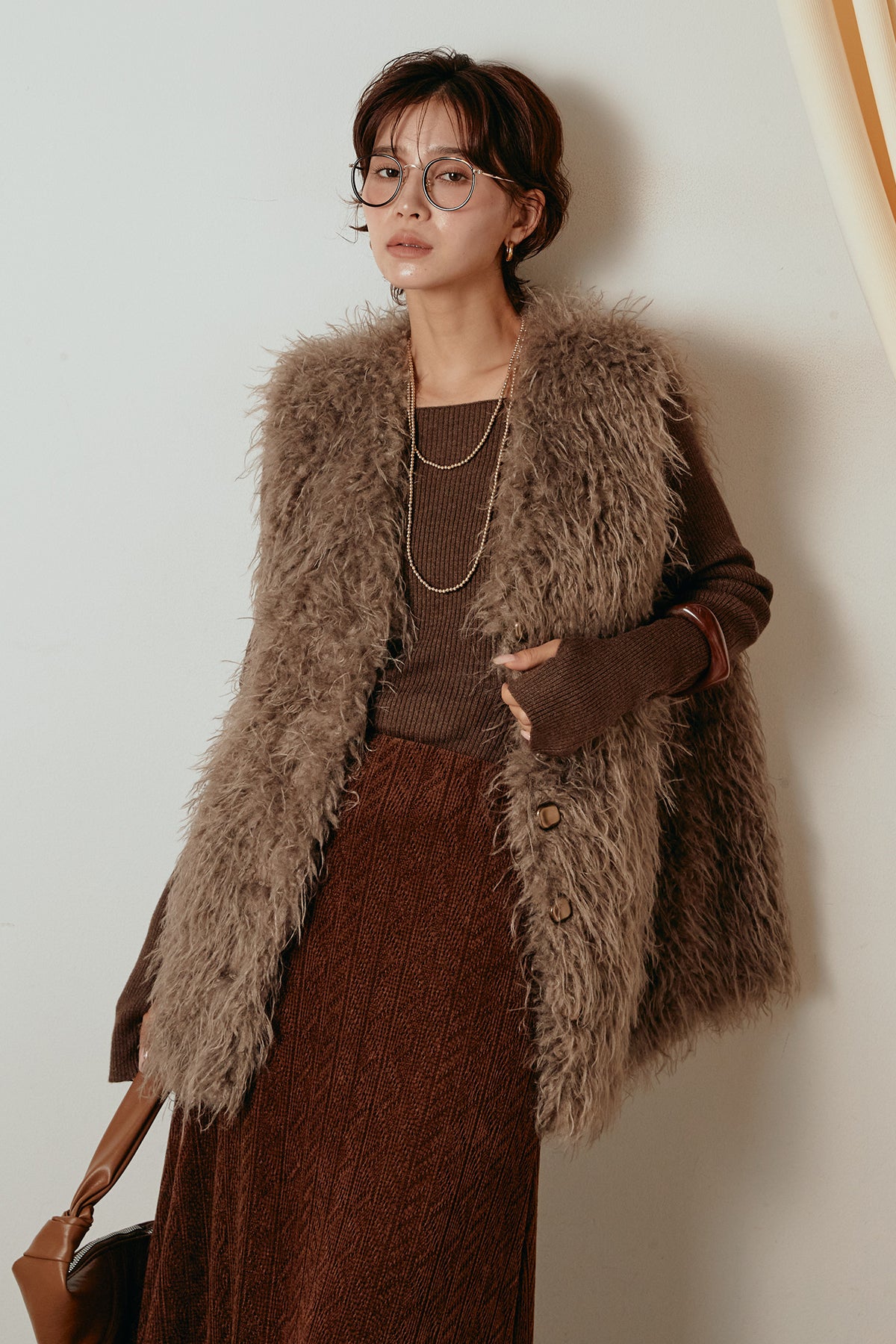 ふんわりとしたシャギーファーがシーズンムードを高めるボタン付きベスト。柔らかな質感と程よいボリュームが存在感を放ち、羽織るだけでスタイリングをアップデート。中はすっきりとした裏地仕様で着心地も快適。ニットやシャツに重ねて、秋冬らしいレイヤードを楽しめる一枚です。