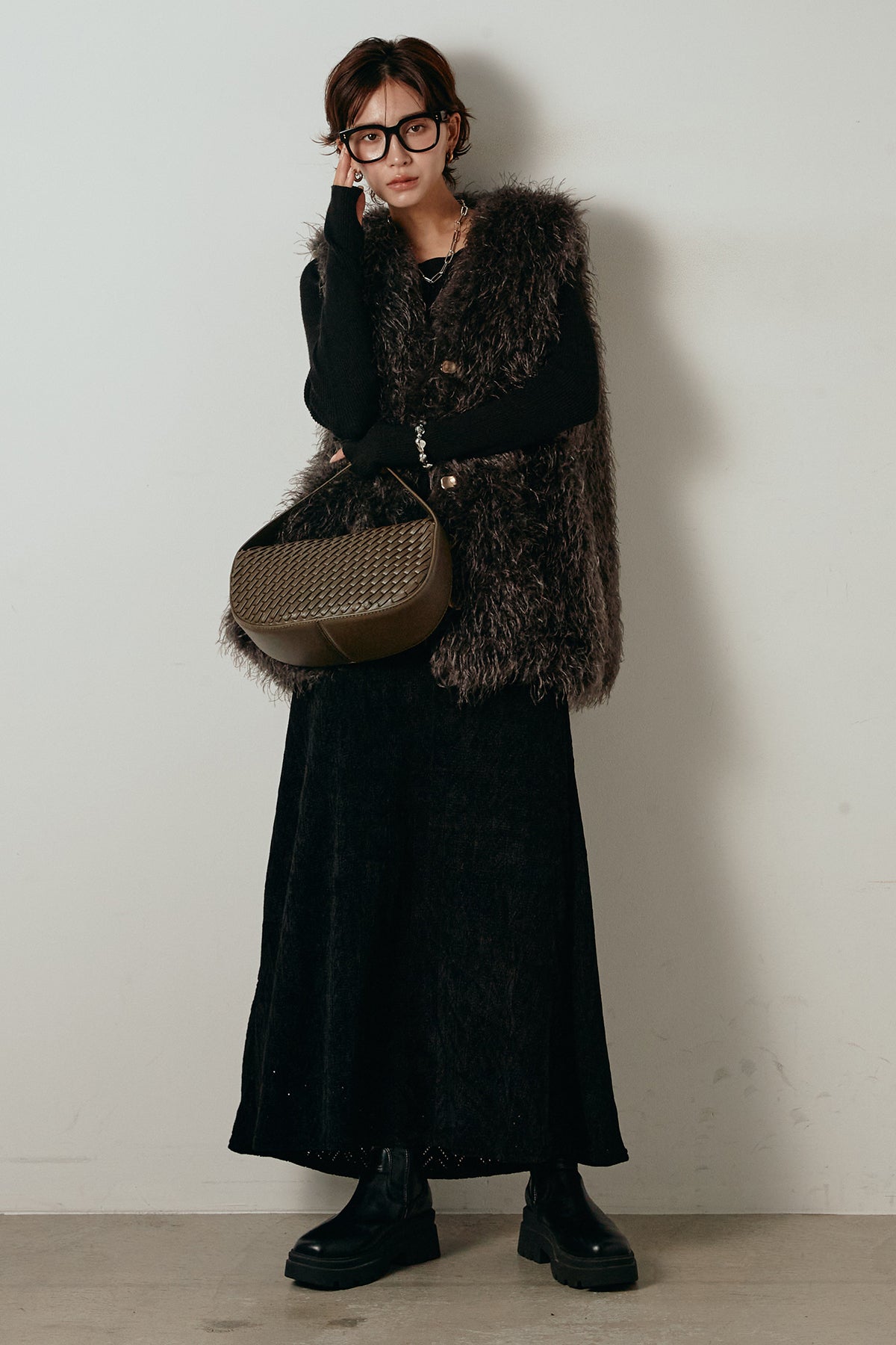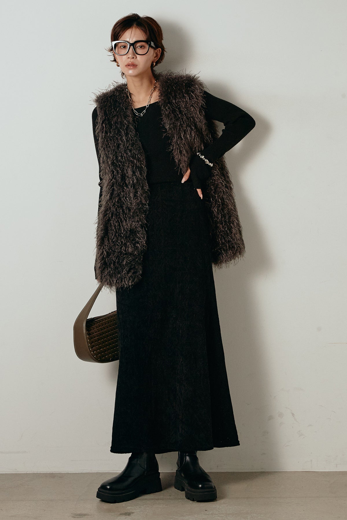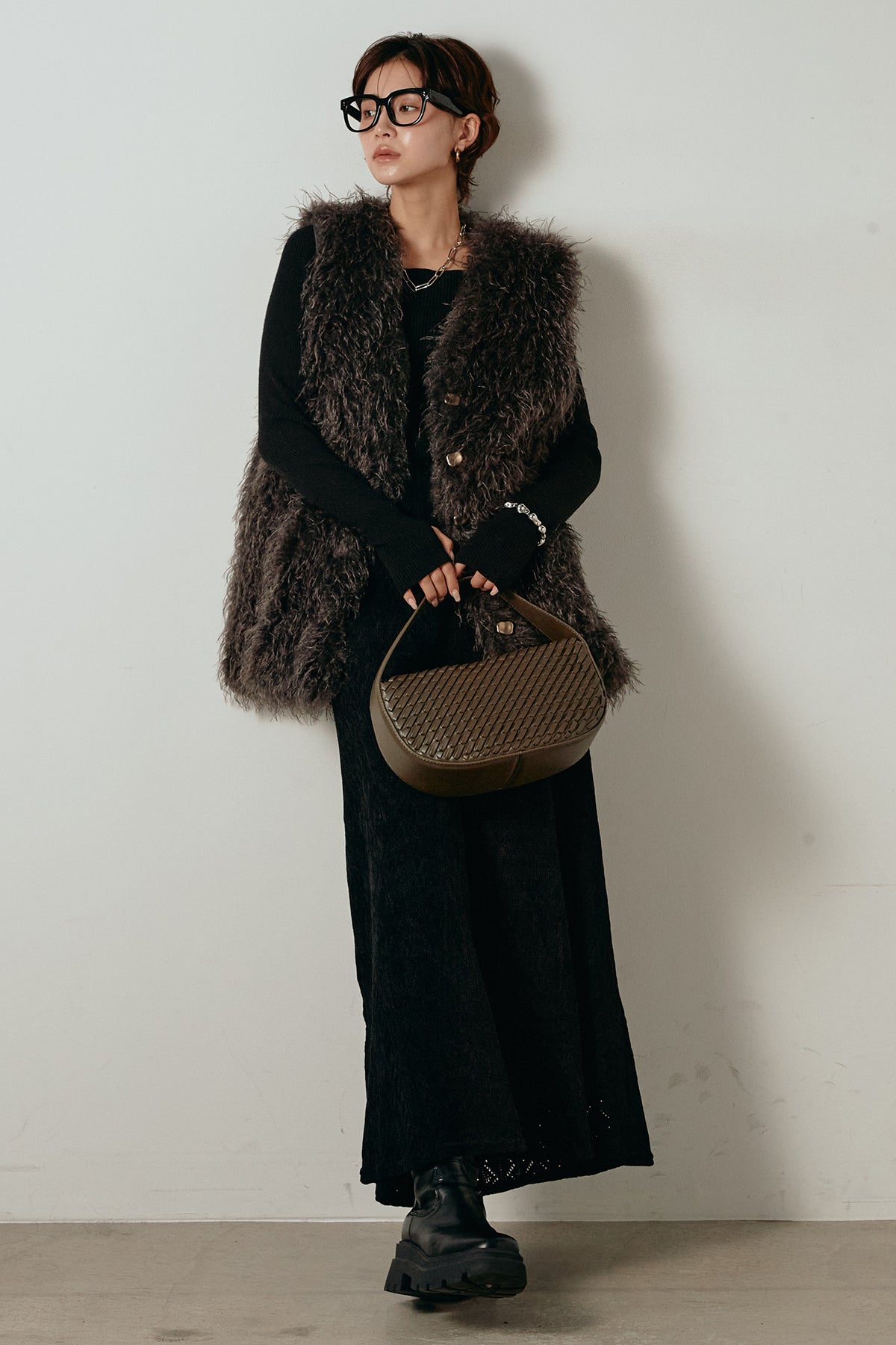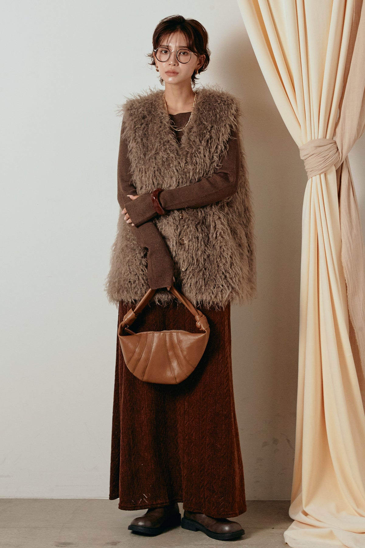 ふんわりとしたシャギーファーがシーズンムードを高めるボタン付きベスト。柔らかな質感と程よいボリュームが存在感を放ち、羽織るだけでスタイリングをアップデート。中はすっきりとした裏地仕様で着心地も快適。ニットやシャツに重ねて、秋冬らしいレイヤードを楽しめる一枚です。