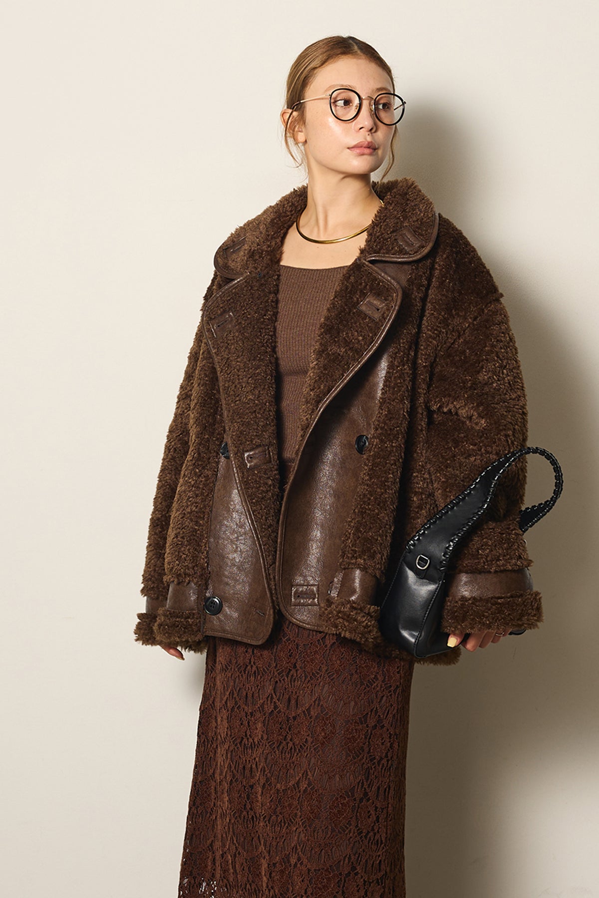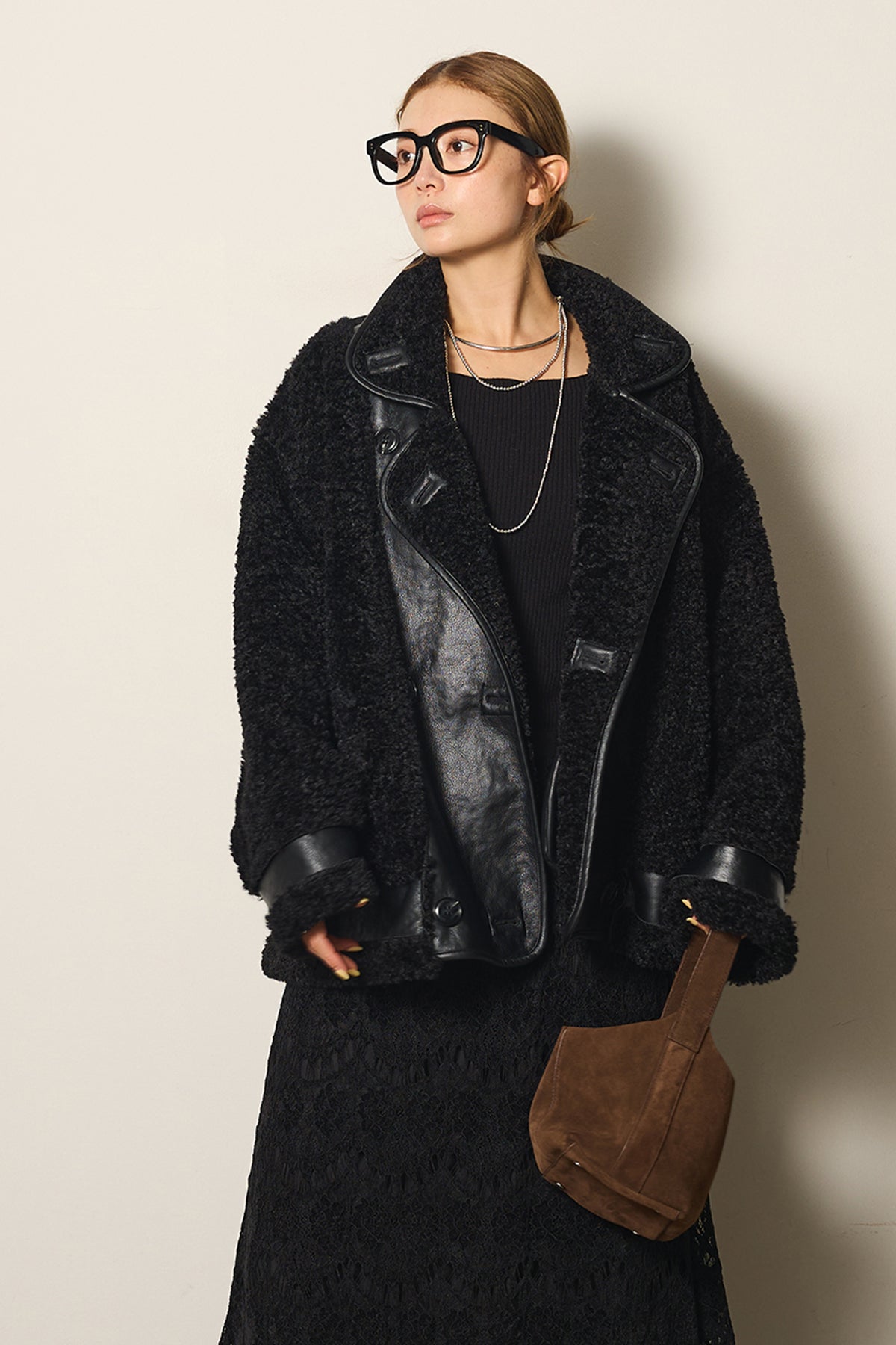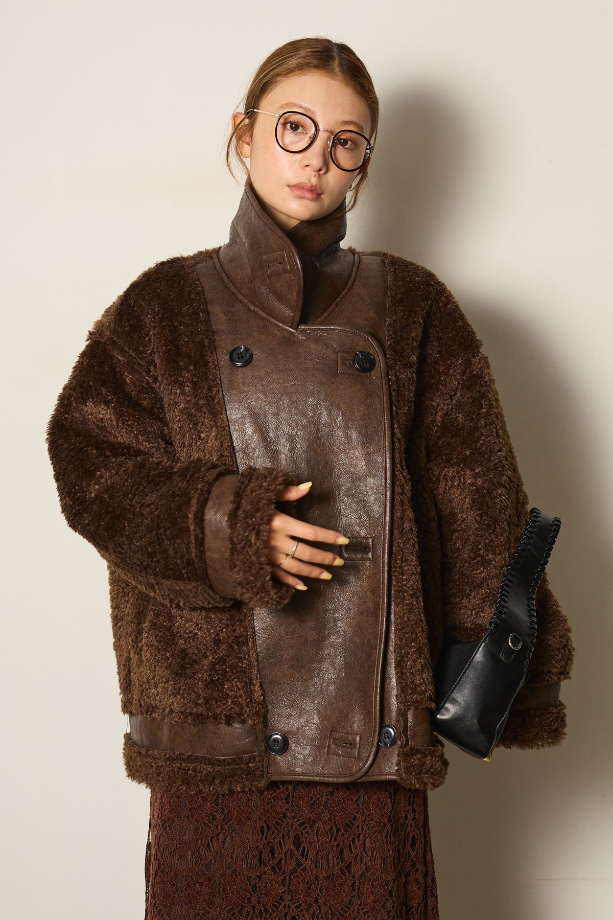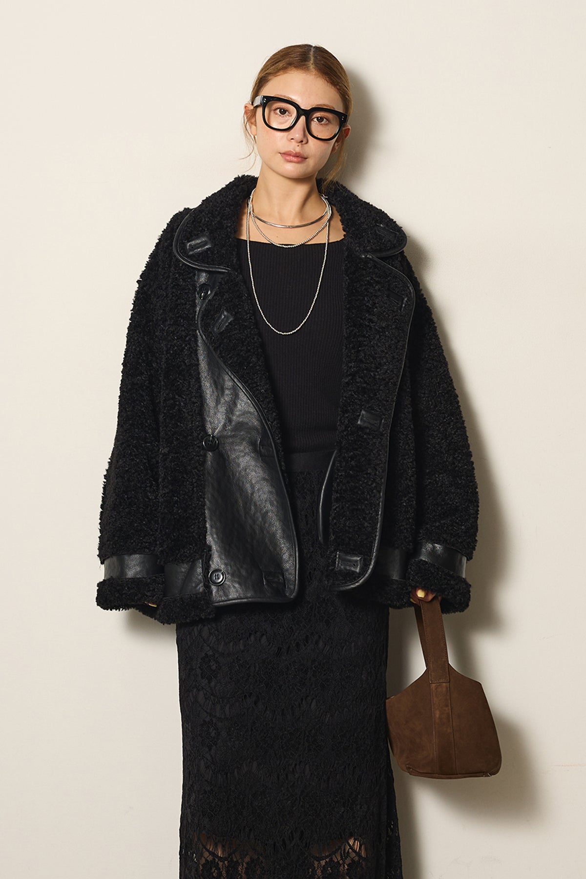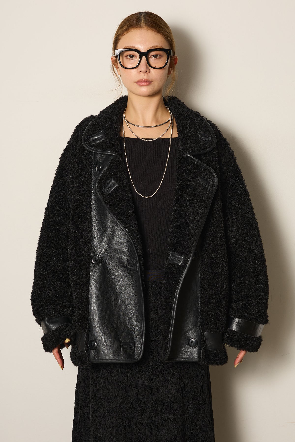 異素材のコンビネーションが目を引くフェイクレザードッキングボアアウター。柔らかなボアと艶のあるフェイクレザーの切り替えがシーズンムードを高め、スタイリングに奥行きをプラスします。ゆったりとしたシルエットで中にニットを重ねても着やすく、カジュアルにもモードにもマッチ。1枚で主役になる存在感のあるアウターです。