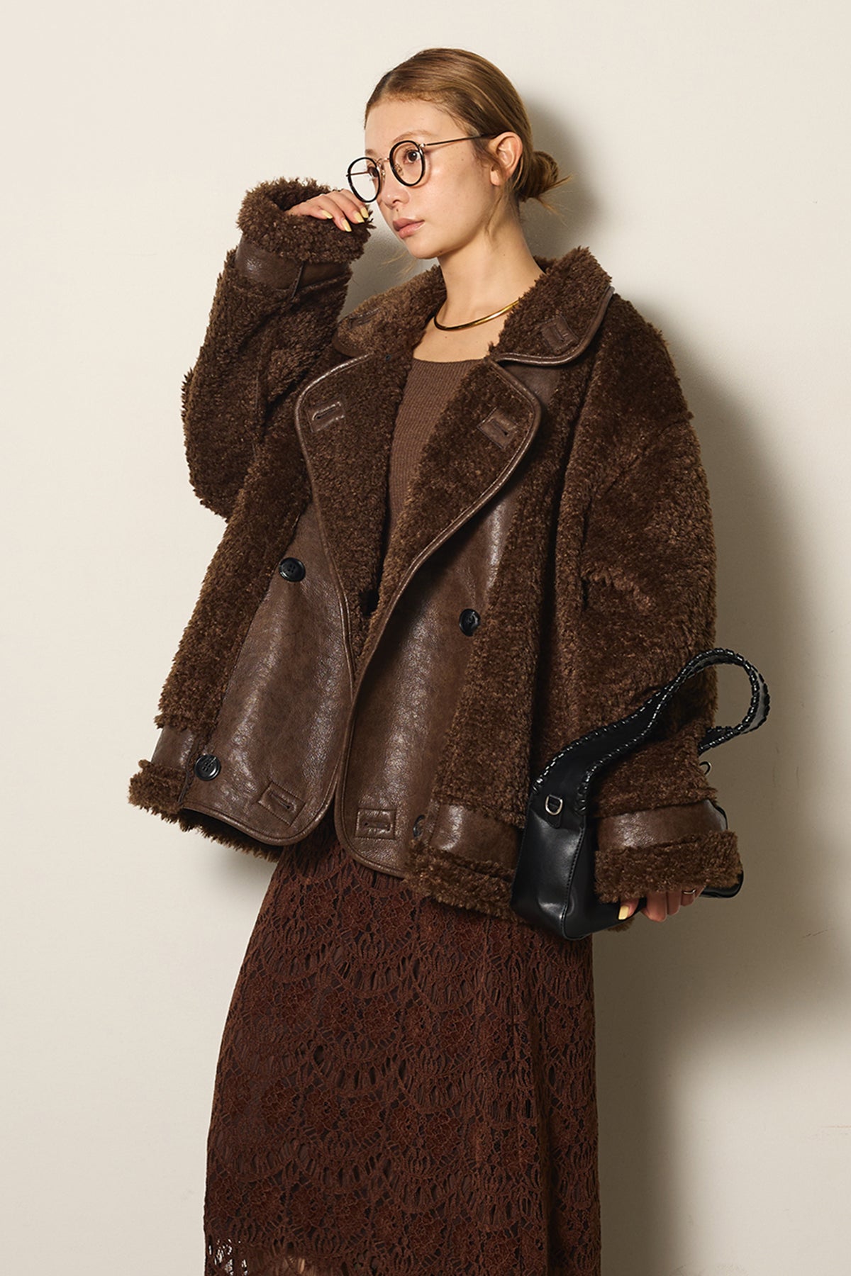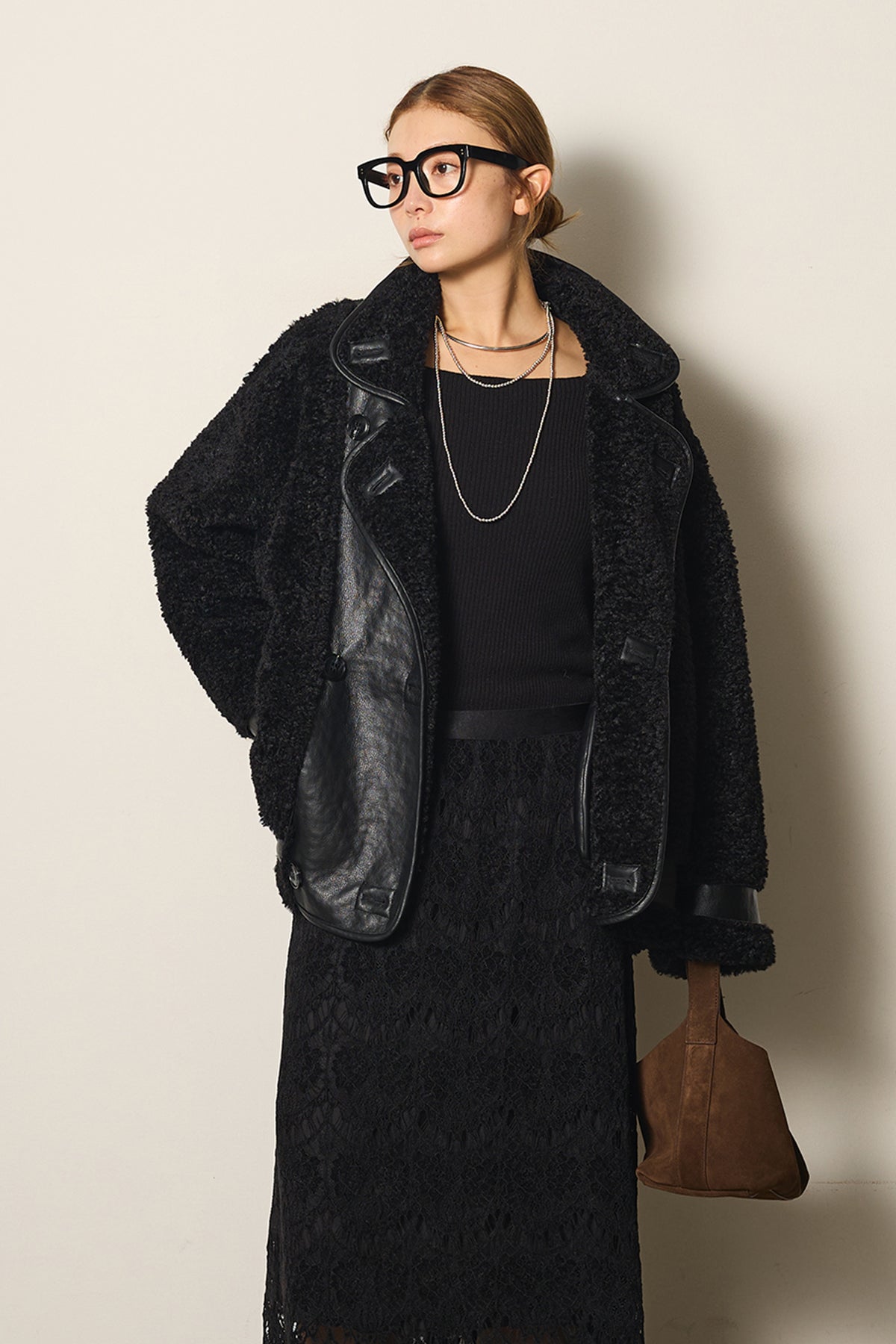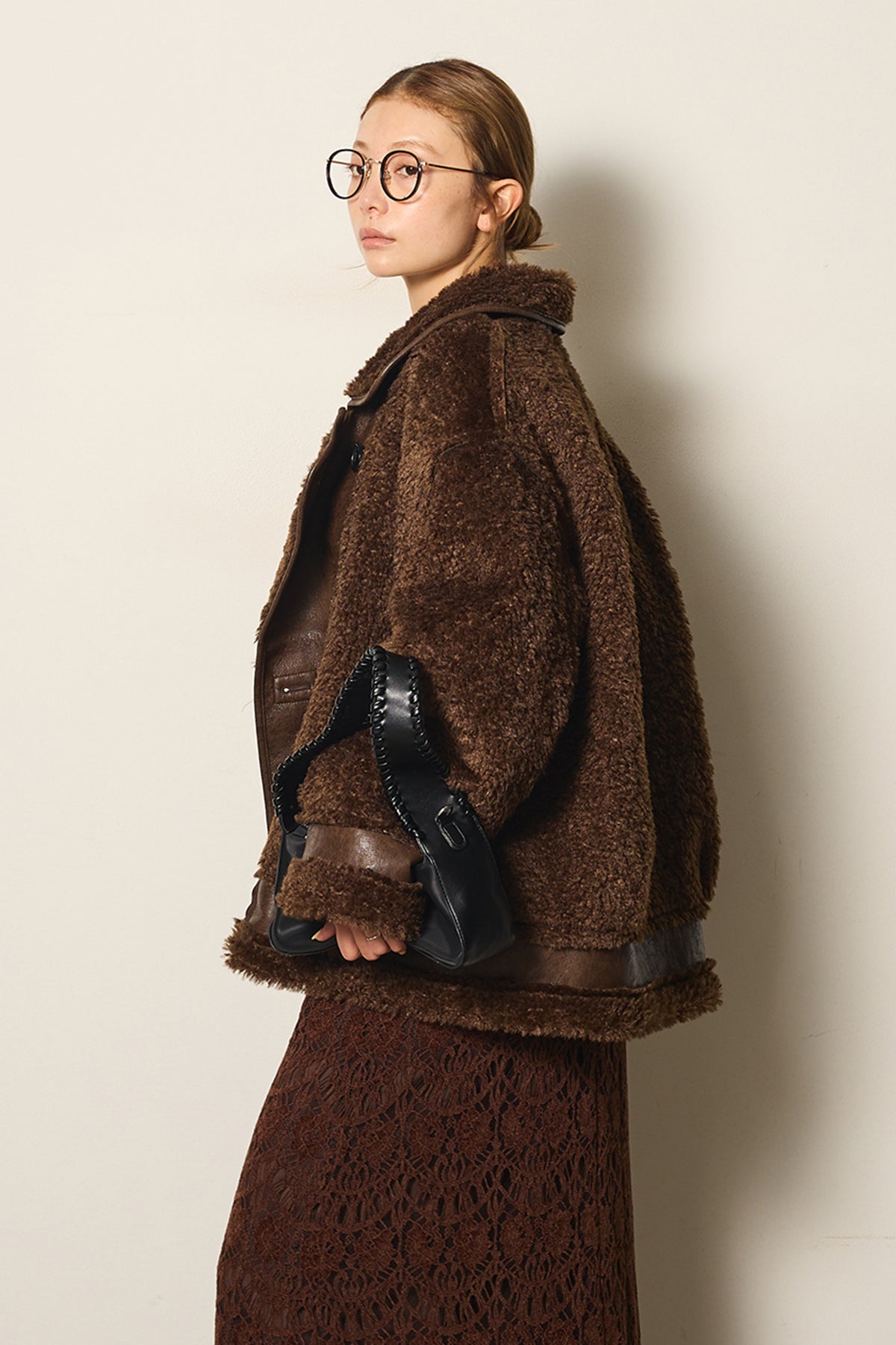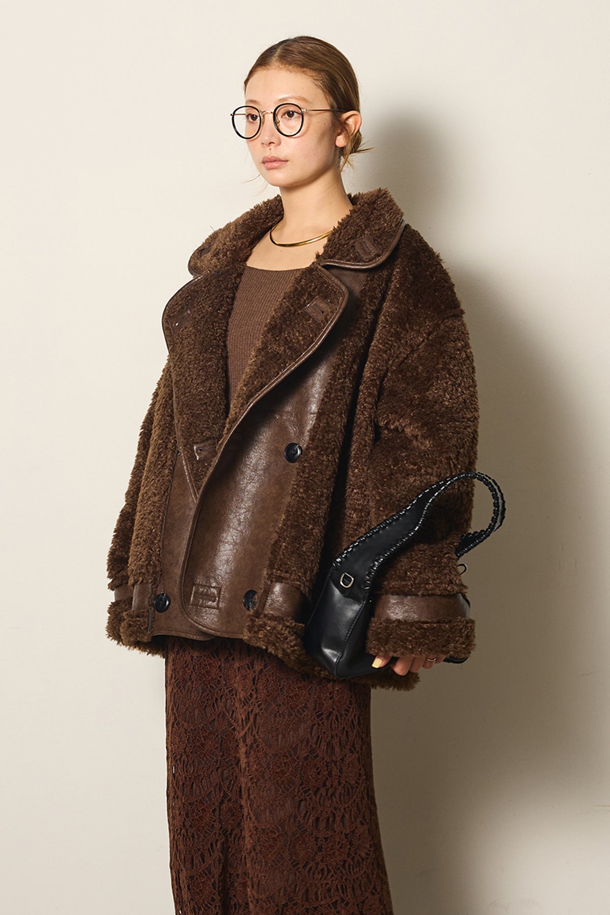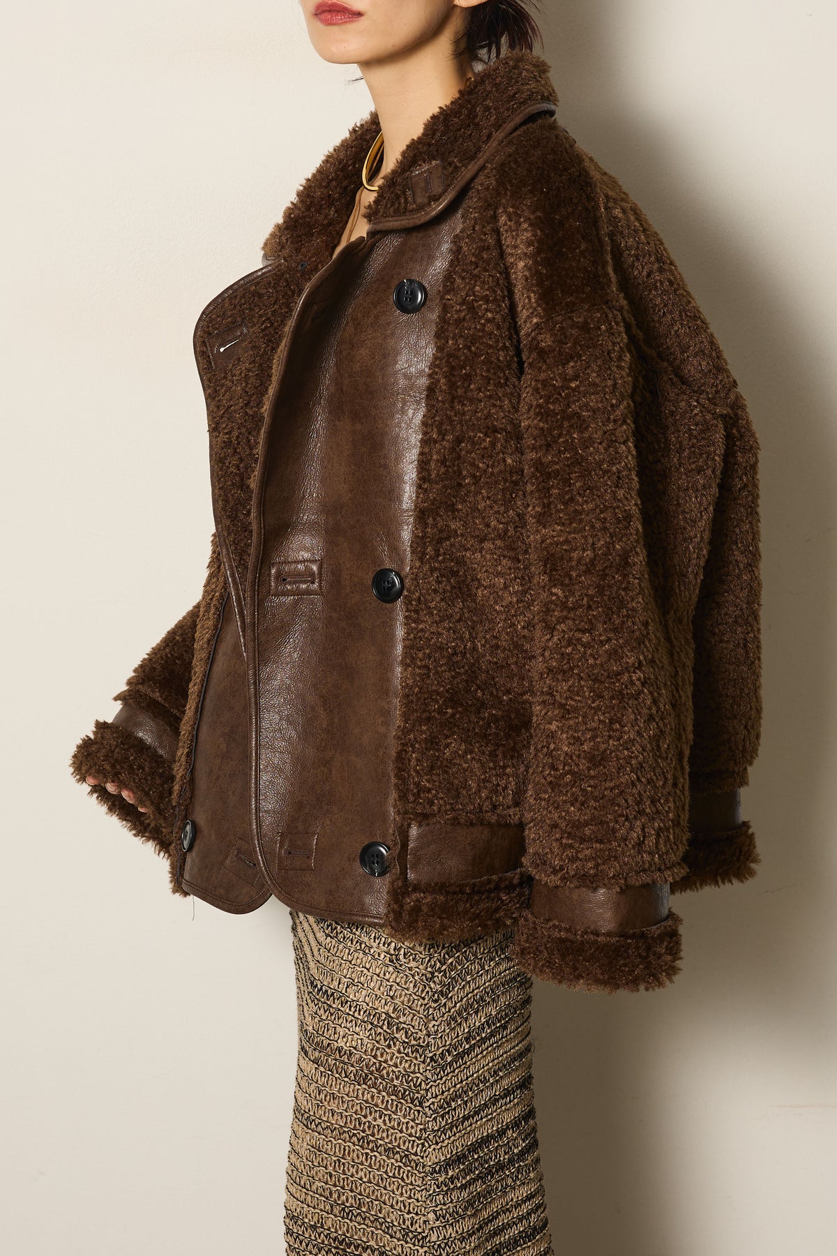 異素材のコンビネーションが目を引くフェイクレザードッキングボアアウター。柔らかなボアと艶のあるフェイクレザーの切り替えがシーズンムードを高め、スタイリングに奥行きをプラスします。ゆったりとしたシルエットで中にニットを重ねても着やすく、カジュアルにもモードにもマッチ。1枚で主役になる存在感のあるアウターです。