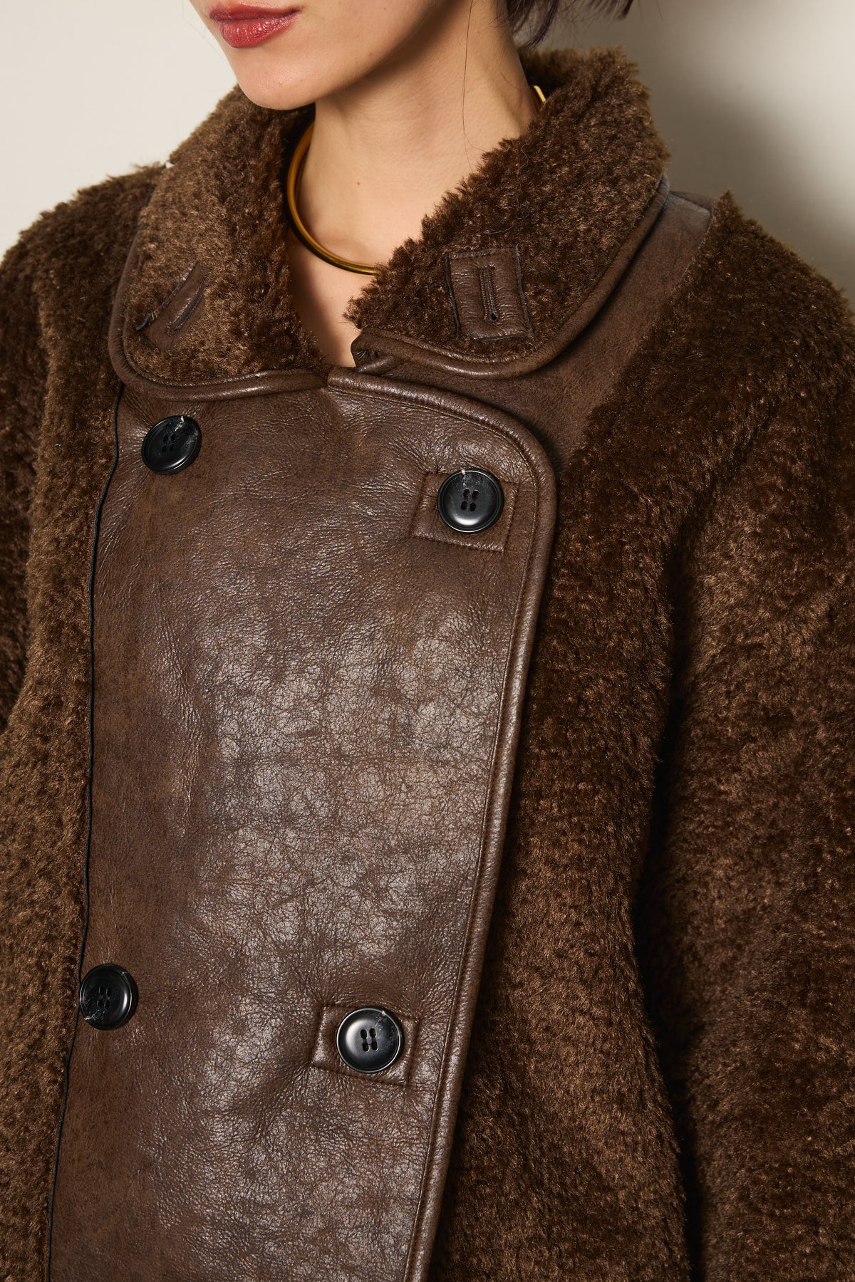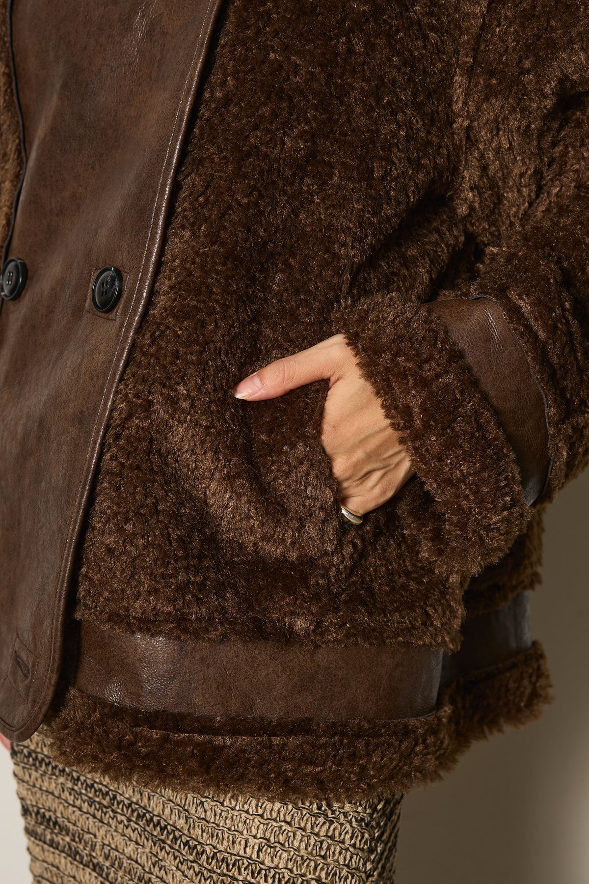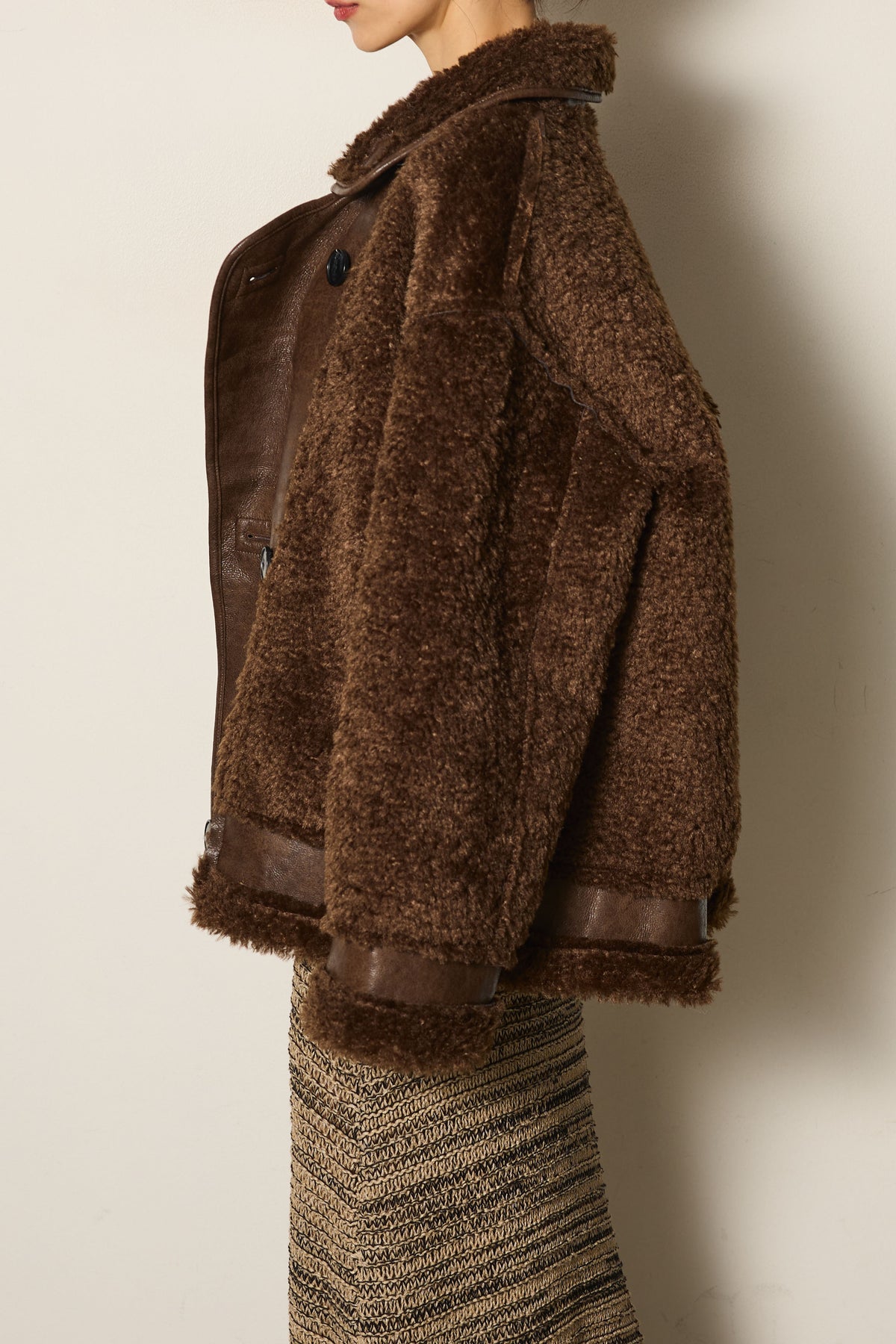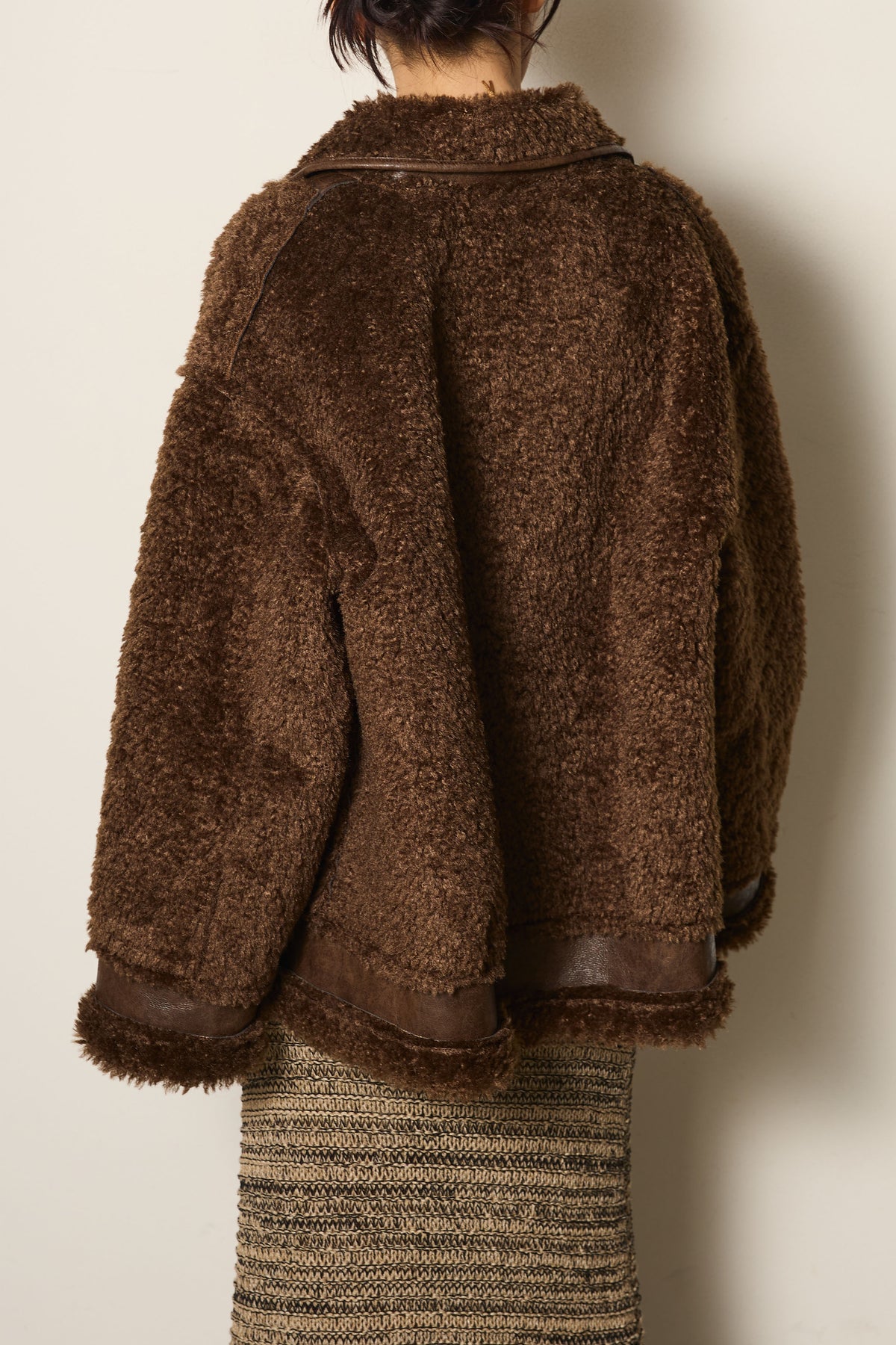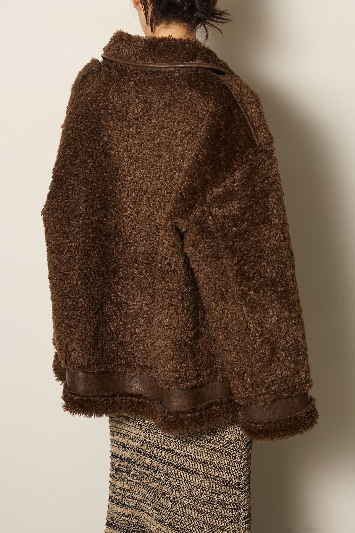 異素材のコンビネーションが目を引くフェイクレザードッキングボアアウター。柔らかなボアと艶のあるフェイクレザーの切り替えがシーズンムードを高め、スタイリングに奥行きをプラスします。ゆったりとしたシルエットで中にニットを重ねても着やすく、カジュアルにもモードにもマッチ。1枚で主役になる存在感のあるアウターです。