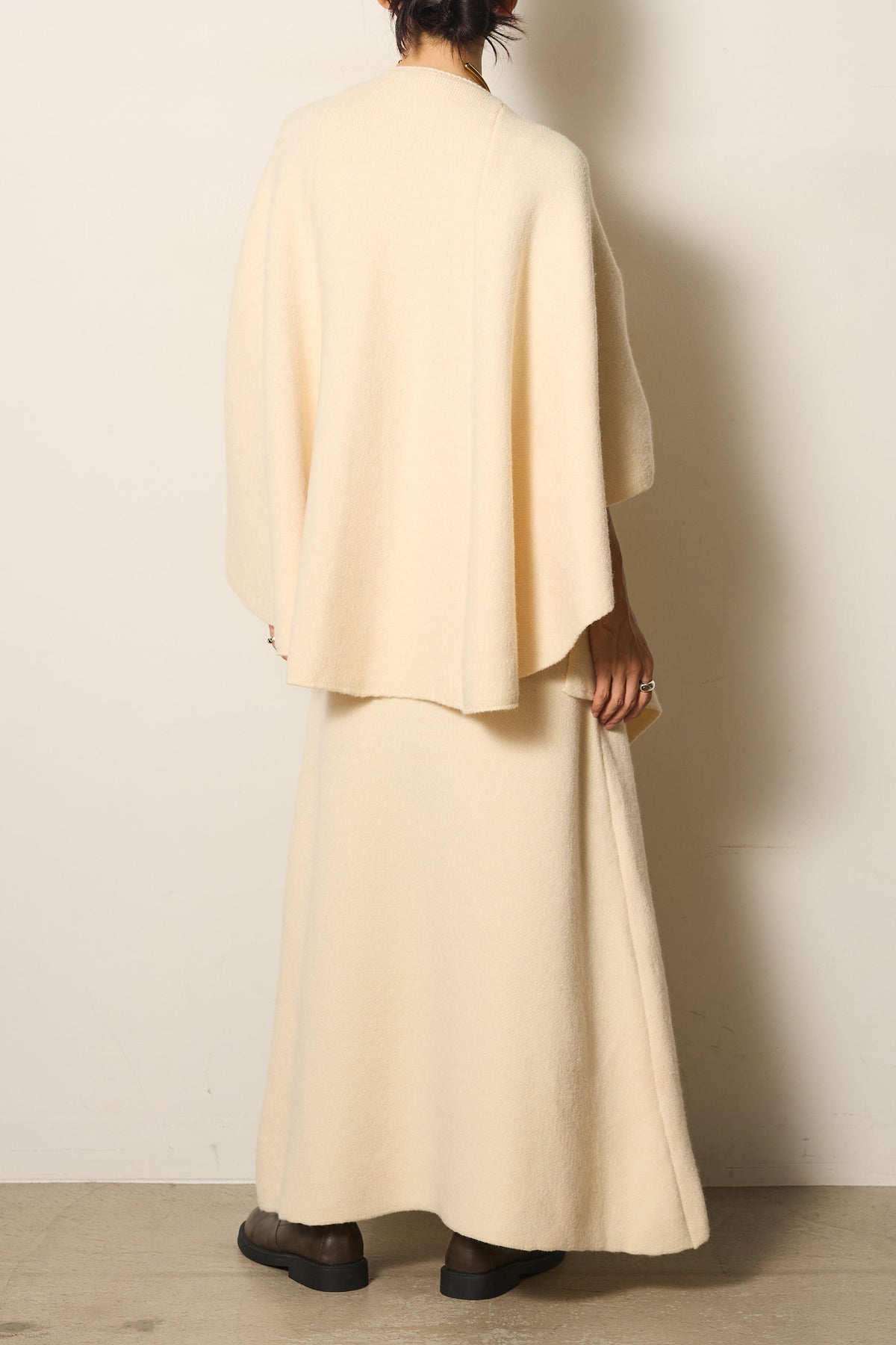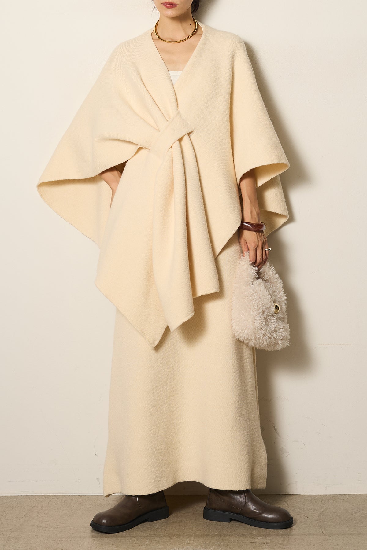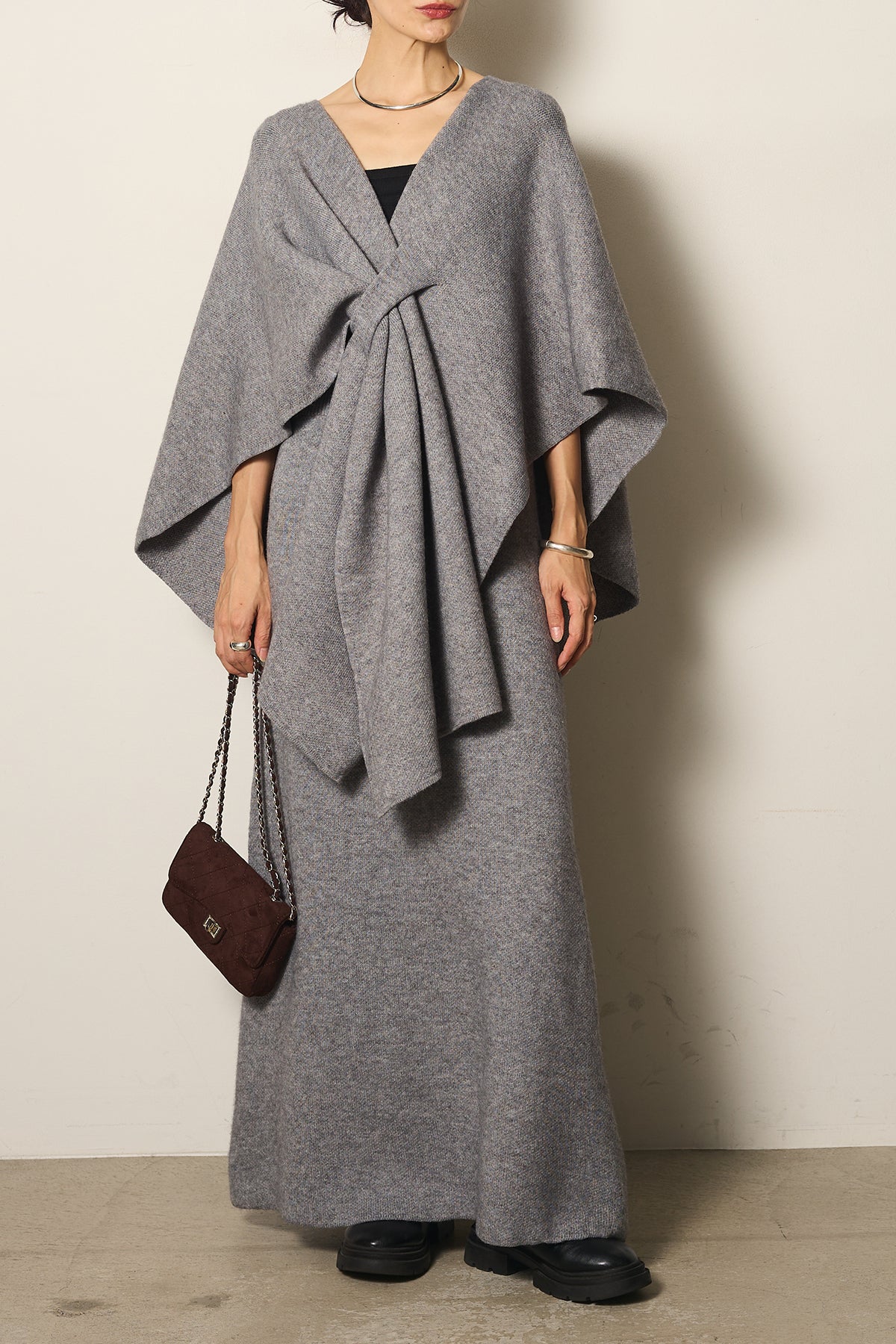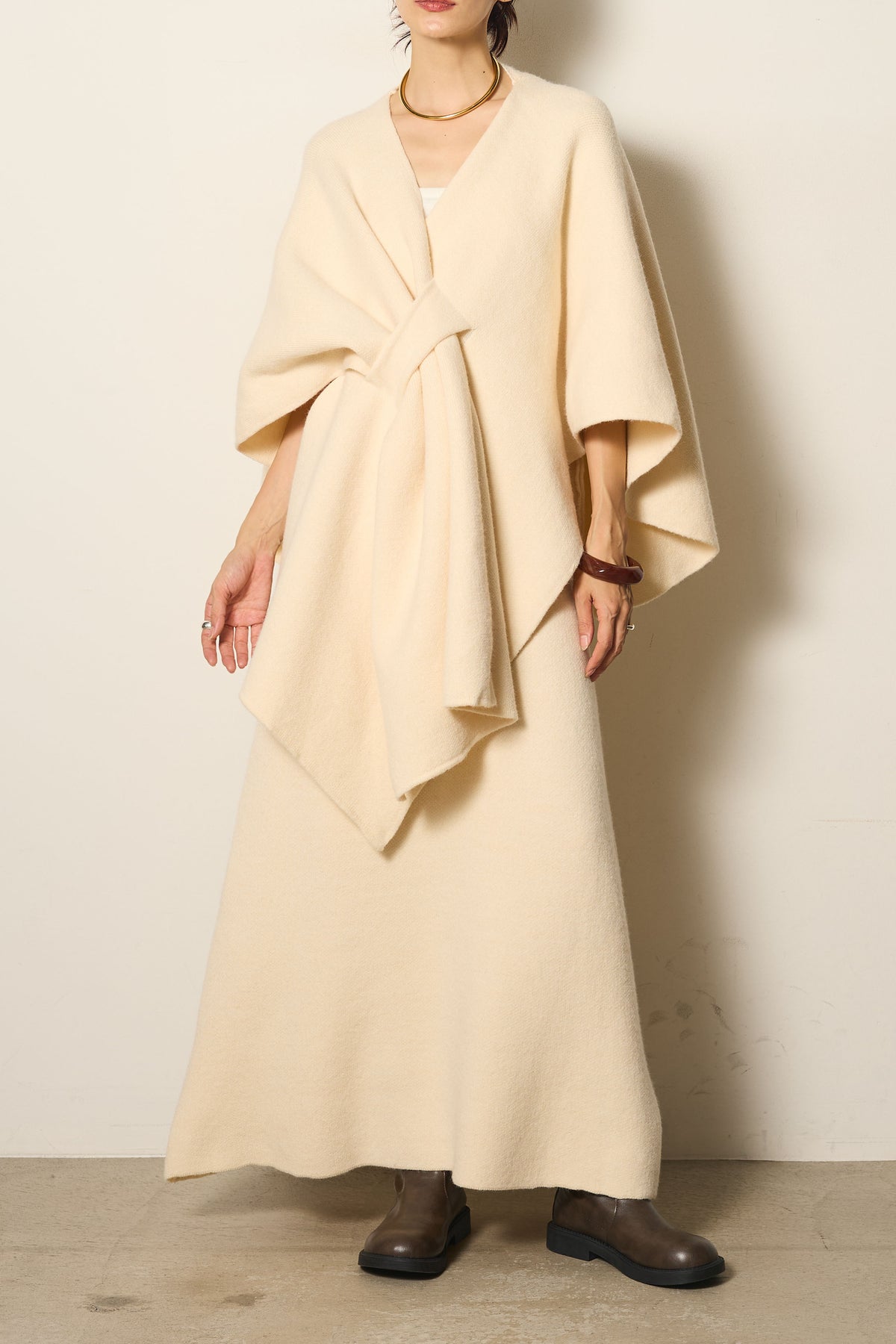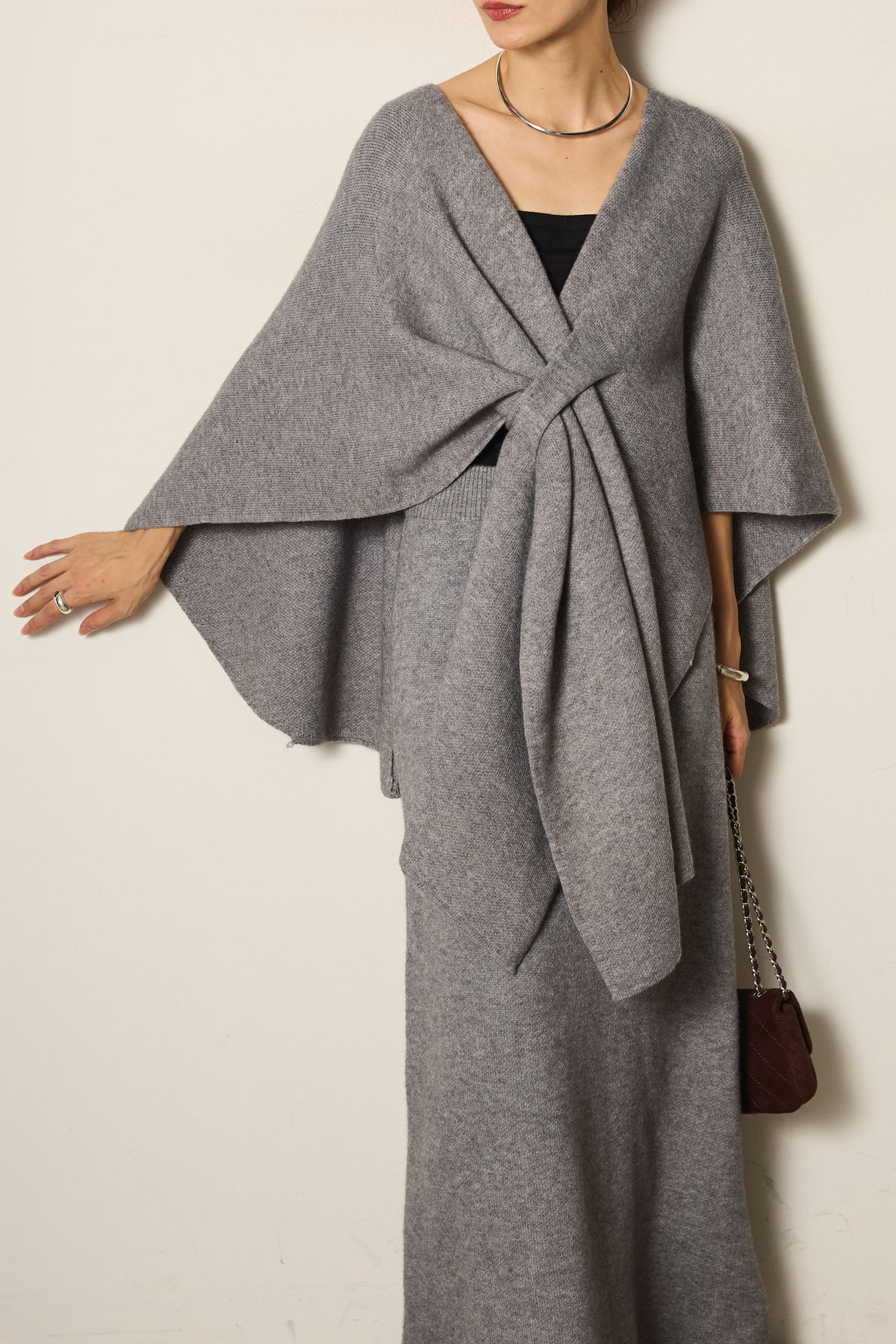立体的なツイストデザインが目を惹くポンチョニットセットアップ。柔らかく軽やかなニット素材で仕立てられ、リラックス感がありながらも上品なシルエットを演出します。ポンチョのゆったり感とスカートの縦ラインがバランスよく、1枚でこなれた印象に。季節の変わり目に活躍する、大人の抜け感スタイルを叶えるアイテムです。