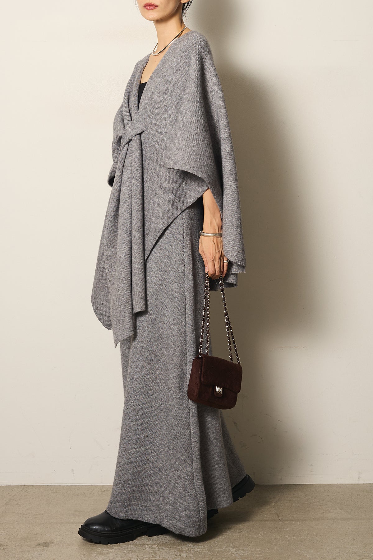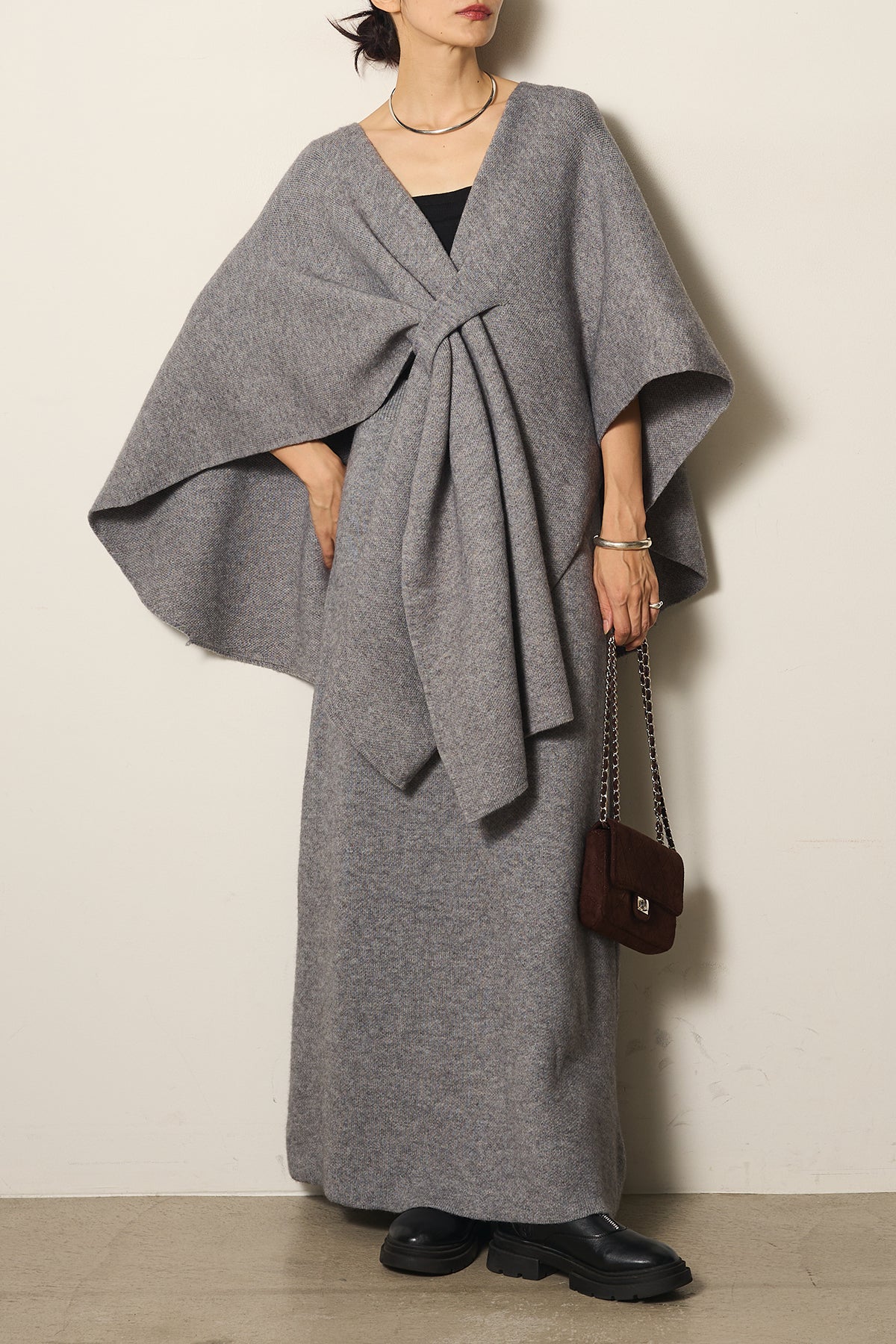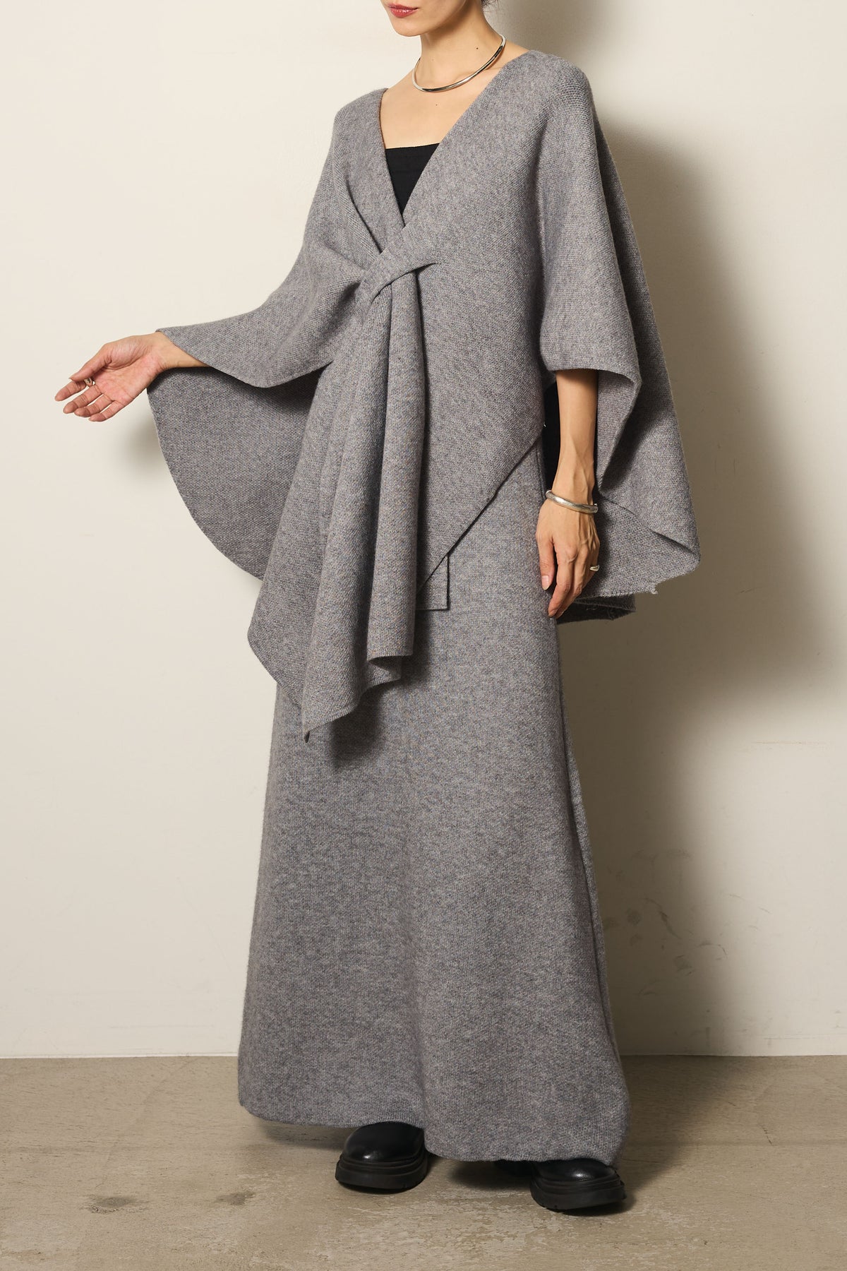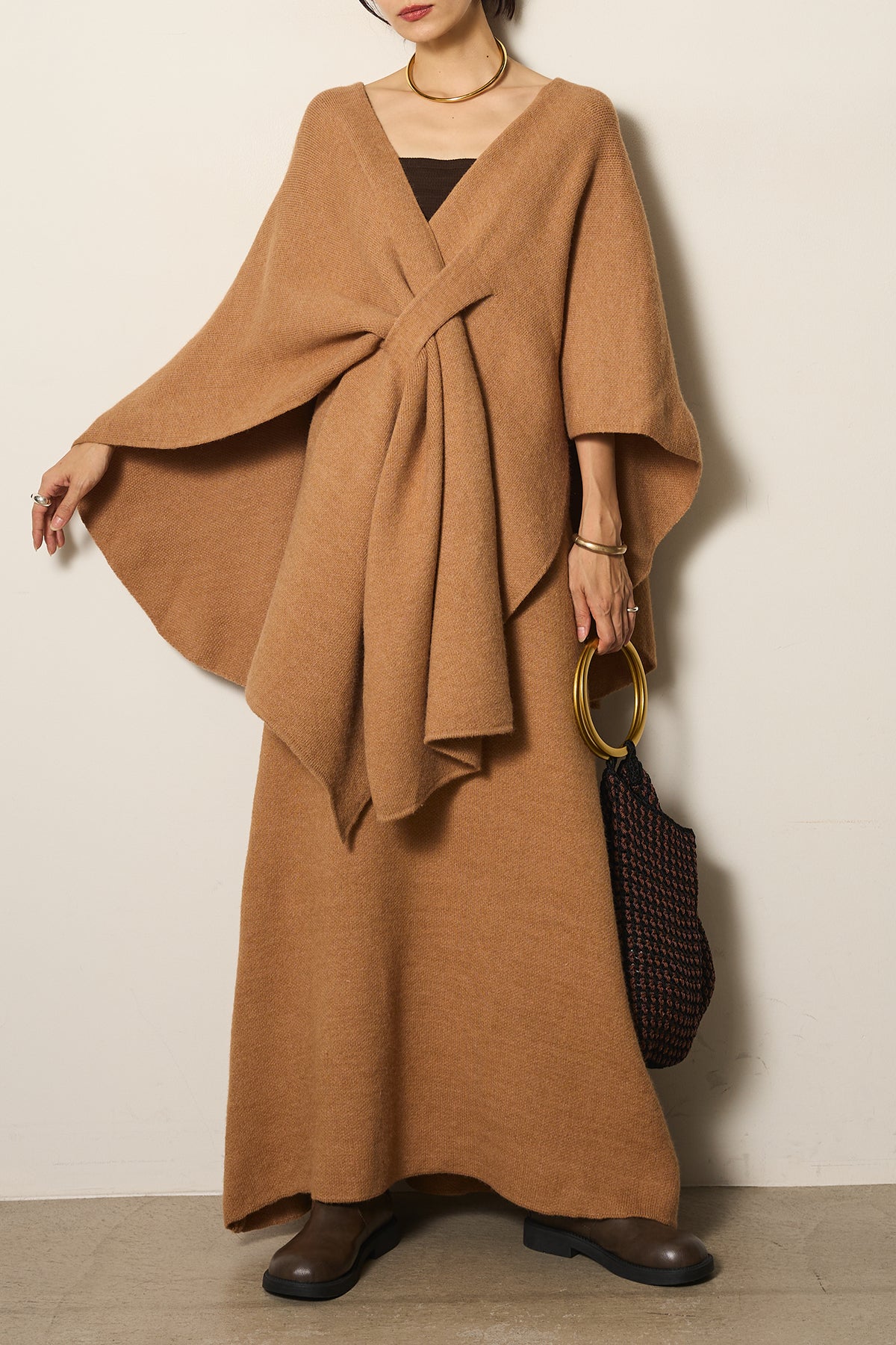 立体的なツイストデザインが目を惹くポンチョニットセットアップ。柔らかく軽やかなニット素材で仕立てられ、リラックス感がありながらも上品なシルエットを演出します。ポンチョのゆったり感とスカートの縦ラインがバランスよく、1枚でこなれた印象に。季節の変わり目に活躍する、大人の抜け感スタイルを叶えるアイテムです。