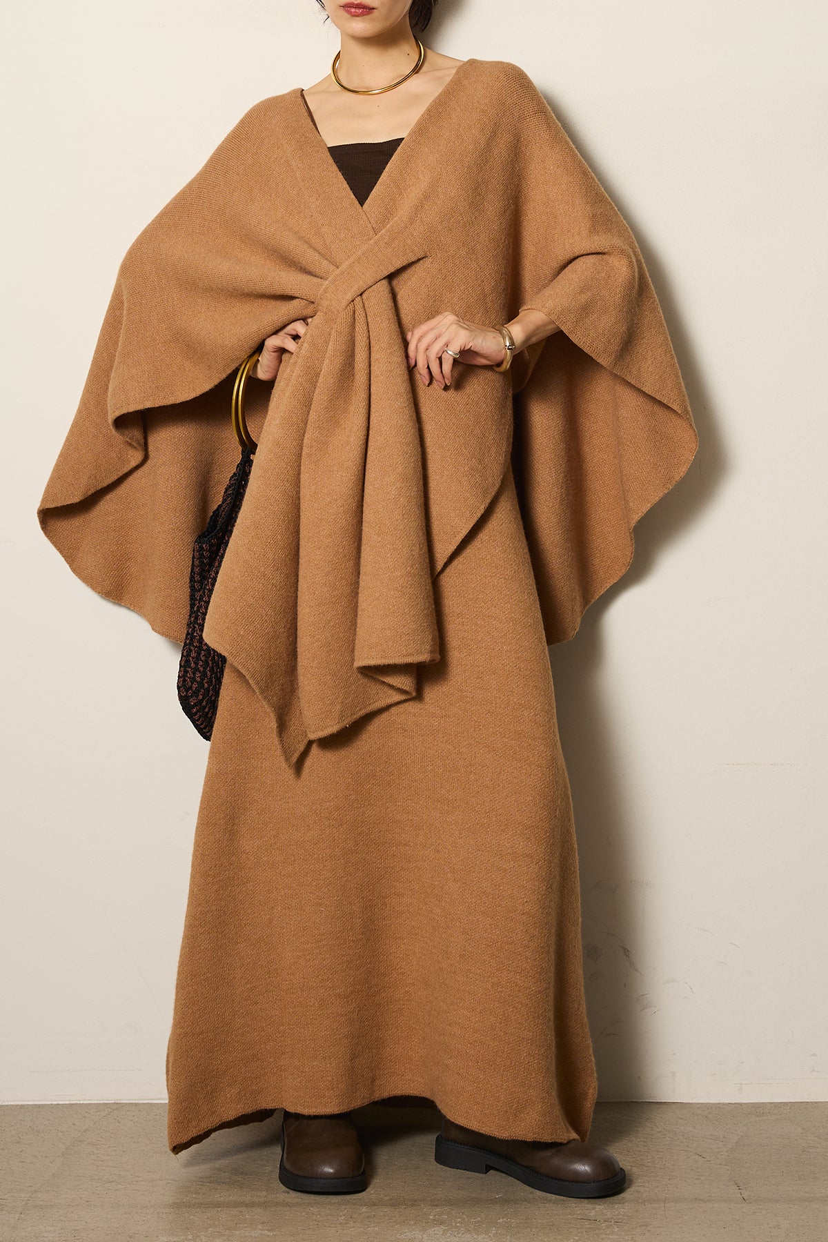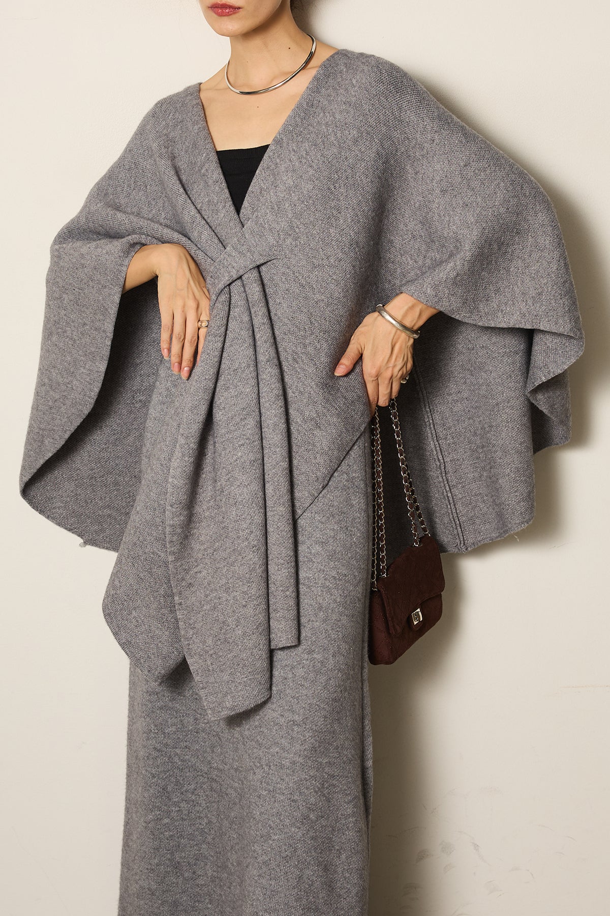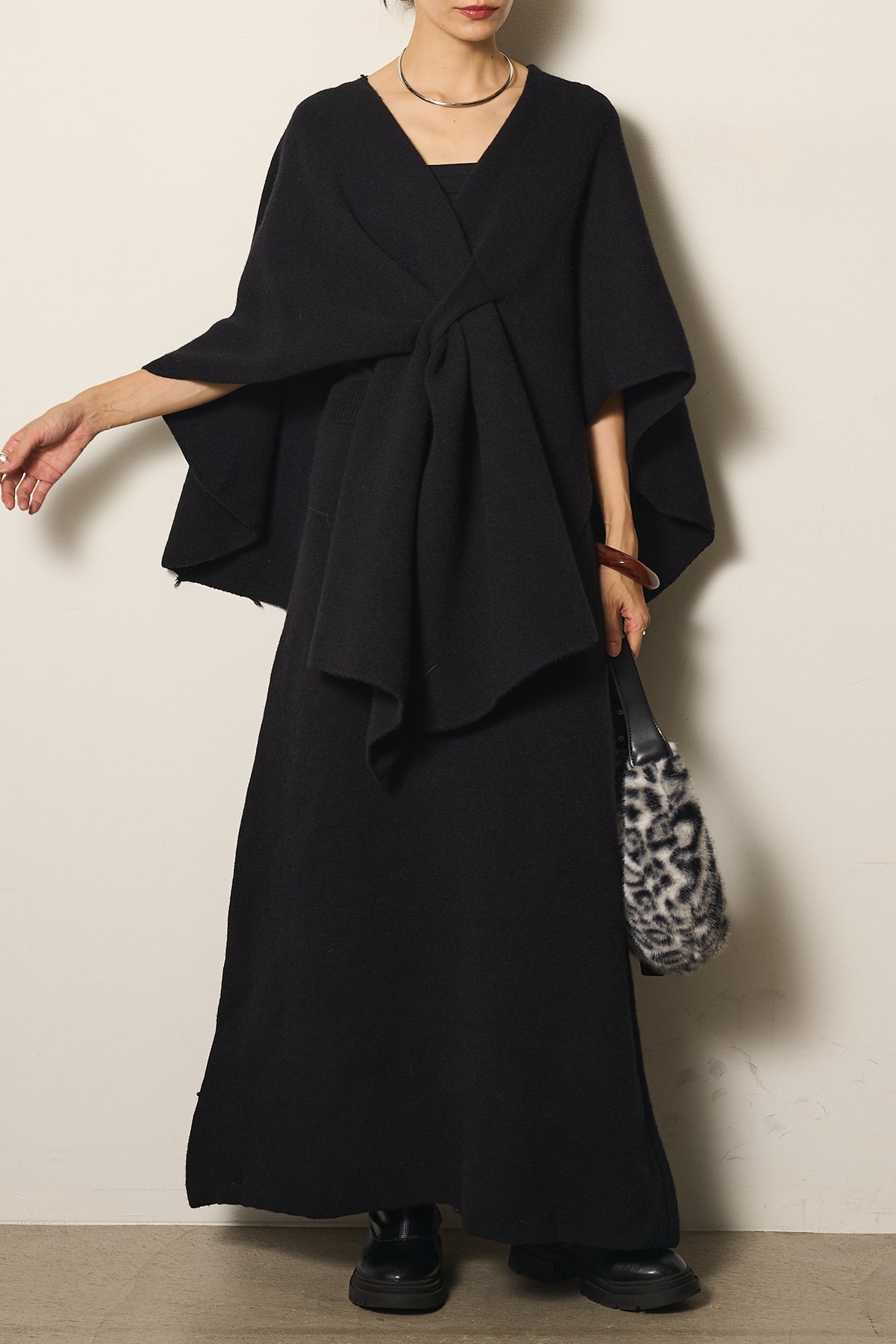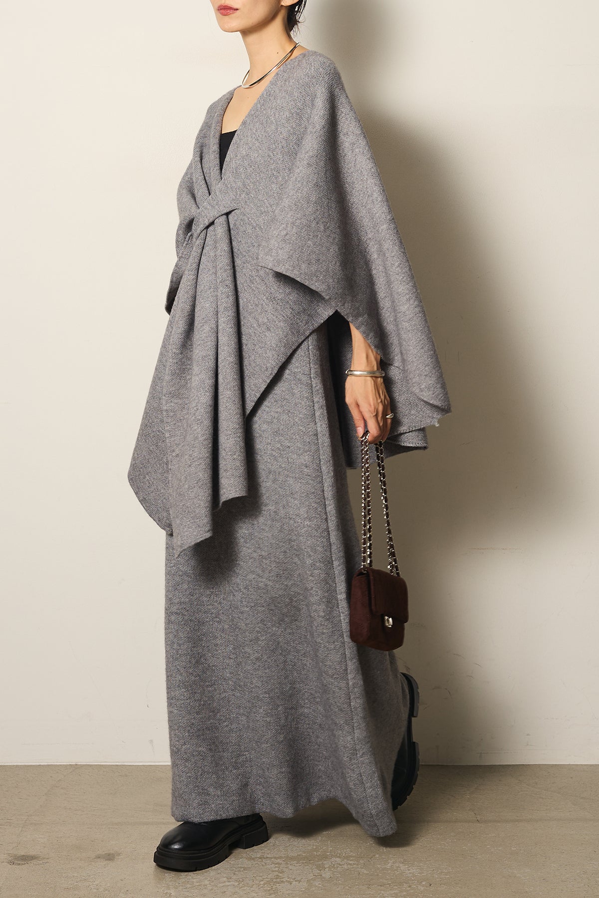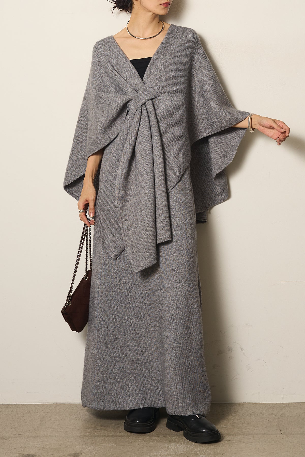 立体的なツイストデザインが目を惹くポンチョニットセットアップ。柔らかく軽やかなニット素材で仕立てられ、リラックス感がありながらも上品なシルエットを演出します。ポンチョのゆったり感とスカートの縦ラインがバランスよく、1枚でこなれた印象に。季節の変わり目に活躍する、大人の抜け感スタイルを叶えるアイテムです。