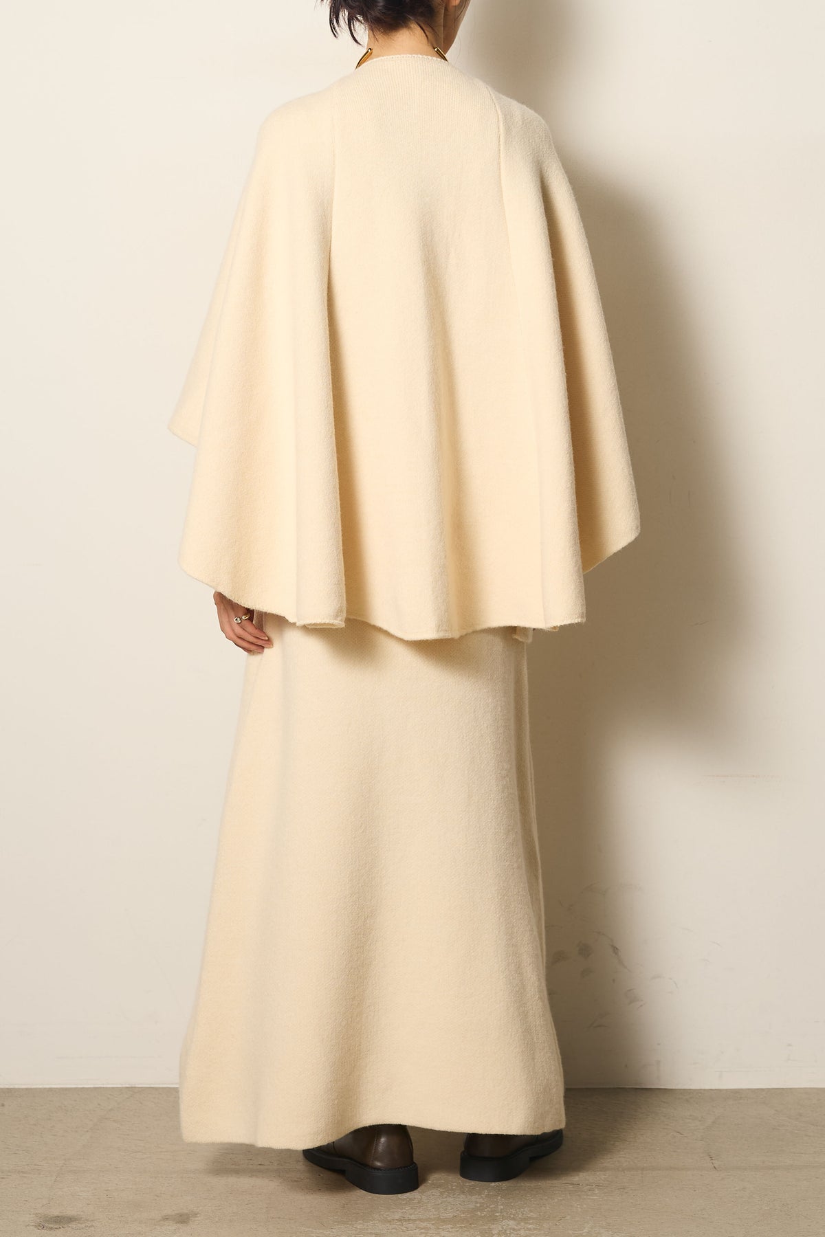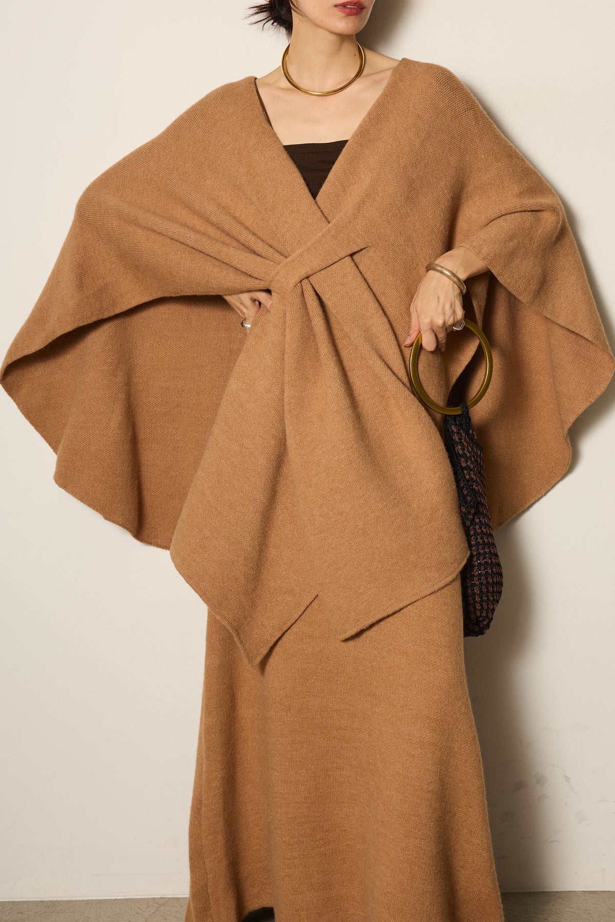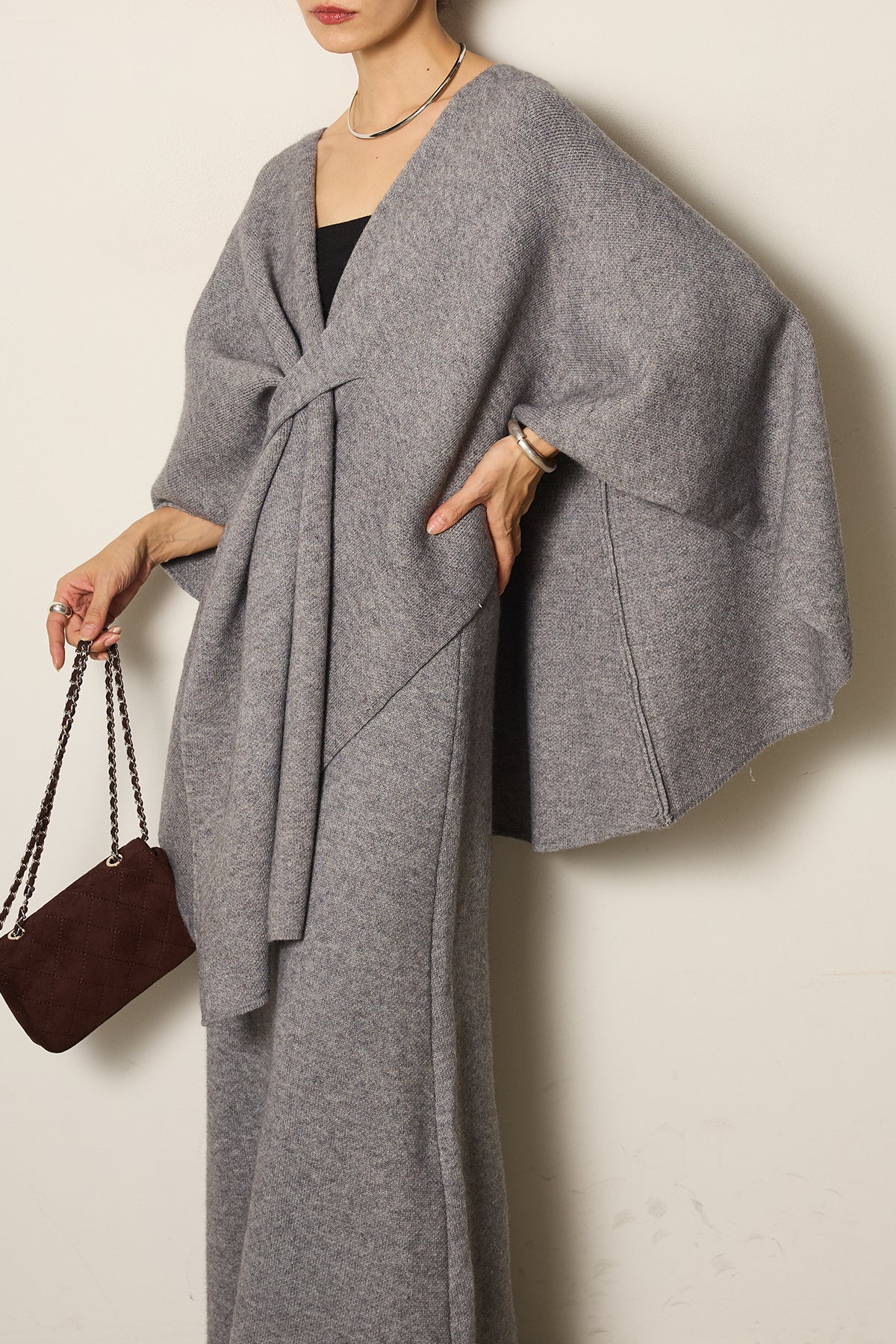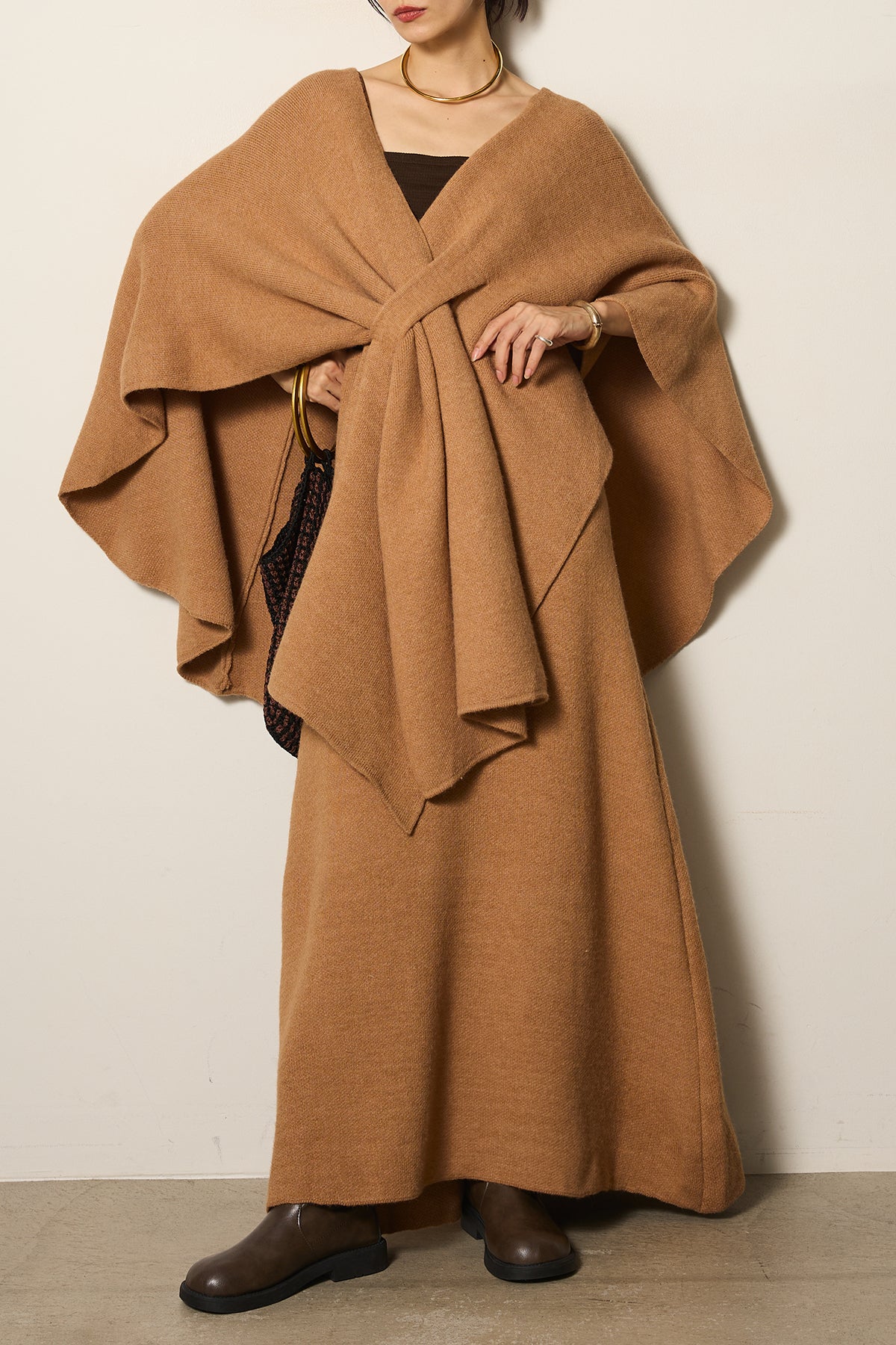 立体的なツイストデザインが目を惹くポンチョニットセットアップ。柔らかく軽やかなニット素材で仕立てられ、リラックス感がありながらも上品なシルエットを演出します。ポンチョのゆったり感とスカートの縦ラインがバランスよく、1枚でこなれた印象に。季節の変わり目に活躍する、大人の抜け感スタイルを叶えるアイテムです。