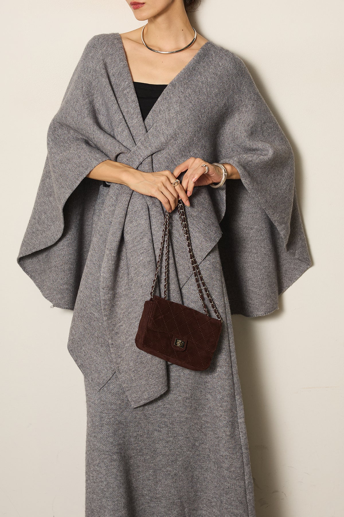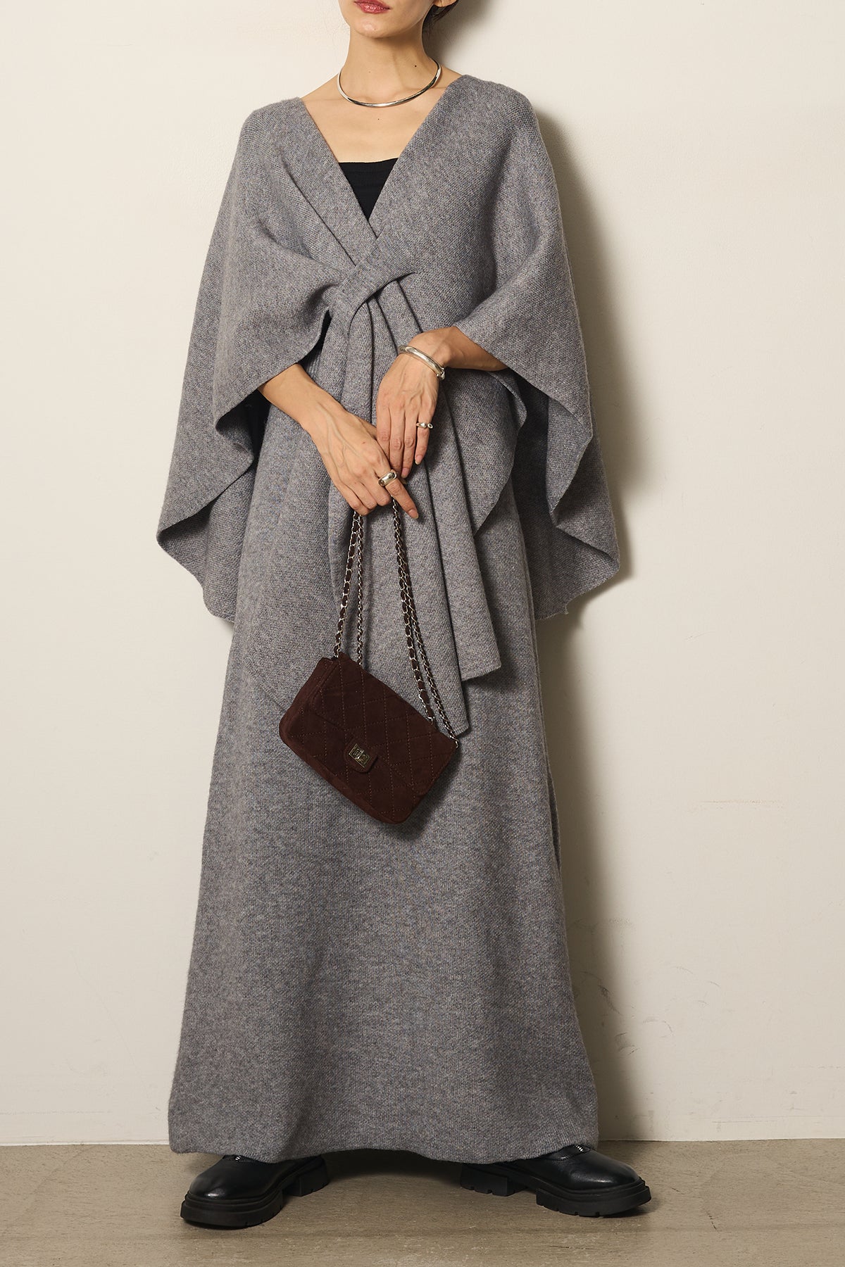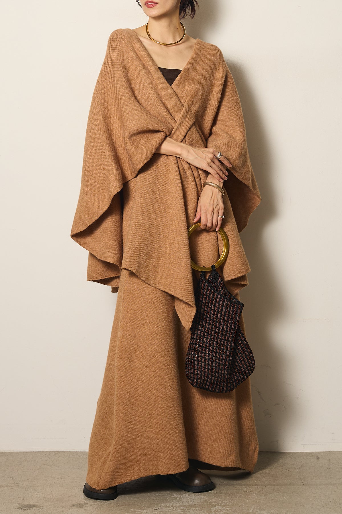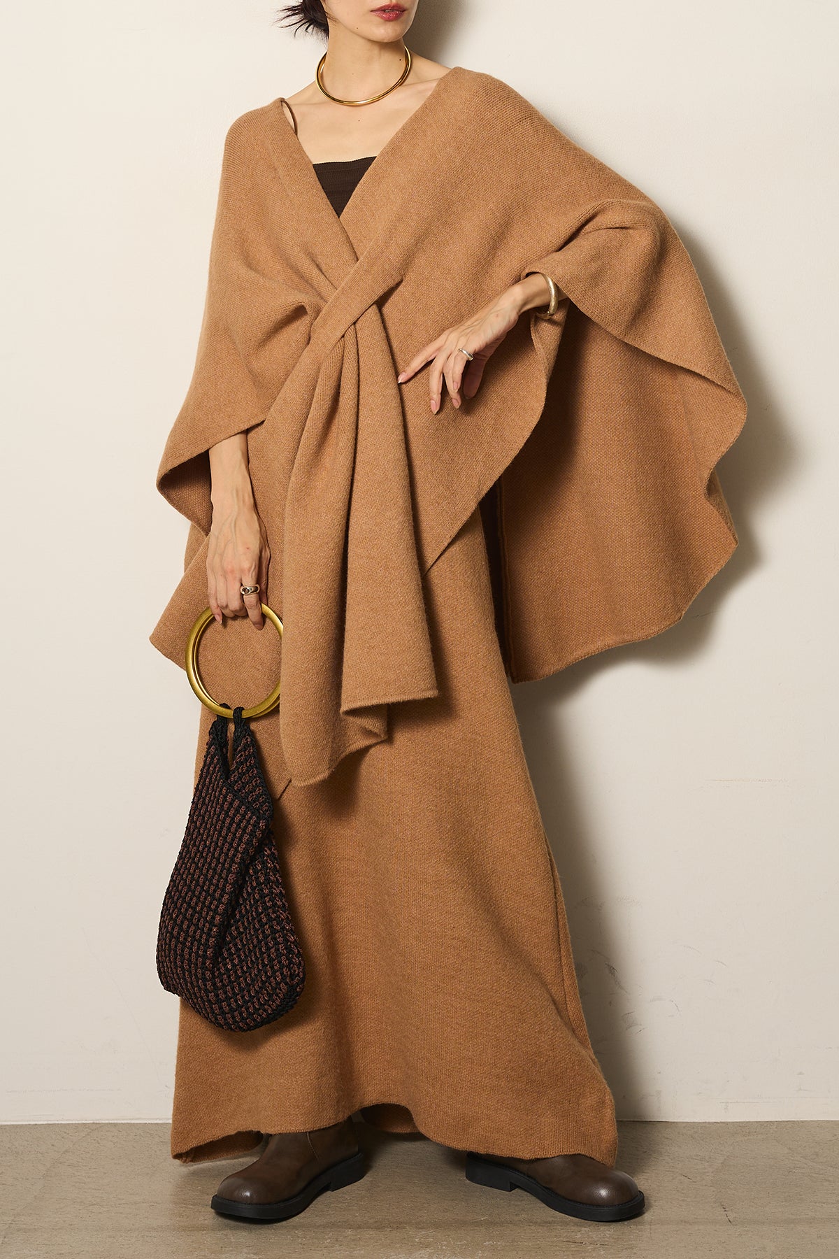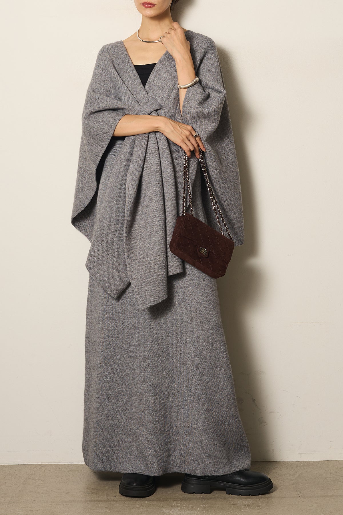 立体的なツイストデザインが目を惹くポンチョニットセットアップ。柔らかく軽やかなニット素材で仕立てられ、リラックス感がありながらも上品なシルエットを演出します。ポンチョのゆったり感とスカートの縦ラインがバランスよく、1枚でこなれた印象に。季節の変わり目に活躍する、大人の抜け感スタイルを叶えるアイテムです。