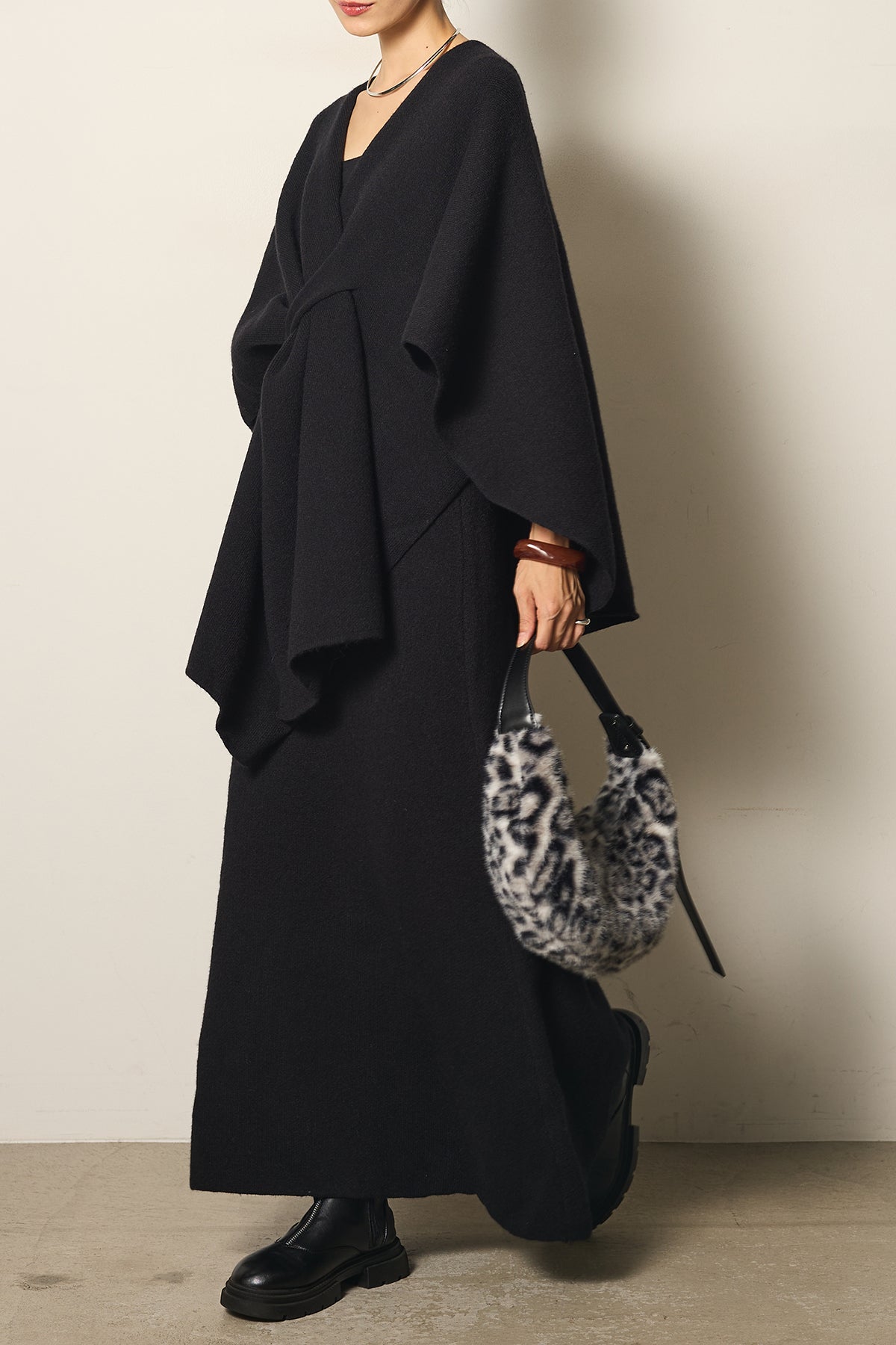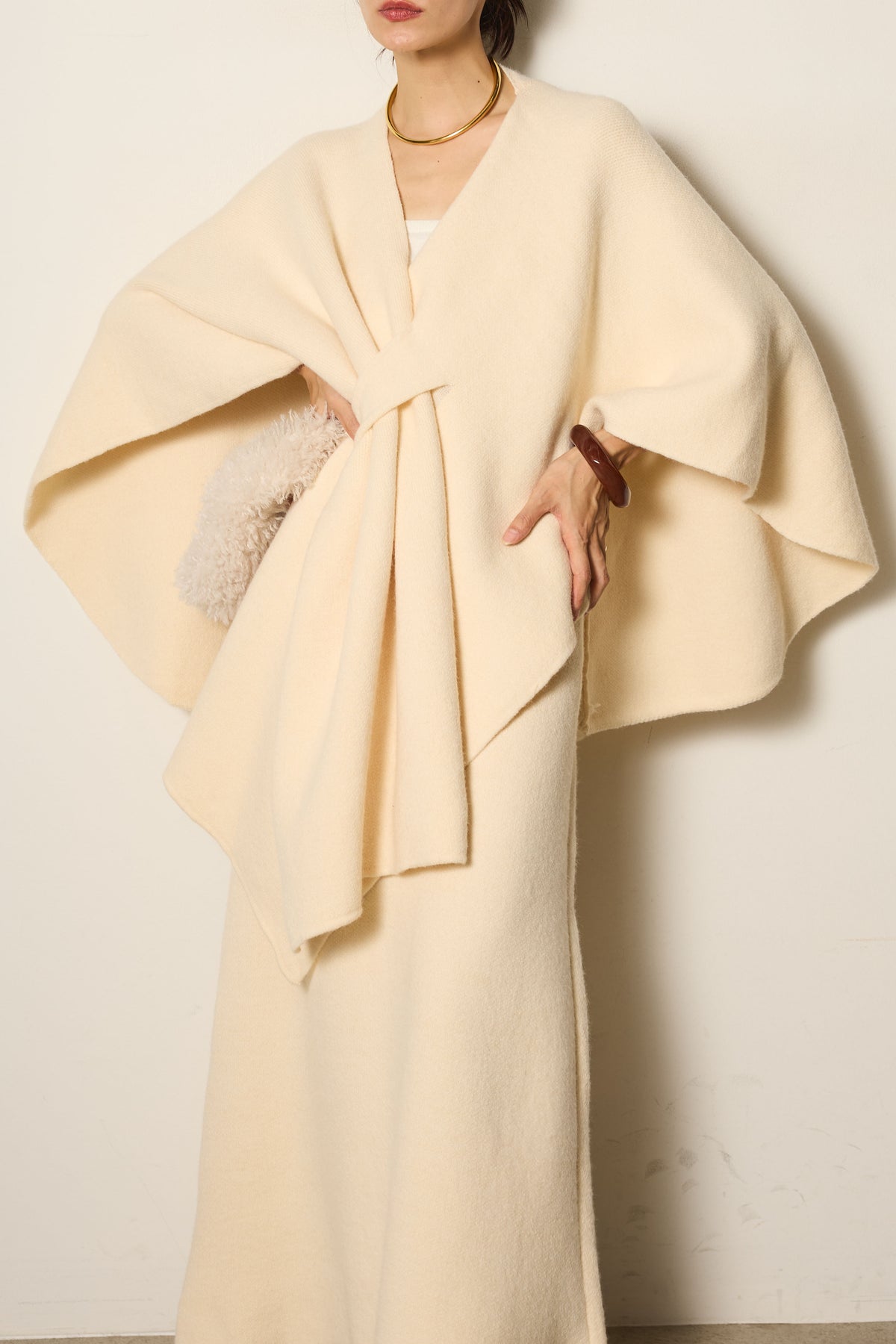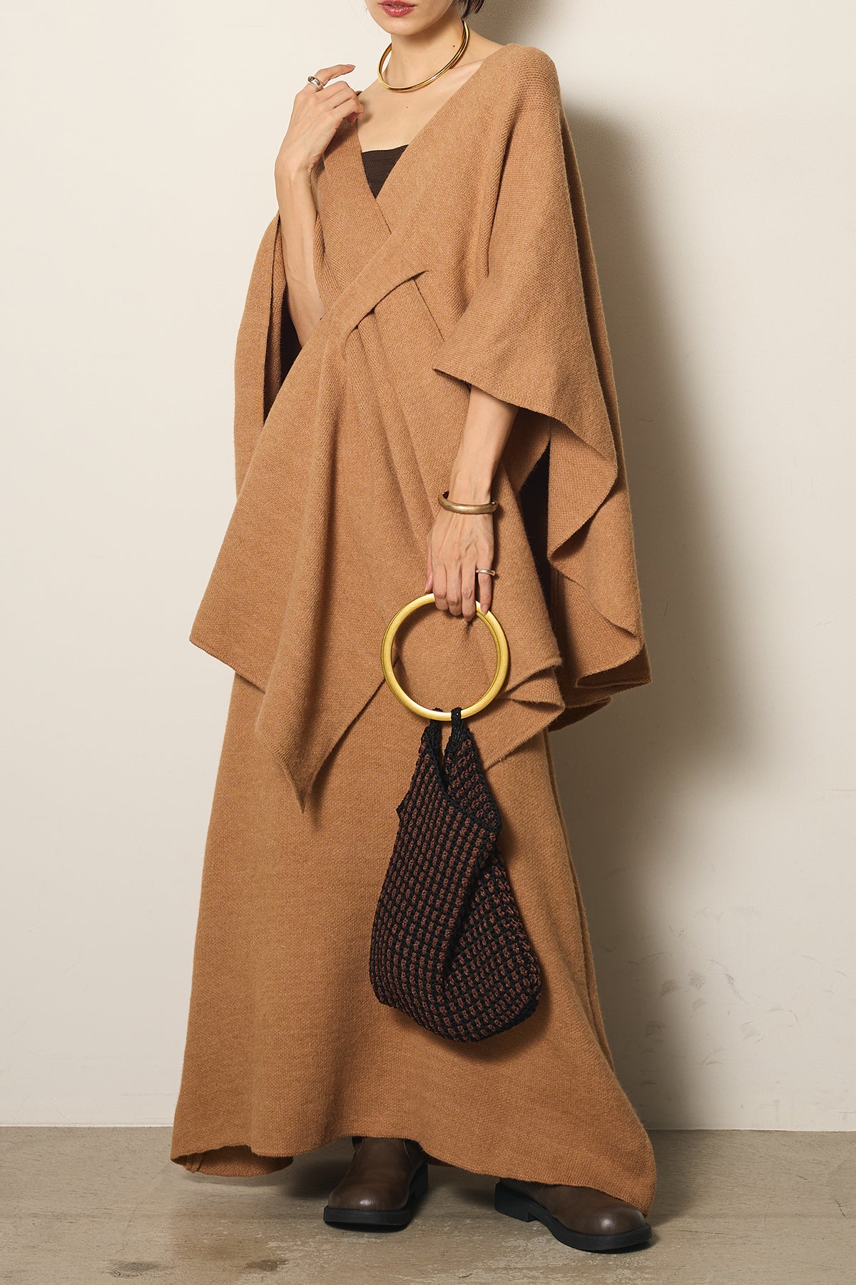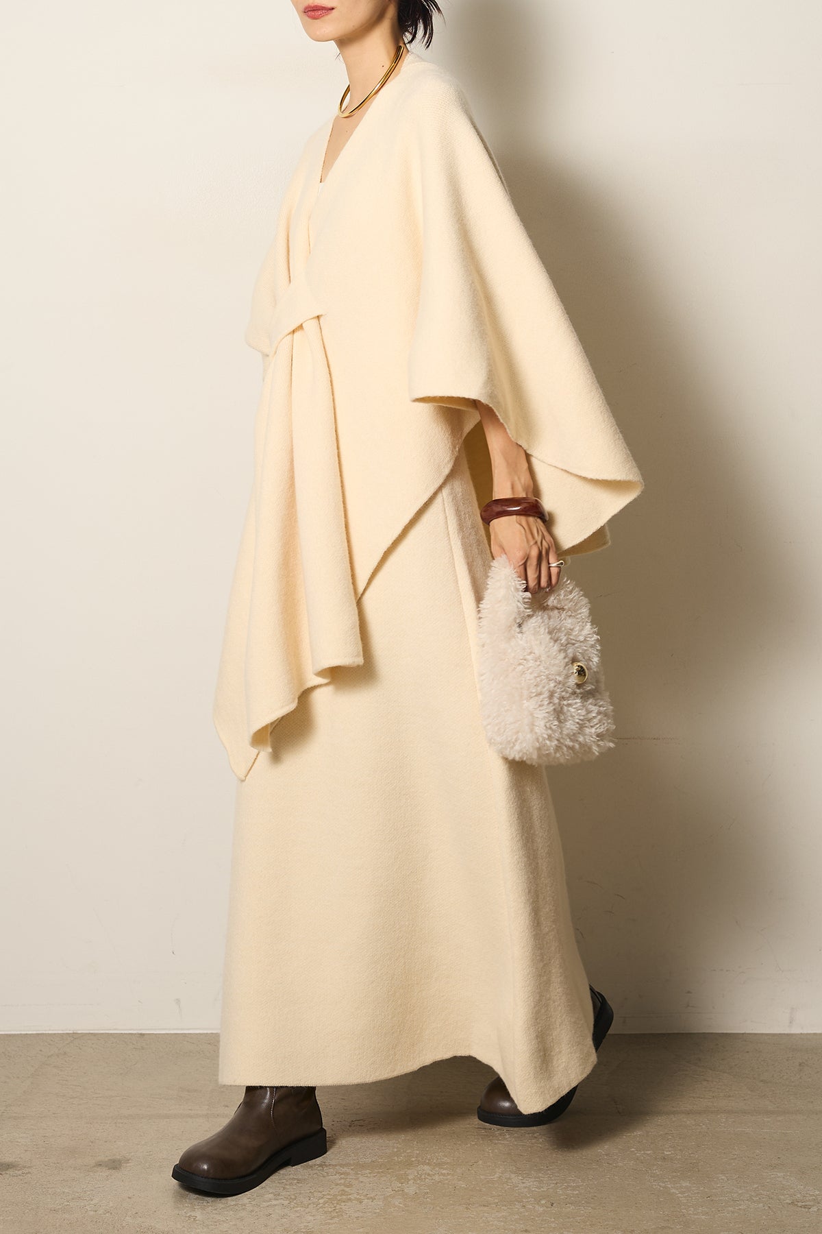 立体的なツイストデザインが目を惹くポンチョニットセットアップ。柔らかく軽やかなニット素材で仕立てられ、リラックス感がありながらも上品なシルエットを演出します。ポンチョのゆったり感とスカートの縦ラインがバランスよく、1枚でこなれた印象に。季節の変わり目に活躍する、大人の抜け感スタイルを叶えるアイテムです。