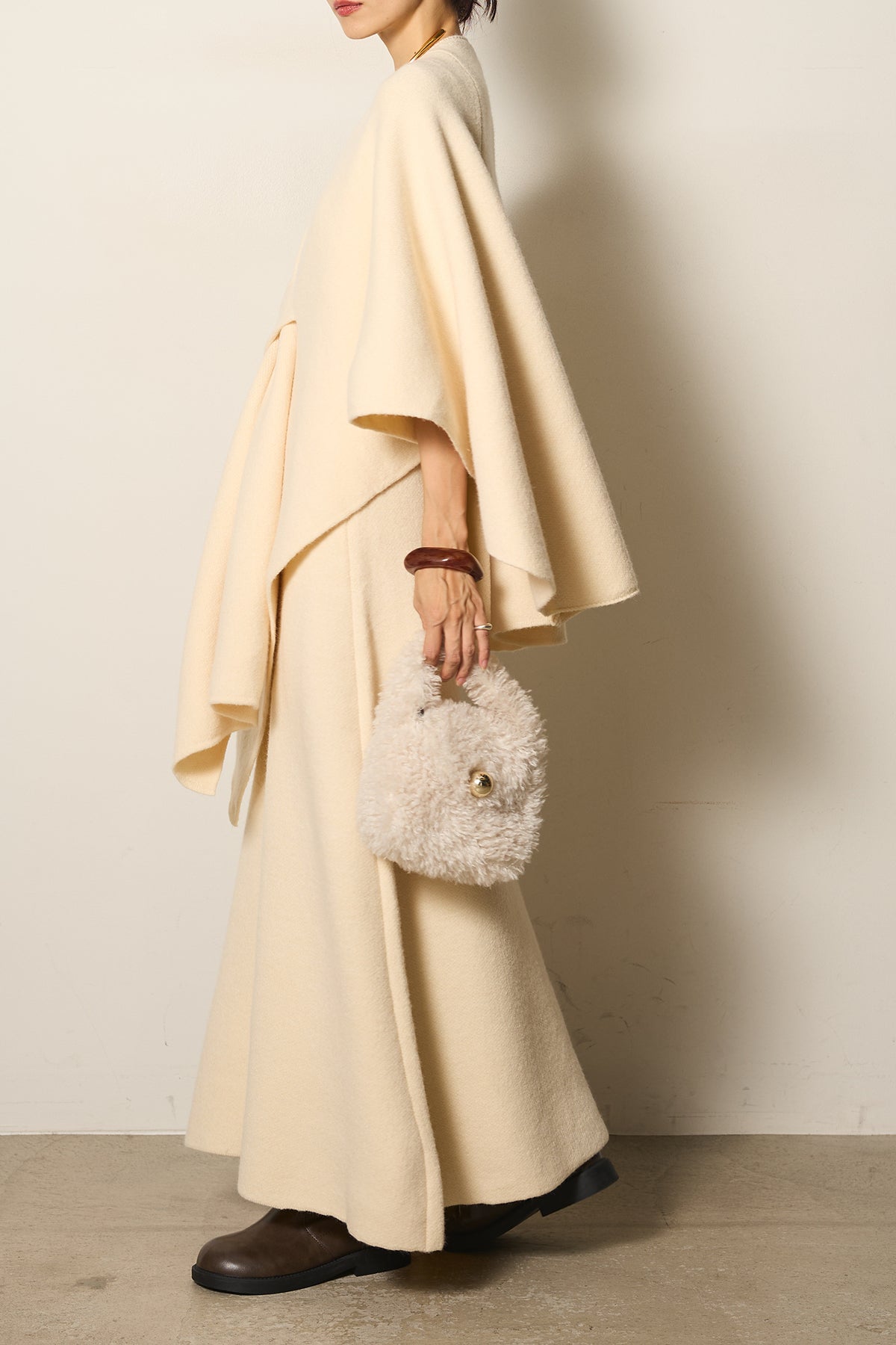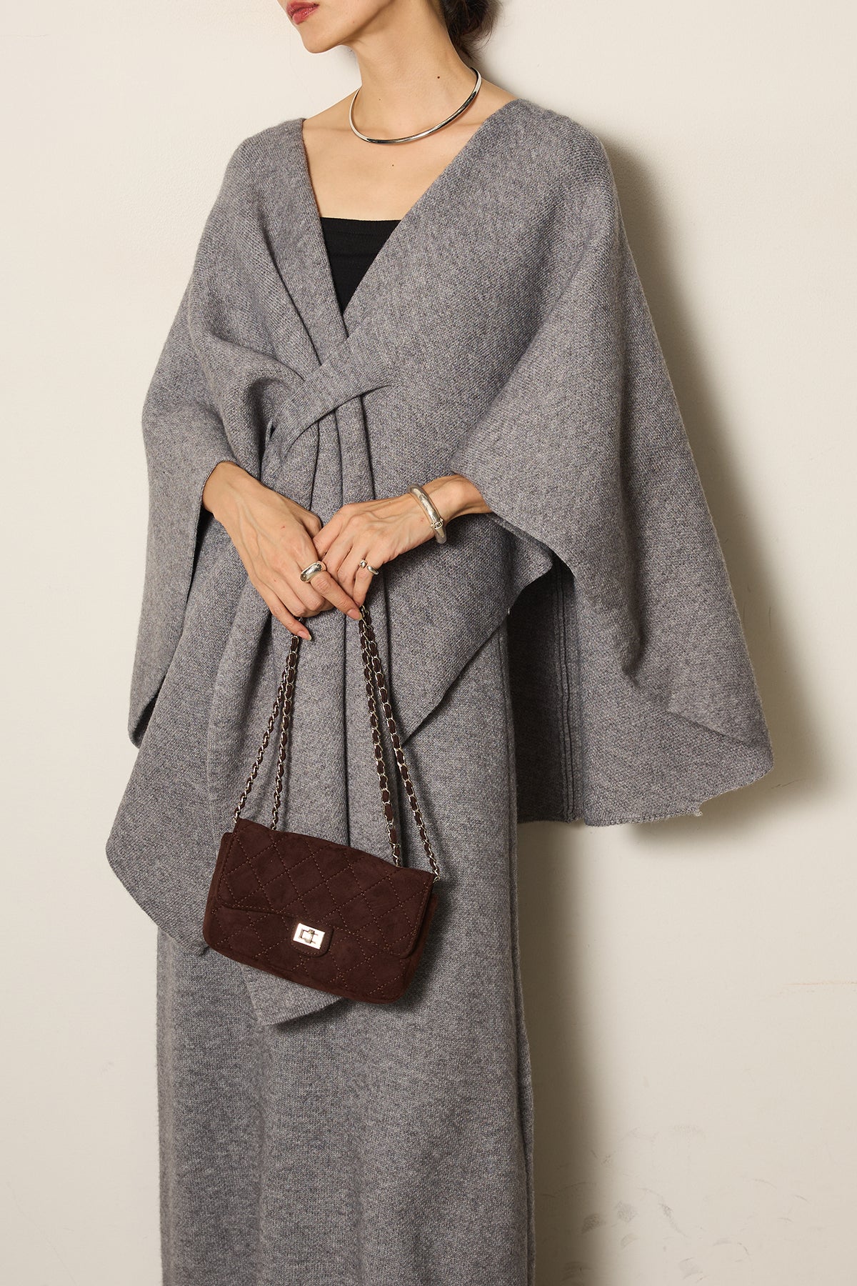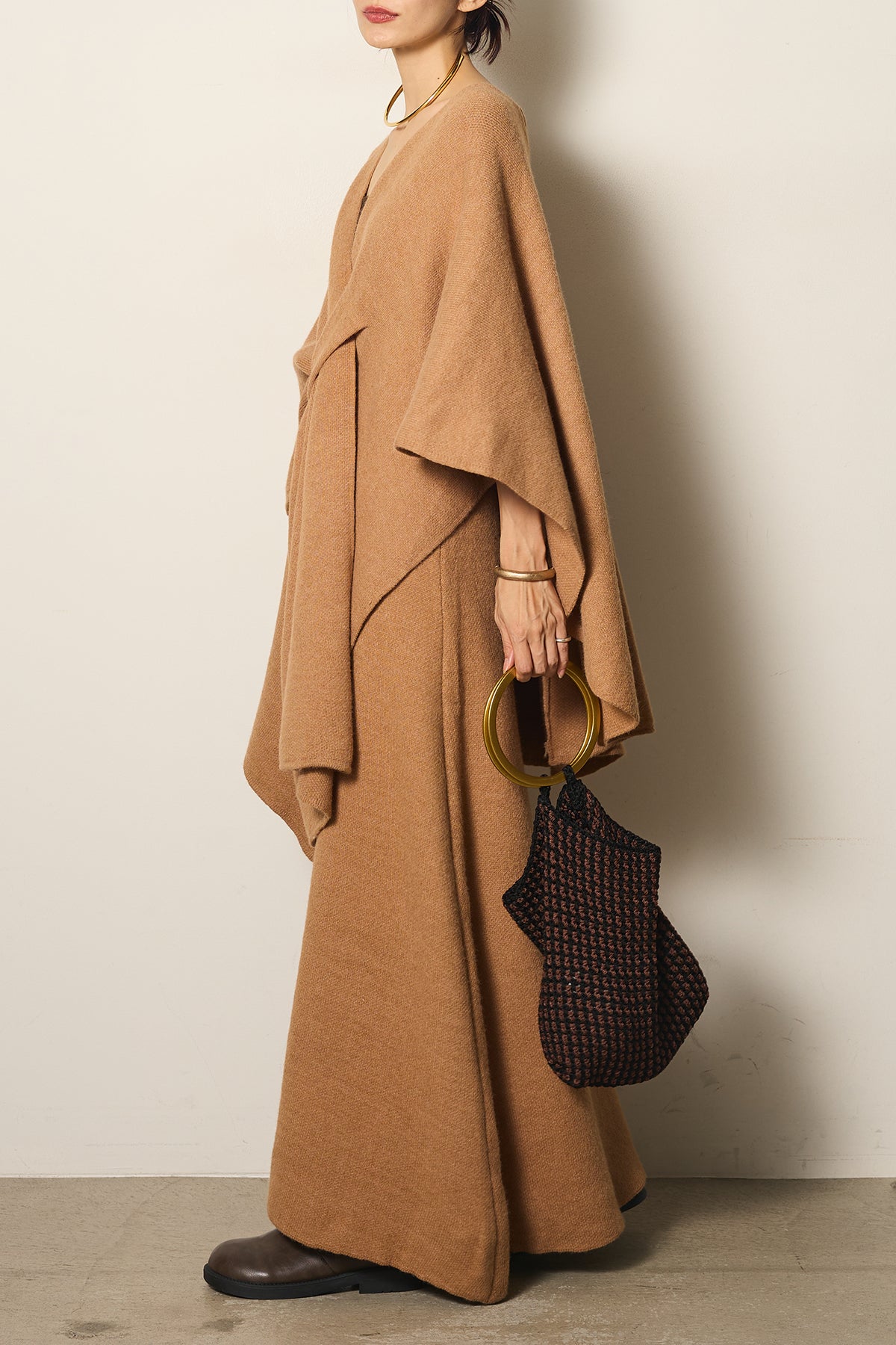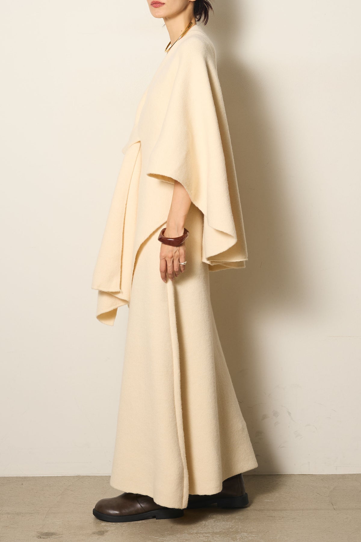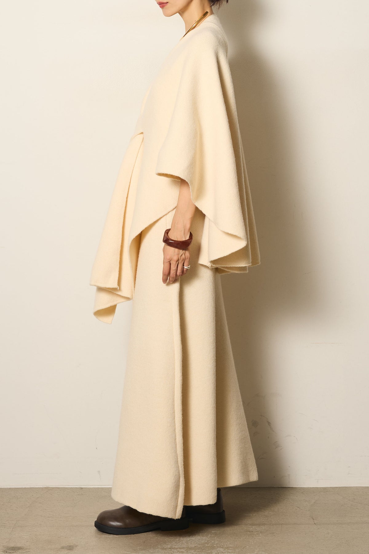 立体的なツイストデザインが目を惹くポンチョニットセットアップ。柔らかく軽やかなニット素材で仕立てられ、リラックス感がありながらも上品なシルエットを演出します。ポンチョのゆったり感とスカートの縦ラインがバランスよく、1枚でこなれた印象に。季節の変わり目に活躍する、大人の抜け感スタイルを叶えるアイテムです。