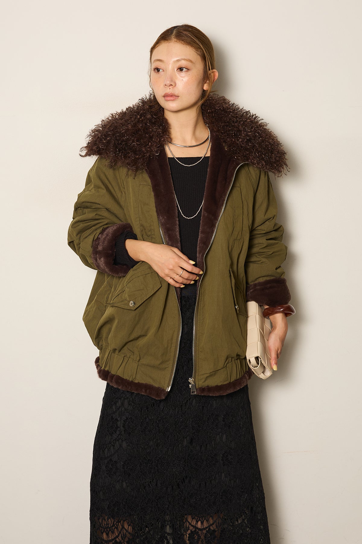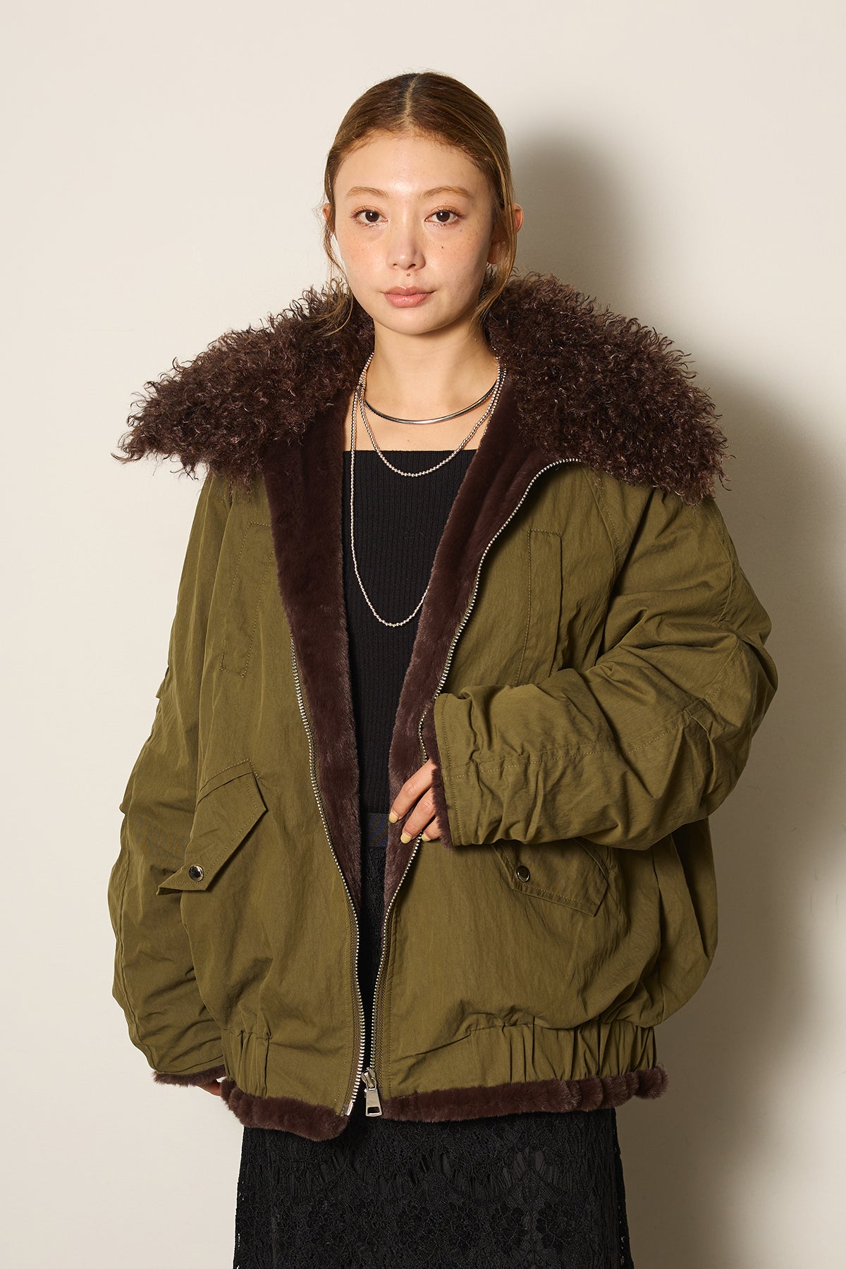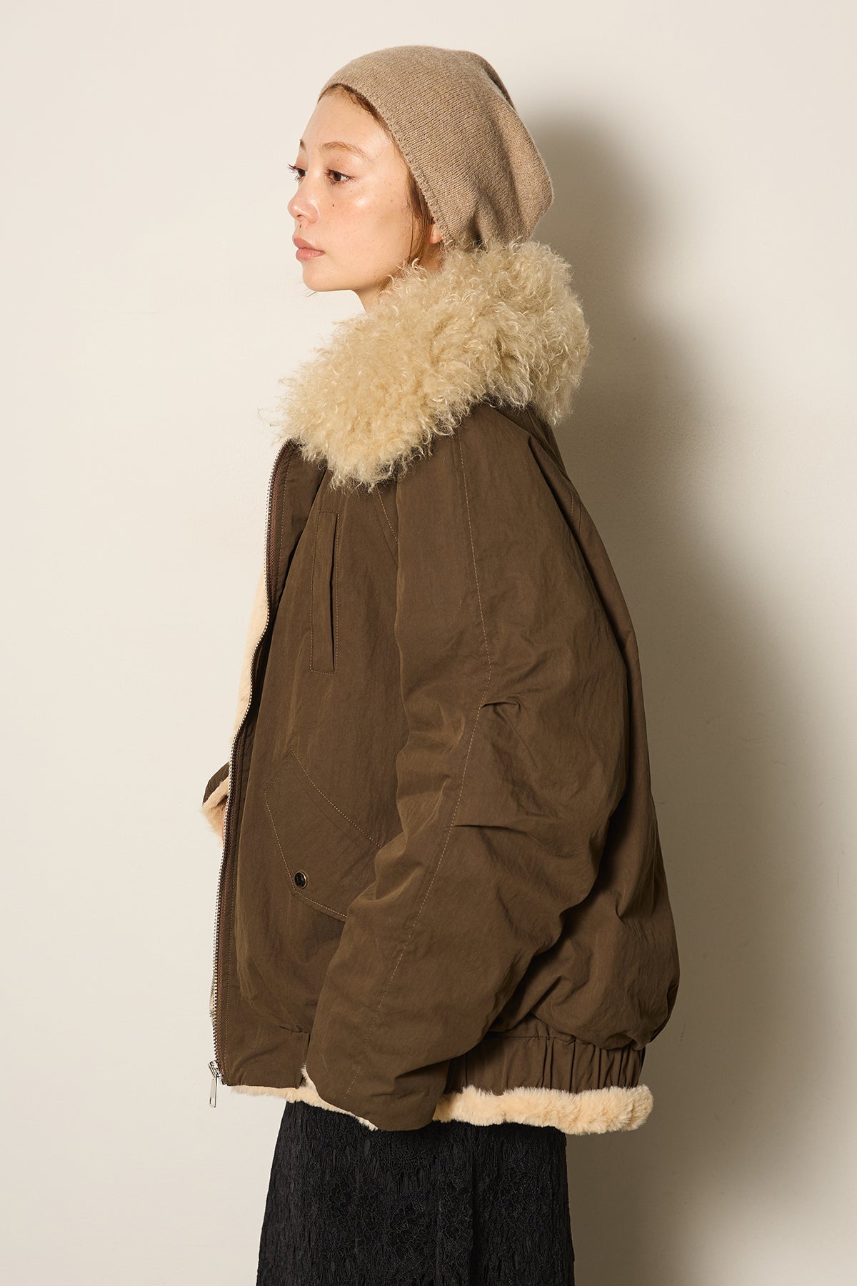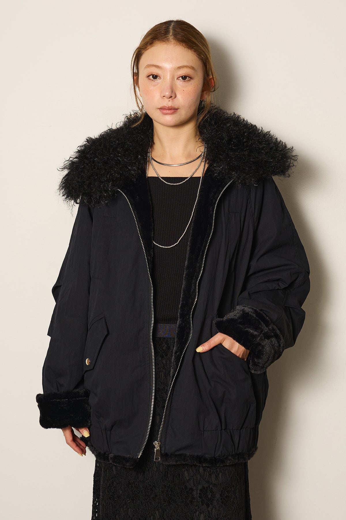 存在感のあるボア襟が目を引くジップポケットブルゾン。程よいボリューム感とドロップショルダーで抜け感をプラスし、羽織るだけでトレンドライクな印象に。内側はふんわりとした裏地仕様で暖かく、実用性とデザイン性を兼ね備えています。パンツにもスカートにも合わせやすく、冬のメインアウターとして活躍するアイテムです。
