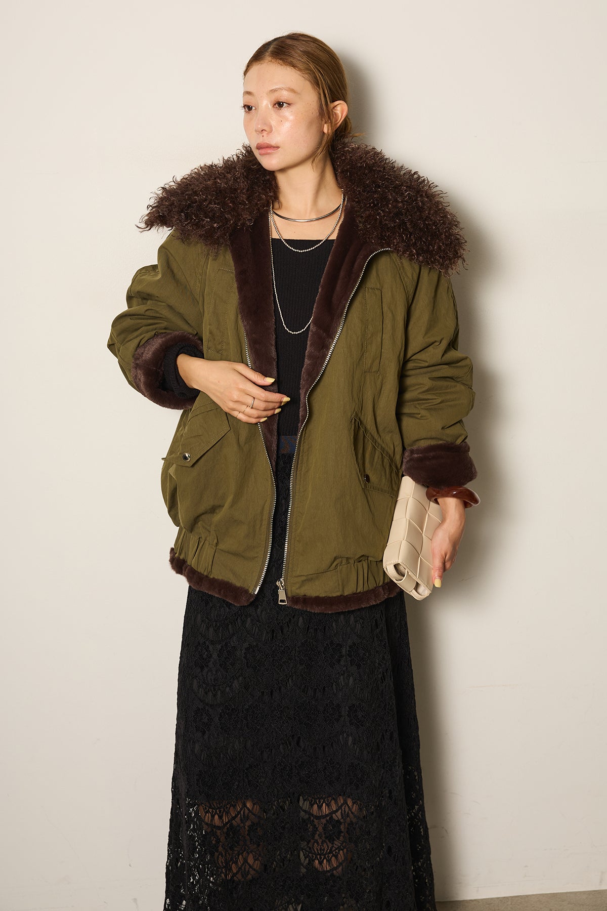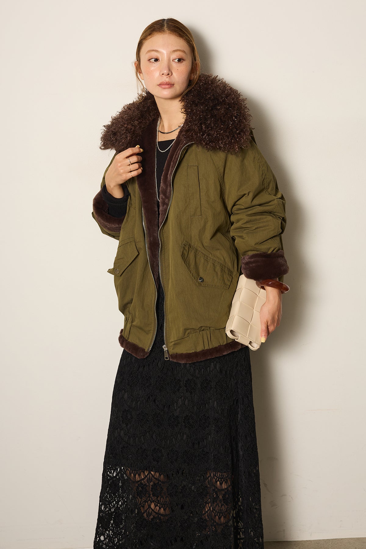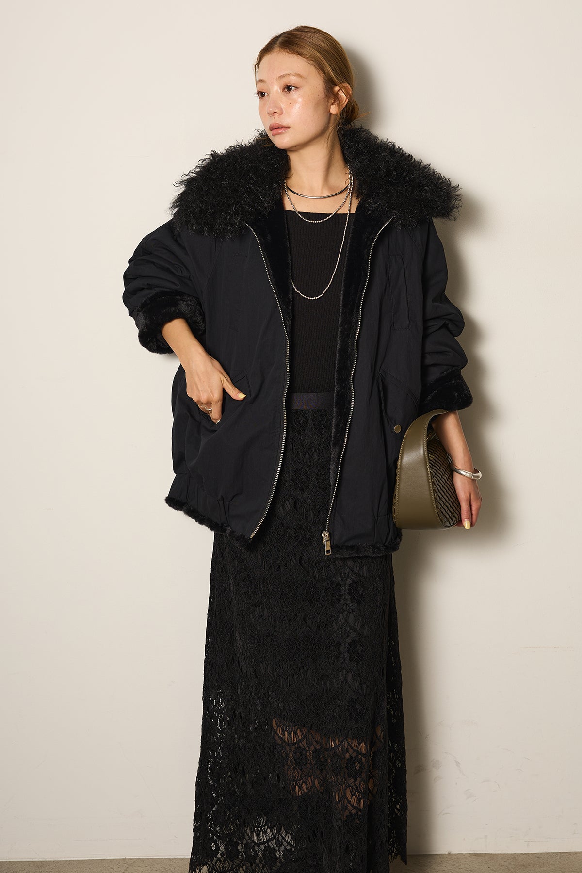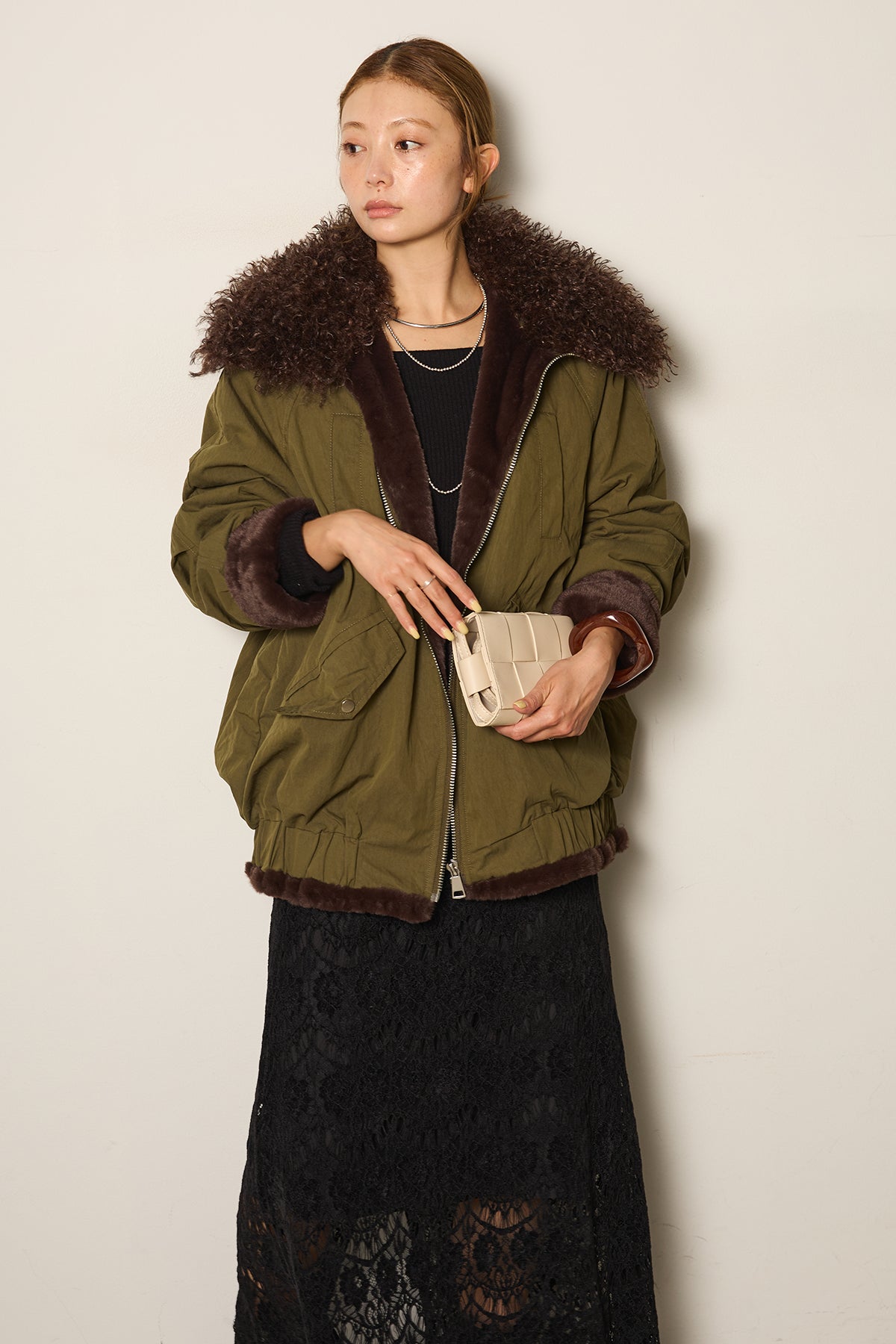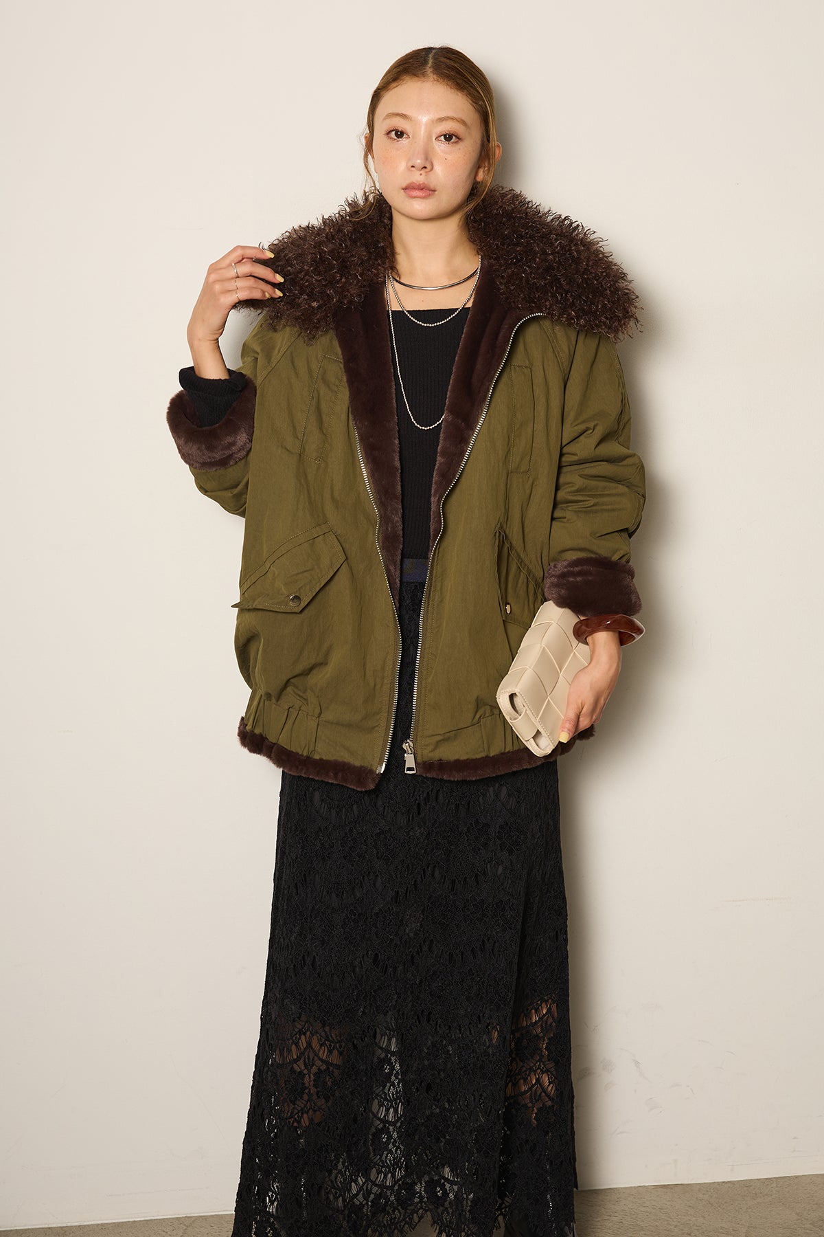 存在感のあるボア襟が目を引くジップポケットブルゾン。程よいボリューム感とドロップショルダーで抜け感をプラスし、羽織るだけでトレンドライクな印象に。内側はふんわりとした裏地仕様で暖かく、実用性とデザイン性を兼ね備えています。パンツにもスカートにも合わせやすく、冬のメインアウターとして活躍するアイテムです。