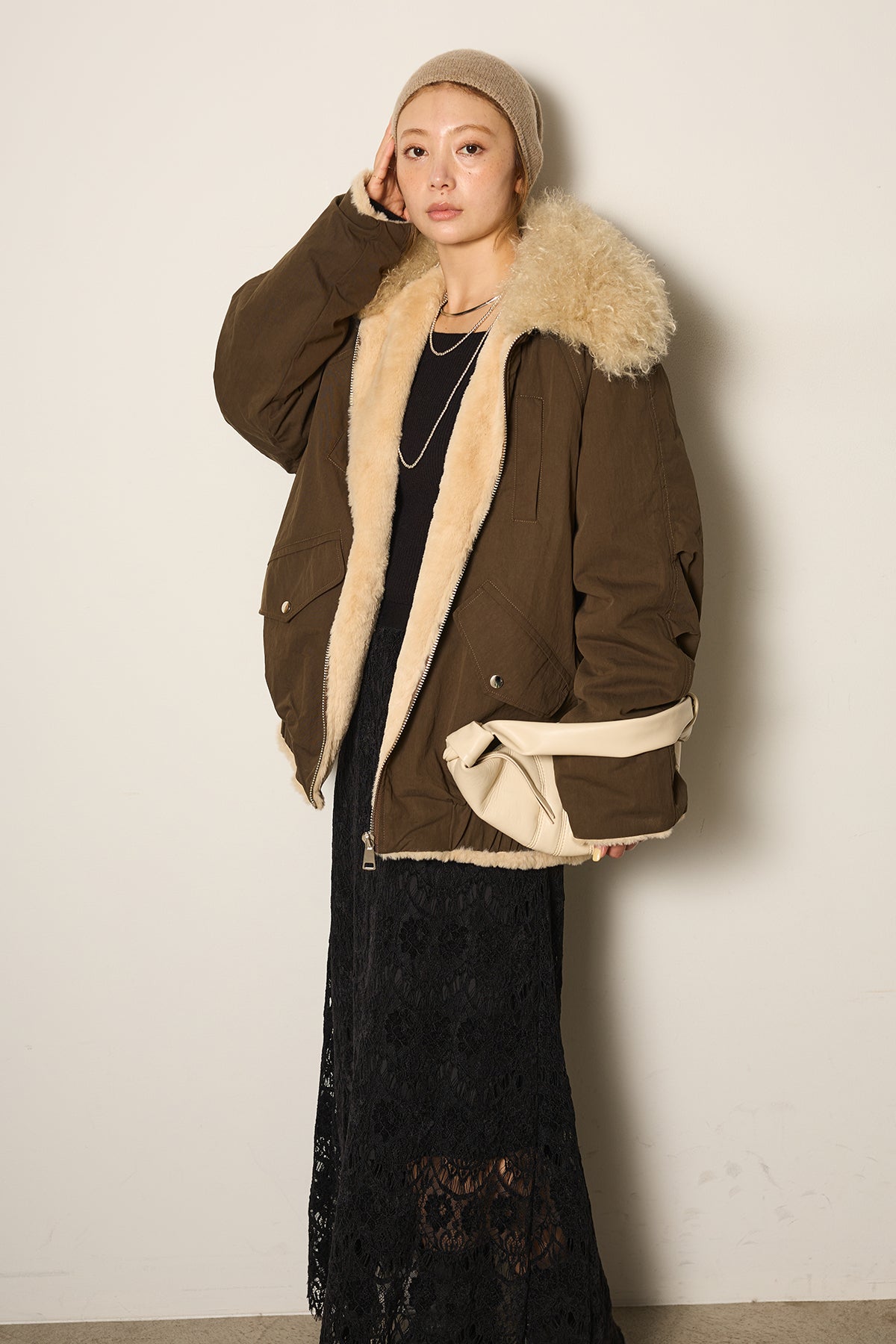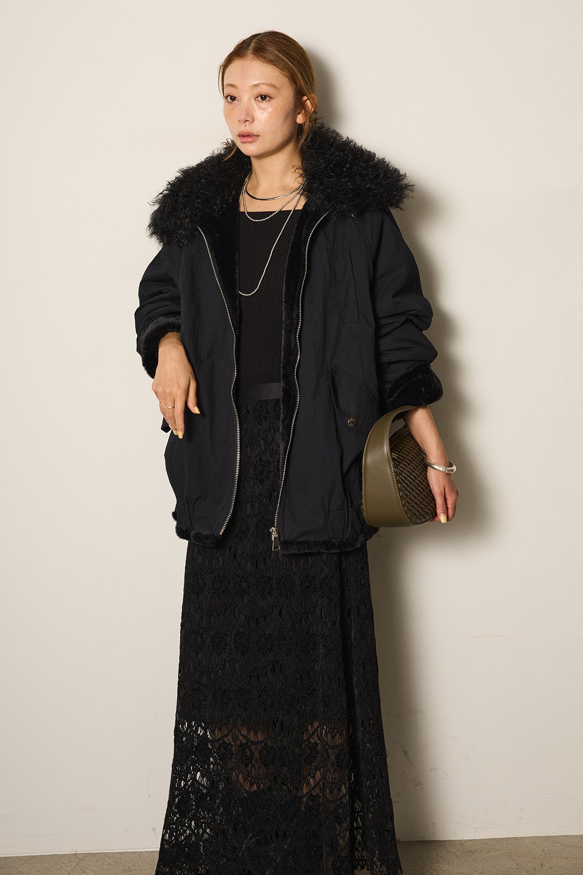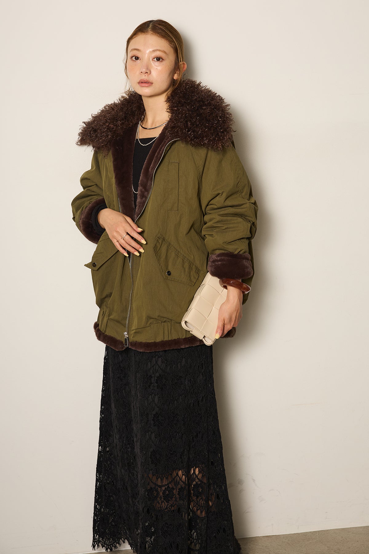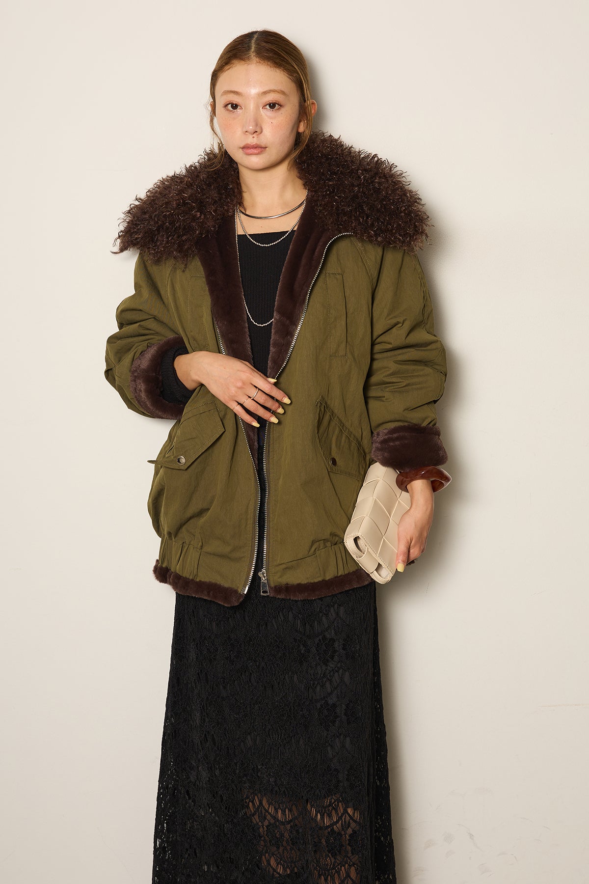 存在感のあるボア襟が目を引くジップポケットブルゾン。程よいボリューム感とドロップショルダーで抜け感をプラスし、羽織るだけでトレンドライクな印象に。内側はふんわりとした裏地仕様で暖かく、実用性とデザイン性を兼ね備えています。パンツにもスカートにも合わせやすく、冬のメインアウターとして活躍するアイテムです。