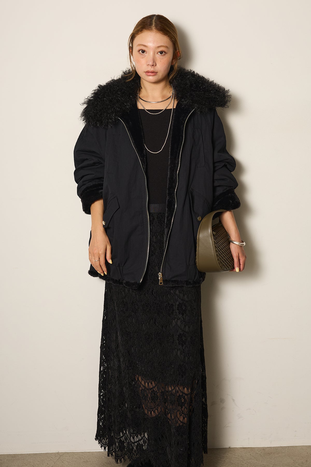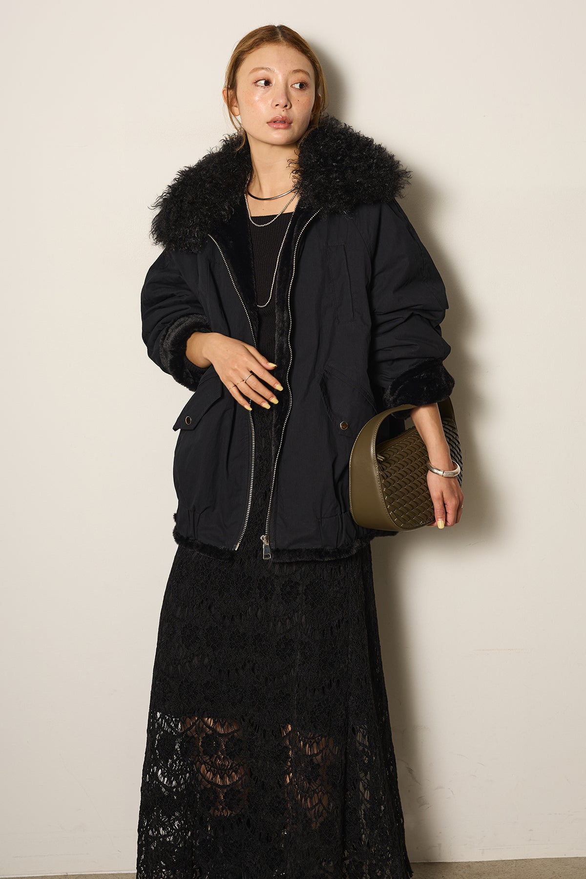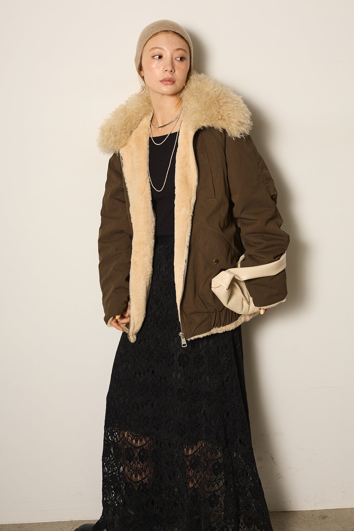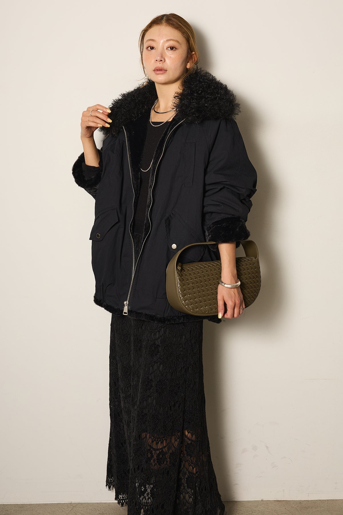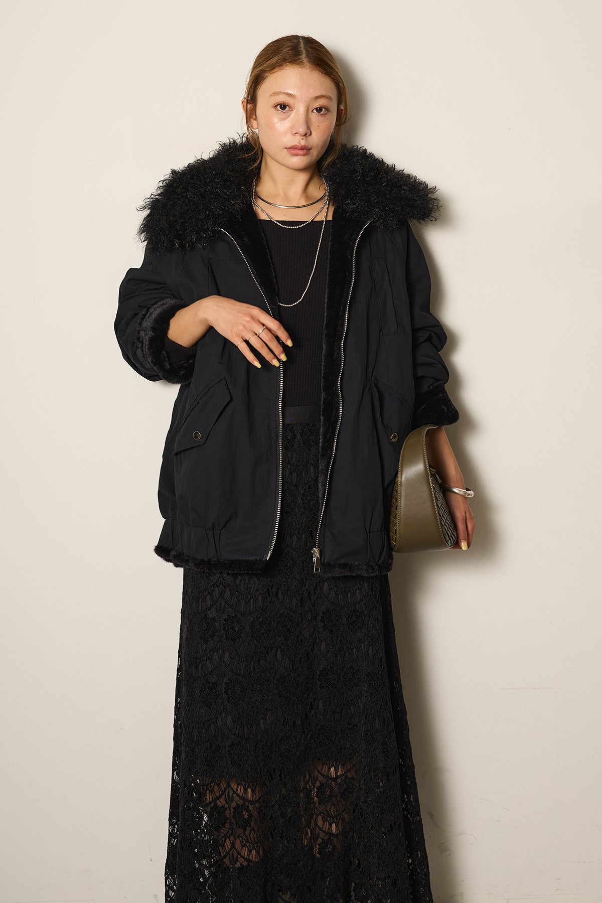 存在感のあるボア襟が目を引くジップポケットブルゾン。程よいボリューム感とドロップショルダーで抜け感をプラスし、羽織るだけでトレンドライクな印象に。内側はふんわりとした裏地仕様で暖かく、実用性とデザイン性を兼ね備えています。パンツにもスカートにも合わせやすく、冬のメインアウターとして活躍するアイテムです。