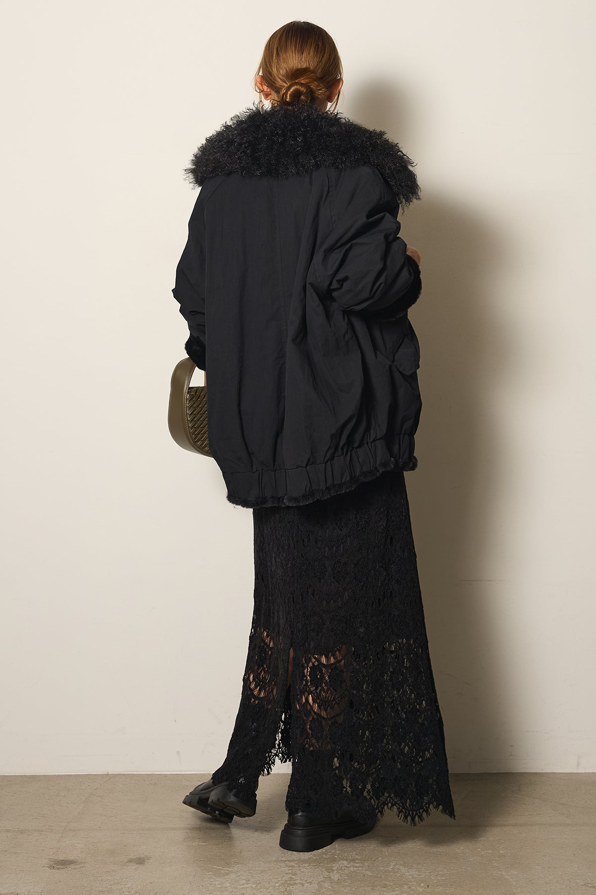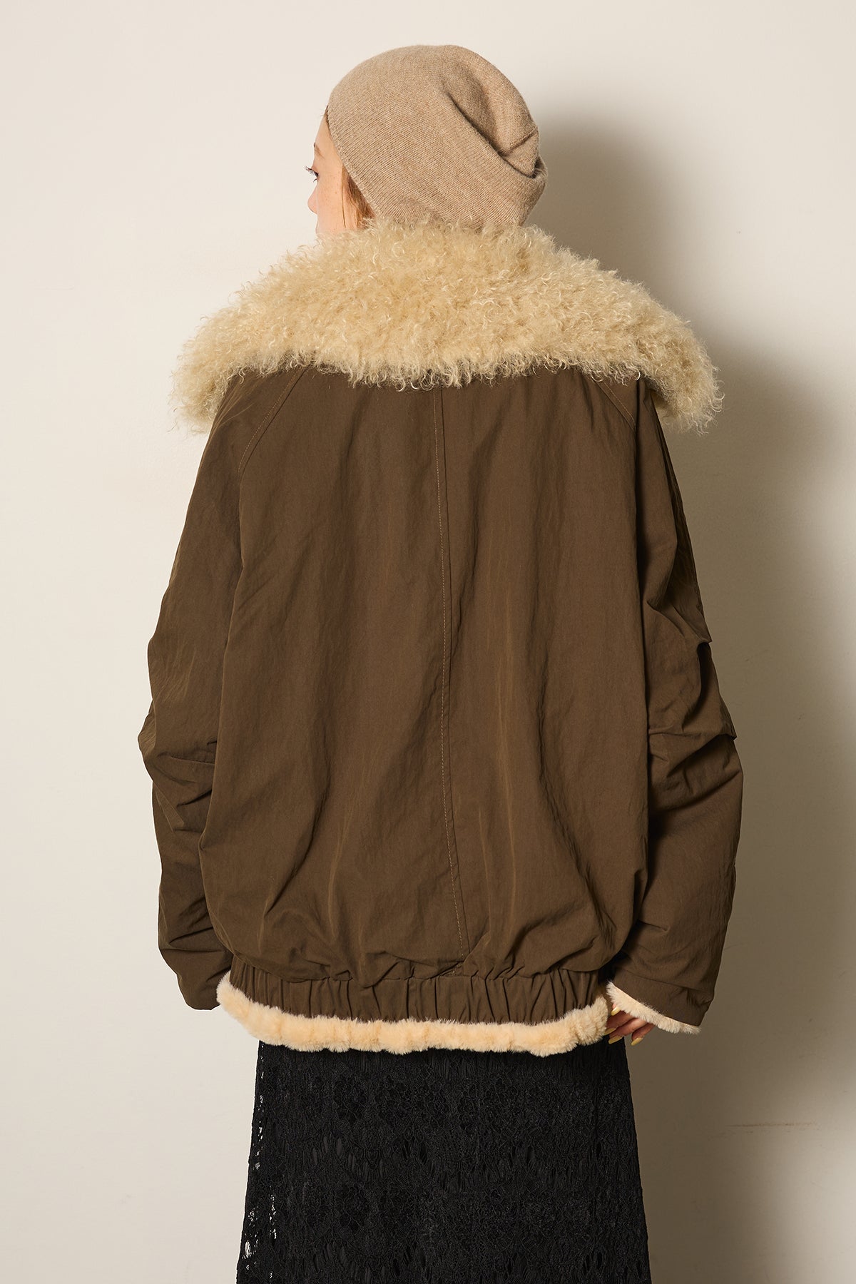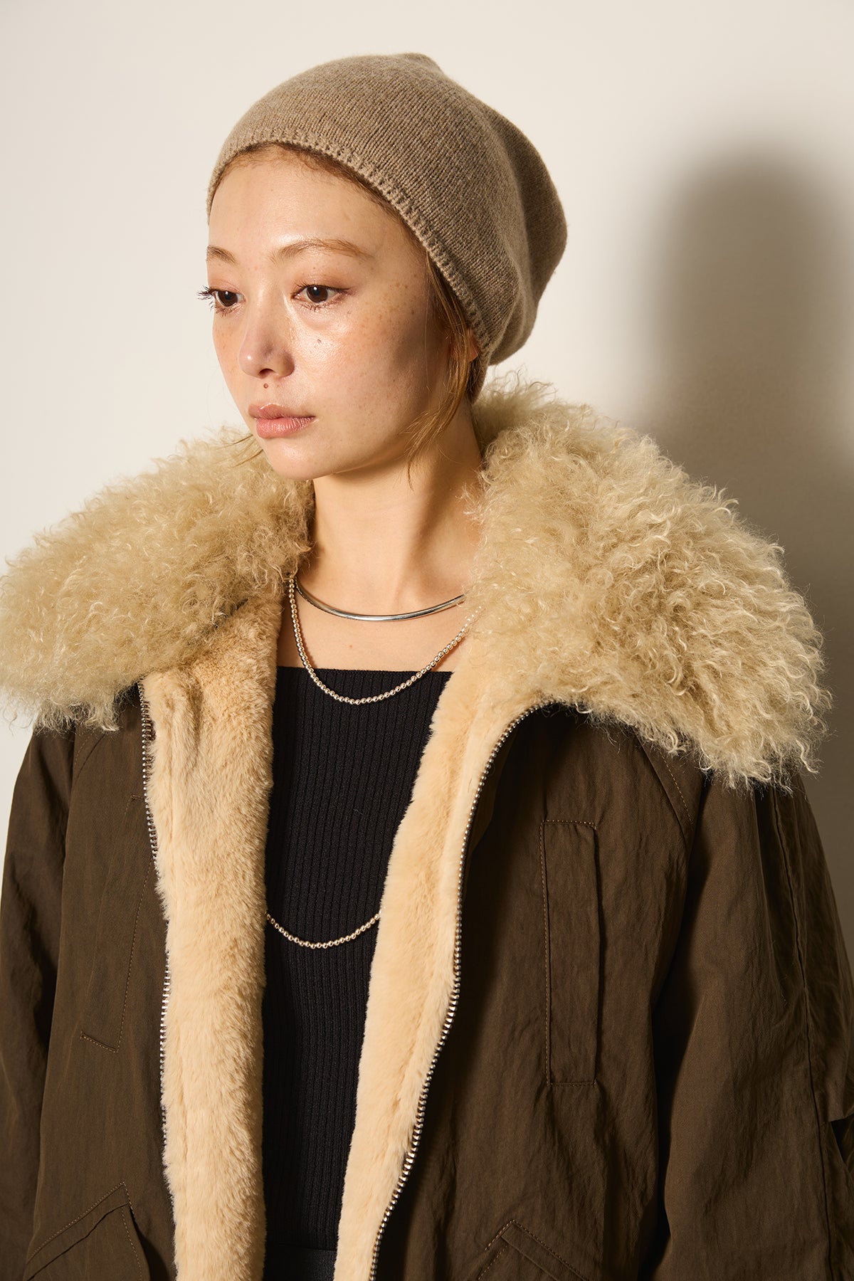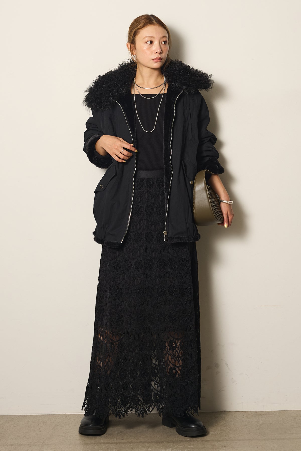 存在感のあるボア襟が目を引くジップポケットブルゾン。程よいボリューム感とドロップショルダーで抜け感をプラスし、羽織るだけでトレンドライクな印象に。内側はふんわりとした裏地仕様で暖かく、実用性とデザイン性を兼ね備えています。パンツにもスカートにも合わせやすく、冬のメインアウターとして活躍するアイテムです。