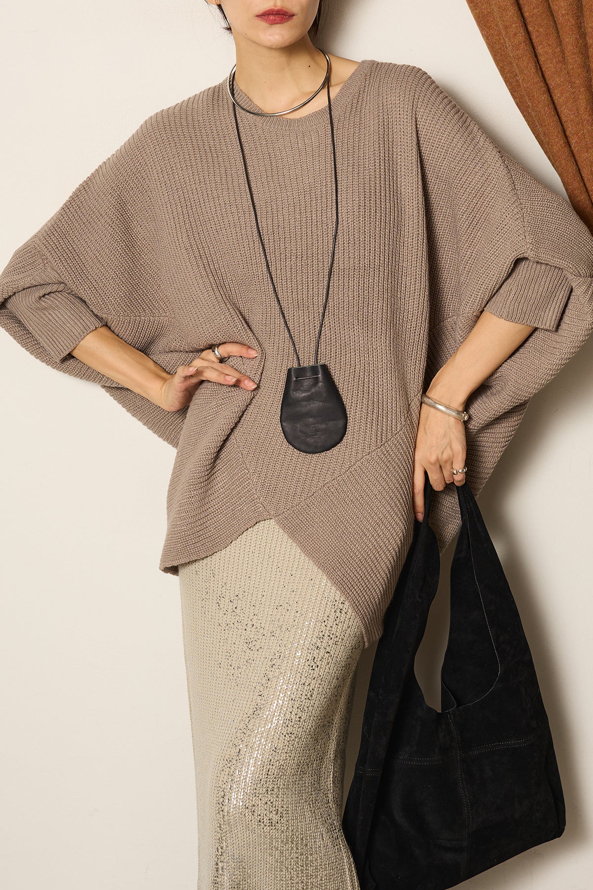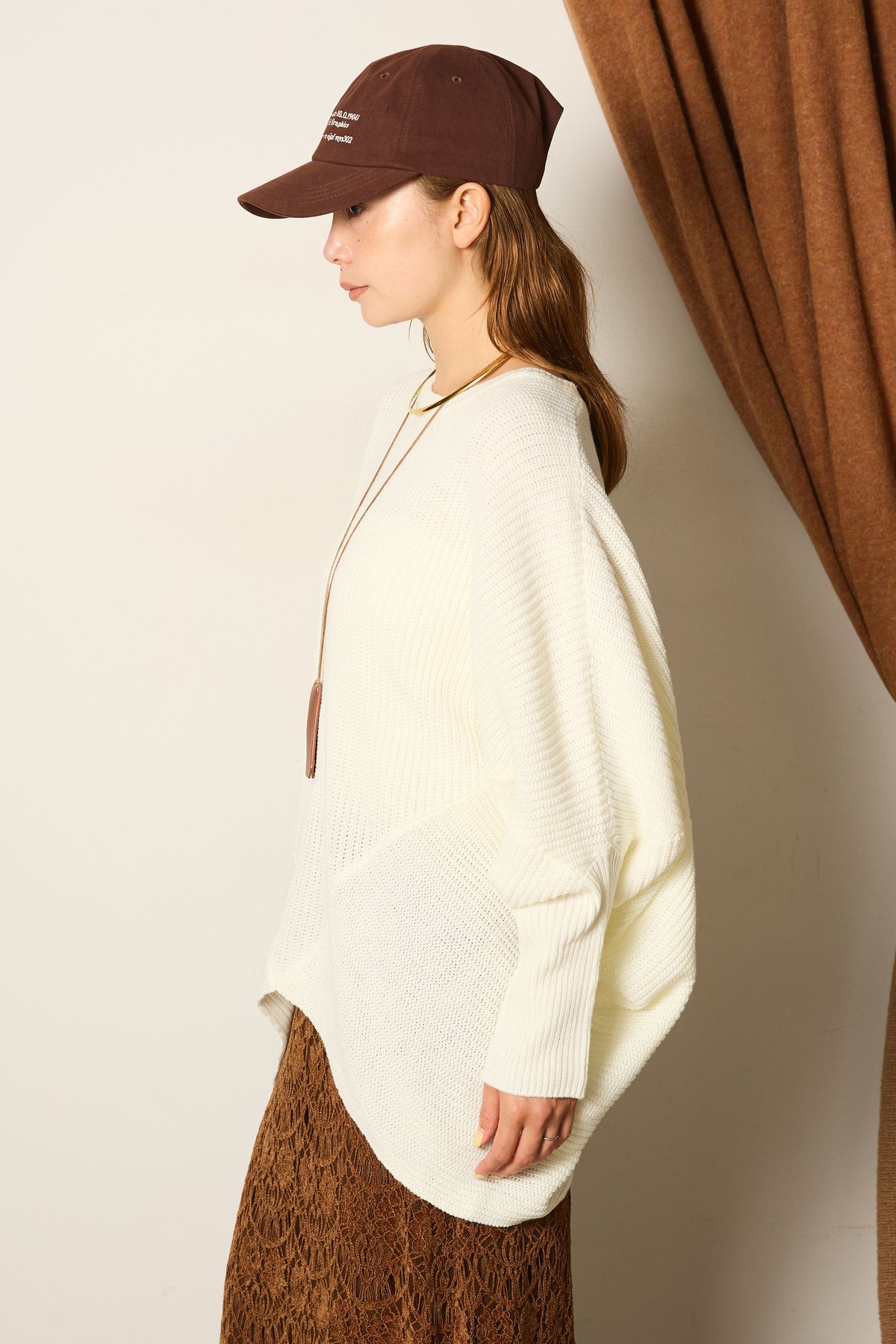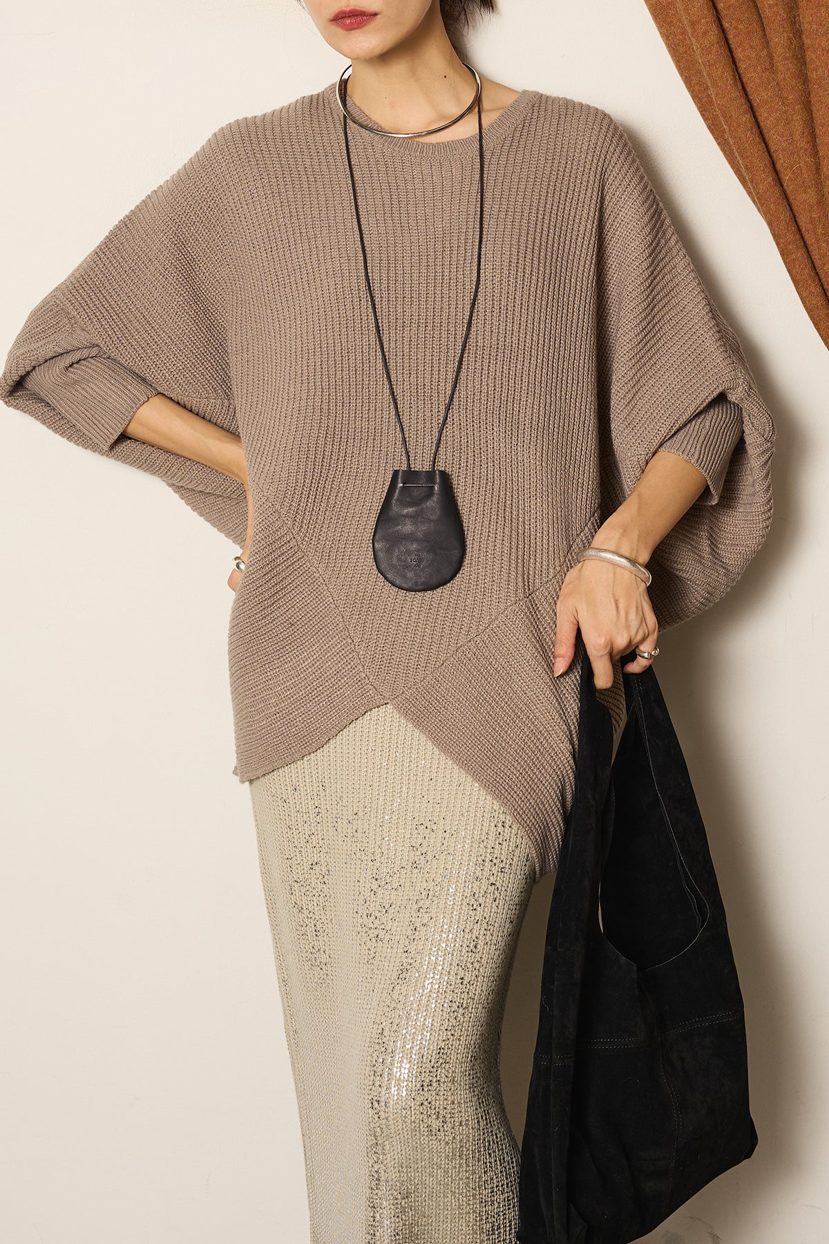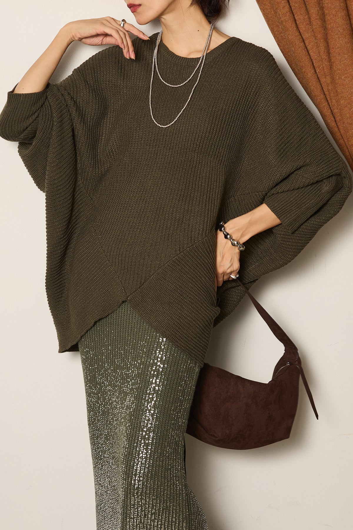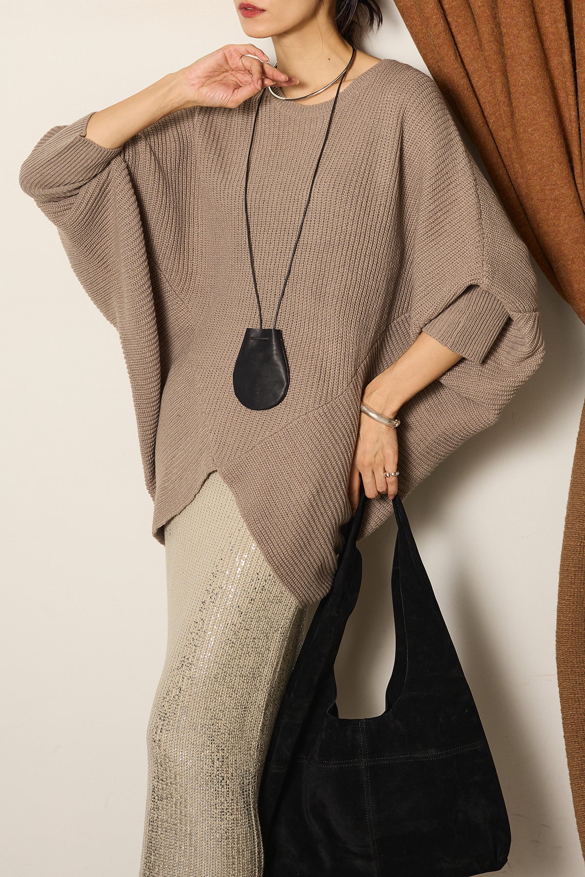 ゆるやかなドレープ感が魅力のドルマンニットプルオーバー。柔らかなニット素材が身体を包み込み、自然な落ち感でこなれた印象を演出します。裾のアシンメトリーデザインが動きを添え、シンプルながらもスタイリングに表情をプラス。カジュアルにもきれいめにも合わせやすく、デイリーに活躍する万能アイテムです。