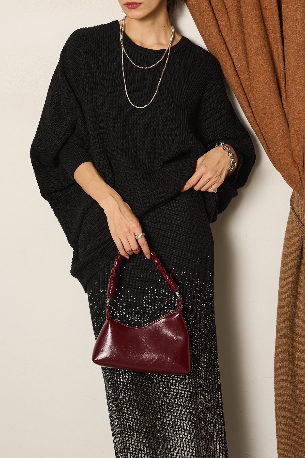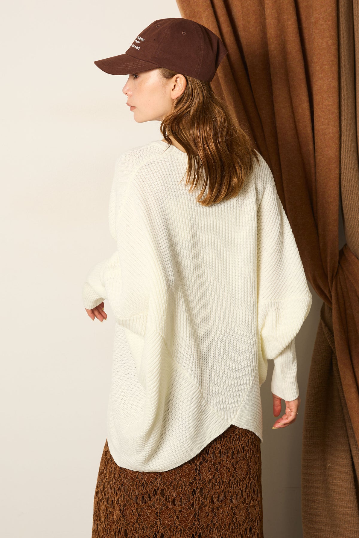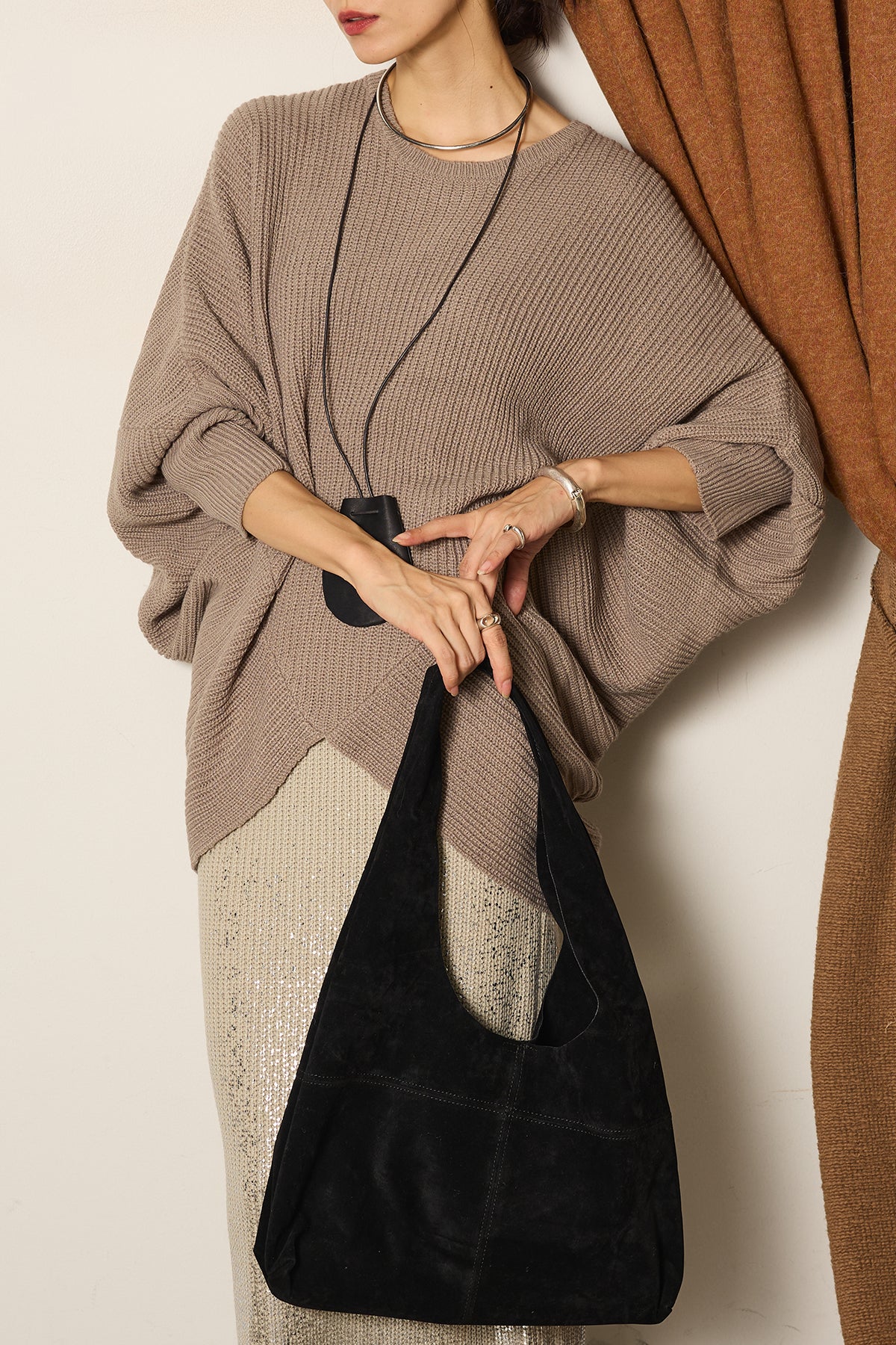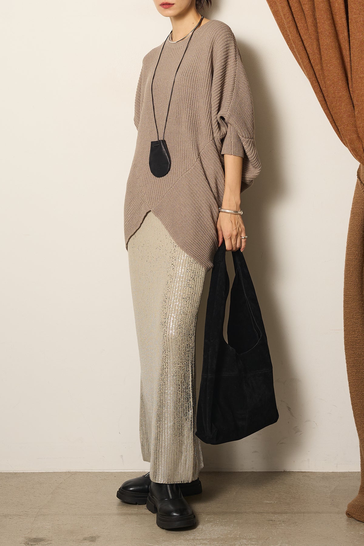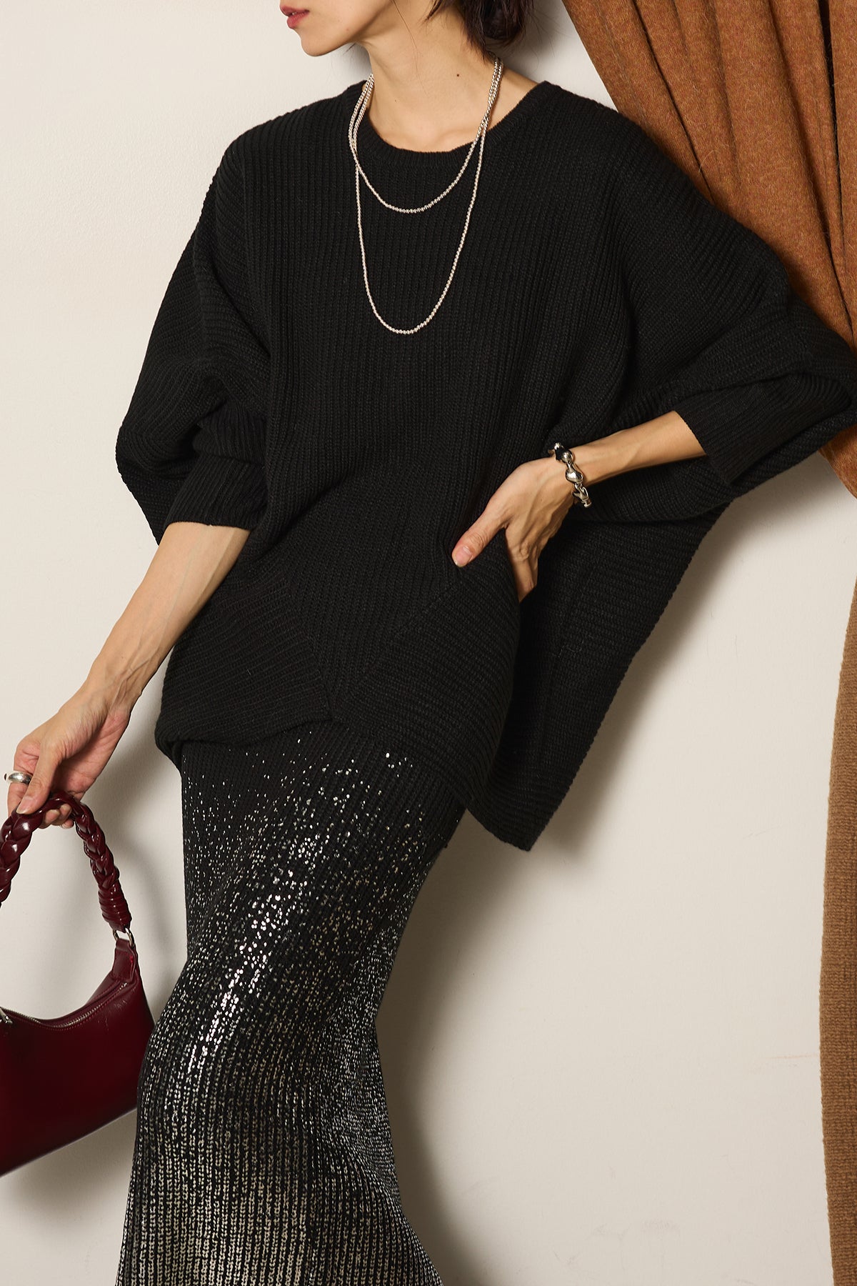 ゆるやかなドレープ感が魅力のドルマンニットプルオーバー。柔らかなニット素材が身体を包み込み、自然な落ち感でこなれた印象を演出します。裾のアシンメトリーデザインが動きを添え、シンプルながらもスタイリングに表情をプラス。カジュアルにもきれいめにも合わせやすく、デイリーに活躍する万能アイテムです。