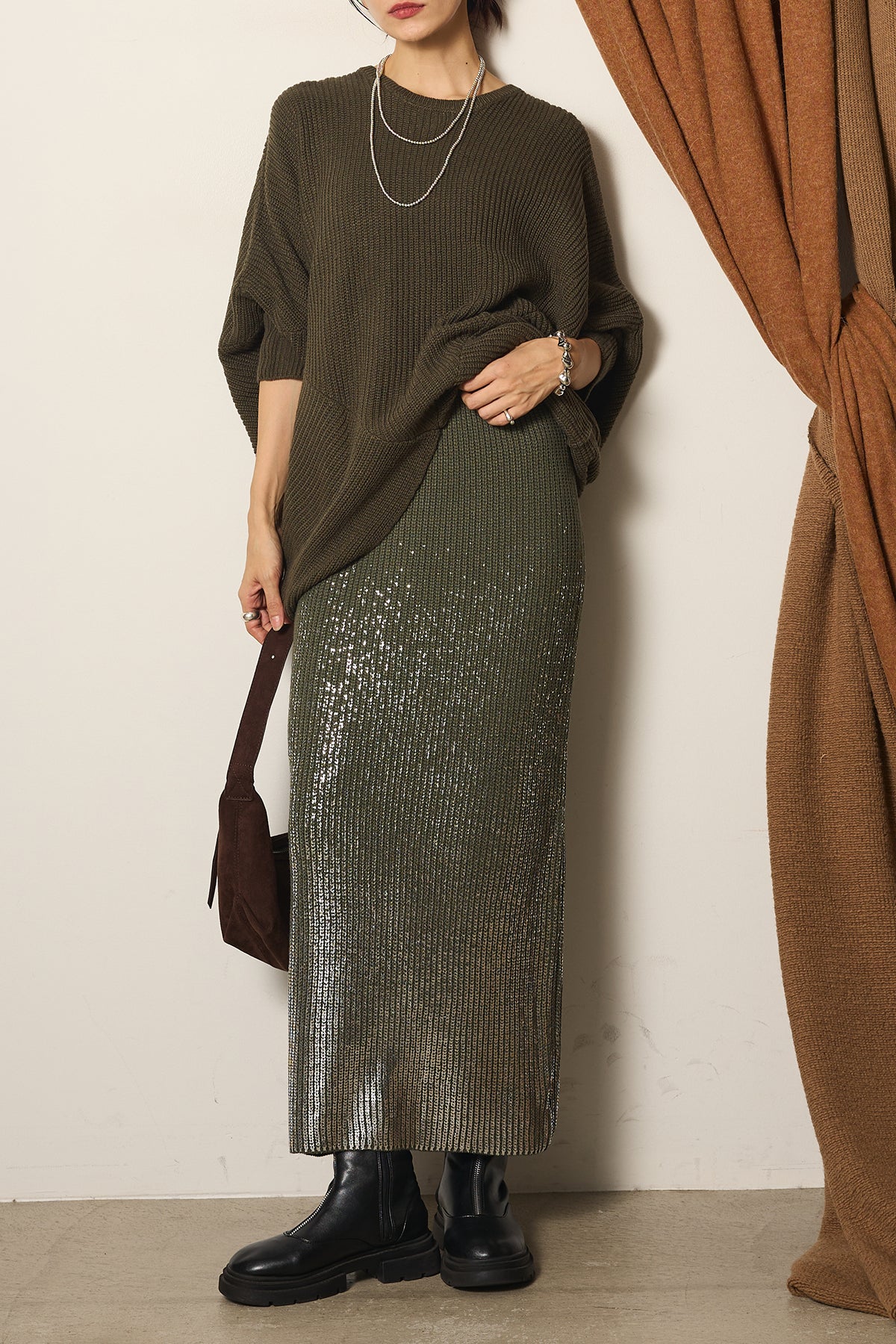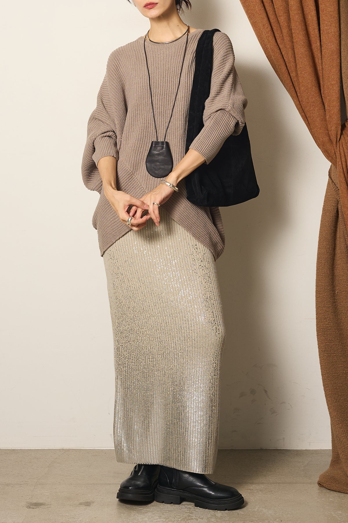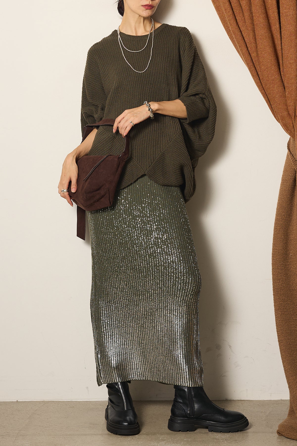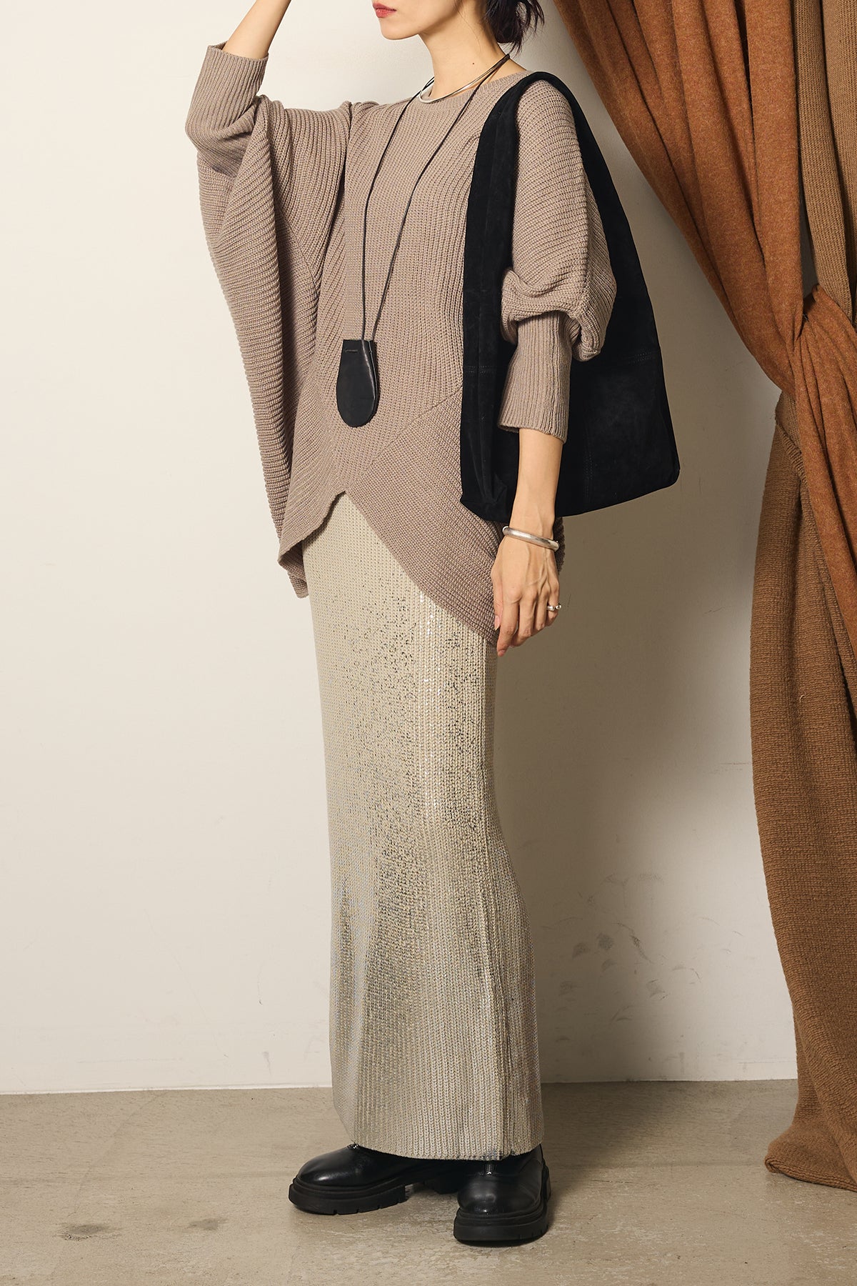 繊細な箔加工が上品にきらめくニットタイトスカート。ほどよいフィット感のシルエットが女性らしいラインを引き立て、縦リブ編みがスタイルアップ効果をプラスします。伸縮性のある素材で着心地も良く、シンプルなトップスと合わせるだけで洗練された印象に。華やかさと落ち着きを兼ね備えた、大人のための一枚です。