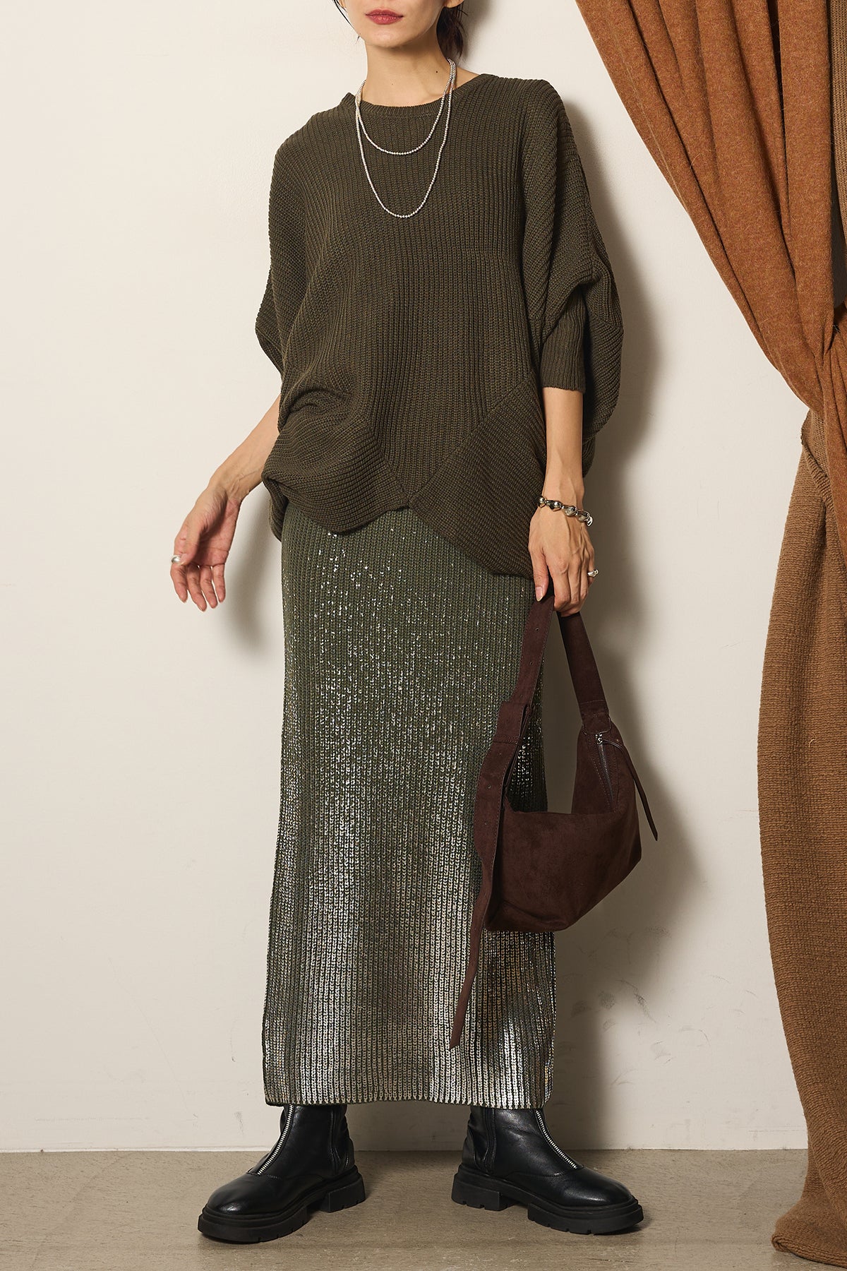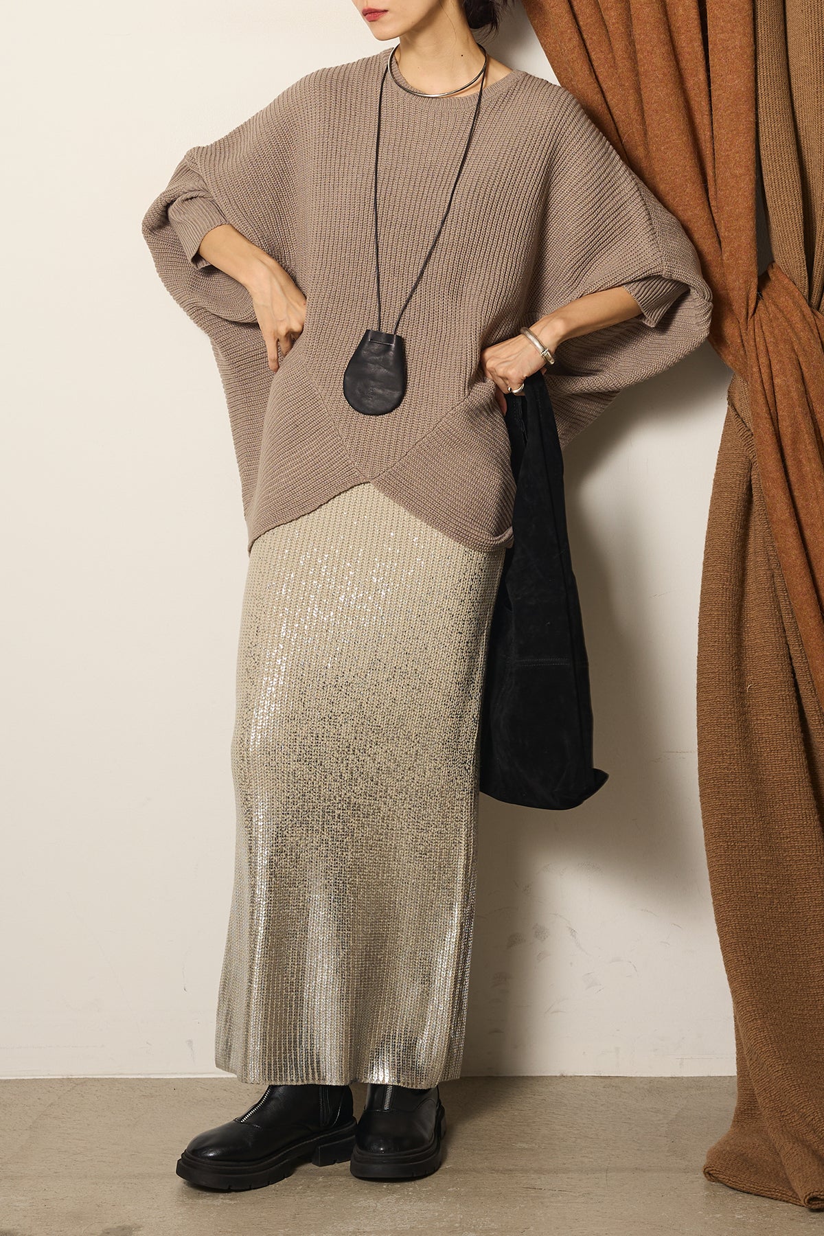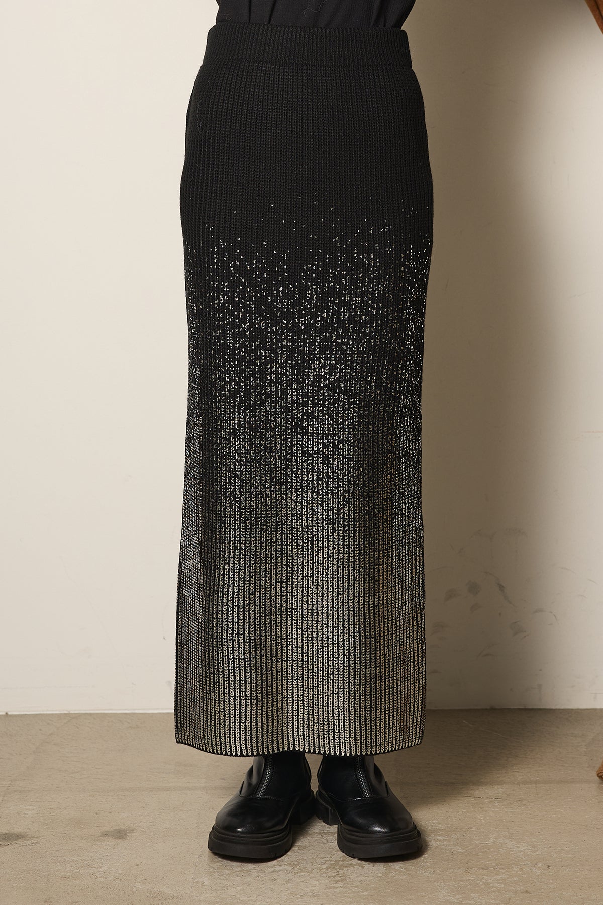 繊細な箔加工が上品にきらめくニットタイトスカート。ほどよいフィット感のシルエットが女性らしいラインを引き立て、縦リブ編みがスタイルアップ効果をプラスします。伸縮性のある素材で着心地も良く、シンプルなトップスと合わせるだけで洗練された印象に。華やかさと落ち着きを兼ね備えた、大人のための一枚です。