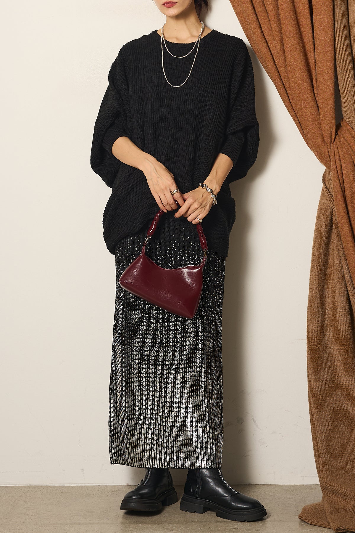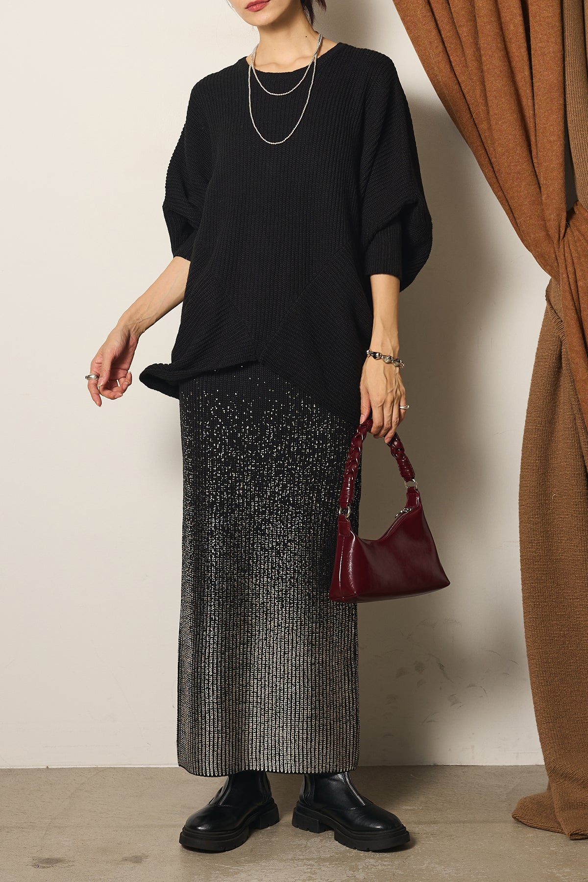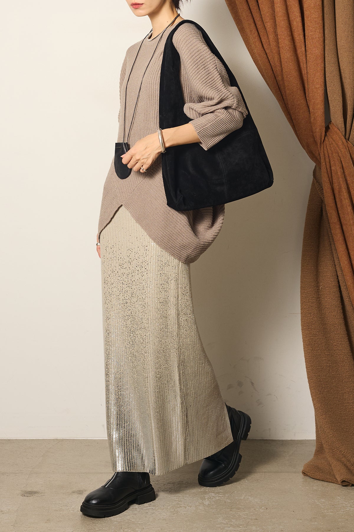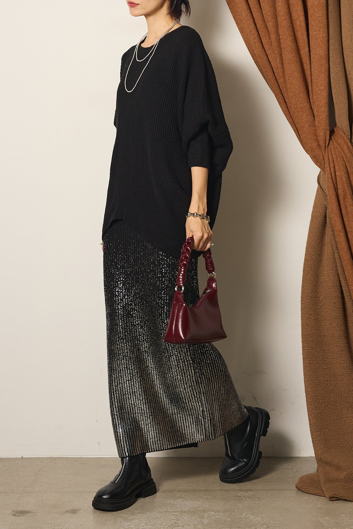繊細な箔加工が上品にきらめくニットタイトスカート。ほどよいフィット感のシルエットが女性らしいラインを引き立て、縦リブ編みがスタイルアップ効果をプラスします。伸縮性のある素材で着心地も良く、シンプルなトップスと合わせるだけで洗練された印象に。華やかさと落ち着きを兼ね備えた、大人のための一枚です。