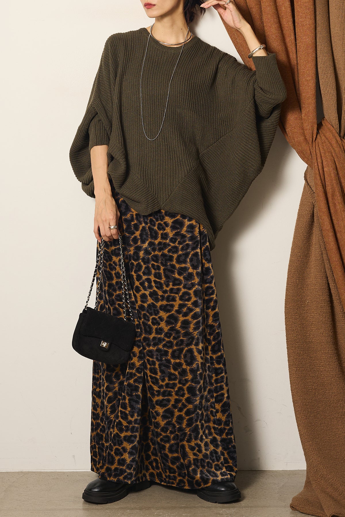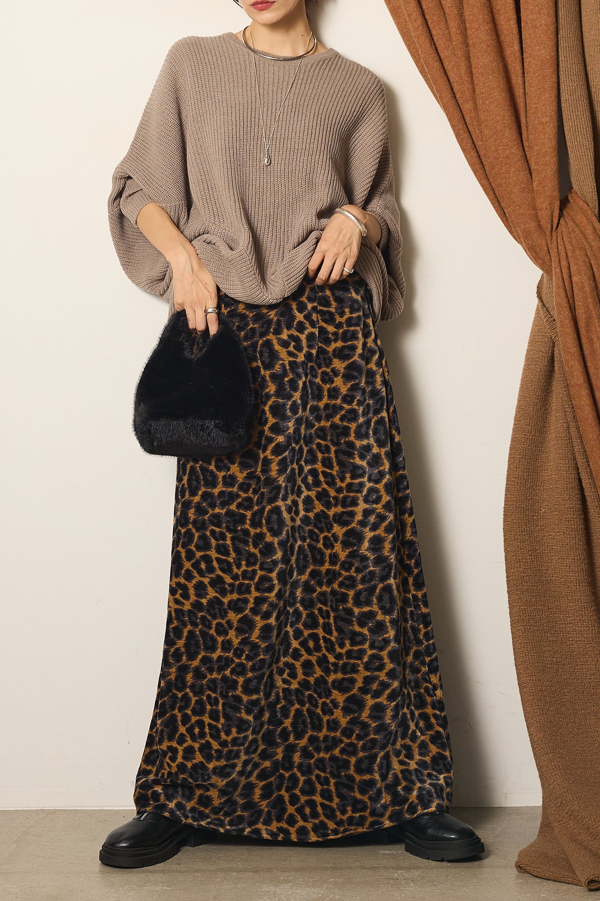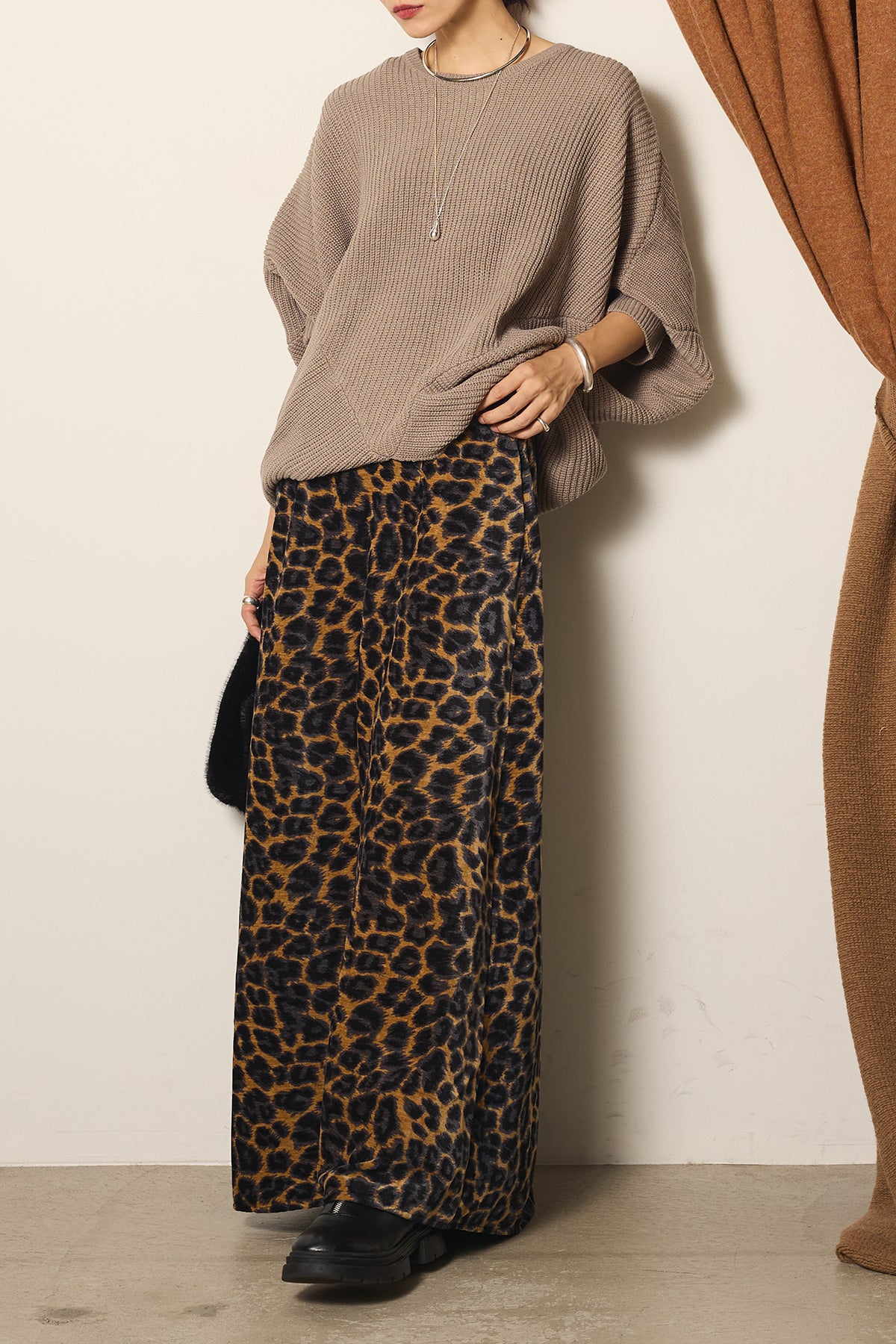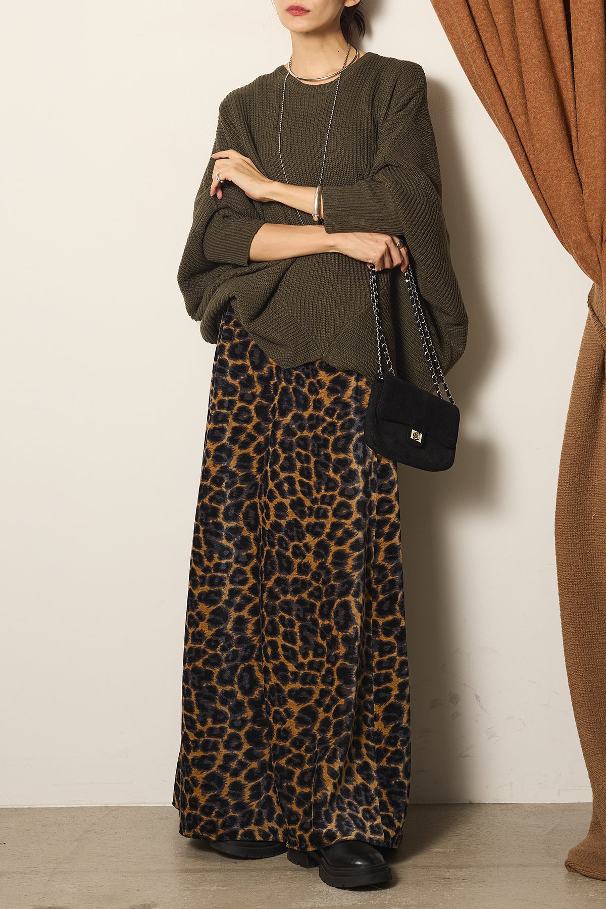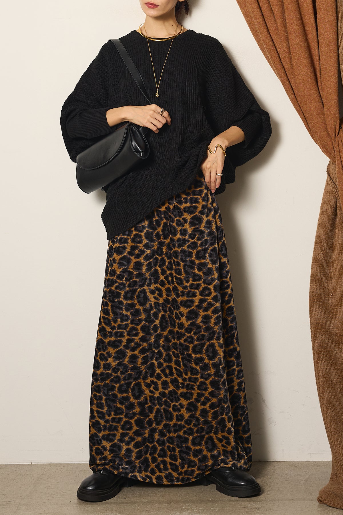 大胆なレオパード柄が目を引くワイドスカート。落ち感のあるシルエットが動くたびに美しいラインを描き、コーディネートにモードな存在感をプラスします。シンプルなトップスと合わせるだけでスタイルが決まり、デイリーから特別なシーンまで幅広く活躍する一枚です。
