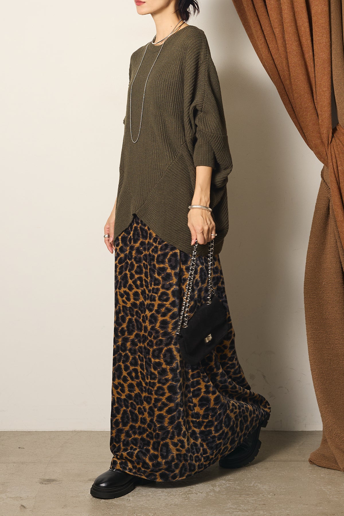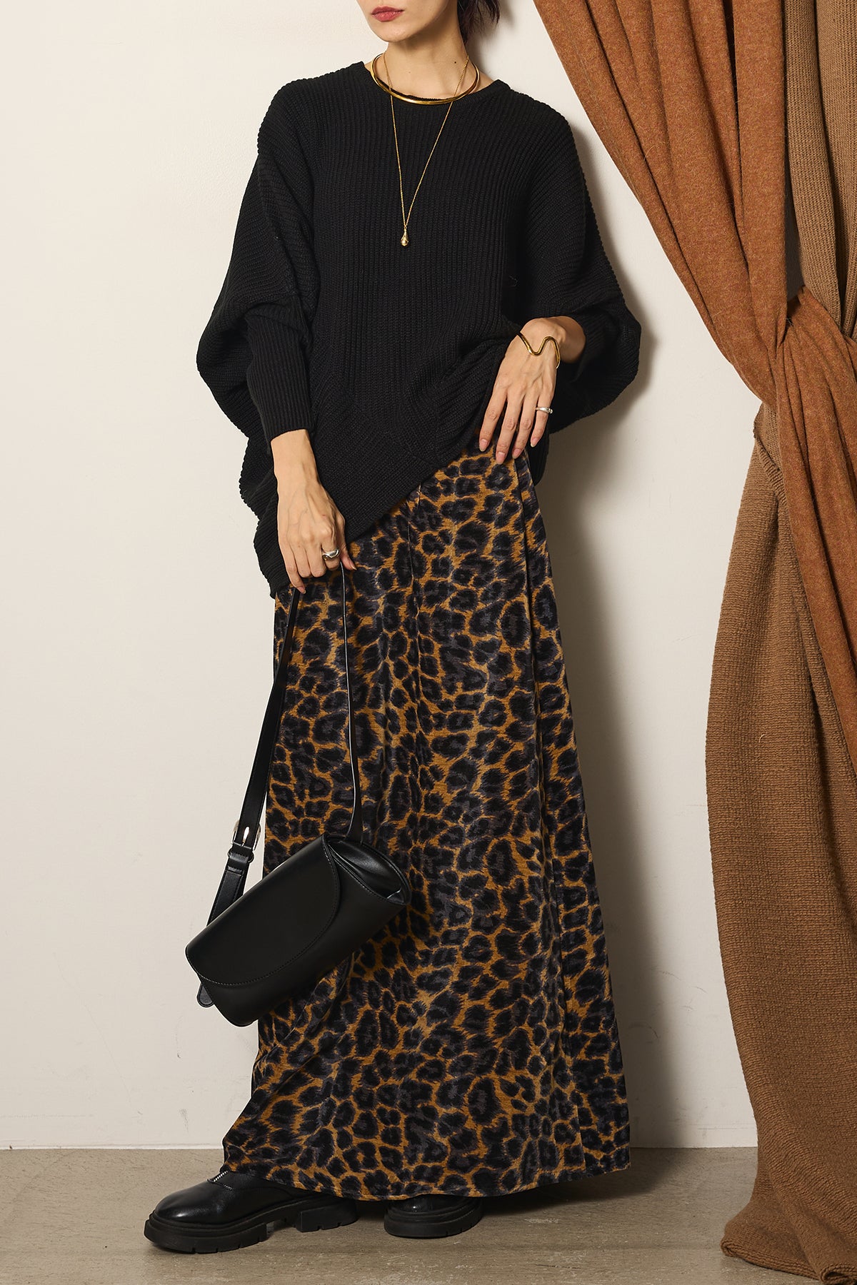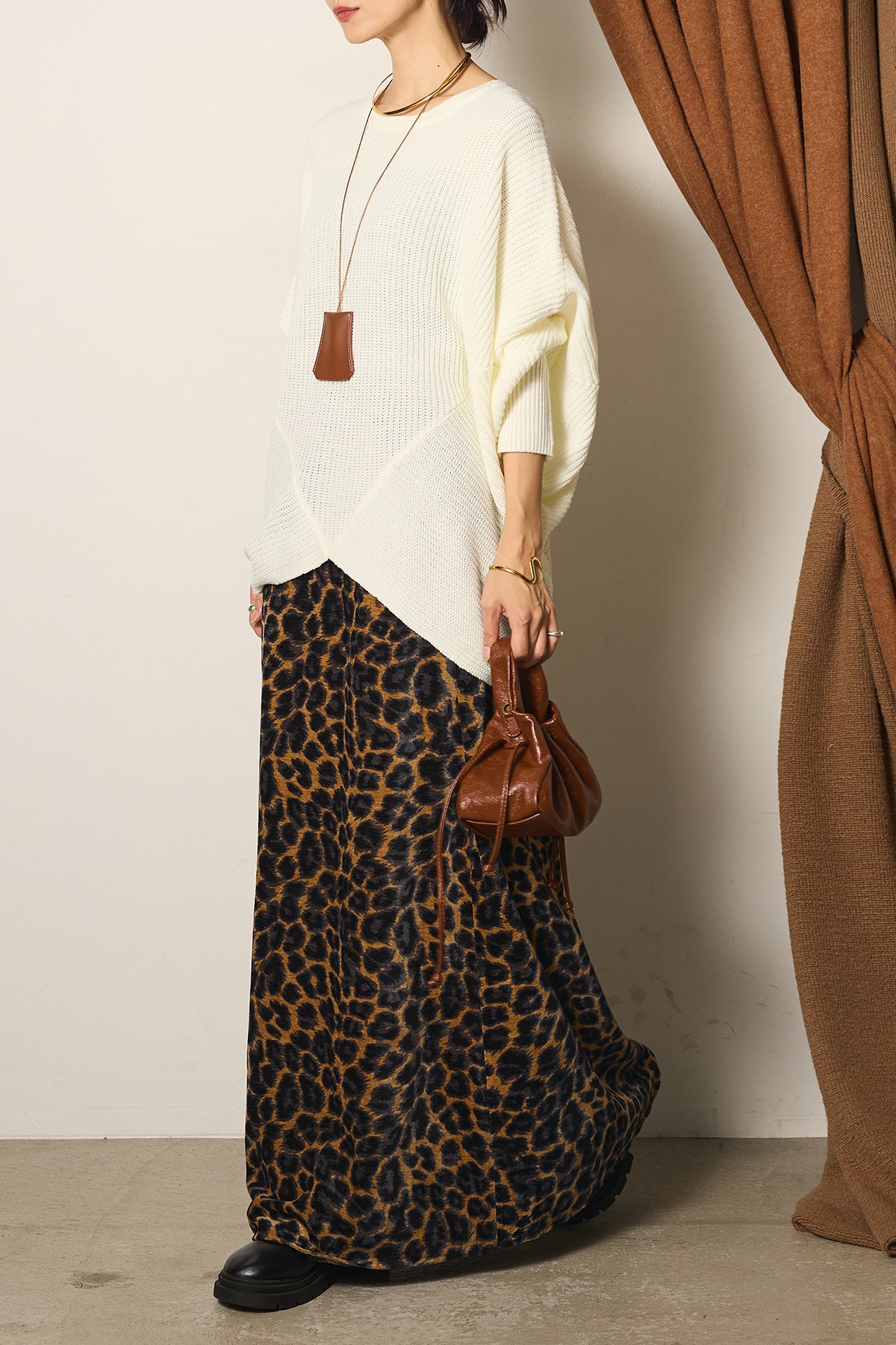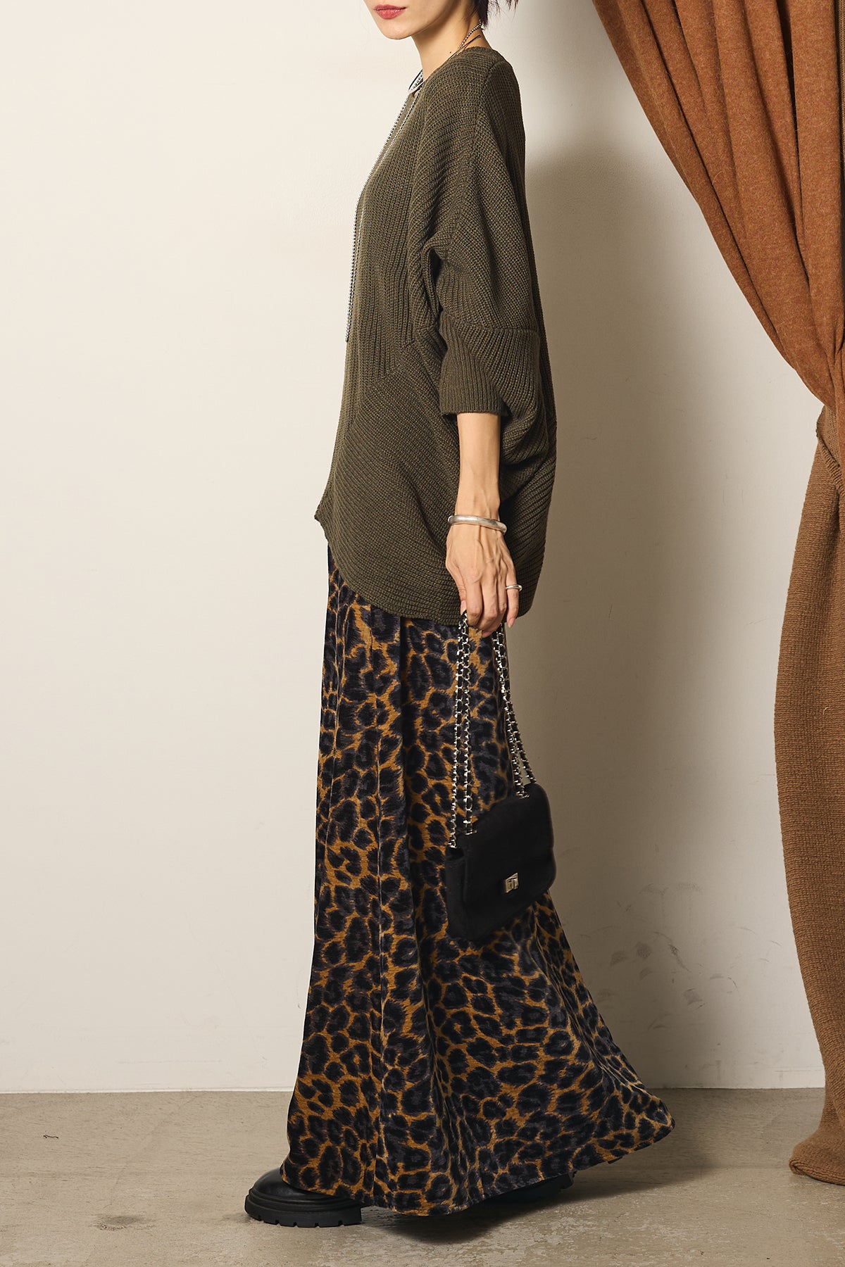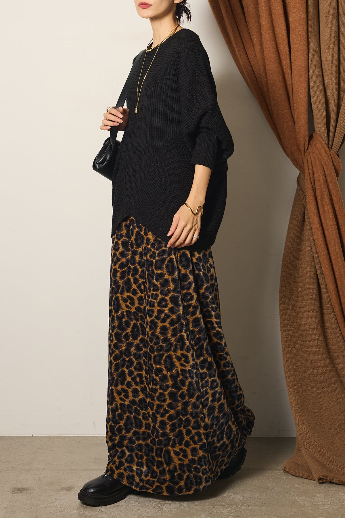 大胆なレオパード柄が目を引くワイドスカート。落ち感のあるシルエットが動くたびに美しいラインを描き、コーディネートにモードな存在感をプラスします。シンプルなトップスと合わせるだけでスタイルが決まり、デイリーから特別なシーンまで幅広く活躍する一枚です。
