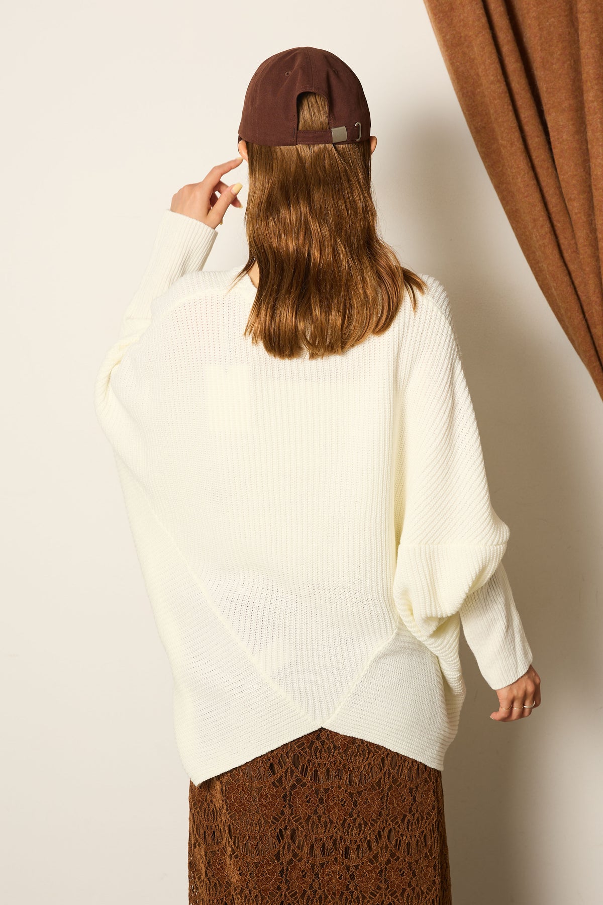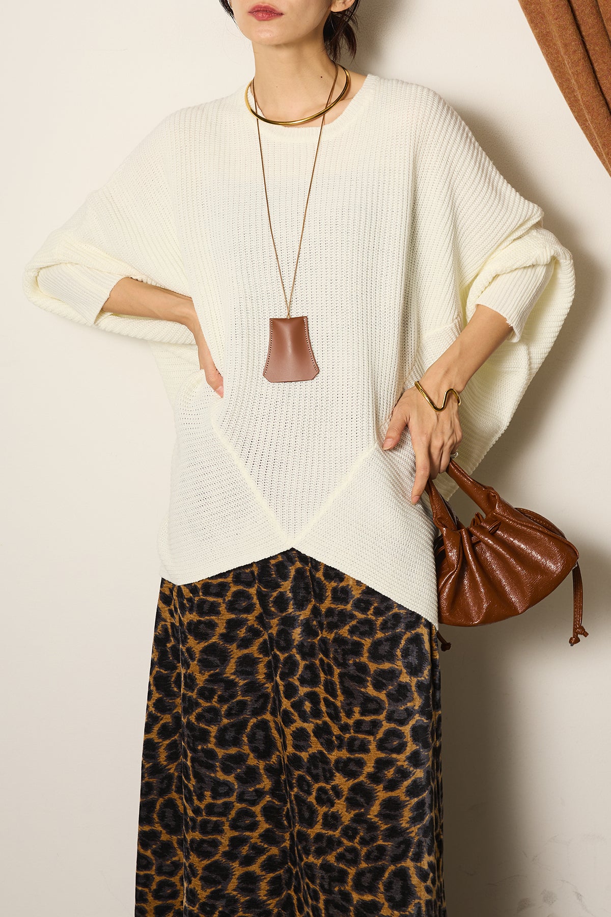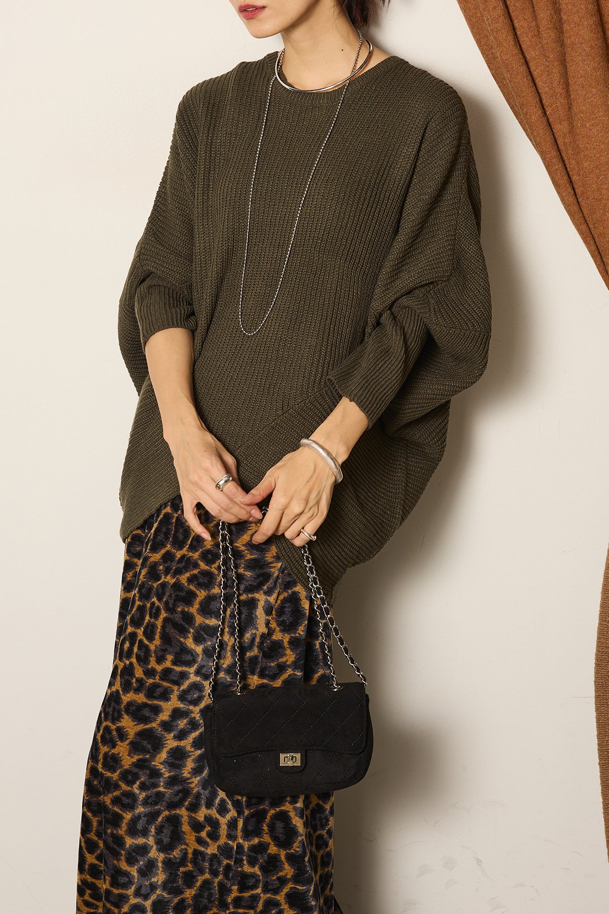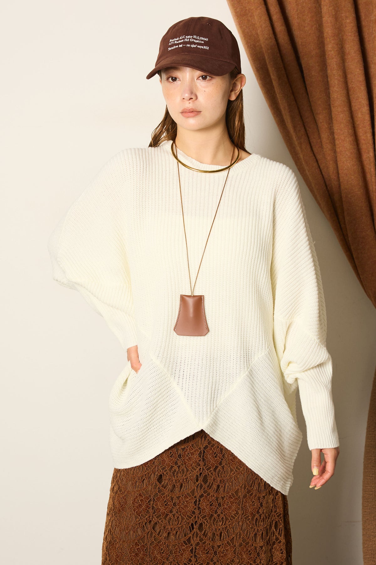 ゆるやかなドレープ感が魅力のドルマンニットプルオーバー。柔らかなニット素材が身体を包み込み、自然な落ち感でこなれた印象を演出します。裾のアシンメトリーデザインが動きを添え、シンプルながらもスタイリングに表情をプラス。カジュアルにもきれいめにも合わせやすく、デイリーに活躍する万能アイテムです。