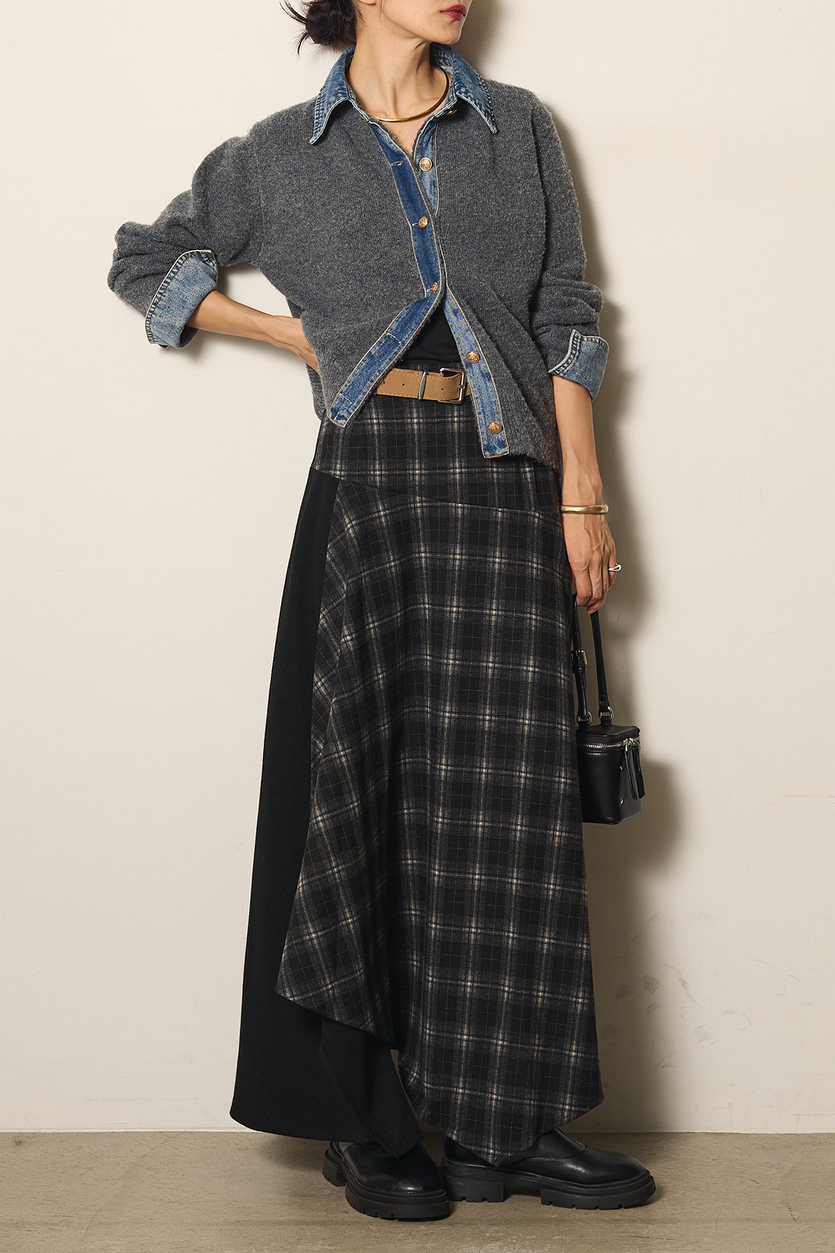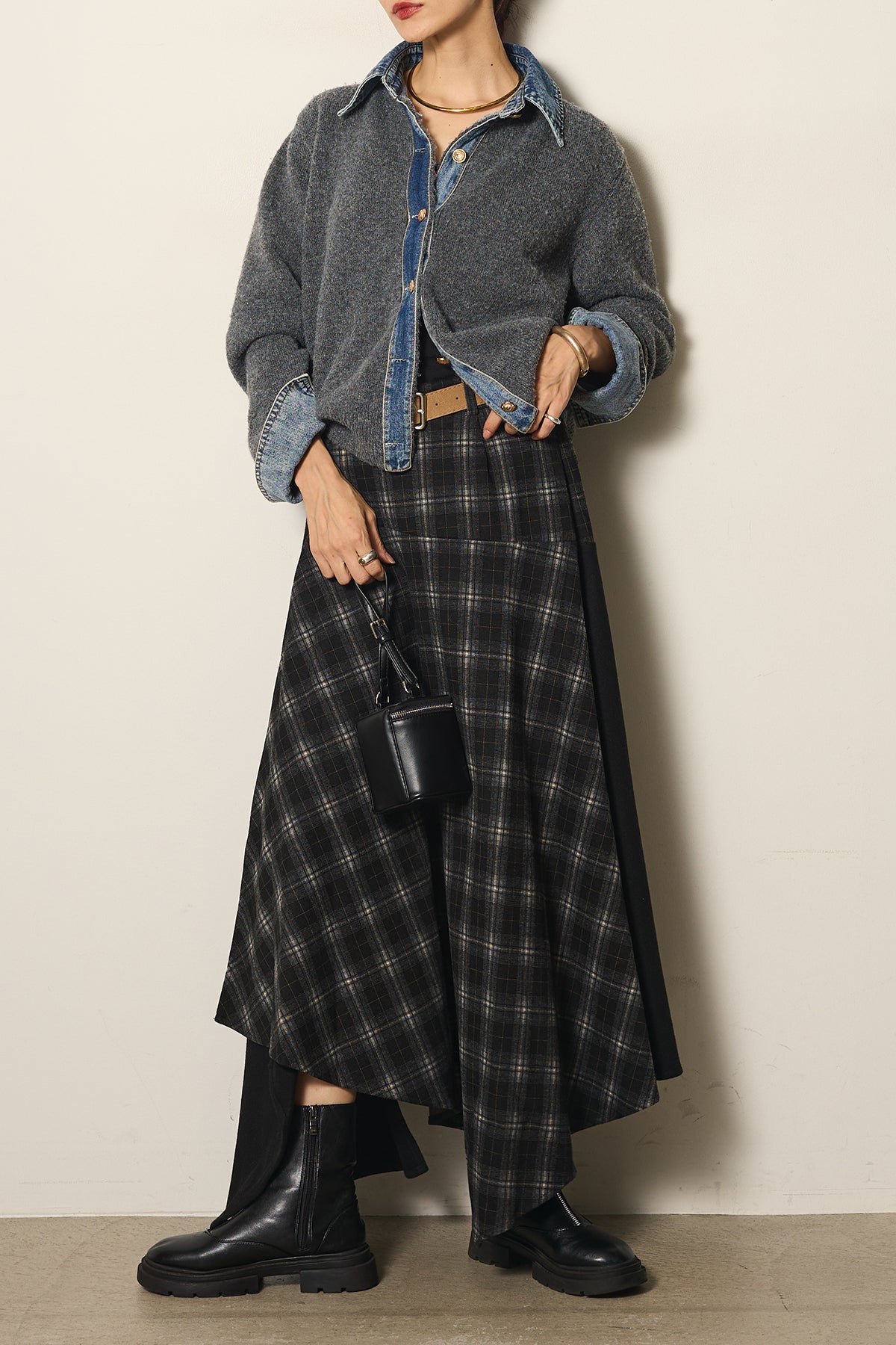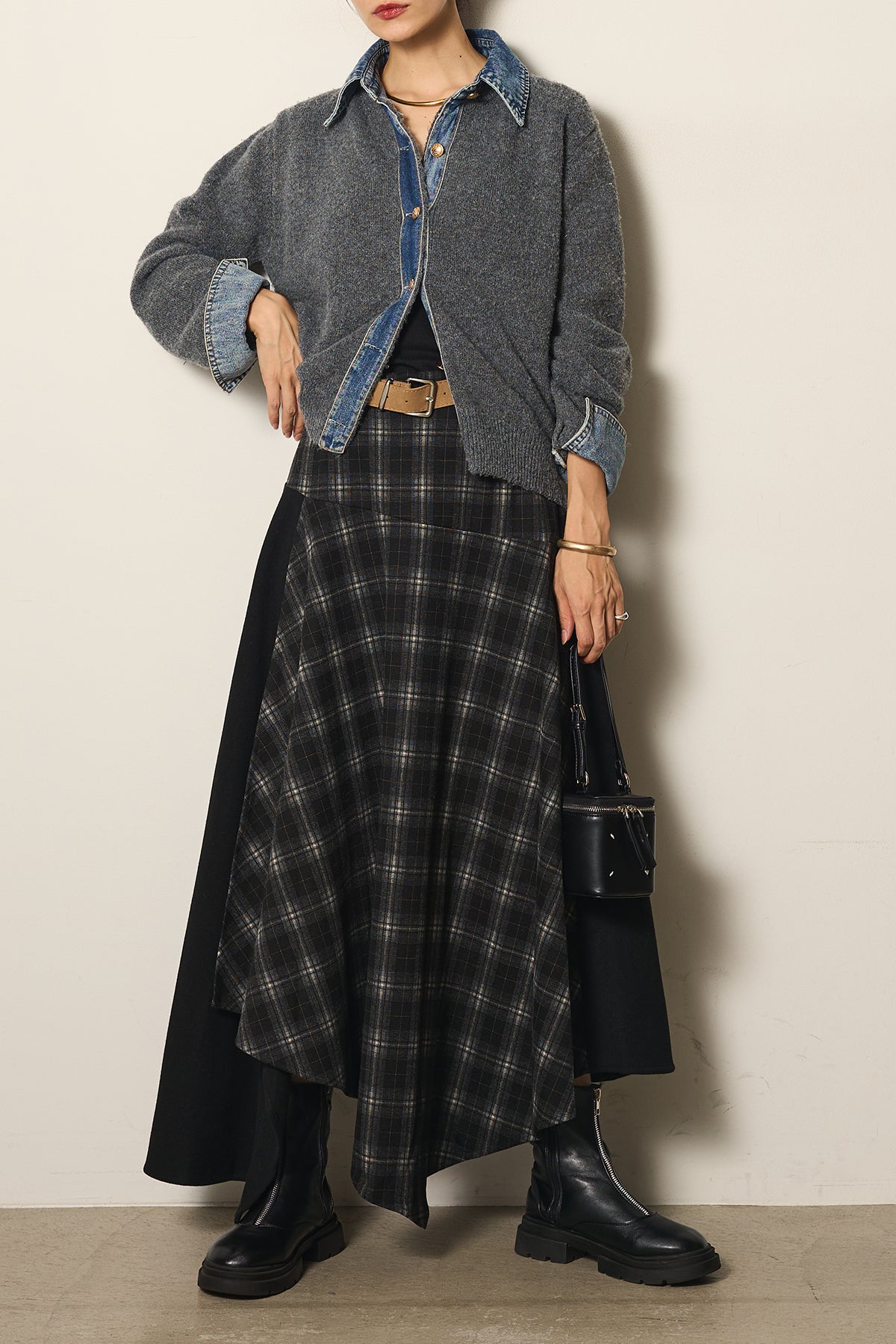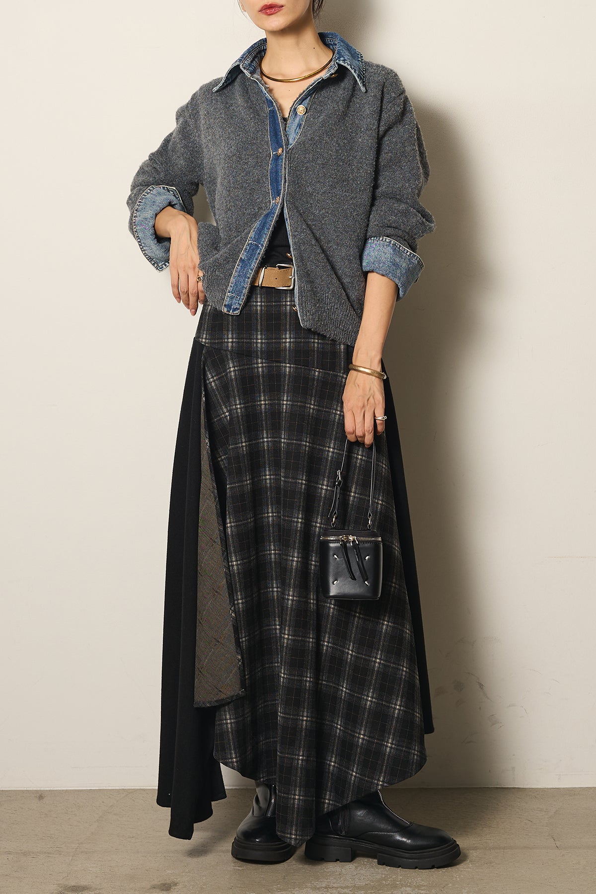 フェイクレザーベルト付き切り替えタータンチェックスカートの他のセットページはこちら