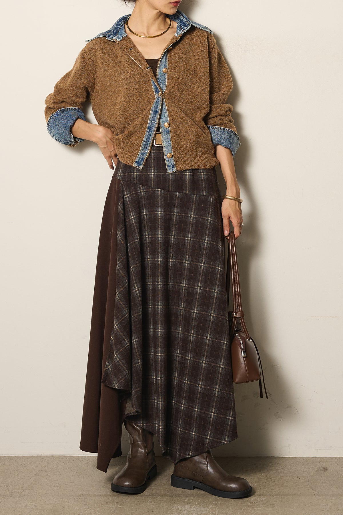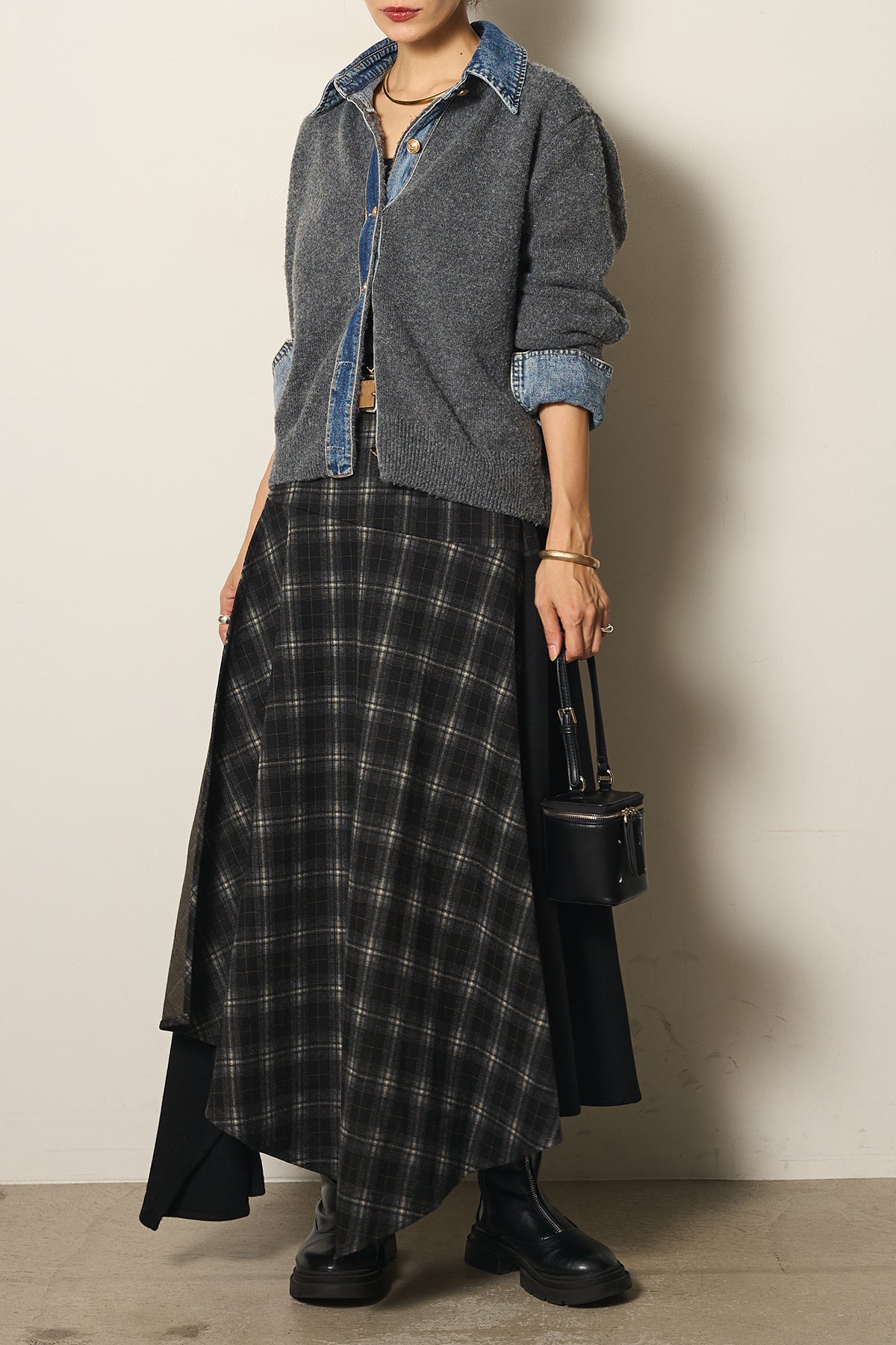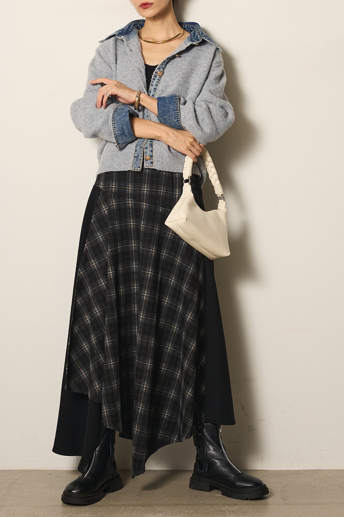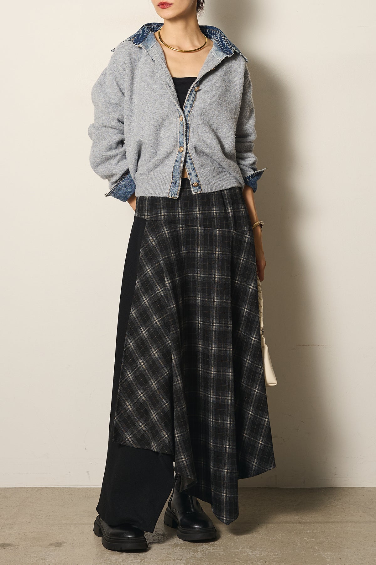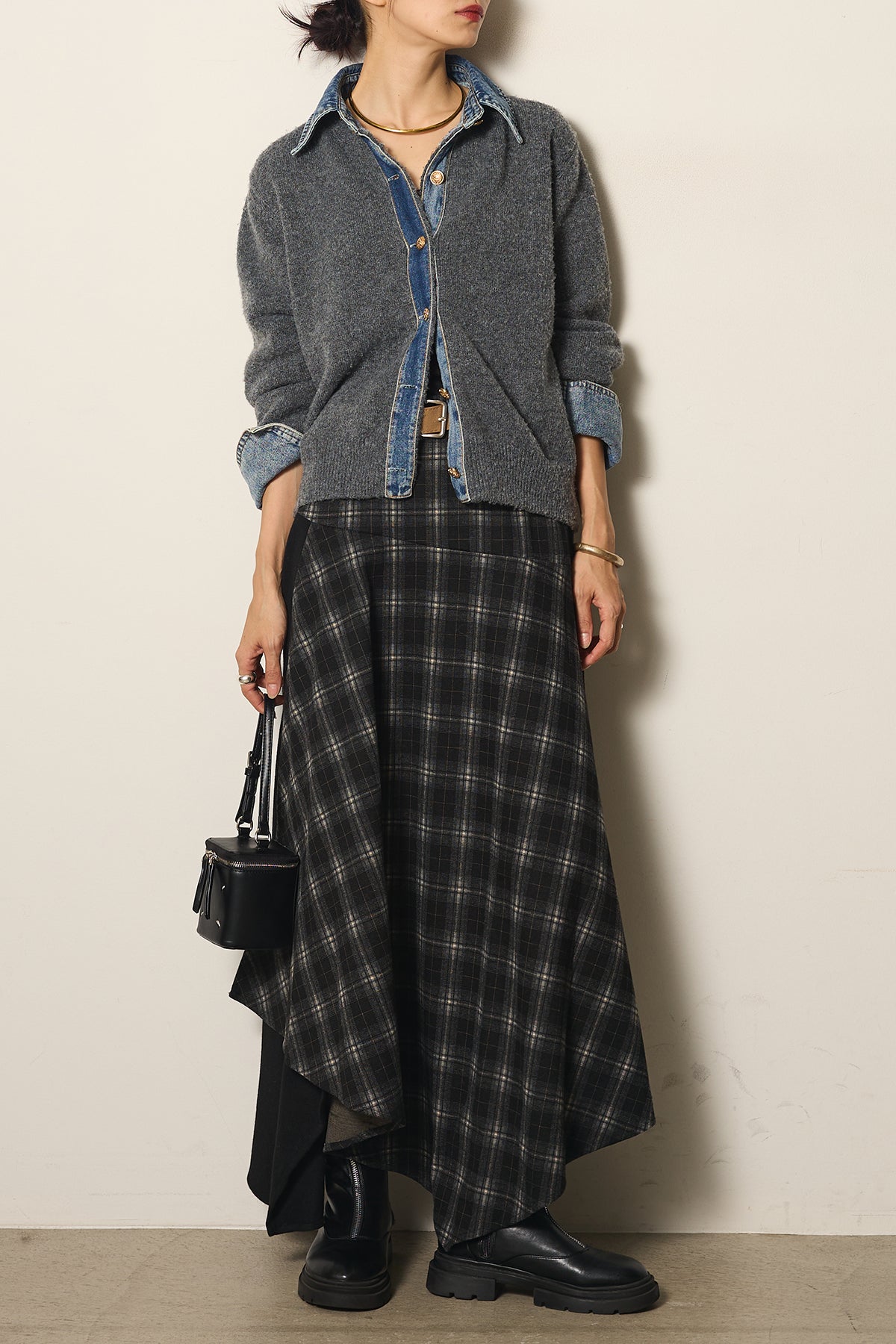 フェイクレザーベルト付き切り替えタータンチェックスカートの他のセットページはこちら