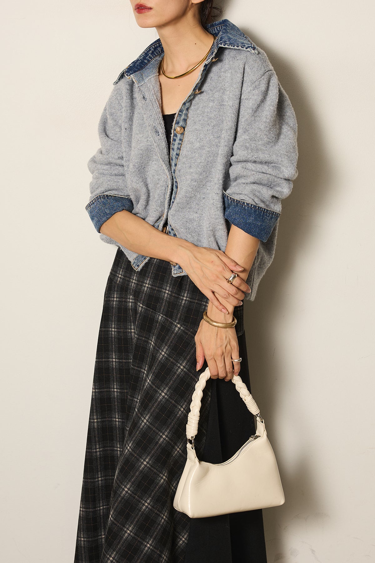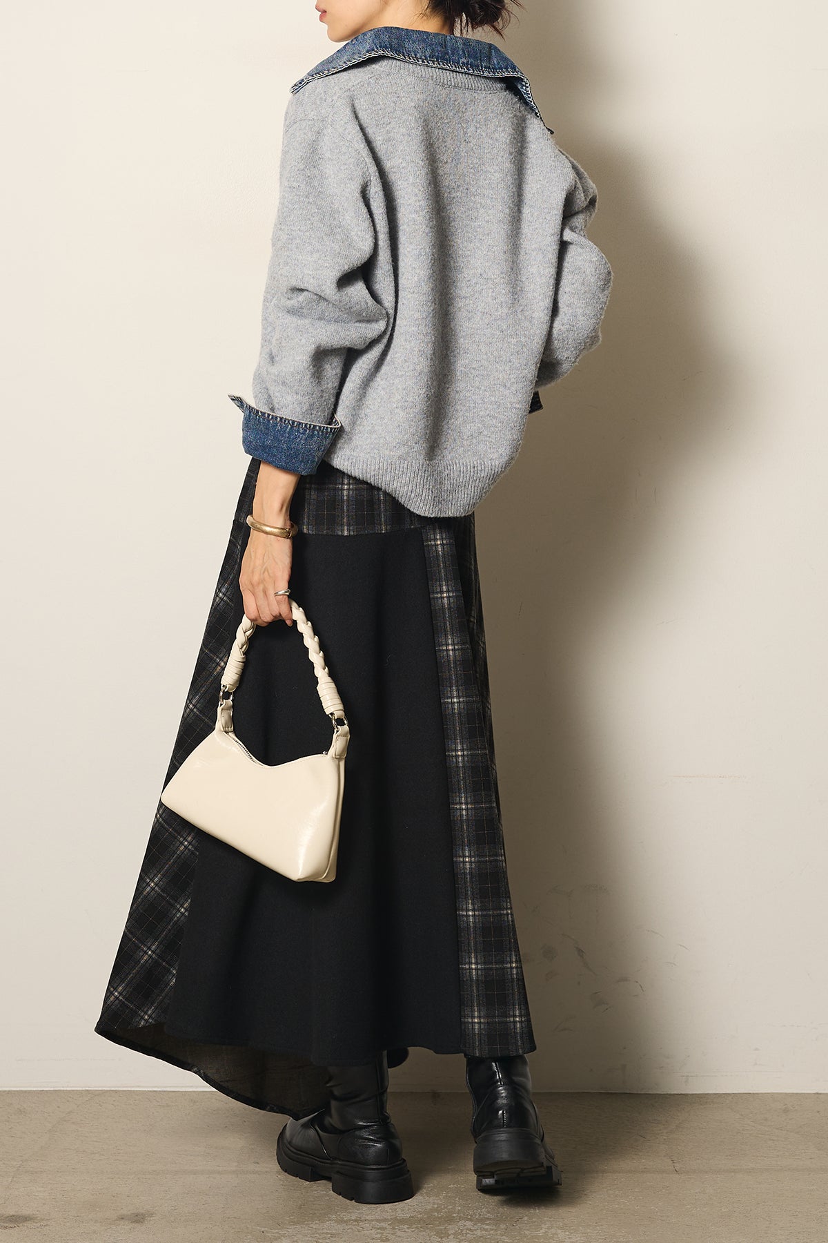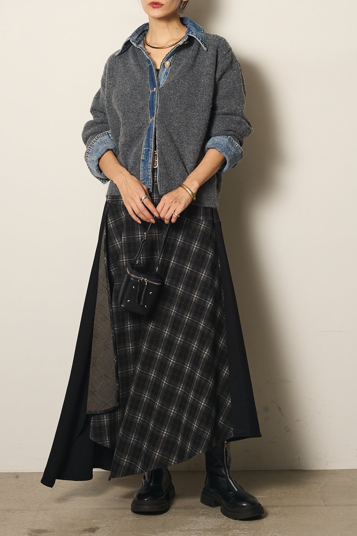 異素材のコンビネーションがモードな印象を与え、スタイリングにアクセントをプラスします。