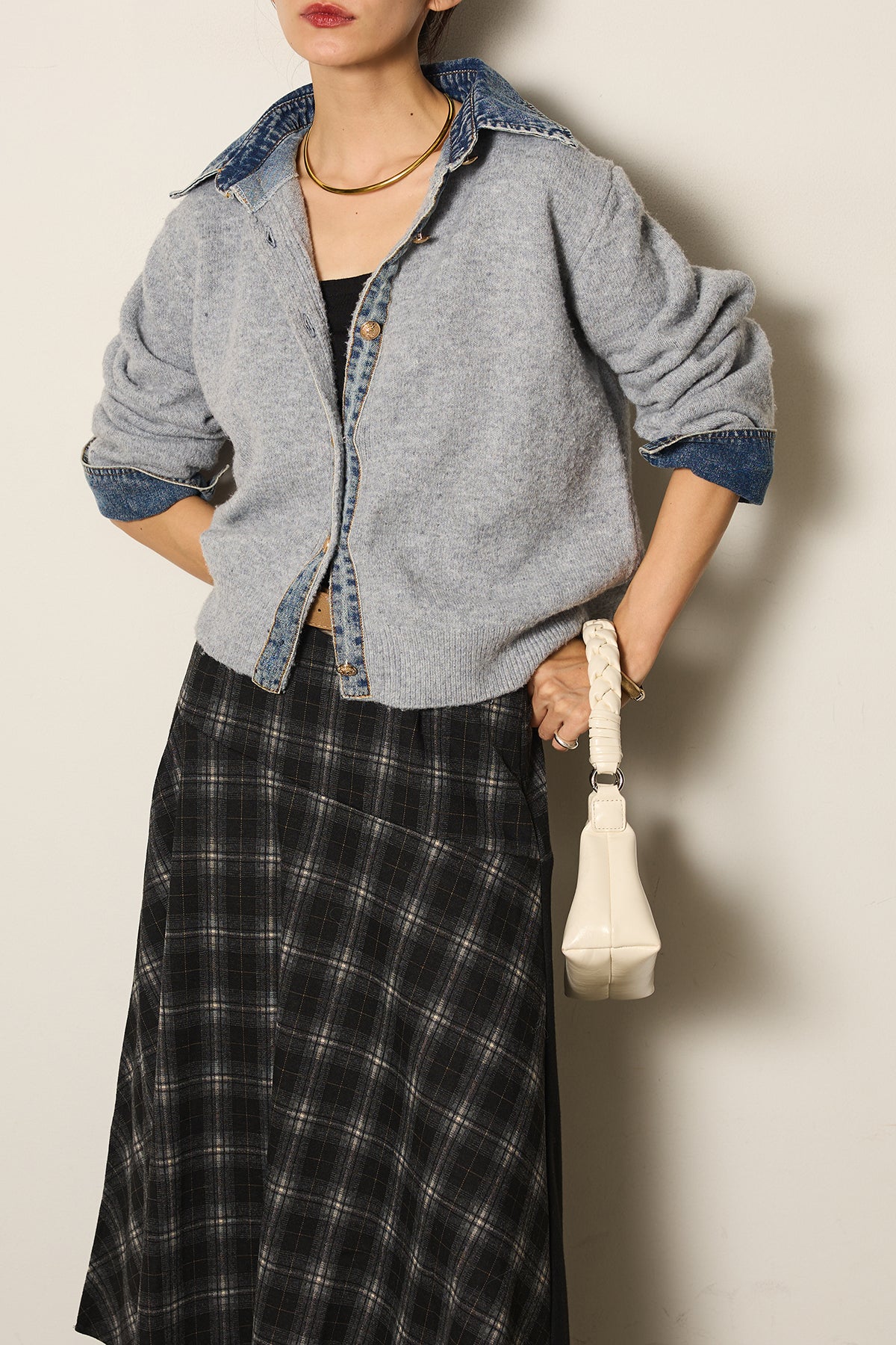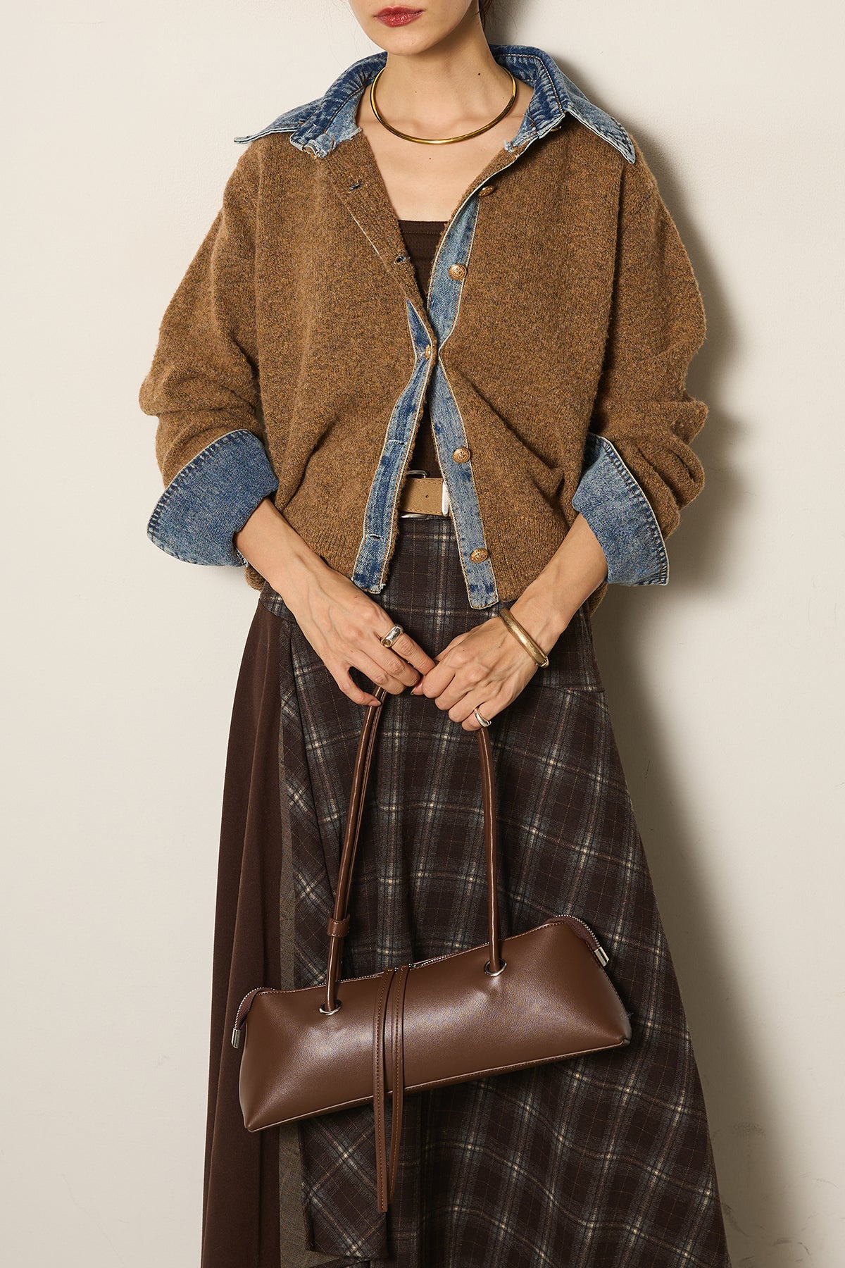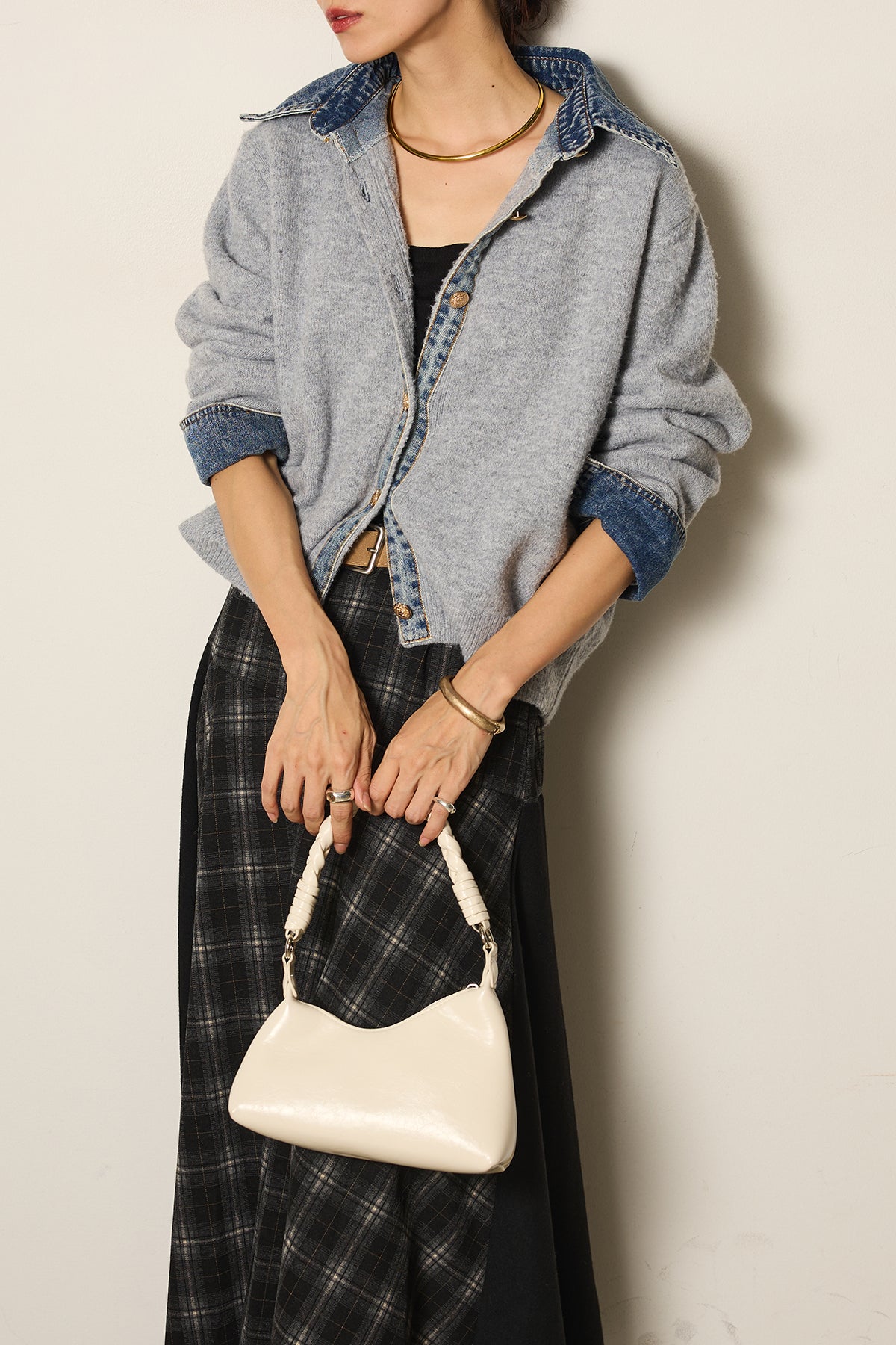 異素材のコンビネーションがモードな印象を与え、スタイリングにアクセントをプラスします。