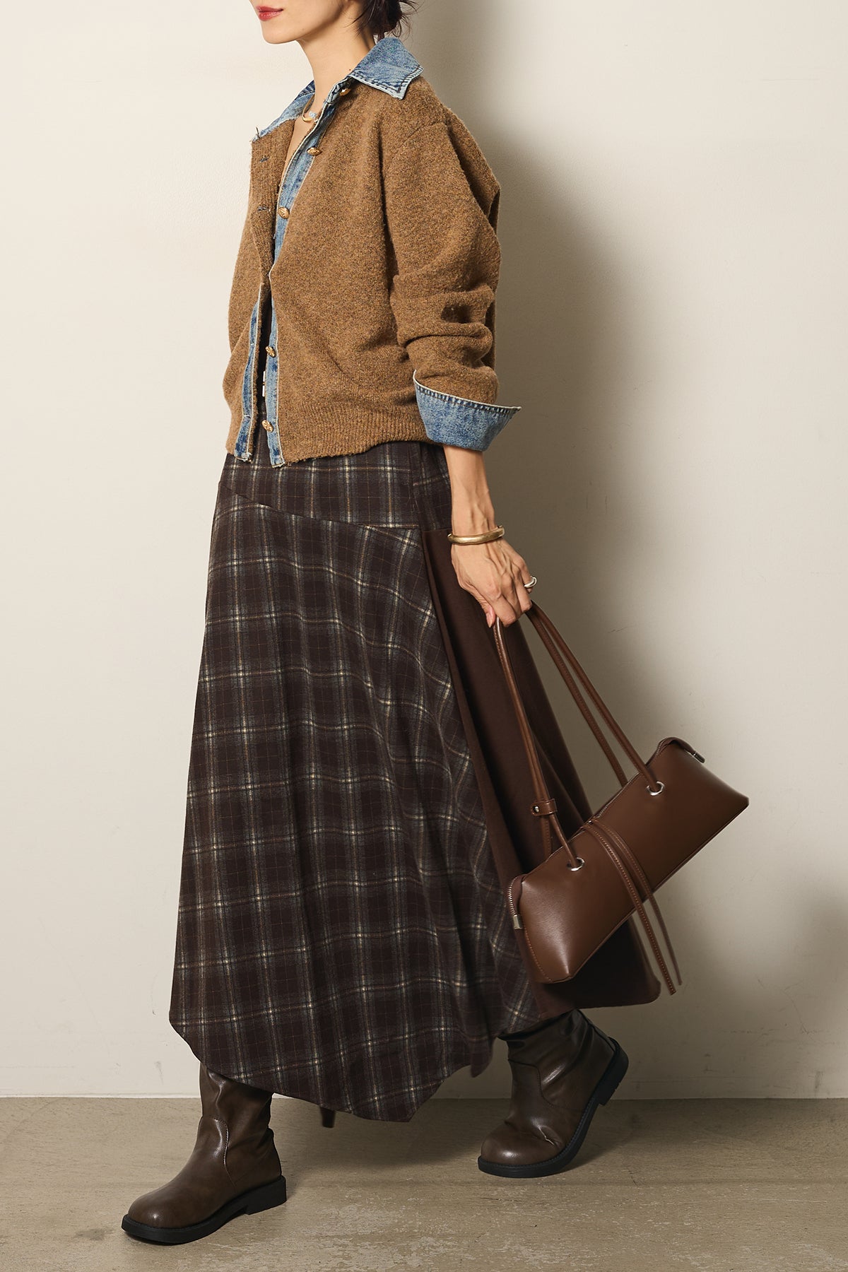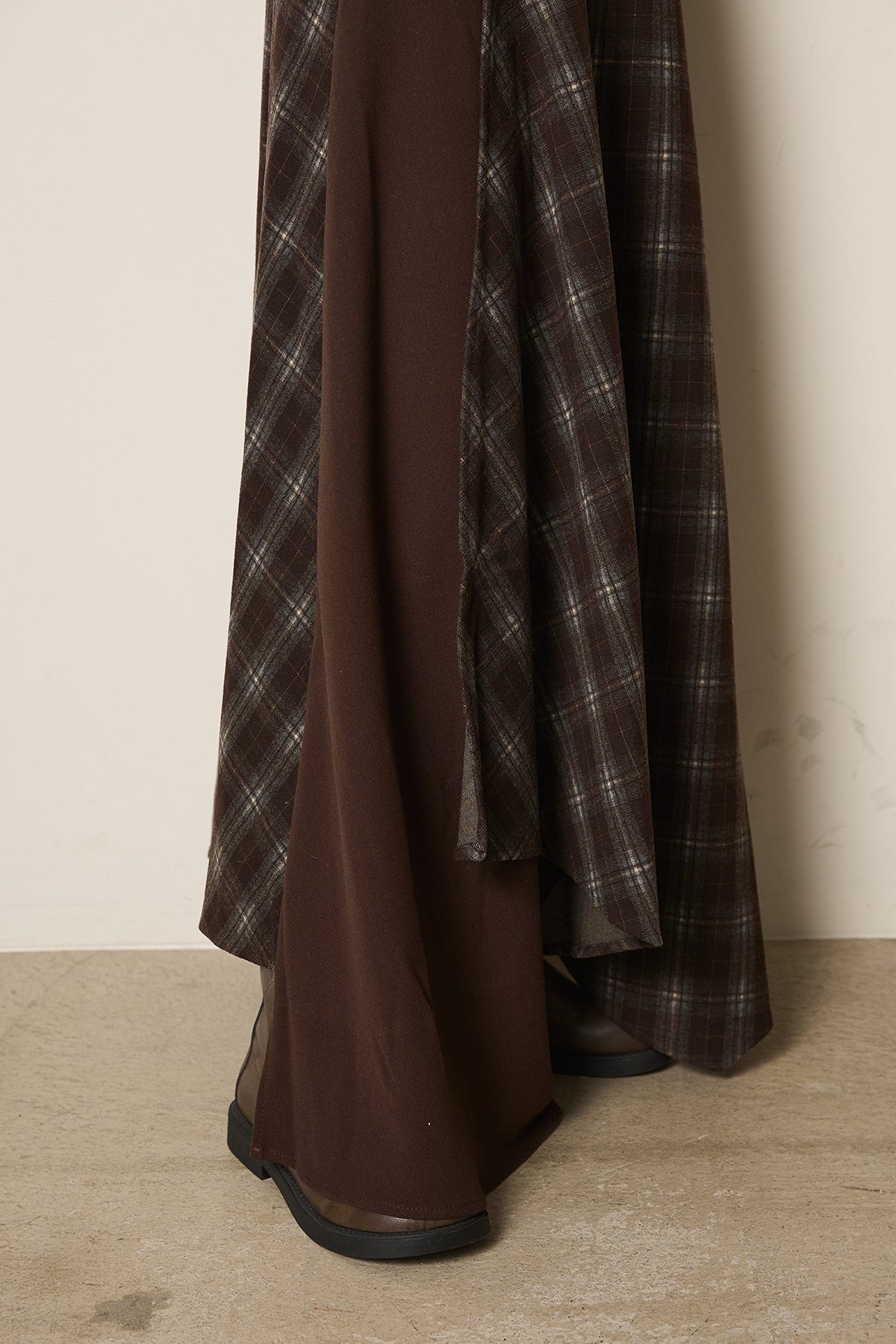 広がりすぎないシルエットで大人っぽく着こなせ、ブーツ合わせもバランス良く決まる一枚。