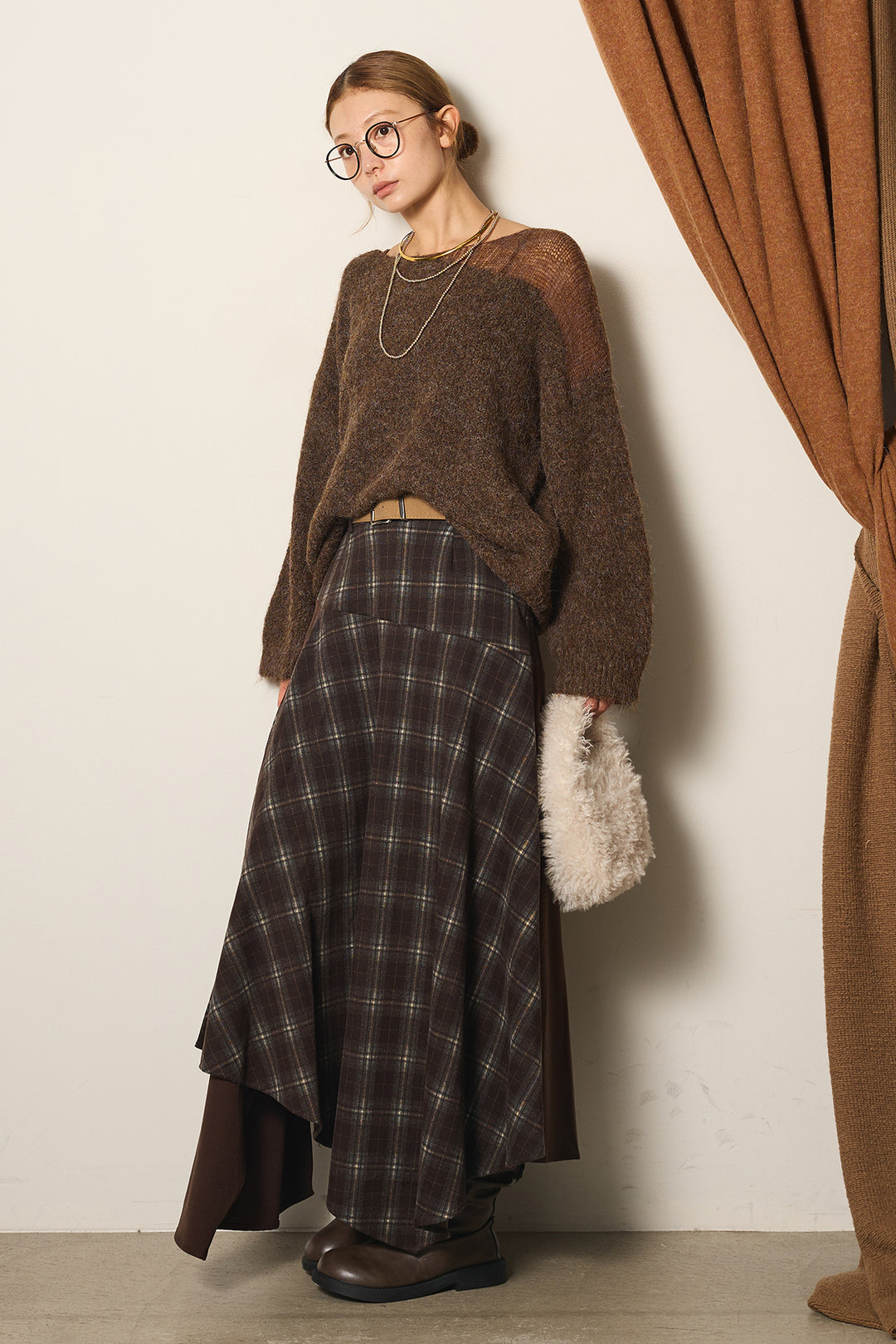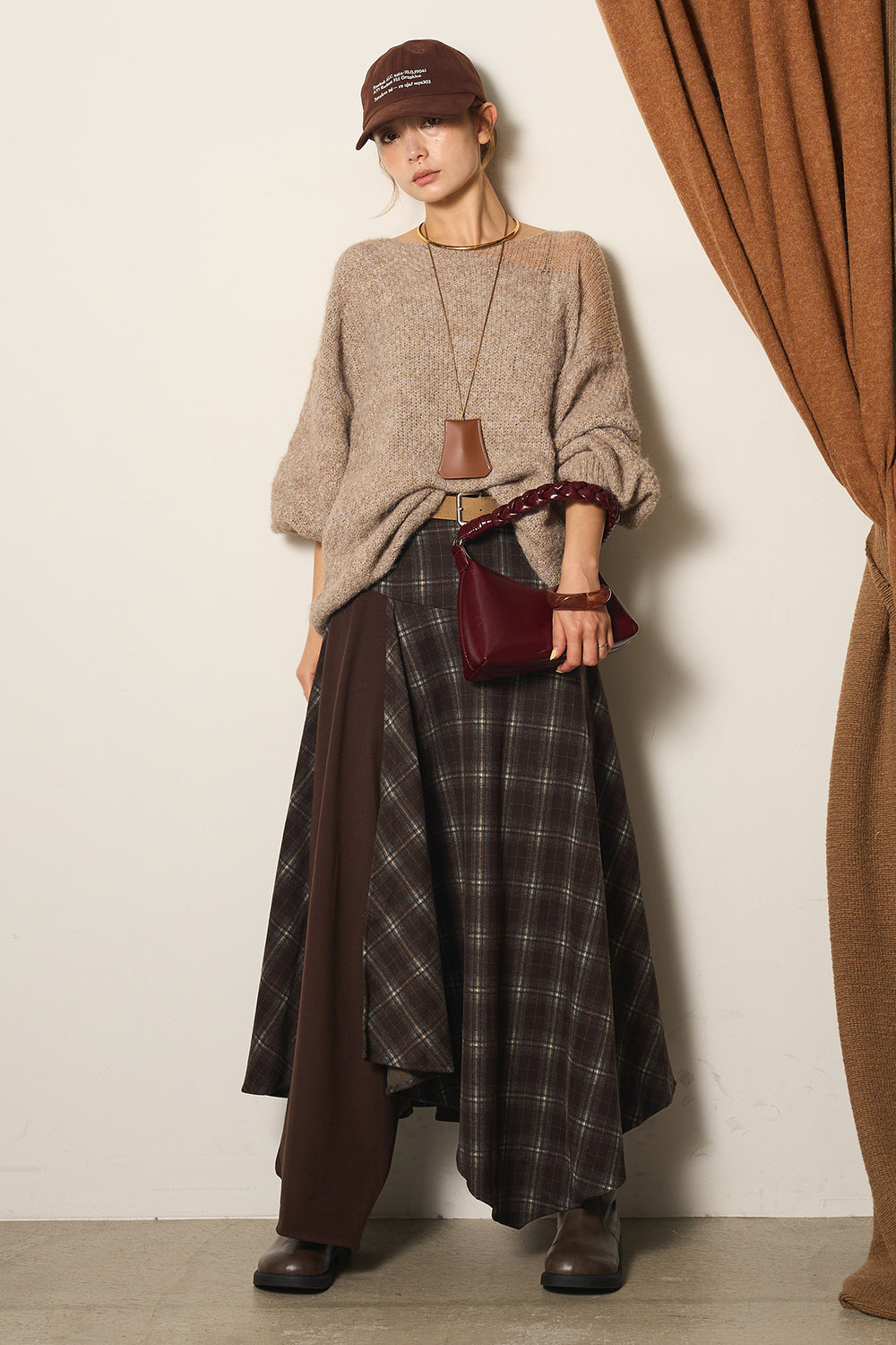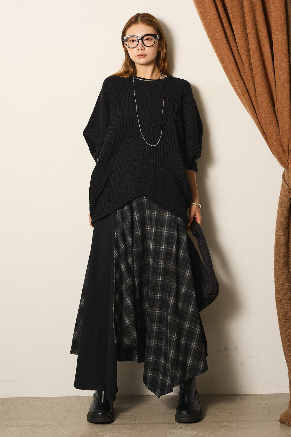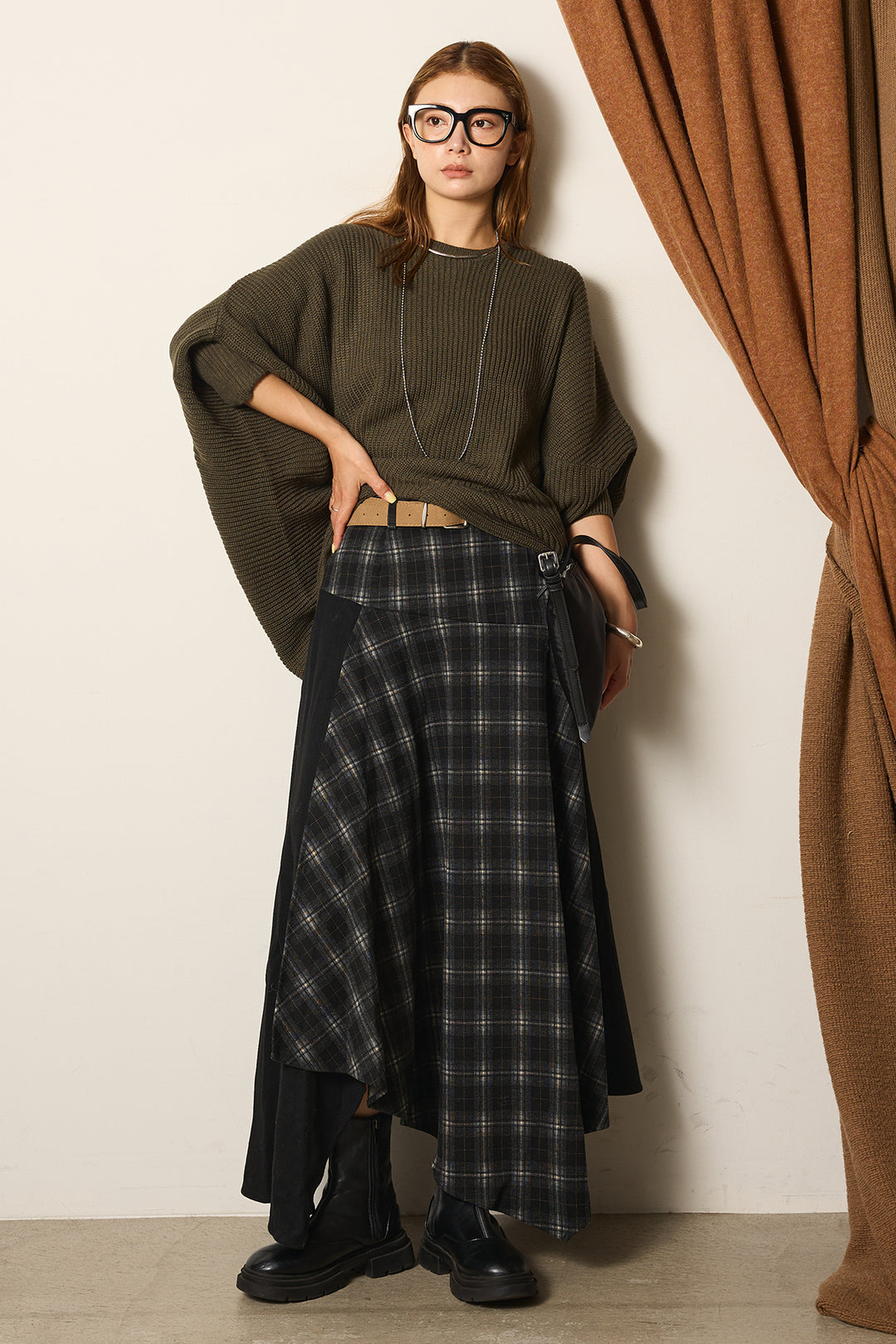 [SET]ルーズドレープドルマンニットプルオーバー+フェイクレザーベルト付き切り替えタータンチェックスカート(2set)