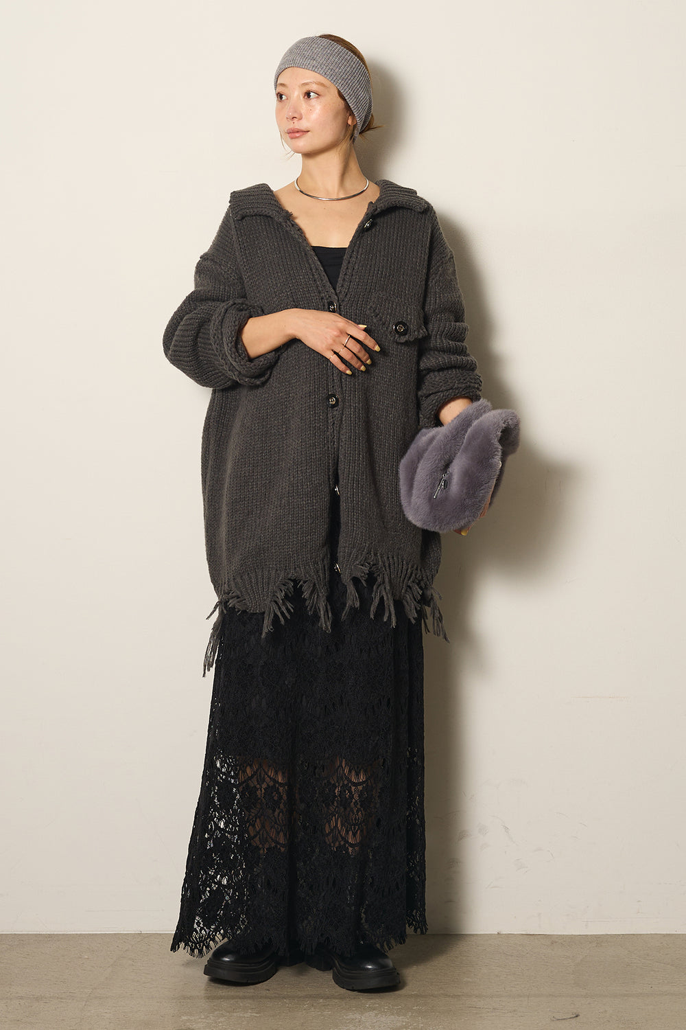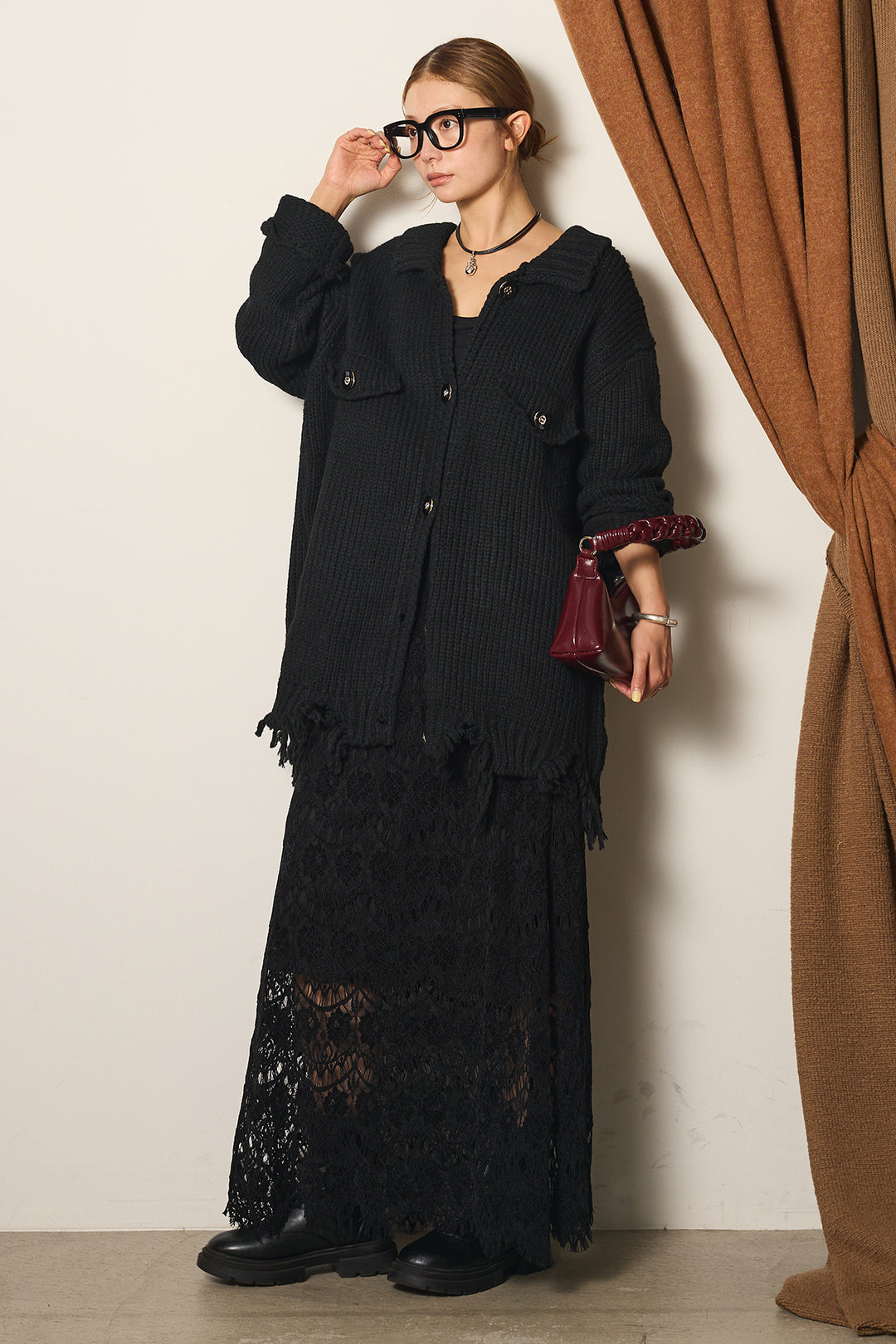 [SET]襟付き裾フリンジニットカーディガン+レース刺繍ロングスカート(2set)