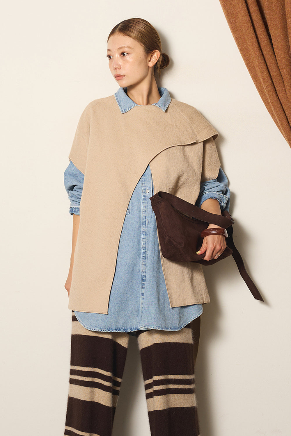 [SET]ネック巻きデザインシャギーベスト+オーバーサイズデニムシャツ(2set)