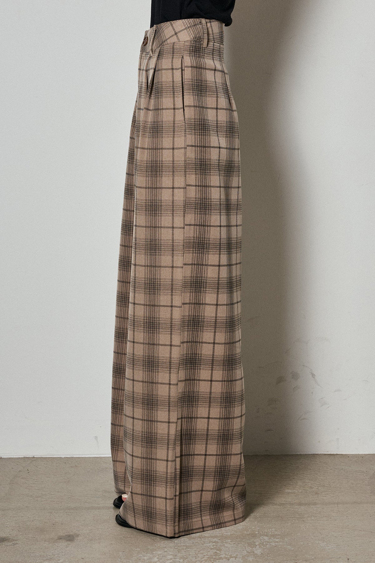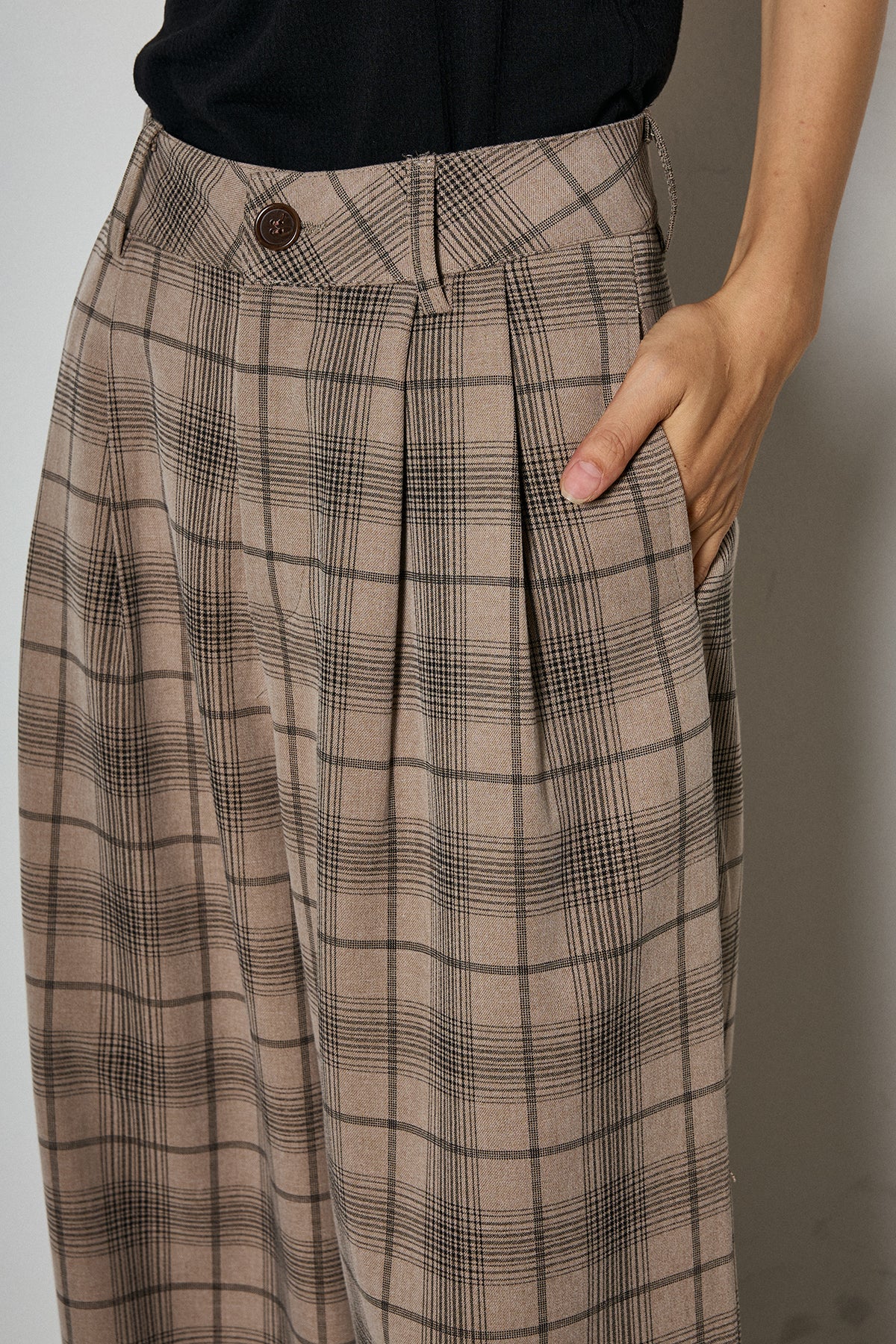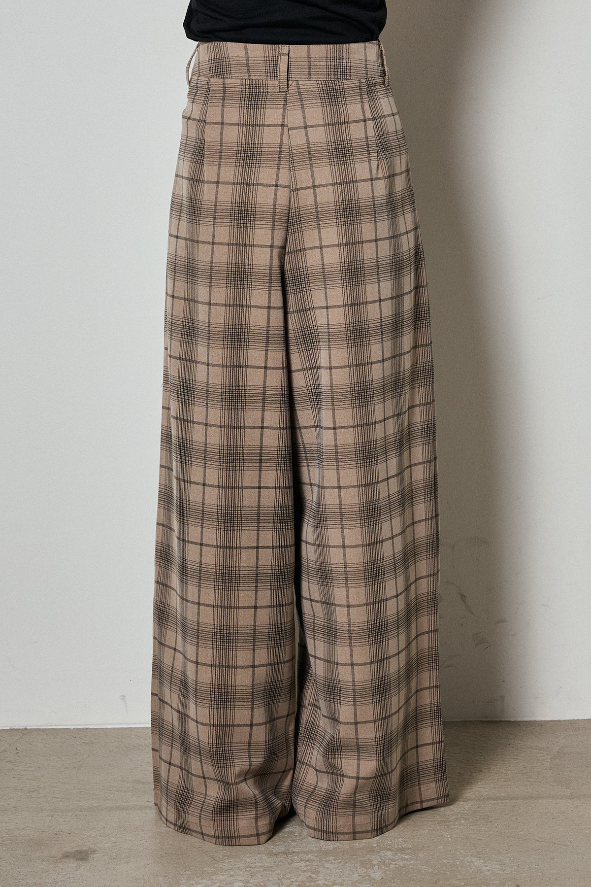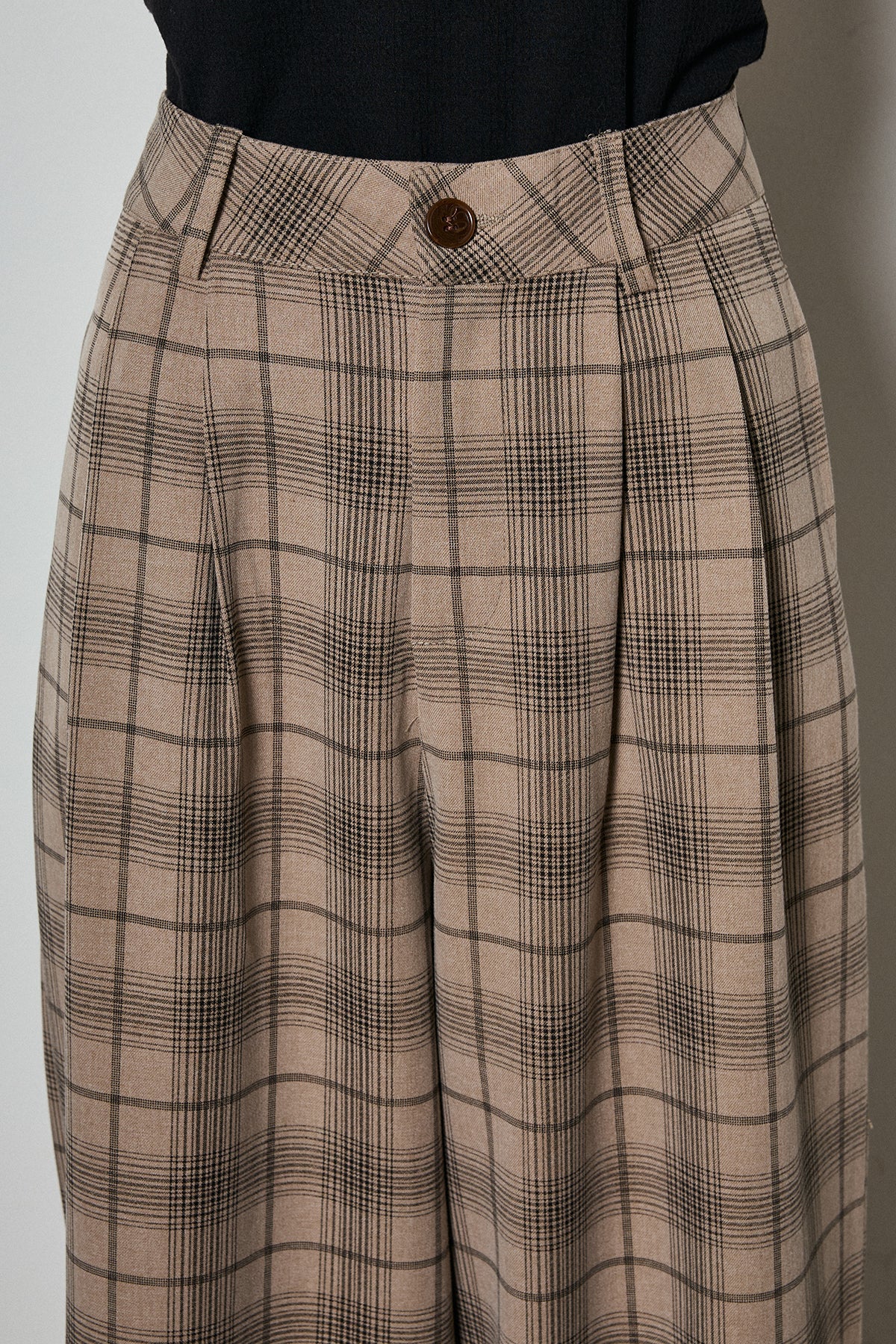 存在感のあるタータンチェック柄が印象的なワイドパンツ。フロントに施されたタックが立体感を生み、動くたびに美しいドレープを描きます。ウエストまわりはすっきりと仕上げつつ、ゆとりのあるワイドシルエットで快適な穿き心地。シンプルなトップスと合わせるだけで、トレンド感のあるコーディネートが完成する主役級アイテムです。