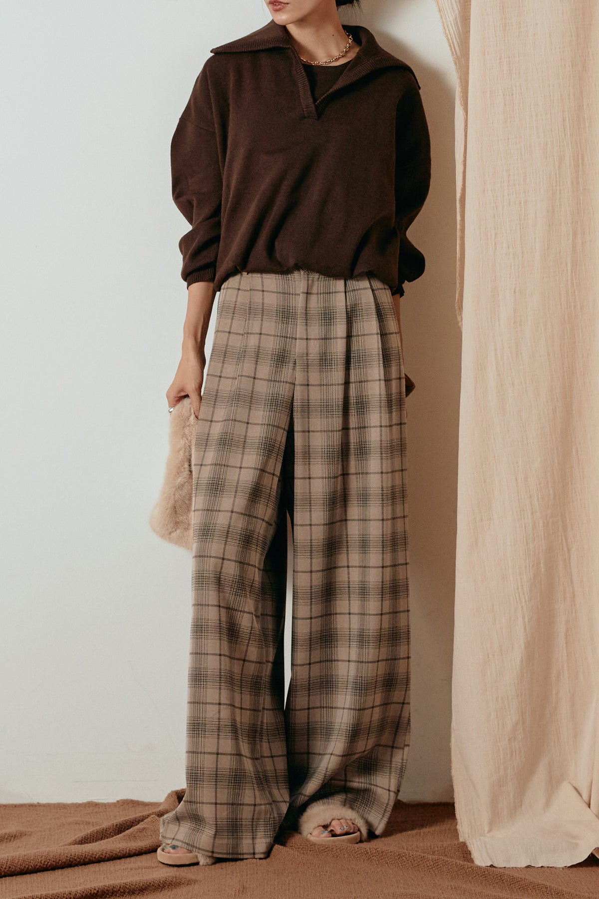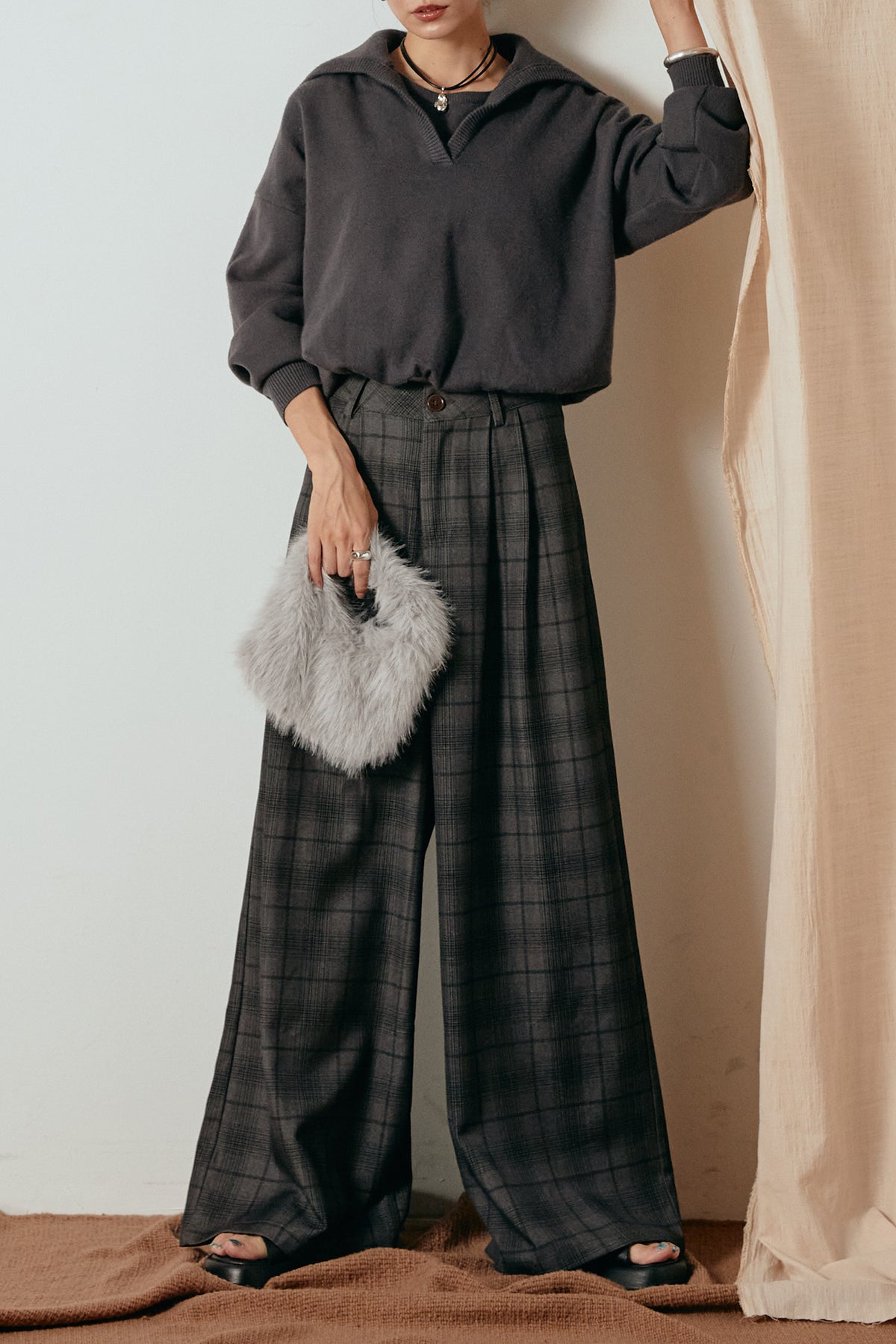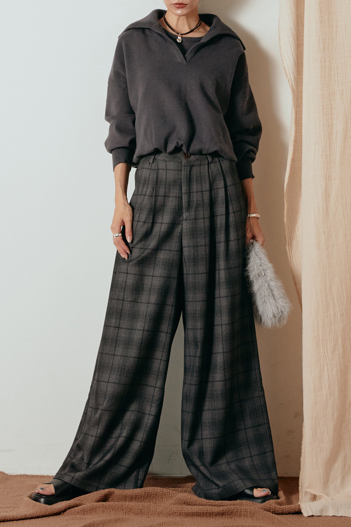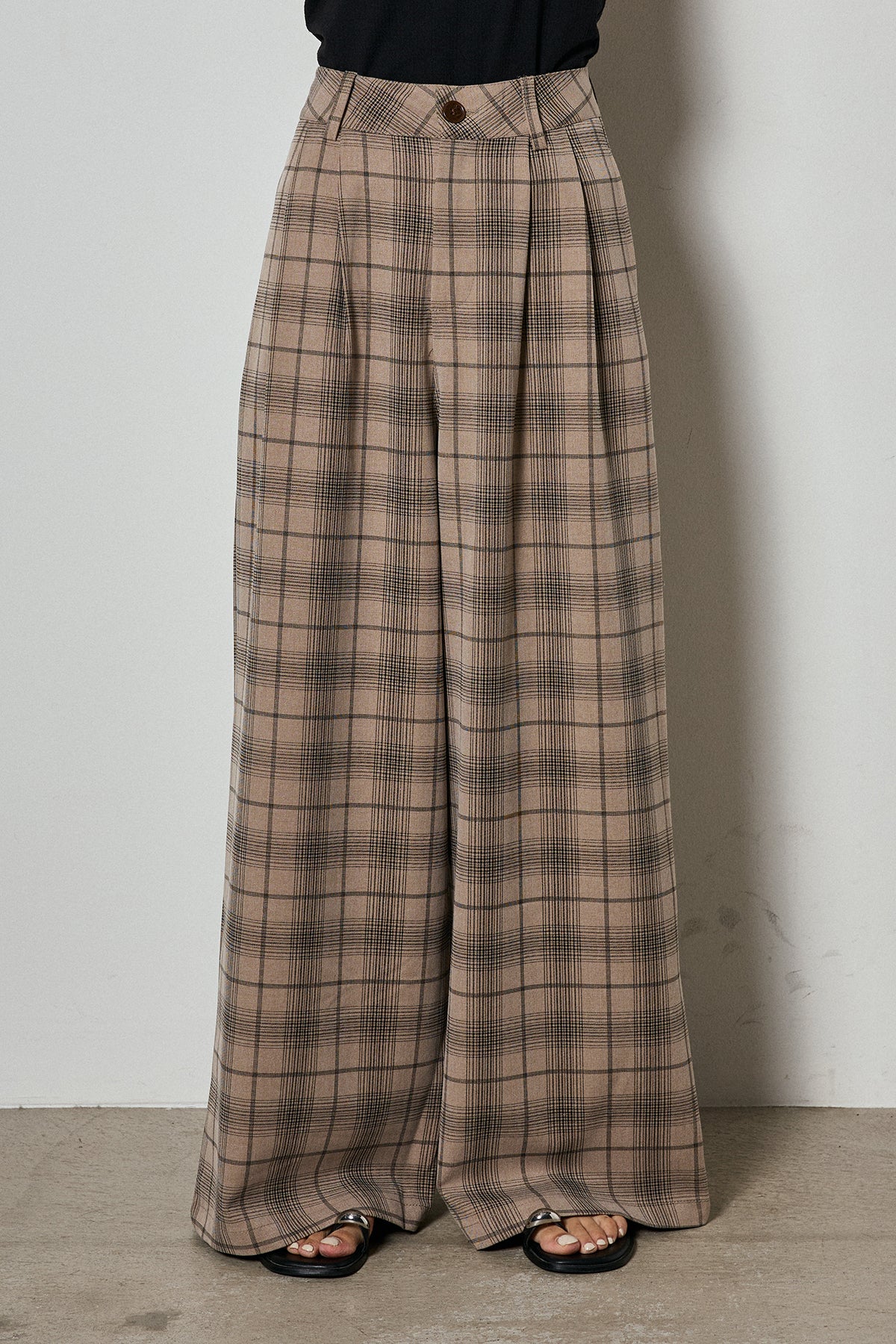 存在感のあるタータンチェック柄が印象的なワイドパンツ。フロントに施されたタックが立体感を生み、動くたびに美しいドレープを描きます。ウエストまわりはすっきりと仕上げつつ、ゆとりのあるワイドシルエットで快適な穿き心地。シンプルなトップスと合わせるだけで、トレンド感のあるコーディネートが完成する主役級アイテムです。