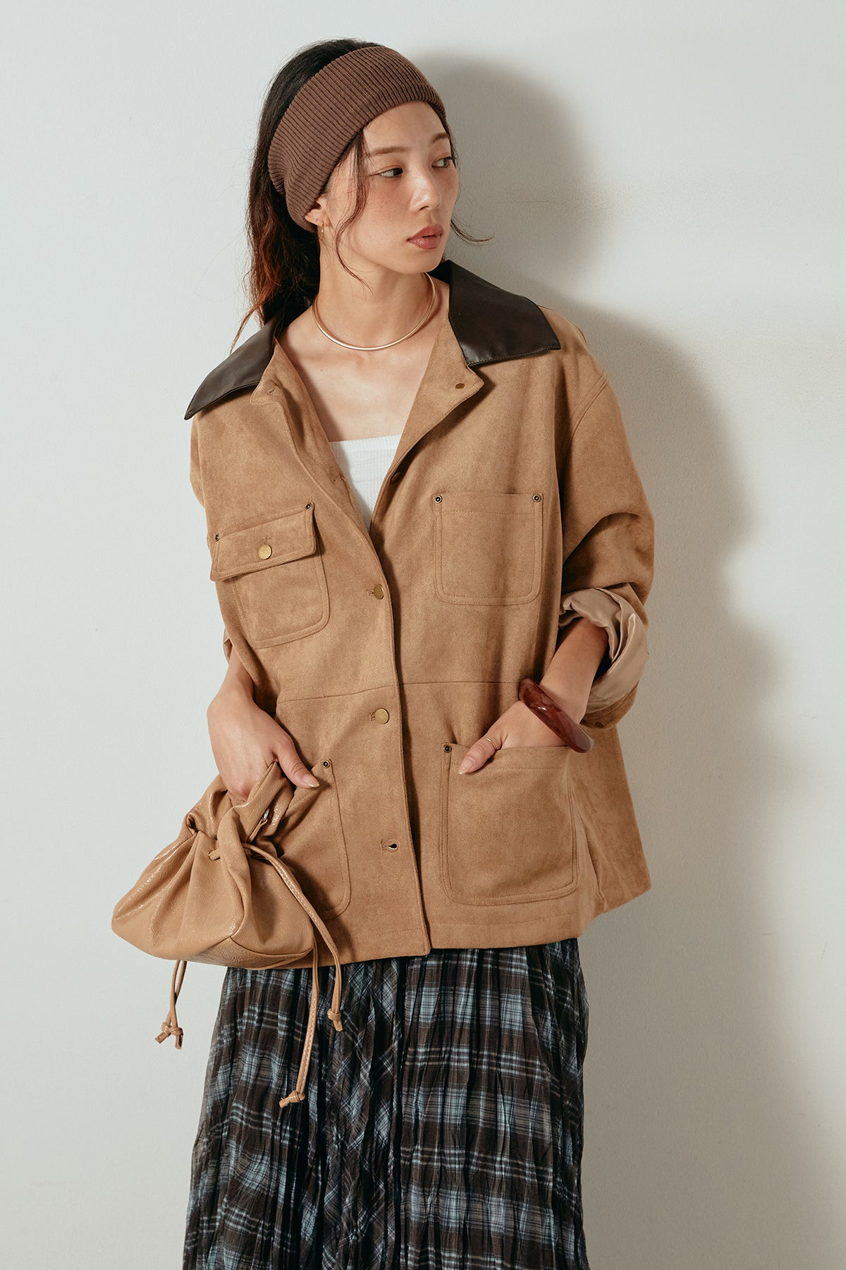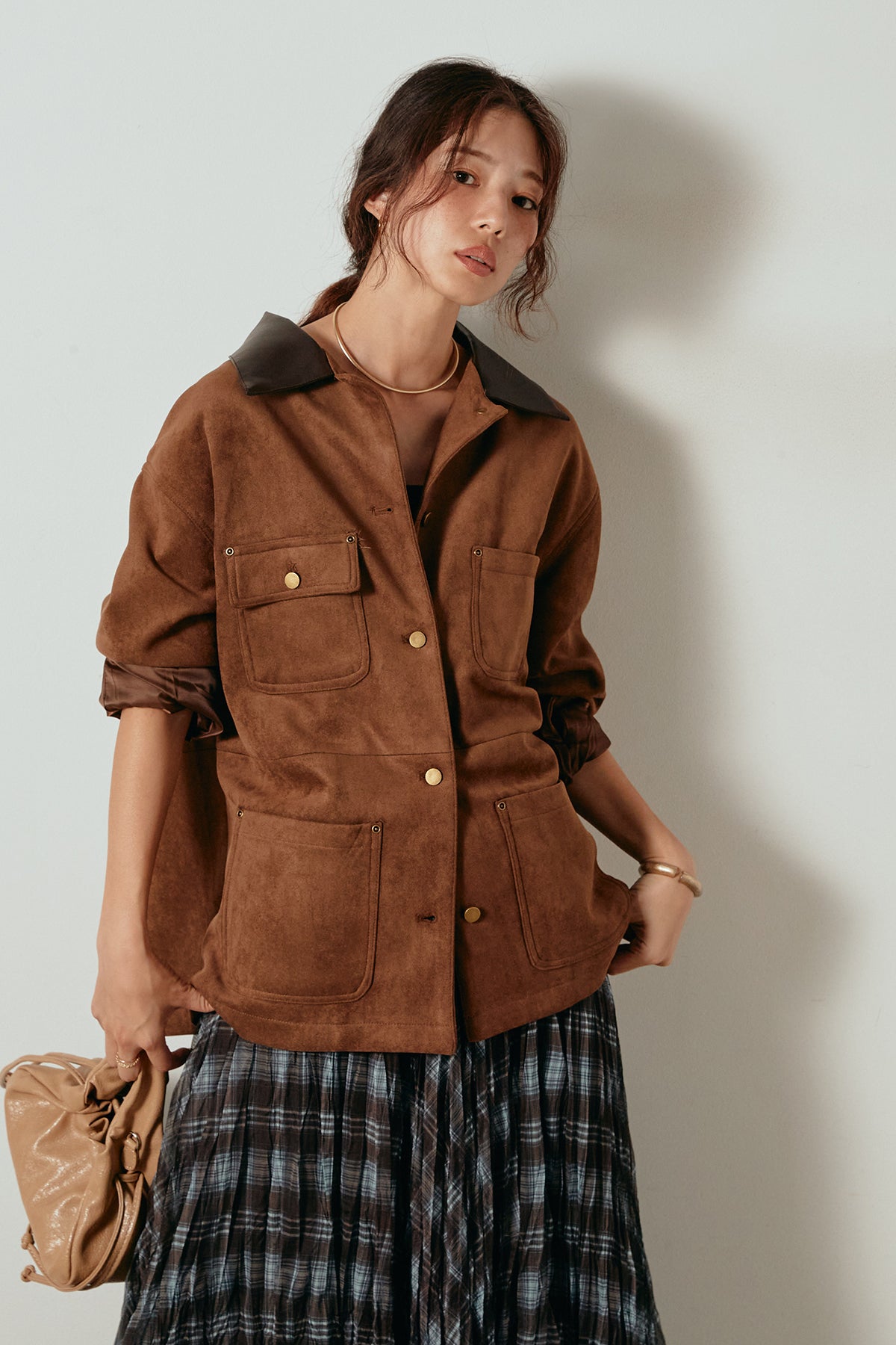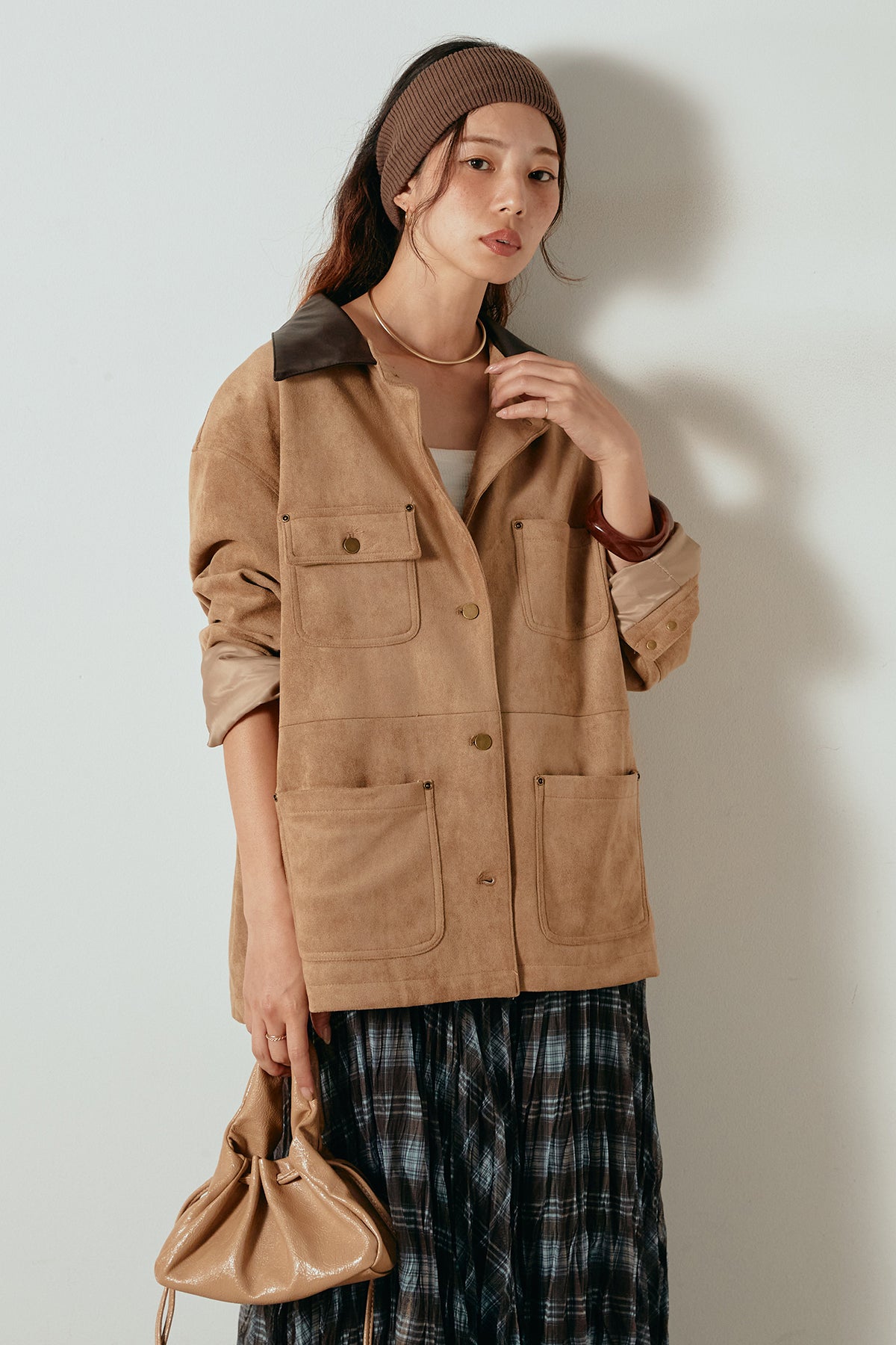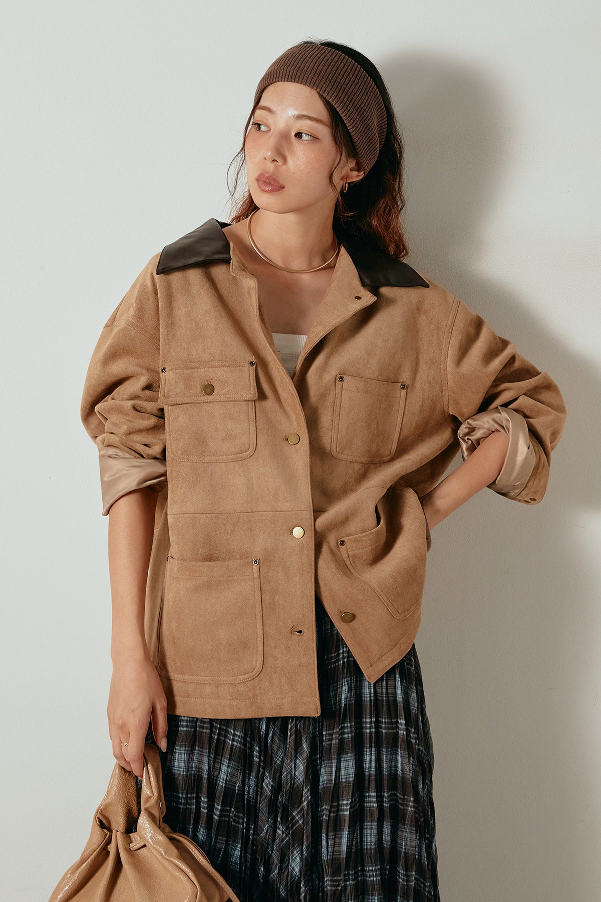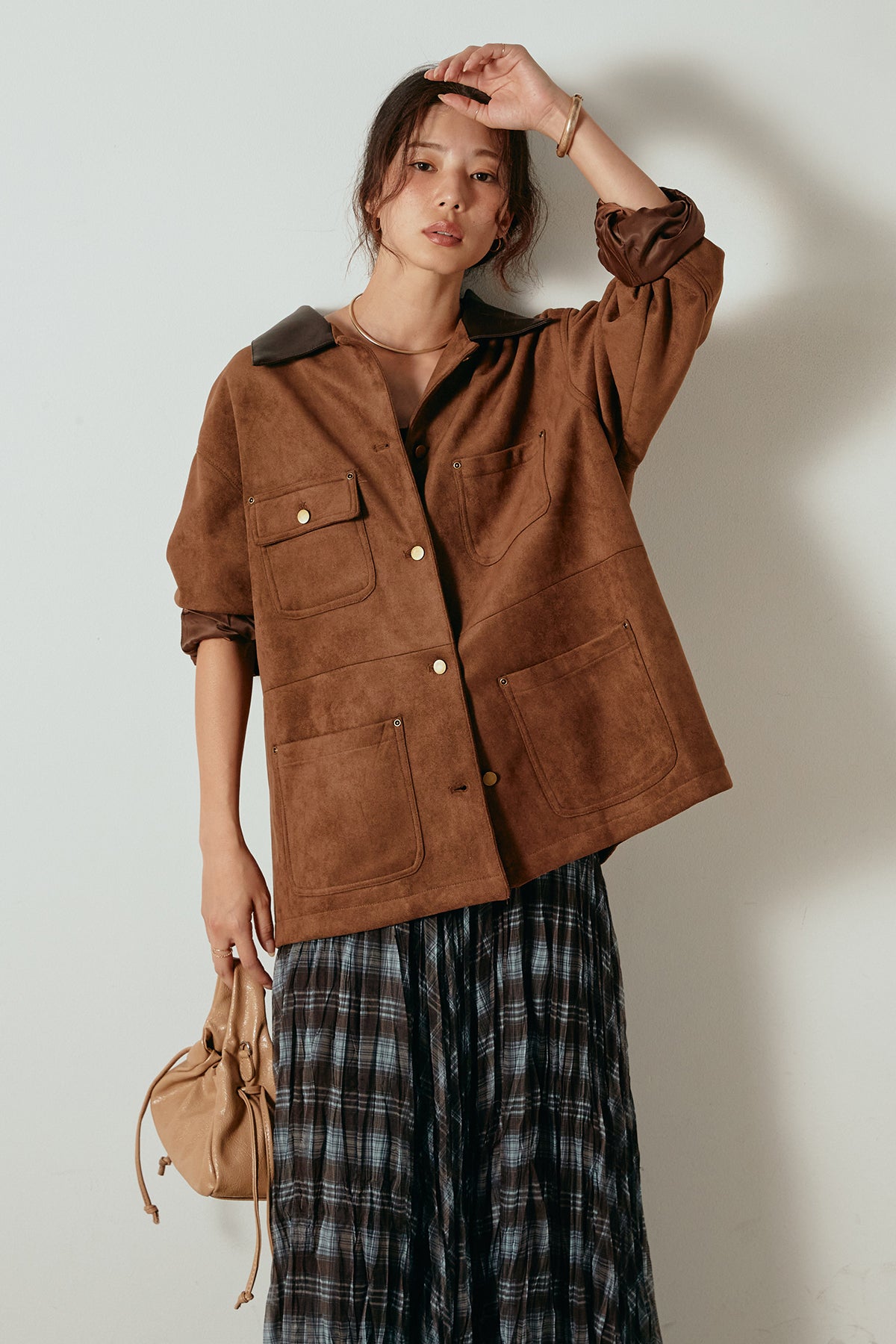 しっとりとしたスエードタッチにフェイクレザーの襟をアクセントに効かせたカバーオールジャケット。フロントの4つの大きめポケットがデザイン性と実用性を兼ね備え、スタイリングにワークテイストをプラスします。ゆったりとしたシルエットで重ね着しやすく、シャツ感覚で羽織れる一枚。季節の変わり目やライトアウターとして、カジュアルからきれいめまで幅広いコーディネートに活躍するアイテムです。