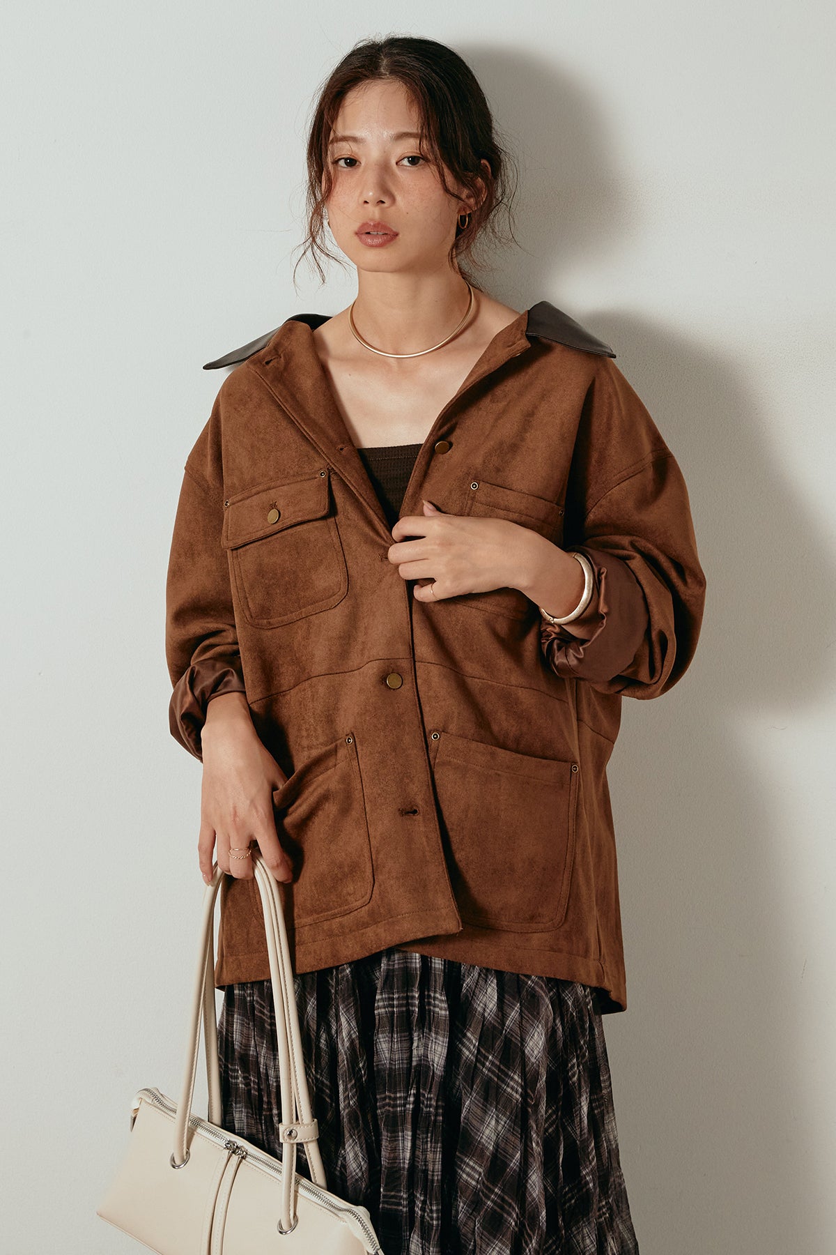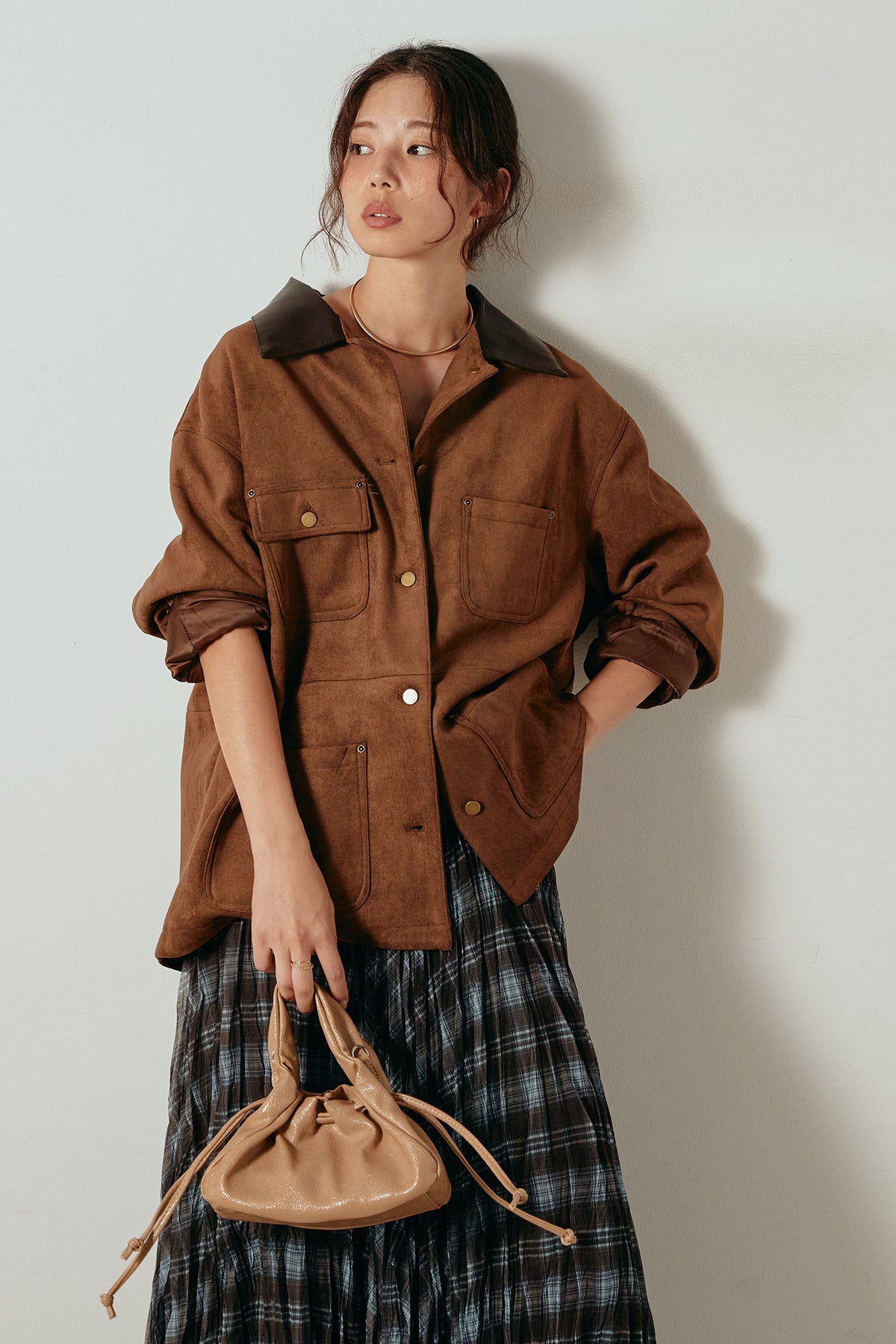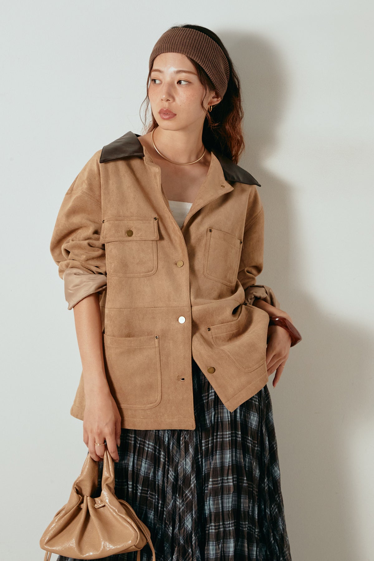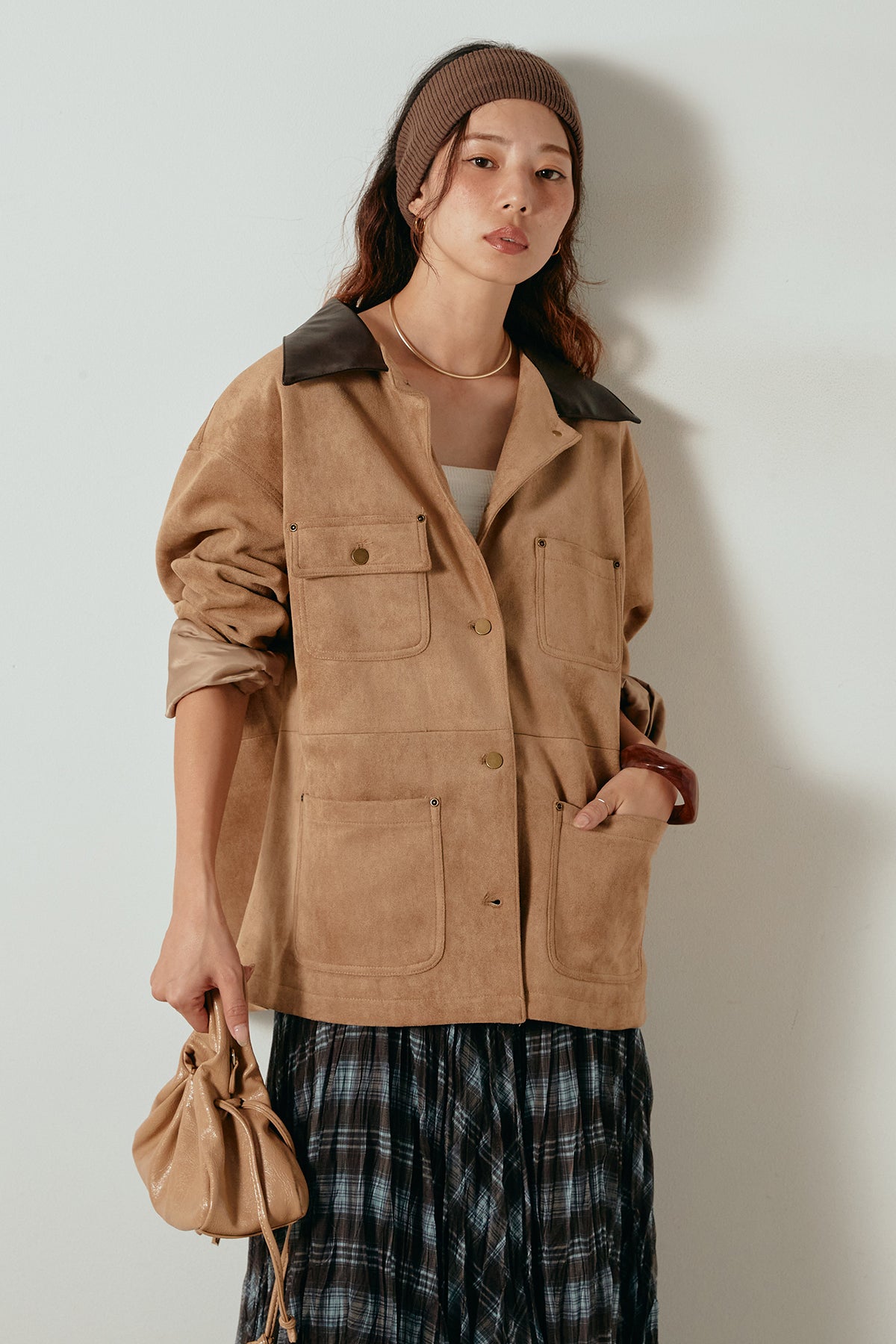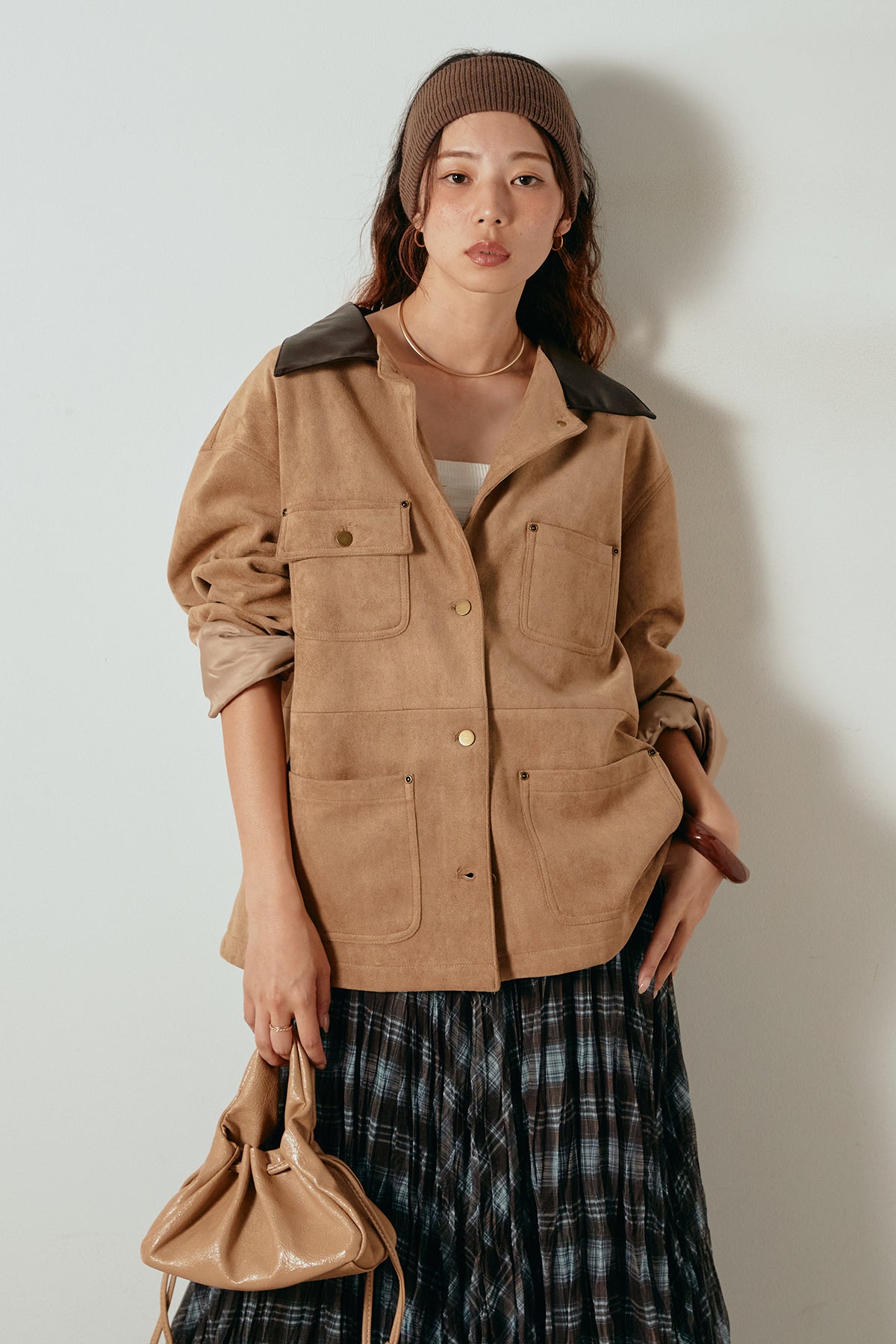 しっとりとしたスエードタッチにフェイクレザーの襟をアクセントに効かせたカバーオールジャケット。フロントの4つの大きめポケットがデザイン性と実用性を兼ね備え、スタイリングにワークテイストをプラスします。ゆったりとしたシルエットで重ね着しやすく、シャツ感覚で羽織れる一枚。季節の変わり目やライトアウターとして、カジュアルからきれいめまで幅広いコーディネートに活躍するアイテムです。