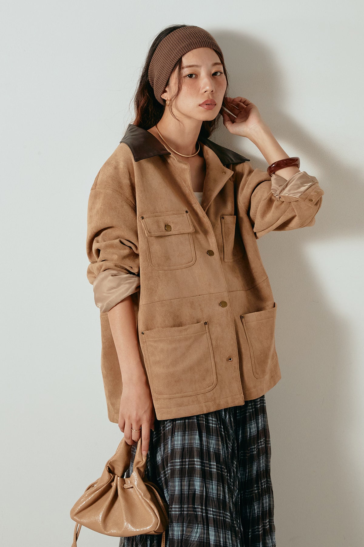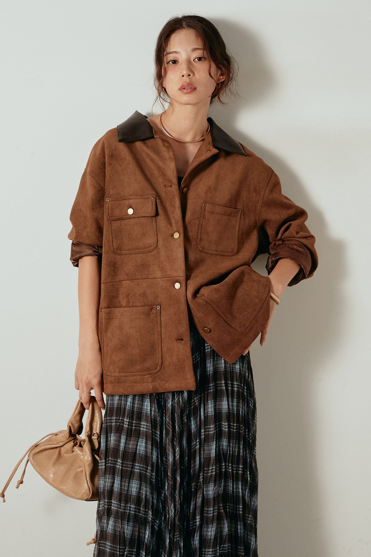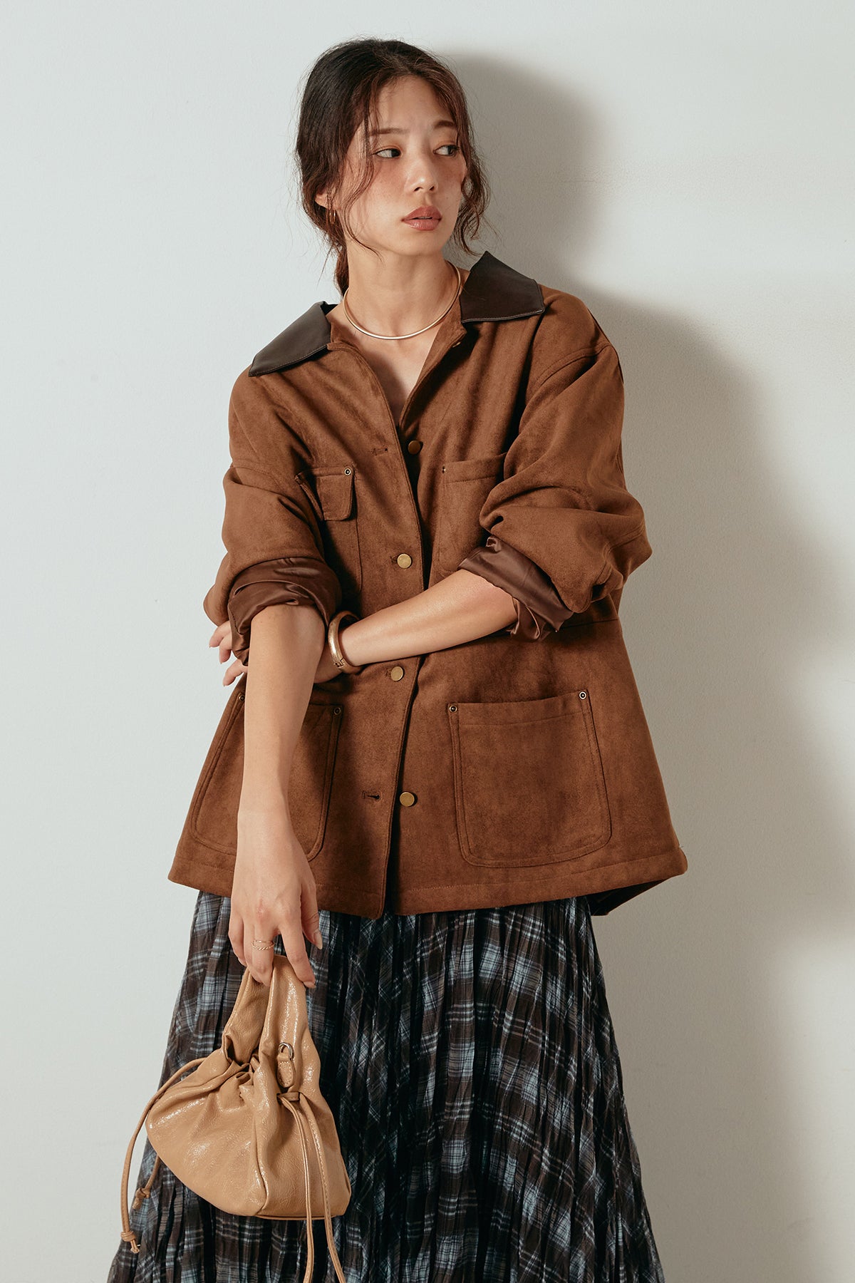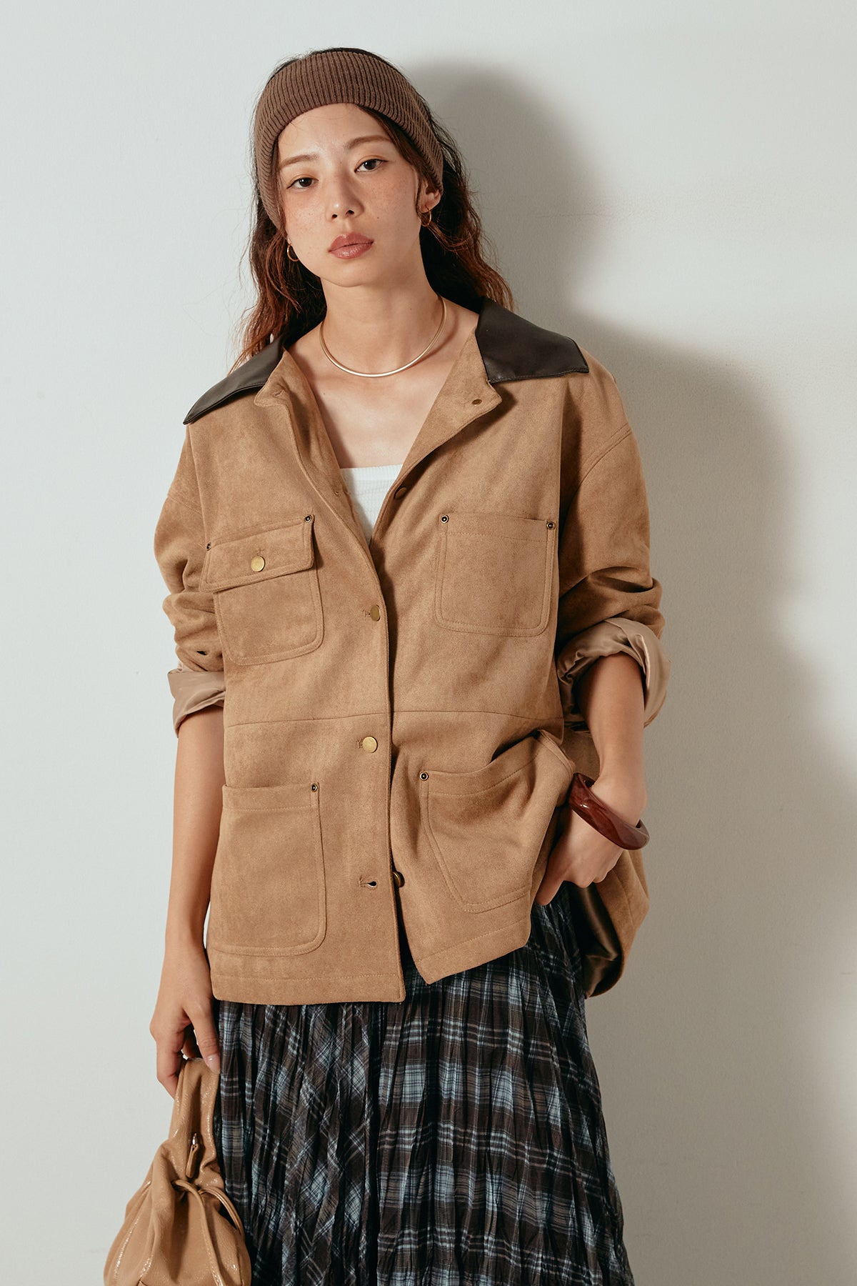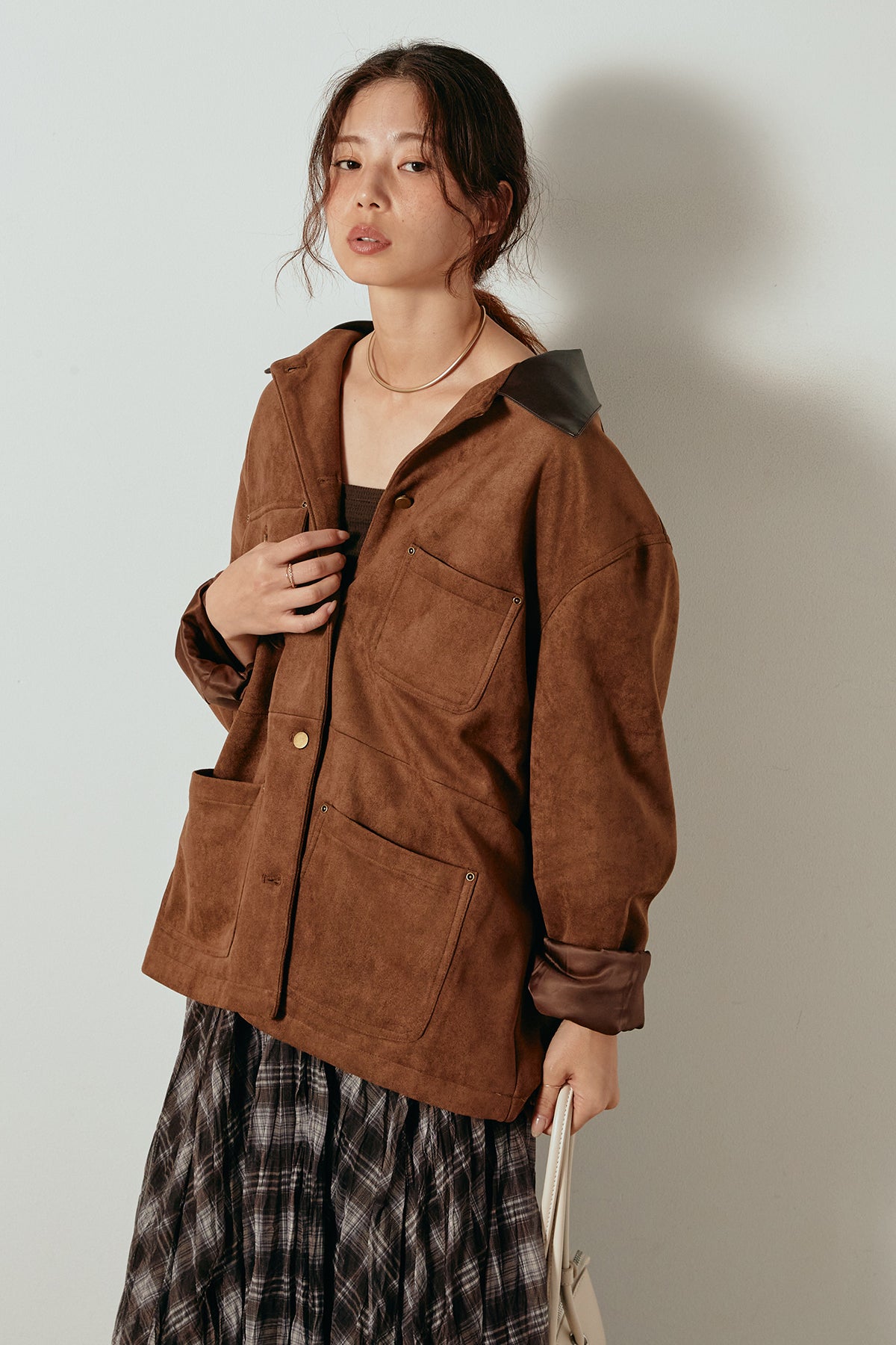 しっとりとしたスエードタッチにフェイクレザーの襟をアクセントに効かせたカバーオールジャケット。フロントの4つの大きめポケットがデザイン性と実用性を兼ね備え、スタイリングにワークテイストをプラスします。ゆったりとしたシルエットで重ね着しやすく、シャツ感覚で羽織れる一枚。季節の変わり目やライトアウターとして、カジュアルからきれいめまで幅広いコーディネートに活躍するアイテムです。