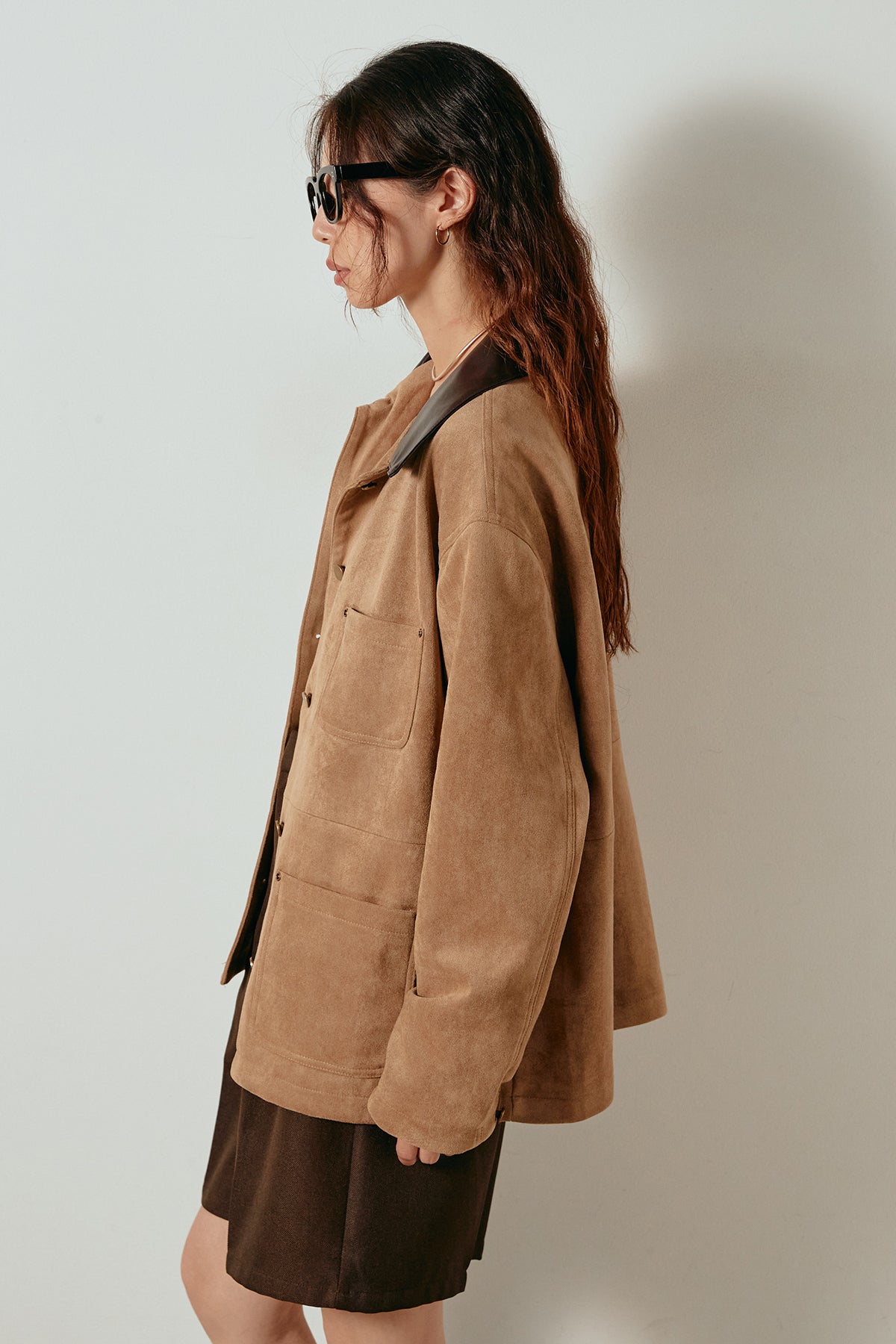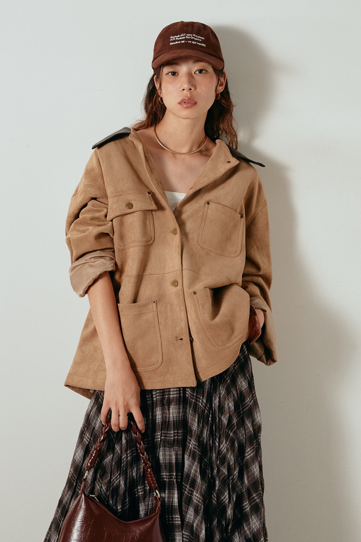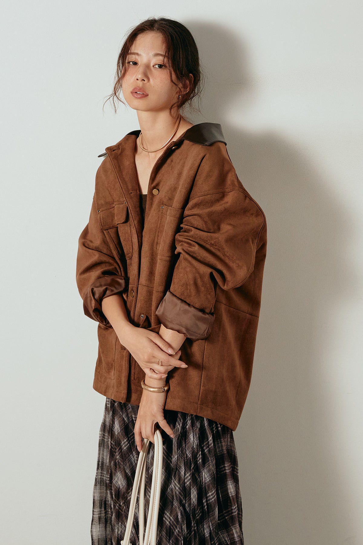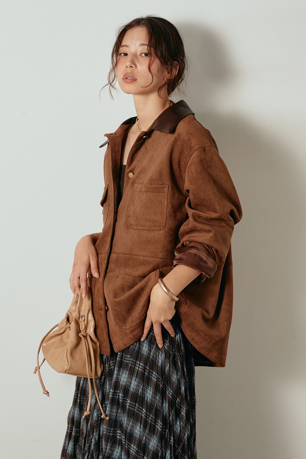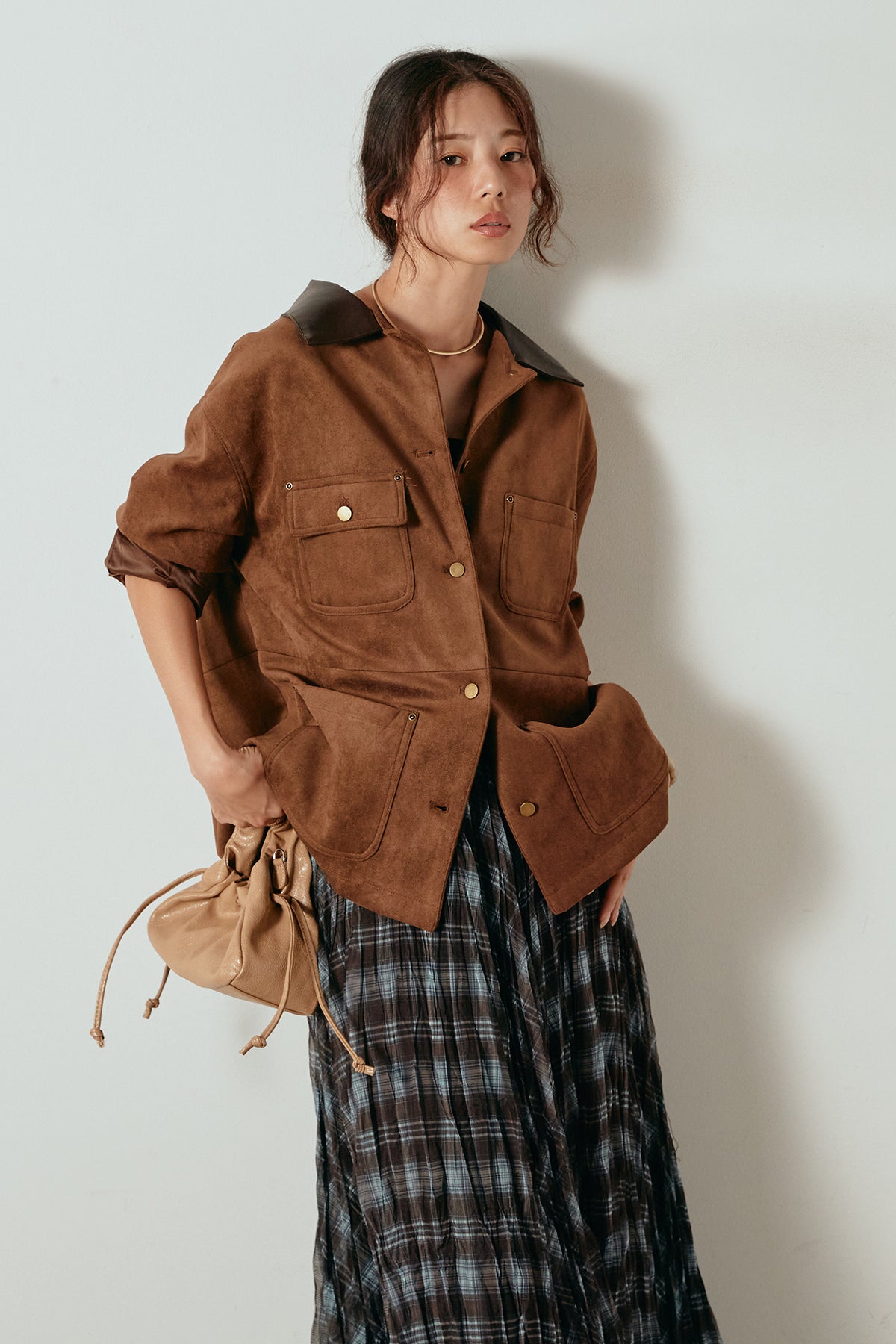 しっとりとしたスエードタッチにフェイクレザーの襟をアクセントに効かせたカバーオールジャケット。フロントの4つの大きめポケットがデザイン性と実用性を兼ね備え、スタイリングにワークテイストをプラスします。ゆったりとしたシルエットで重ね着しやすく、シャツ感覚で羽織れる一枚。季節の変わり目やライトアウターとして、カジュアルからきれいめまで幅広いコーディネートに活躍するアイテムです。