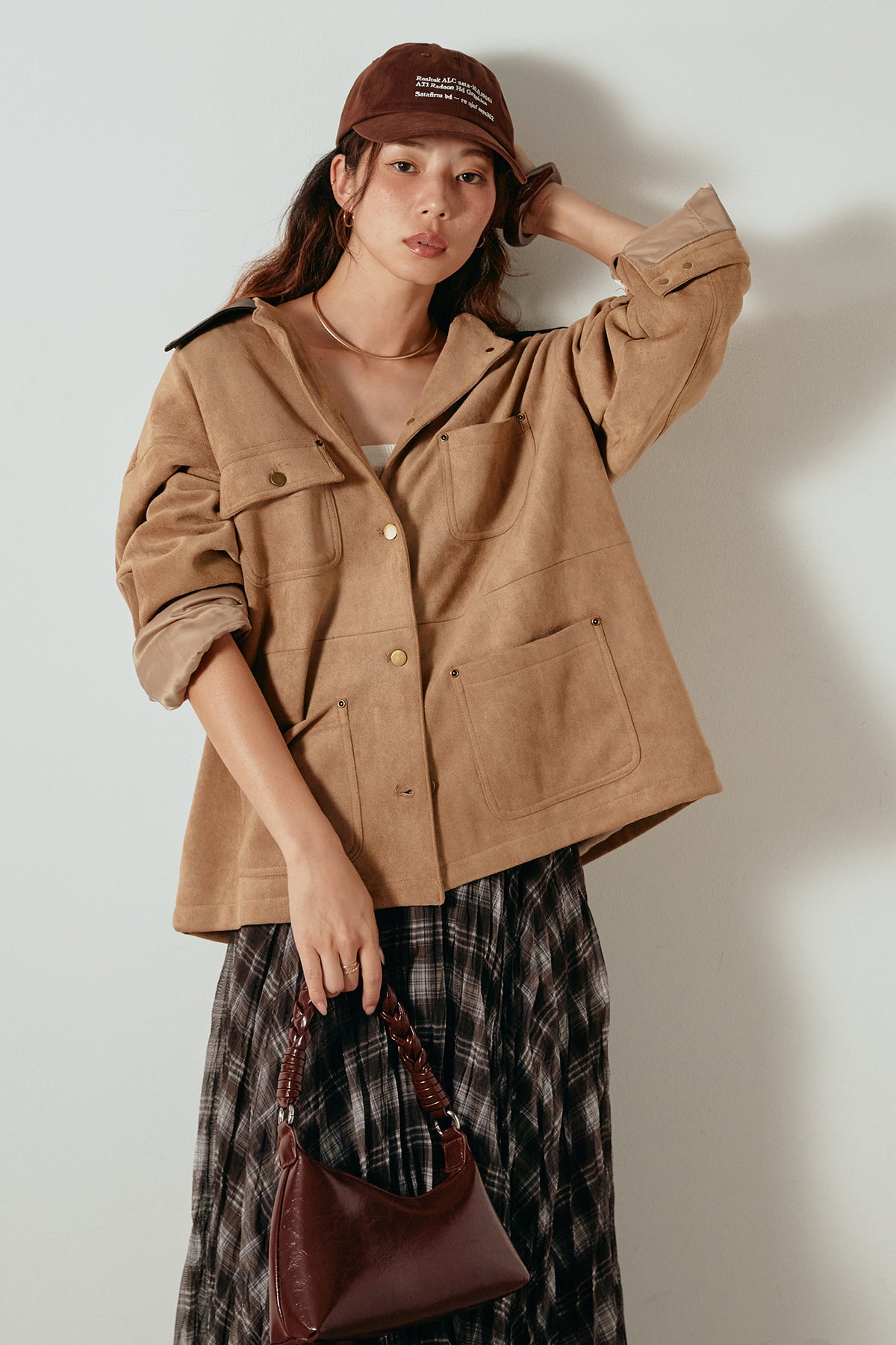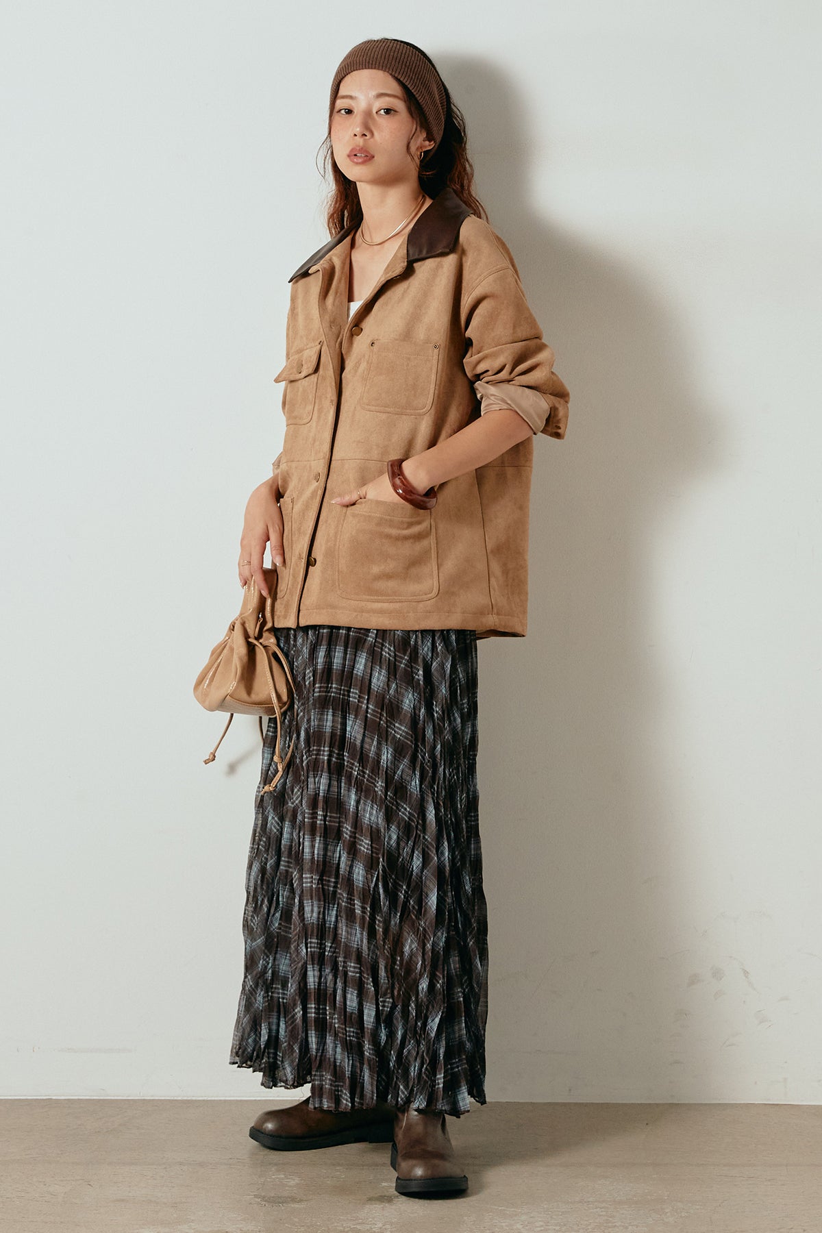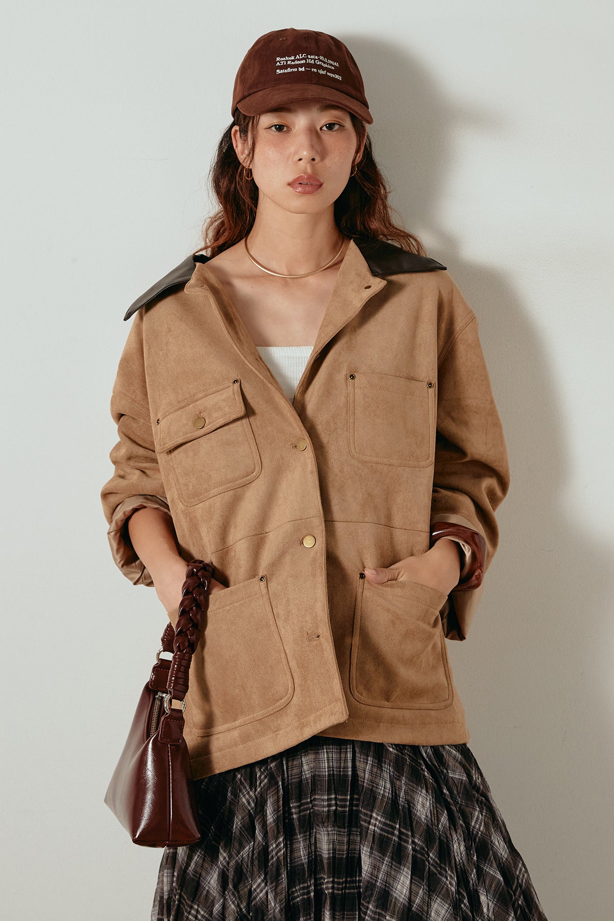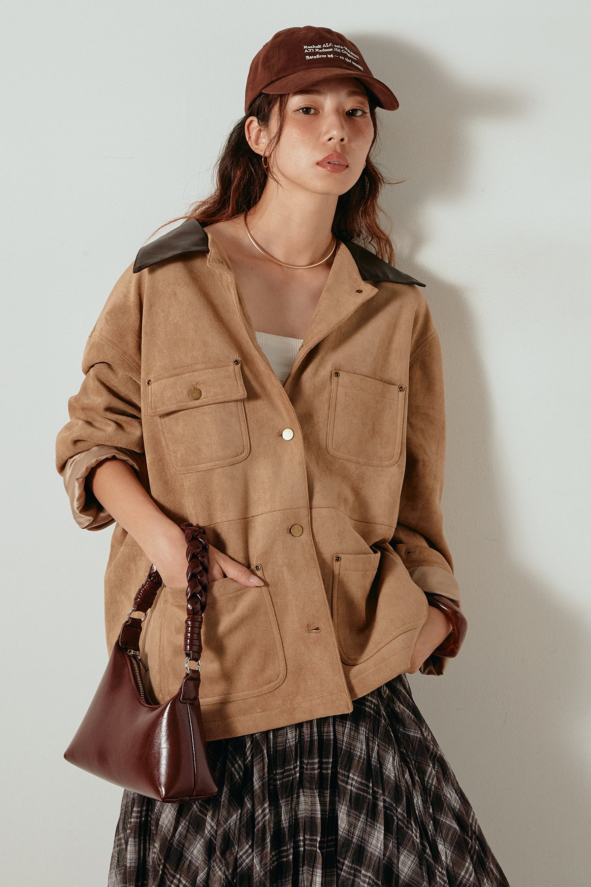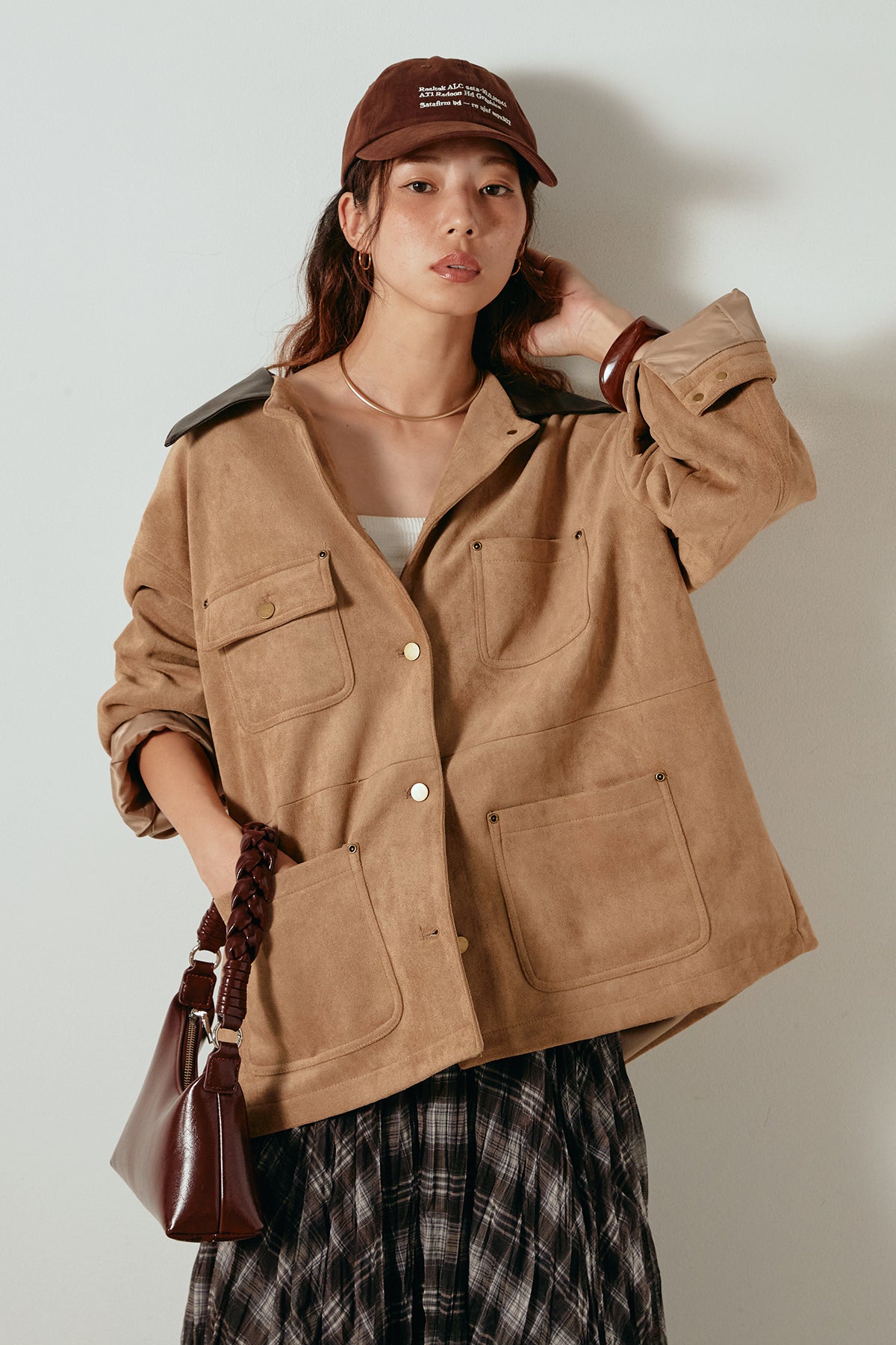 しっとりとしたスエードタッチにフェイクレザーの襟をアクセントに効かせたカバーオールジャケット。フロントの4つの大きめポケットがデザイン性と実用性を兼ね備え、スタイリングにワークテイストをプラスします。ゆったりとしたシルエットで重ね着しやすく、シャツ感覚で羽織れる一枚。季節の変わり目やライトアウターとして、カジュアルからきれいめまで幅広いコーディネートに活躍するアイテムです。