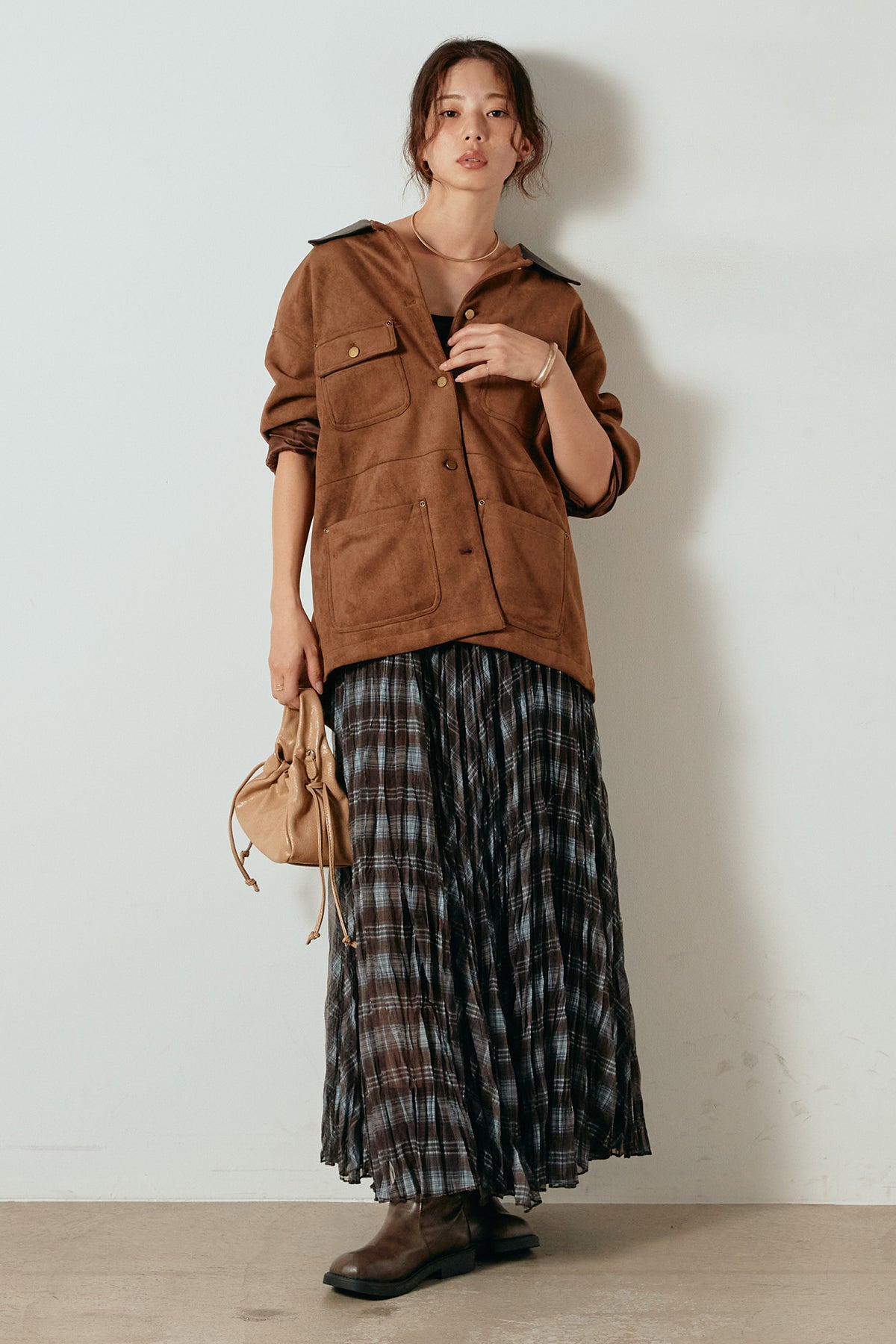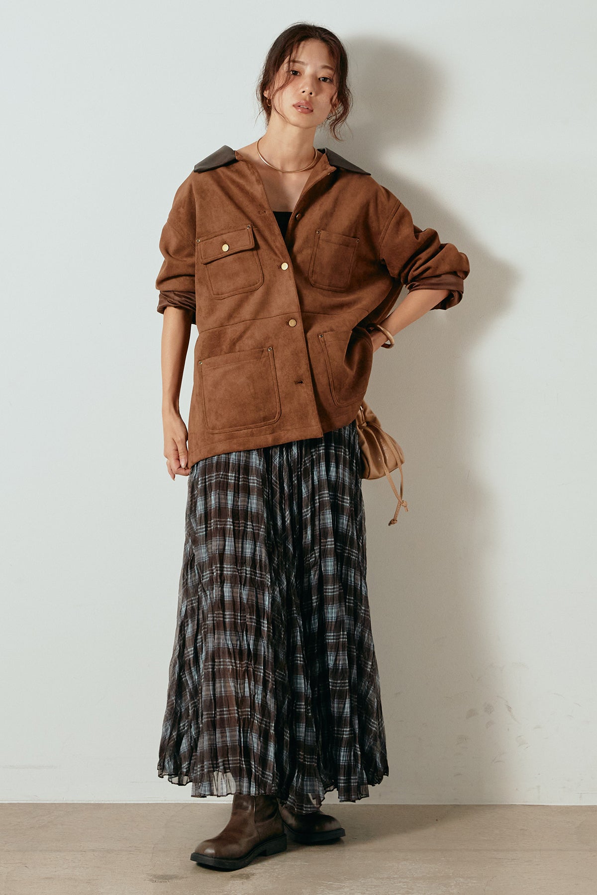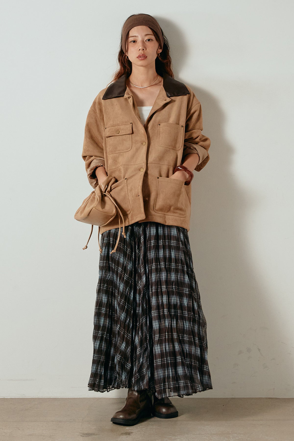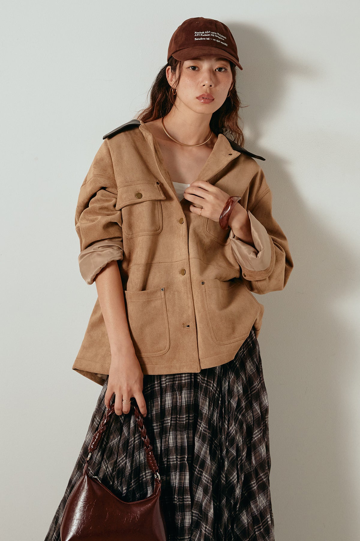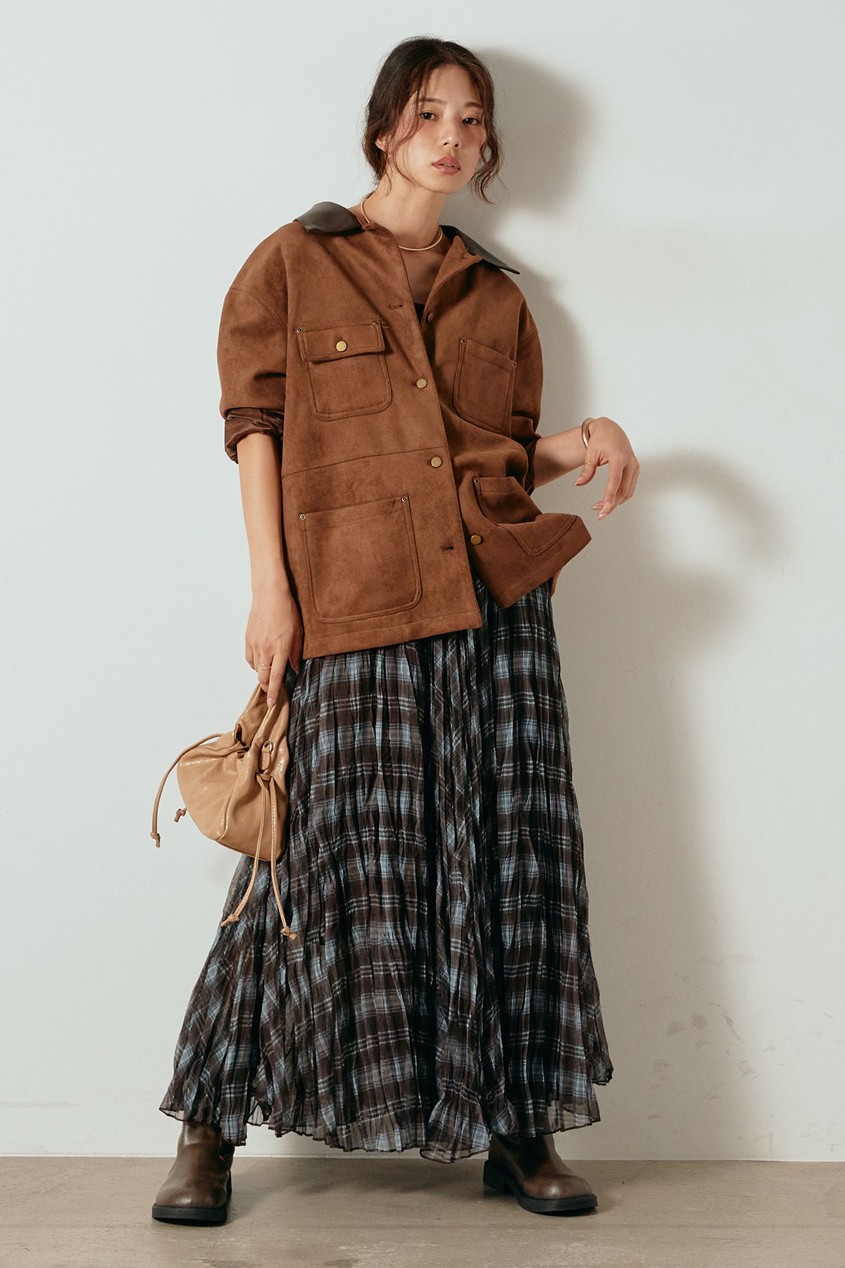 しっとりとしたスエードタッチにフェイクレザーの襟をアクセントに効かせたカバーオールジャケット。フロントの4つの大きめポケットがデザイン性と実用性を兼ね備え、スタイリングにワークテイストをプラスします。ゆったりとしたシルエットで重ね着しやすく、シャツ感覚で羽織れる一枚。季節の変わり目やライトアウターとして、カジュアルからきれいめまで幅広いコーディネートに活躍するアイテムです。