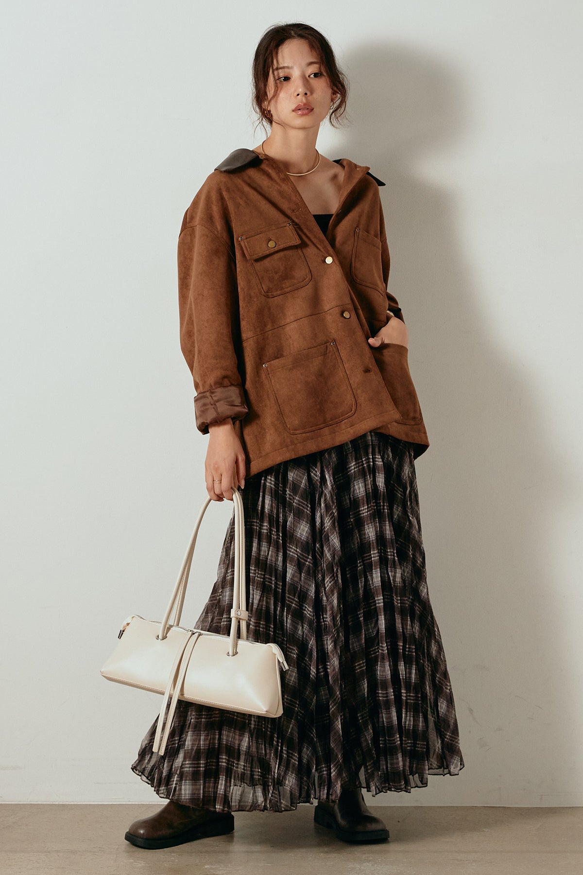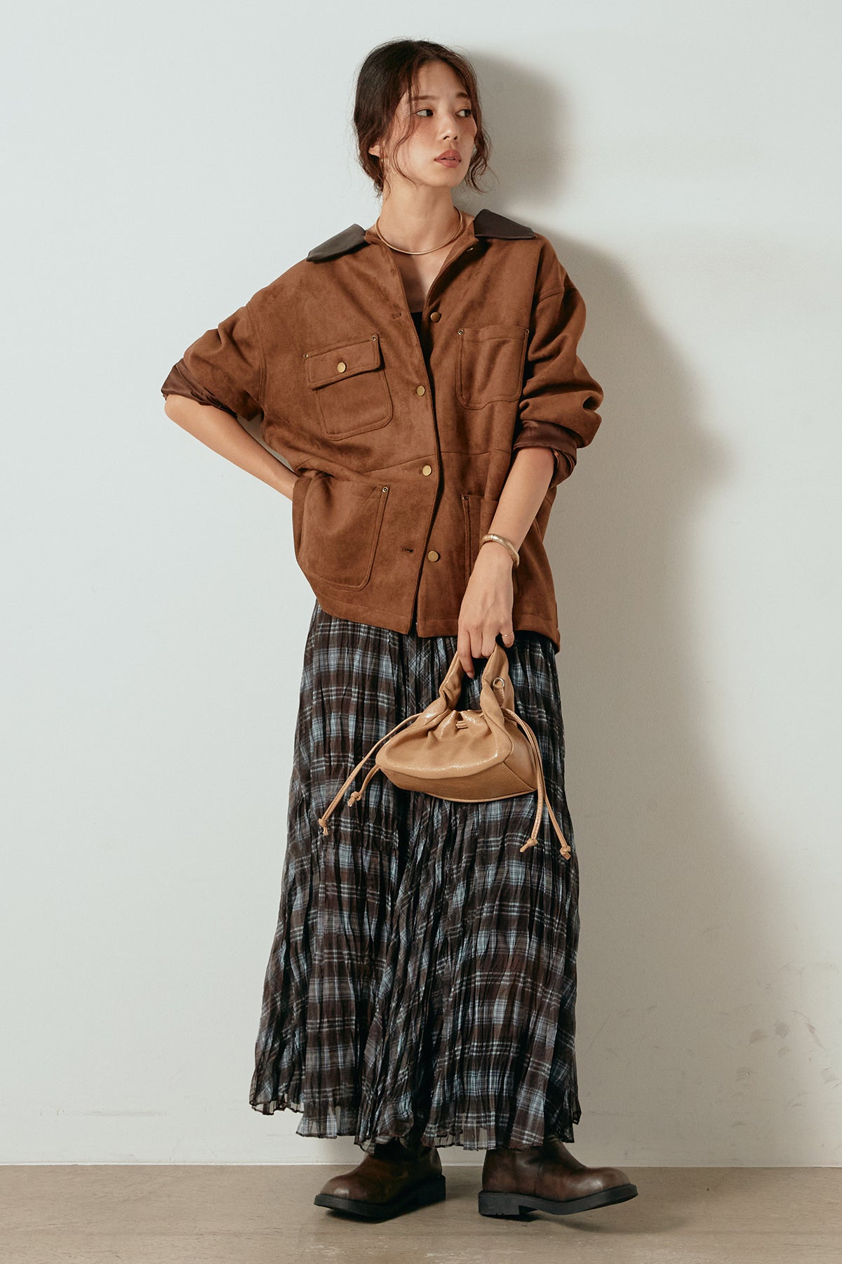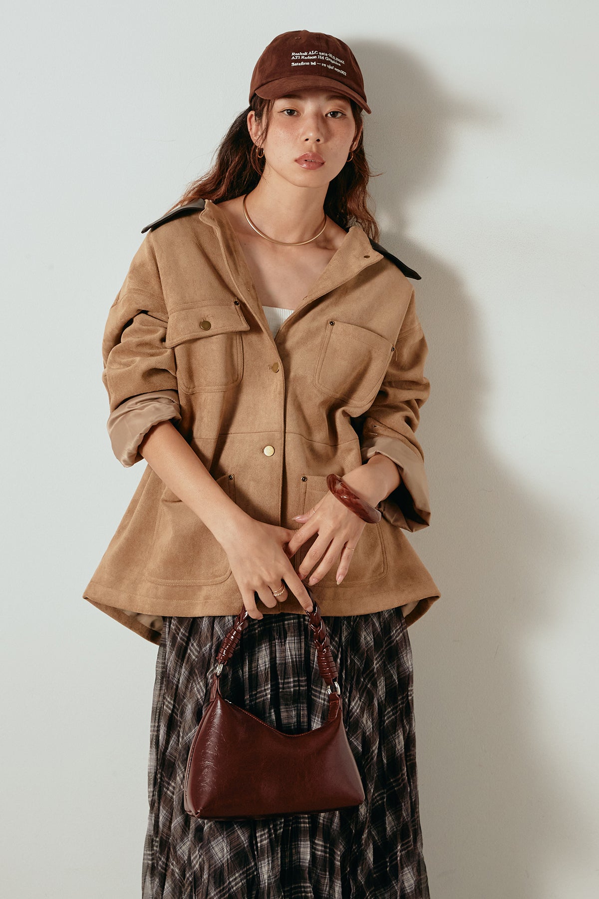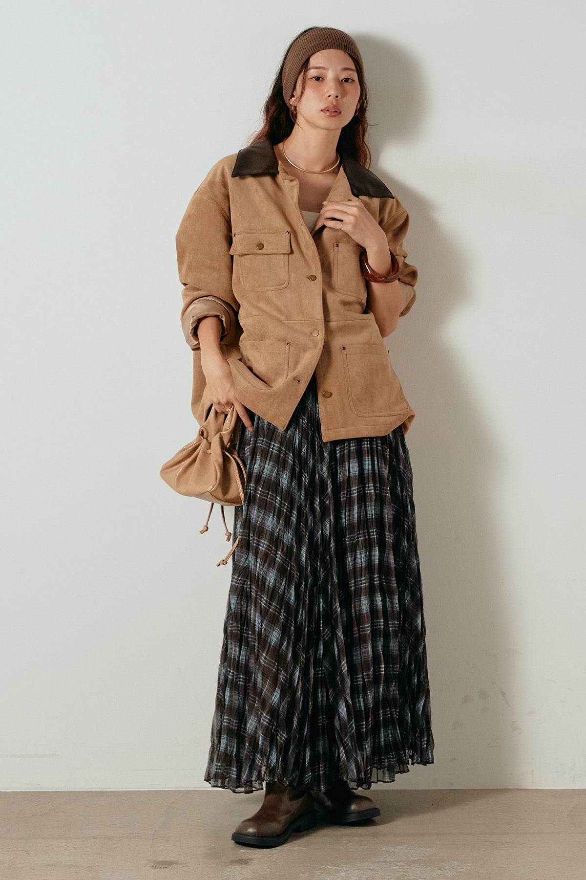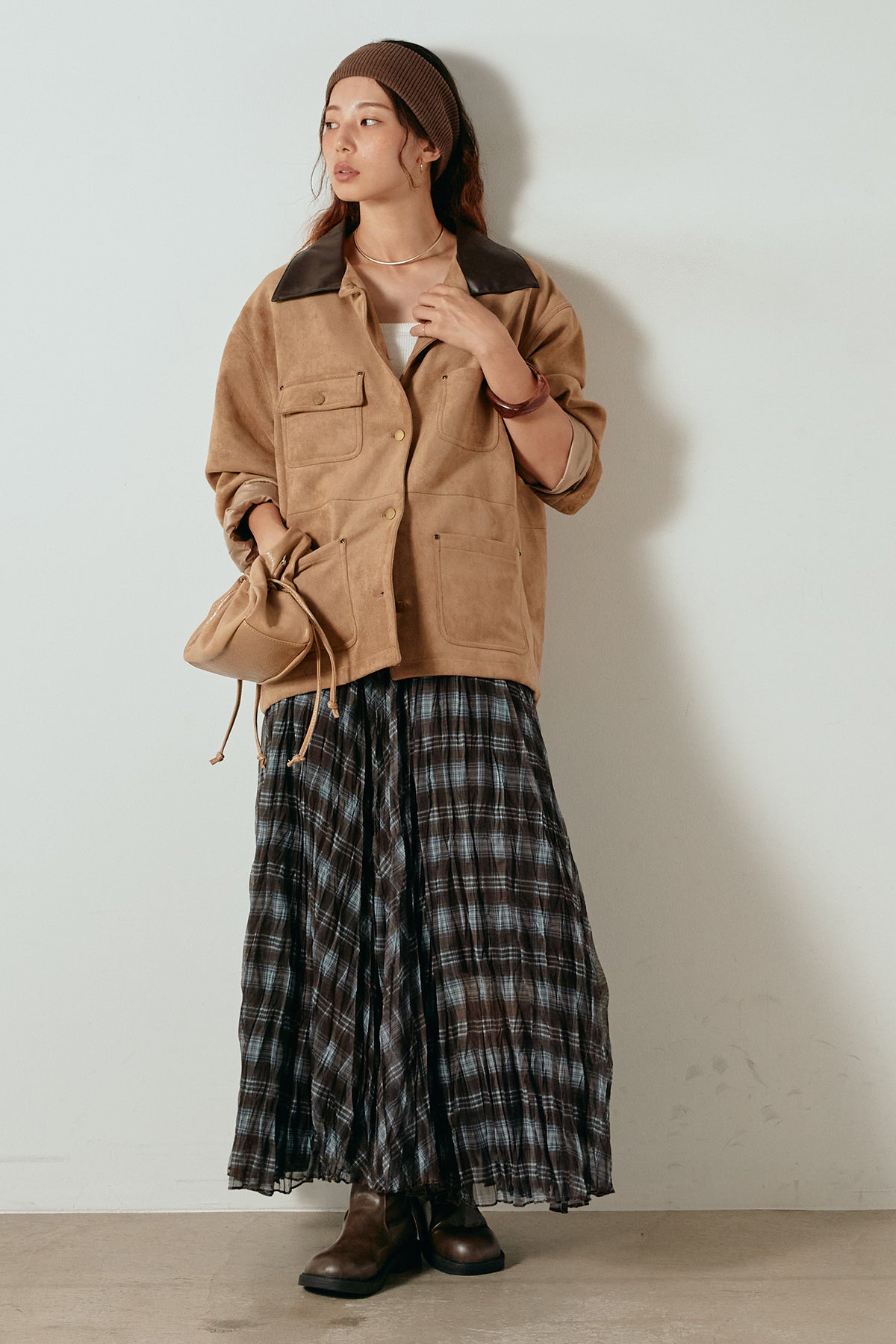 しっとりとしたスエードタッチにフェイクレザーの襟をアクセントに効かせたカバーオールジャケット。フロントの4つの大きめポケットがデザイン性と実用性を兼ね備え、スタイリングにワークテイストをプラスします。ゆったりとしたシルエットで重ね着しやすく、シャツ感覚で羽織れる一枚。季節の変わり目やライトアウターとして、カジュアルからきれいめまで幅広いコーディネートに活躍するアイテムです。