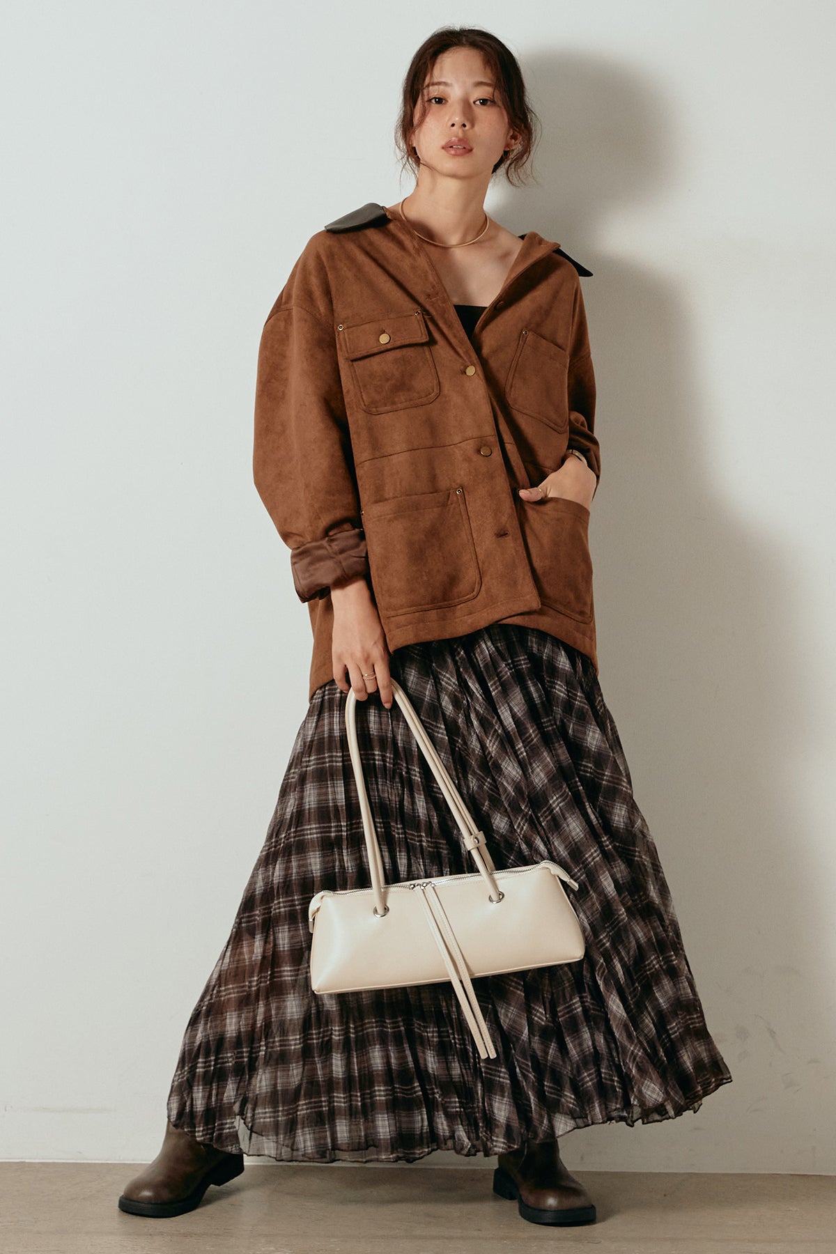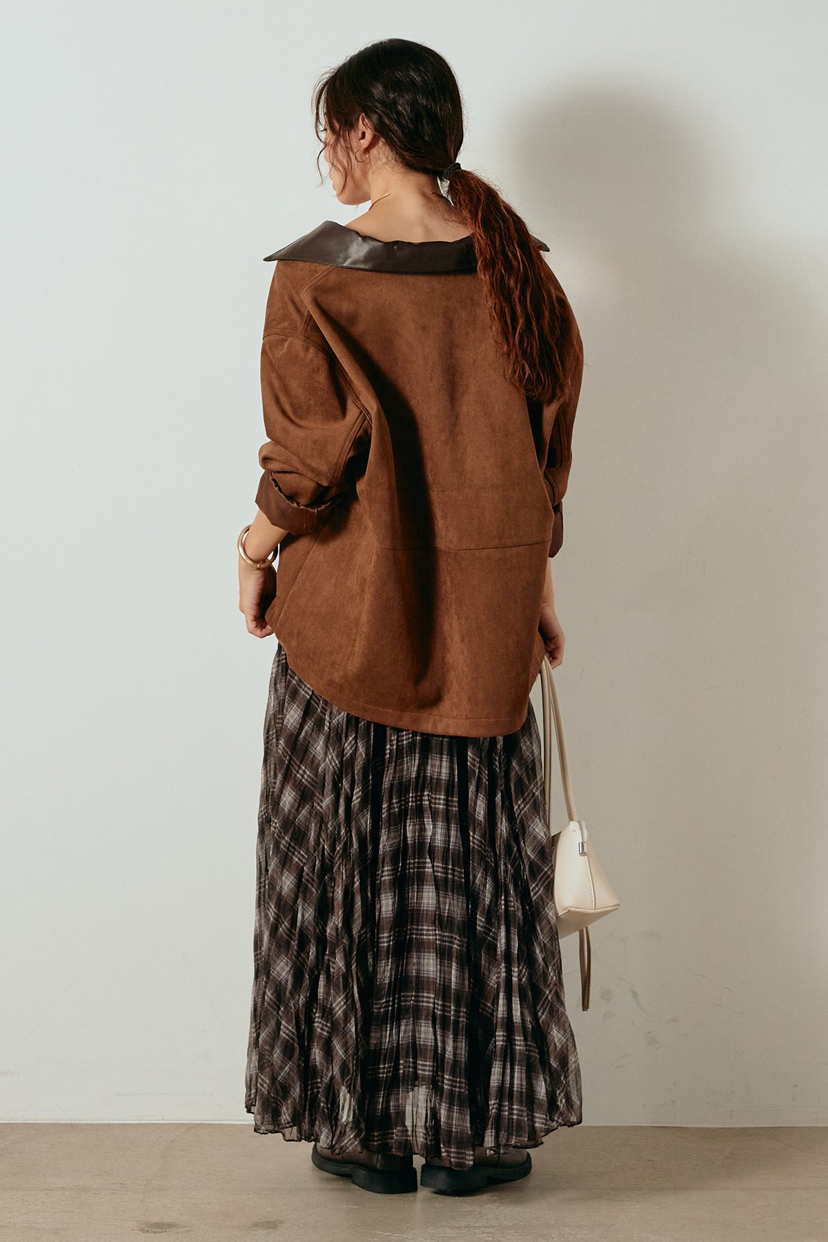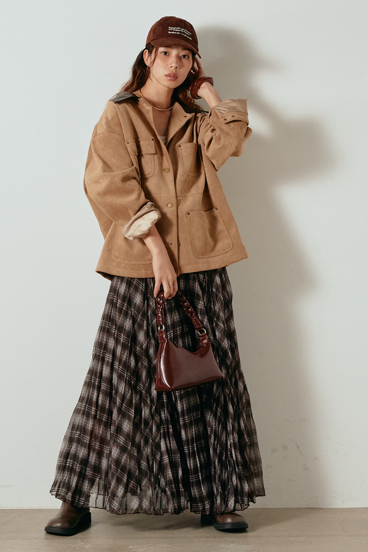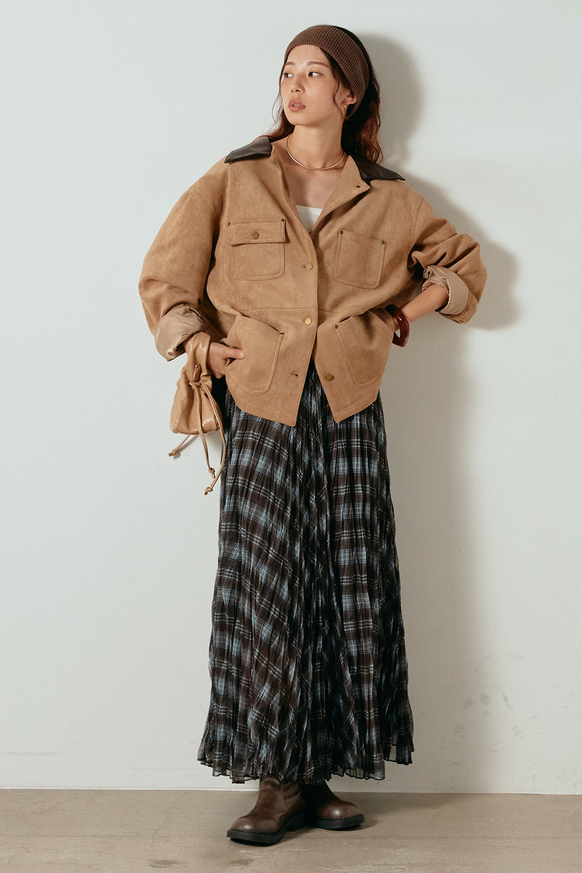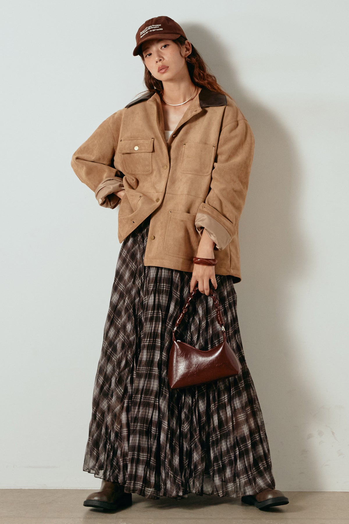 しっとりとしたスエードタッチにフェイクレザーの襟をアクセントに効かせたカバーオールジャケット。フロントの4つの大きめポケットがデザイン性と実用性を兼ね備え、スタイリングにワークテイストをプラスします。ゆったりとしたシルエットで重ね着しやすく、シャツ感覚で羽織れる一枚。季節の変わり目やライトアウターとして、カジュアルからきれいめまで幅広いコーディネートに活躍するアイテムです。