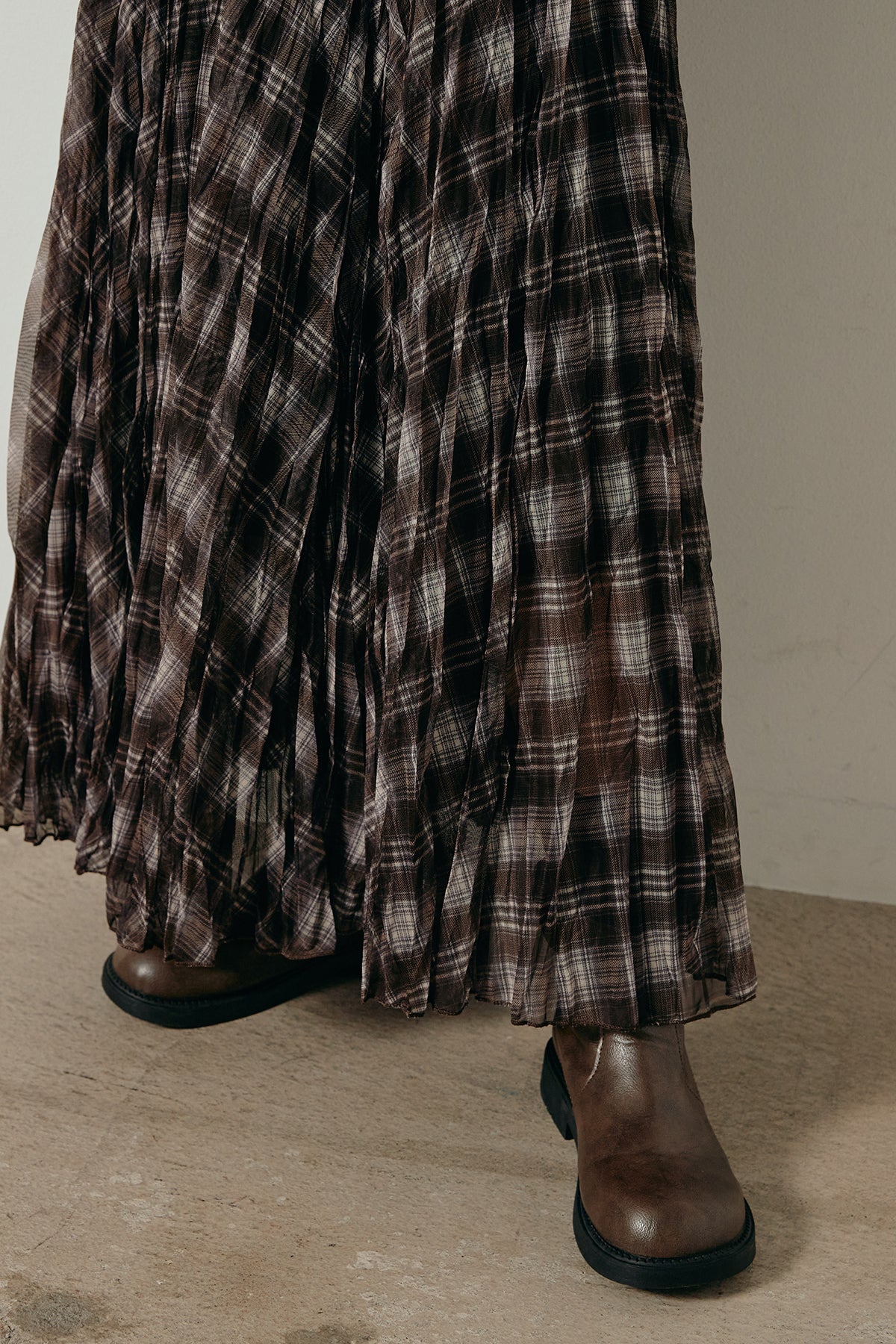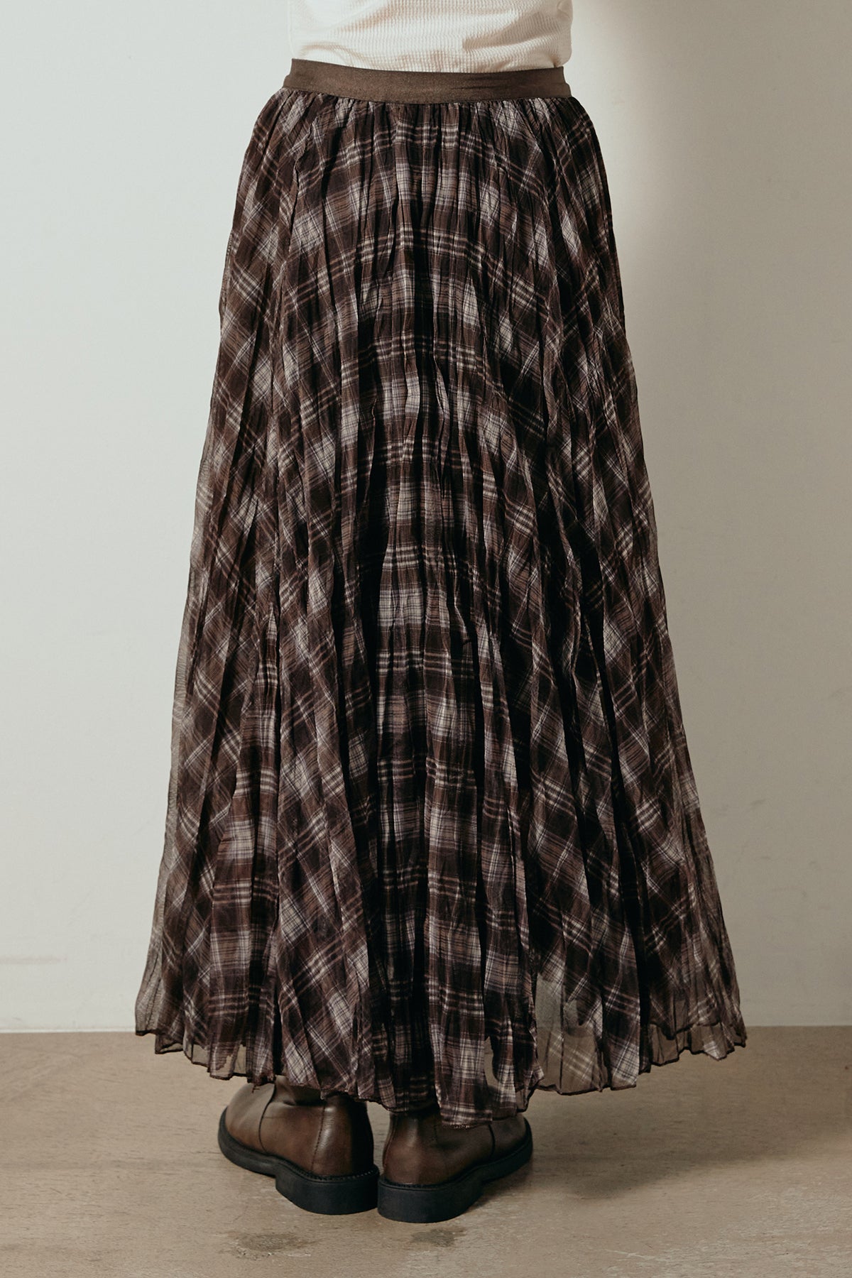 柔らかく落ち感のあるシフォン素材にプリーツ加工を施したタータンチェック柄スカート。ランダムなシワ感がラフな雰囲気を引き立て、程よい抜け感を添えます。軽やかな透け感はレイヤードスタイルにも最適で、インナー次第で季節を問わず活躍。ウエストゴム仕様でリラックスした穿き心地ながら、揺れるシルエットが動くたびに表情をプラス。デイリーからトレンド感のあるスタイリングまで幅広く取り入れられる一枚です。